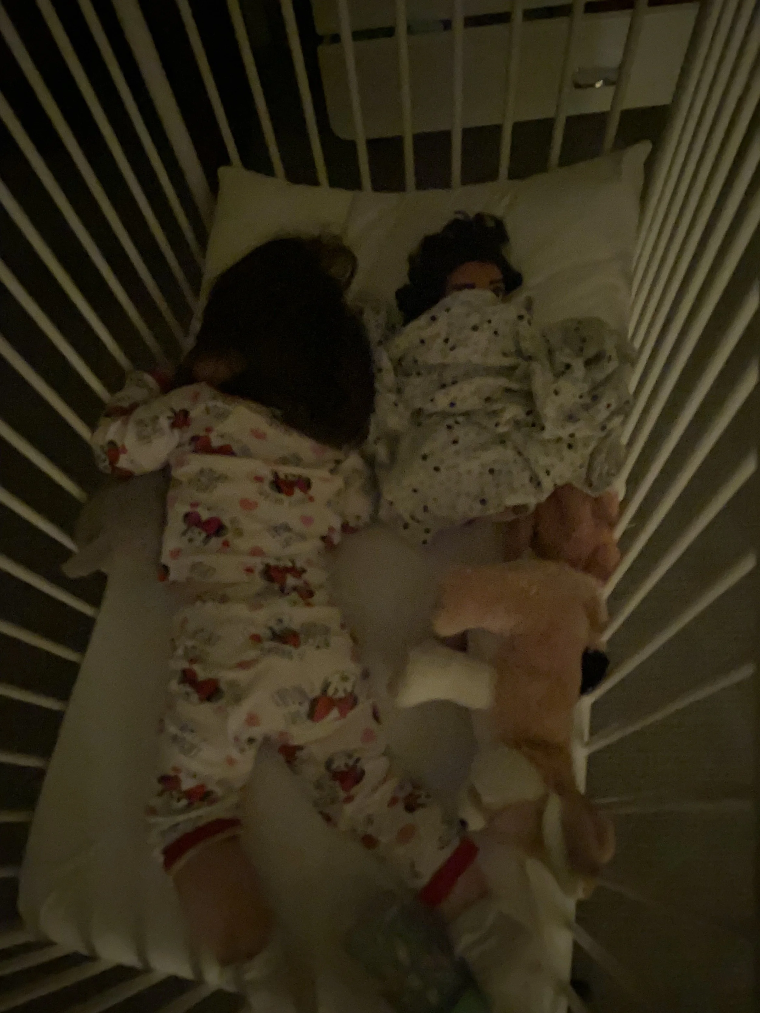 When we were done we went back to the hotel, where we found Madeleine tucked into her crib with Hallie’s Mirabelle doll (from Encanto).