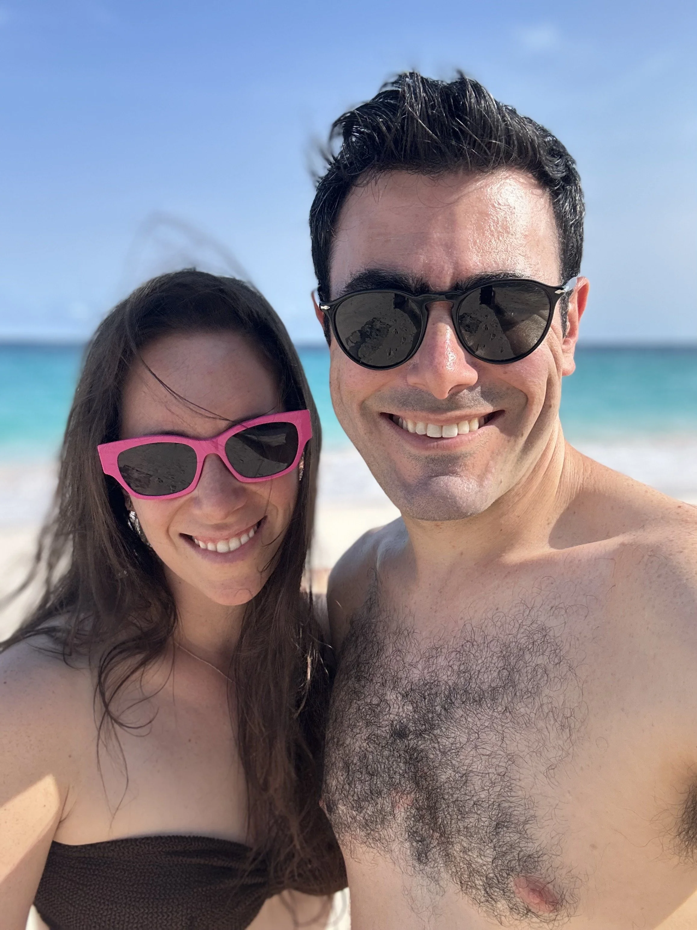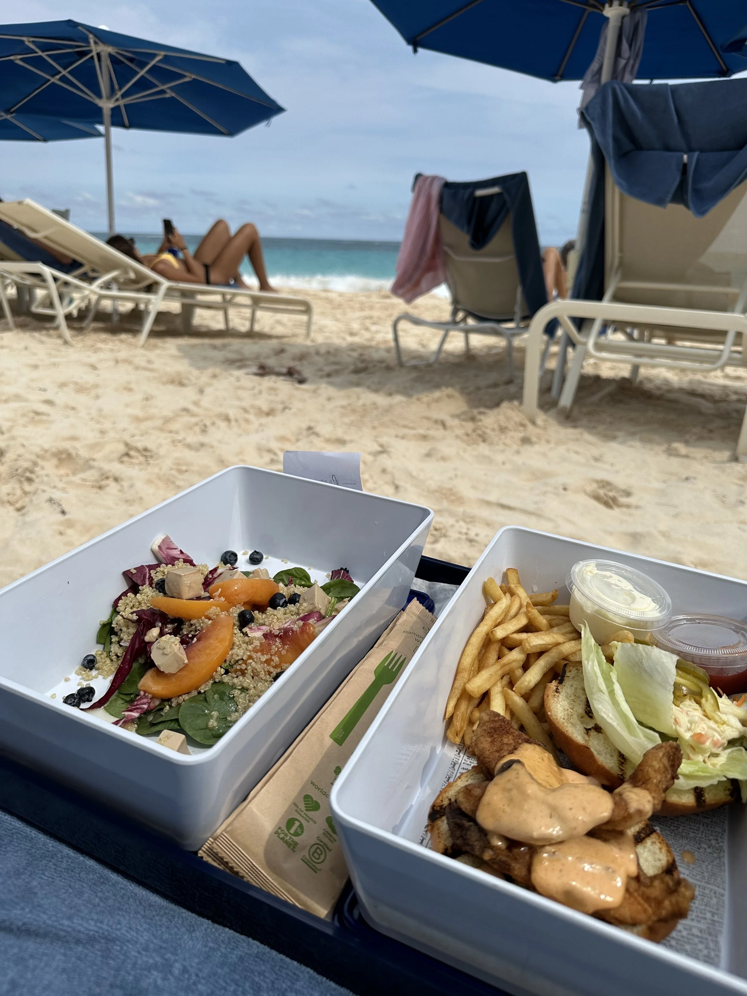 Tzvi made us move as fast as we could into beach attire so we could make the most of the time we had left in the day. We headed down and boarded the 5 minute shuttle to the beach. We’re not really sure what the deal is with the beach – it’s a beach club and it seems to be open to outside members, but it’s also part of the hotel. The chairs are ok, but the beach is of course beautiful. We ordered some lunch – I had a quinoa tofu salad and Tzvi had a fish sandwich with fries. We went in the water, slept on the lounge chairs and just relaxed. We left the beach around 6:15 and went back to the hotel to shower and change for dinner. We met some Peloton people (riders, not instructors) on the shuttle and discussed rides. We’re everywhere.