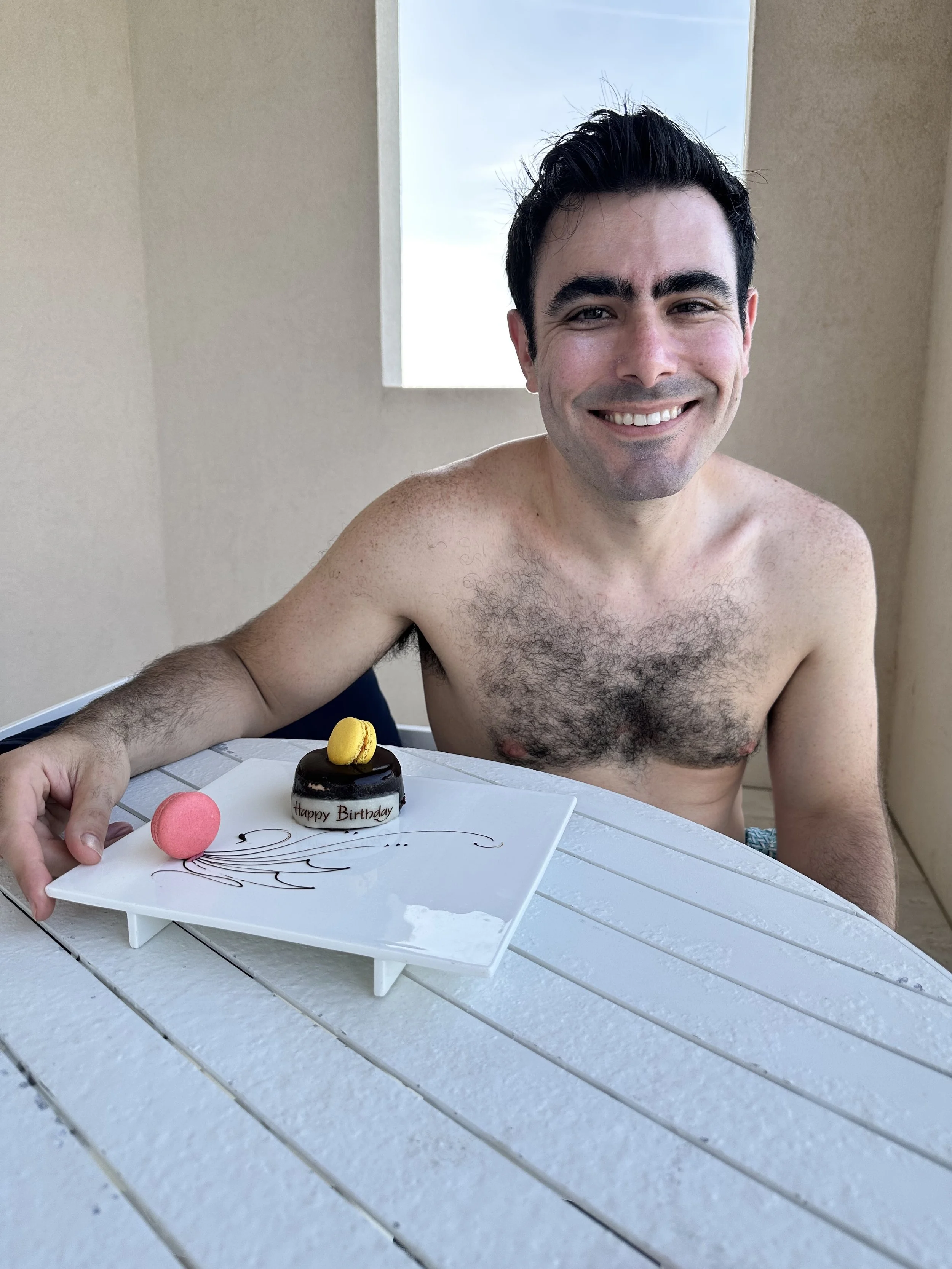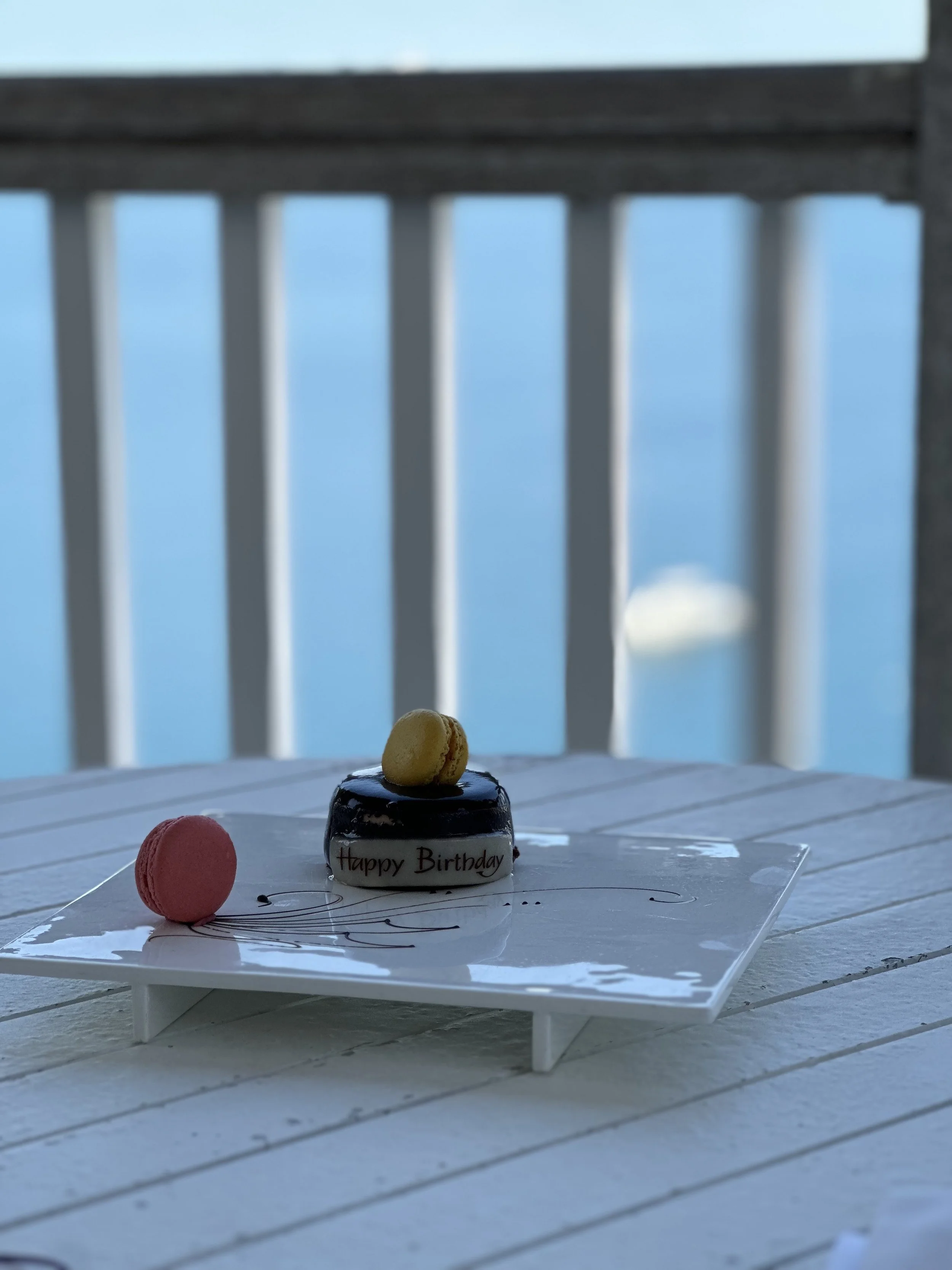 We sat out on the balcony a little bit. When we got to our room there was a cake waiting for us for Tzvi’s birthday (which is coming up in a few weeks…). It was actually delicious and perfect for Tzvi as I think it was a coffee mouse cake. From our balcony we can see the whole hotel, one of the pools and the harbor. Looking down at the pool we heard a familiar coughing and saw the Long Islanders from the plane. Oh good. They’re here too. Unsurprisingly they were vaping, working on that cough.