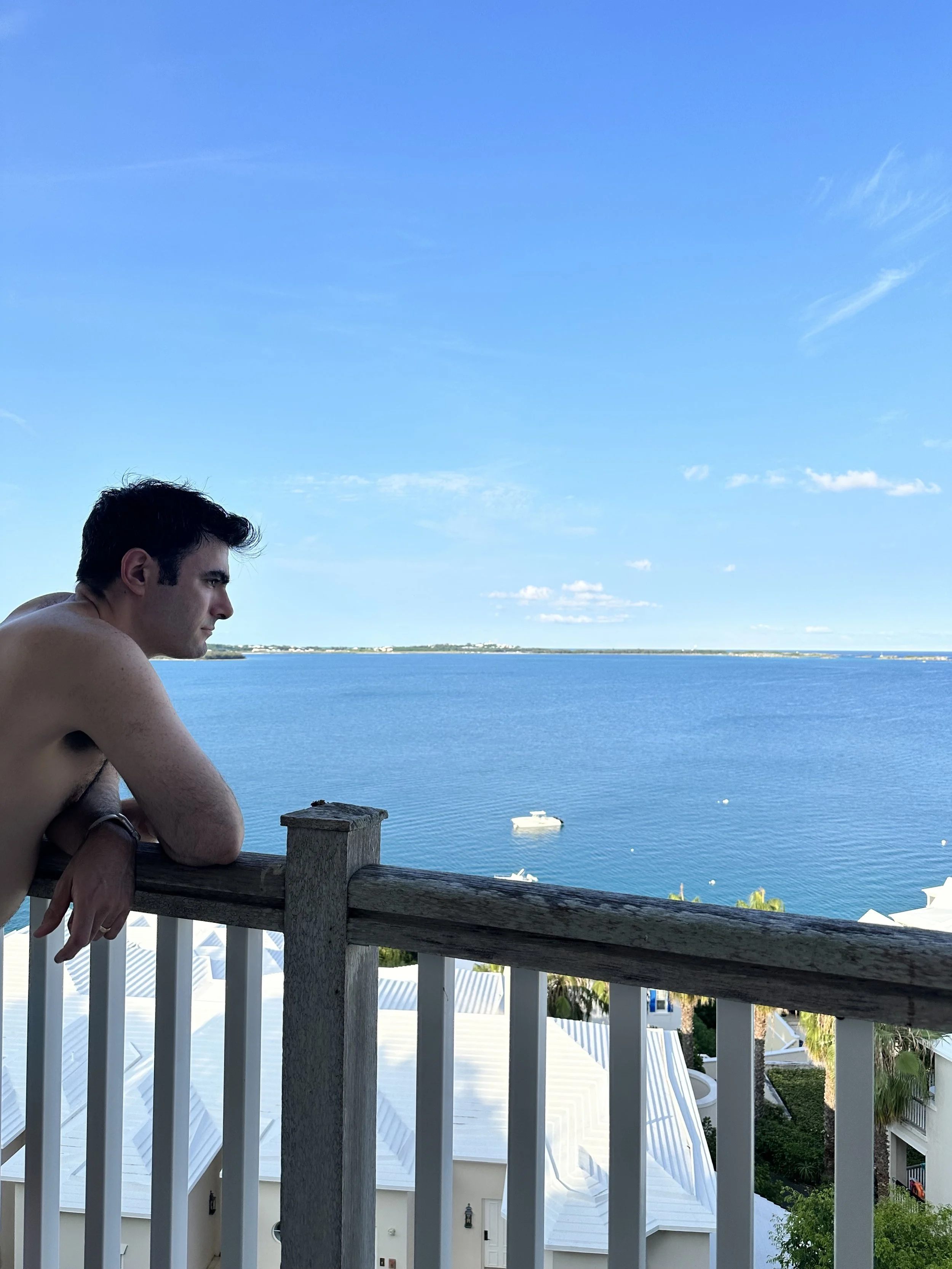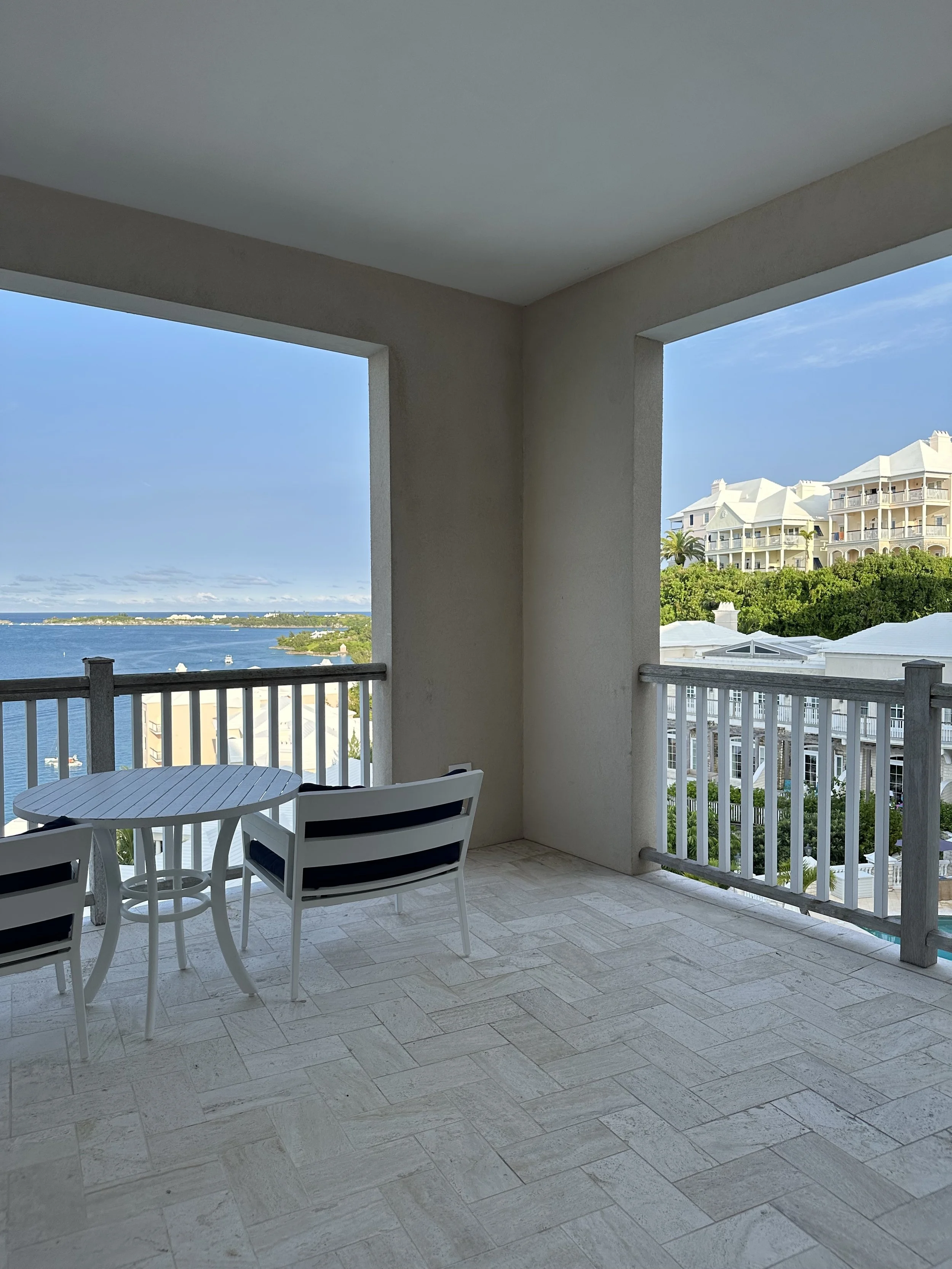 The hotel is beautiful and evokes classic Bermuda charm, which is to say it reminds me of British colonialism. The lobby was decorated for cup match with red and blue flags representing the two teams. At check in we saw at least four other couples from our flight, basically everyone who was sitting in the extra space seats. We checked in and went to our room, an ocean-view king room which turned out to be a corner room with a massive terrace overlooking the whole hotel and the ocean.
