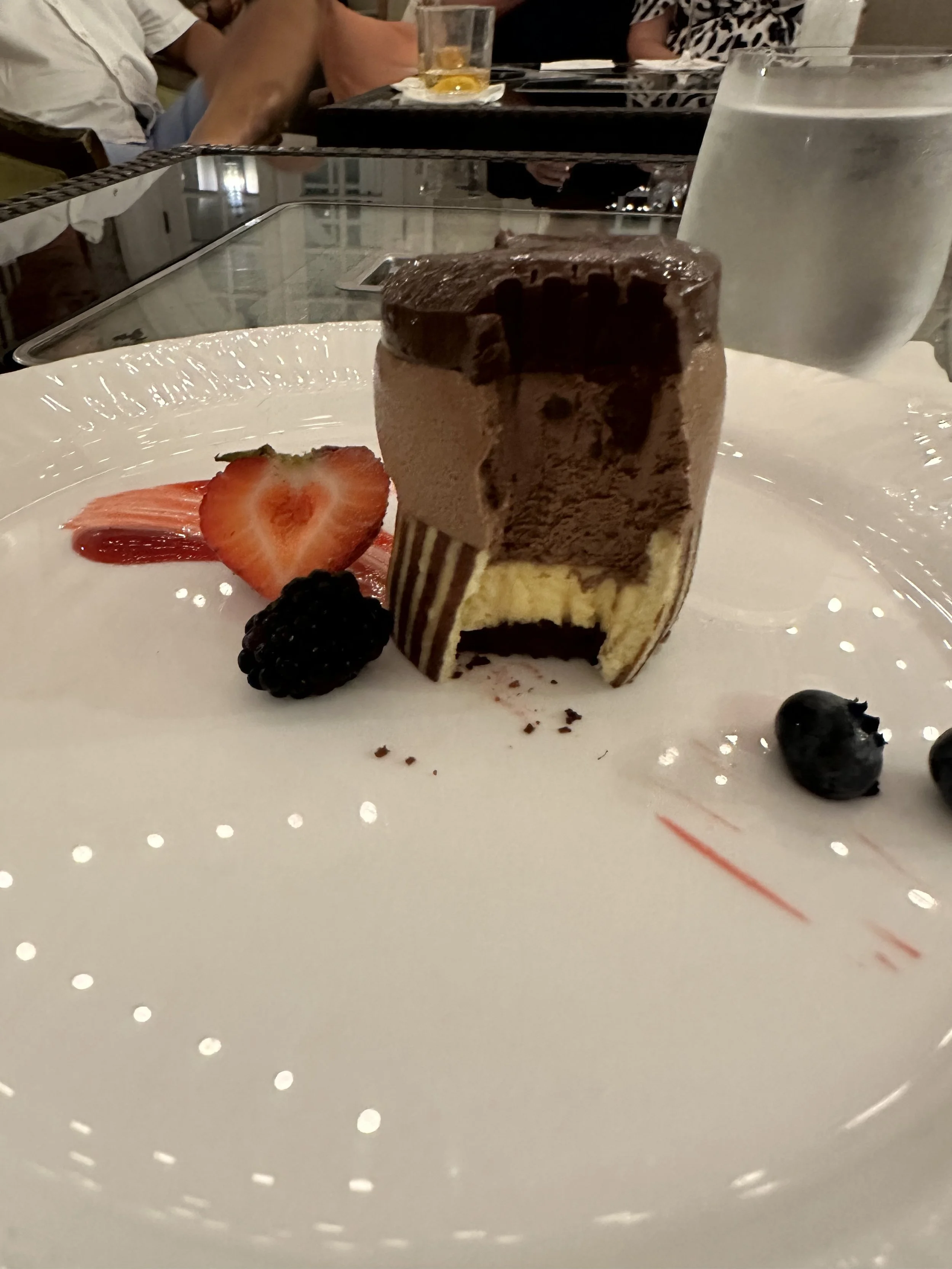 We took seats on a sofa and ordered desserts. We had a crème brule and a “Chocolate Tower” which we’d seen on every menu all weekend but hadn’t had because our waiter last night told us it wasn’t very popular. It was okay.