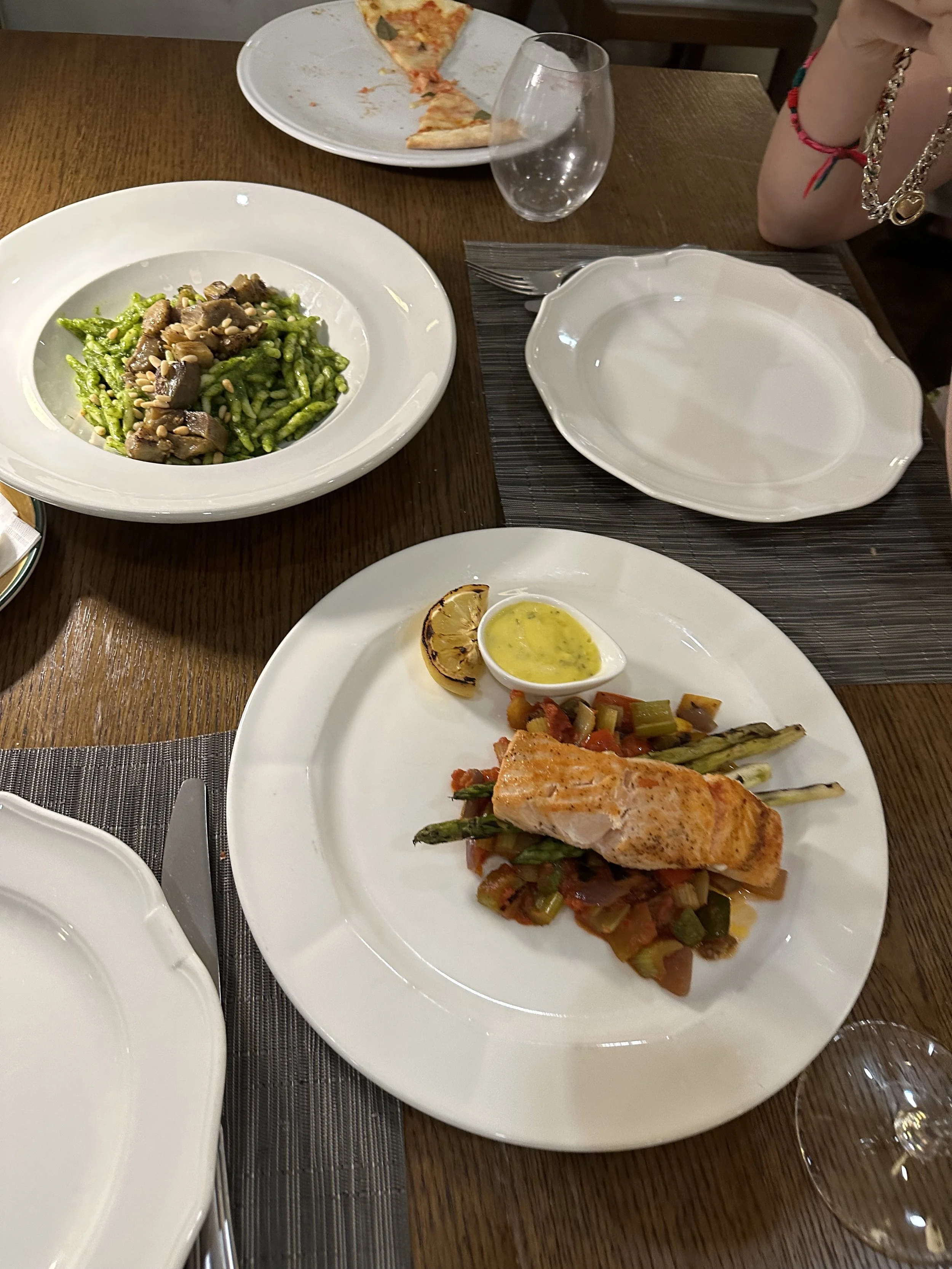 After moving past the table robbery, we enjoyed a great dinner. We had cocktails and shared a Caesar salad and a pizza. Then we shared salmon with ratatouille and pasta with arugula pesto and roasted eggplant. (Shabbos ended as the mains came, so the pictures pick up here.).