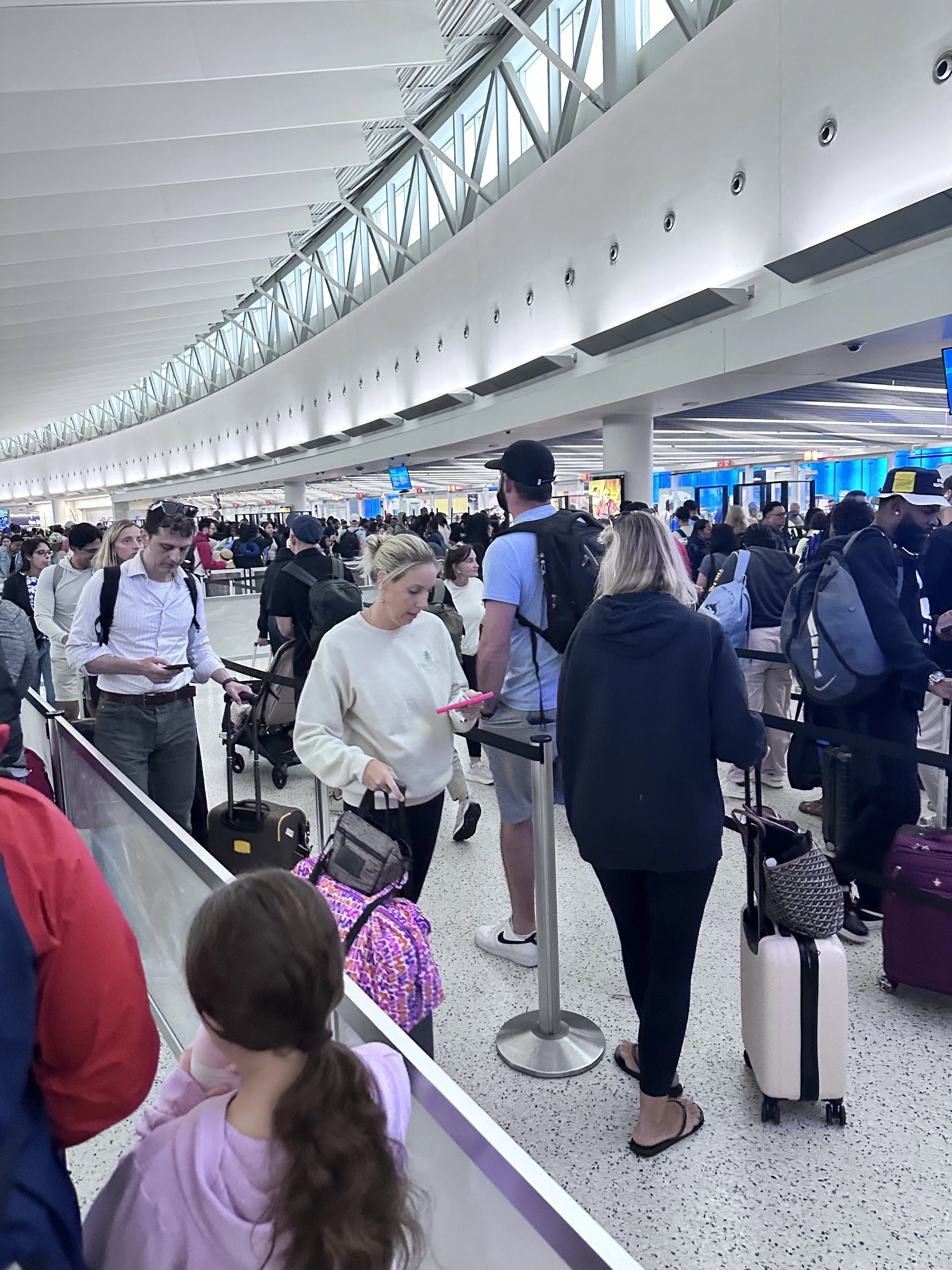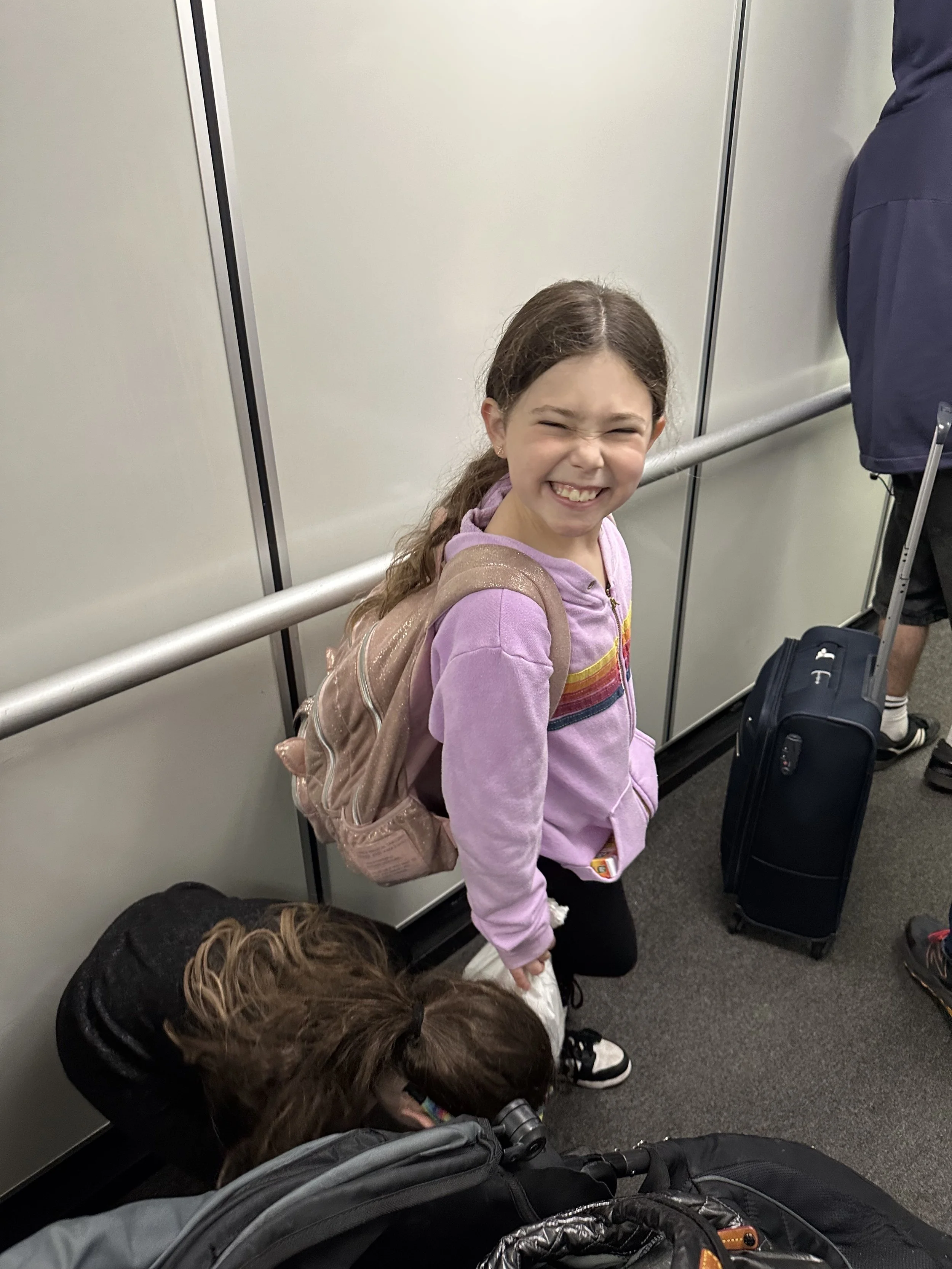 So, Thursday morning, we got ourselves together, our car came at 6:45, and we were driving away by 6:53. I reminded the girls that this may seem early, but in a month and a half we’ll be heading to Los Angeles and have to be out even earlier. They didn’t appreciate that. Anyway, we did the trek to JFK. We had a very good driver who saved us some time cutting a massive line of traffic at the airport, and then we headed to check in at the Mosaic desk, which was very smooth. We went through security with no problem. It was very crowded—actually, I thought it was extremely crowded for a Thursday morning—but we got through without issue. After that, I went to get Hallie a bagel, which took something like 20 minutes, while Tzvi went to pick up the coffees we had ordered at Starbucks (which, of course, didn’t go smoothly). By then, boarding had already started. We got on line, ready to board. They began scanning our passports, and suddenly, they stop us.