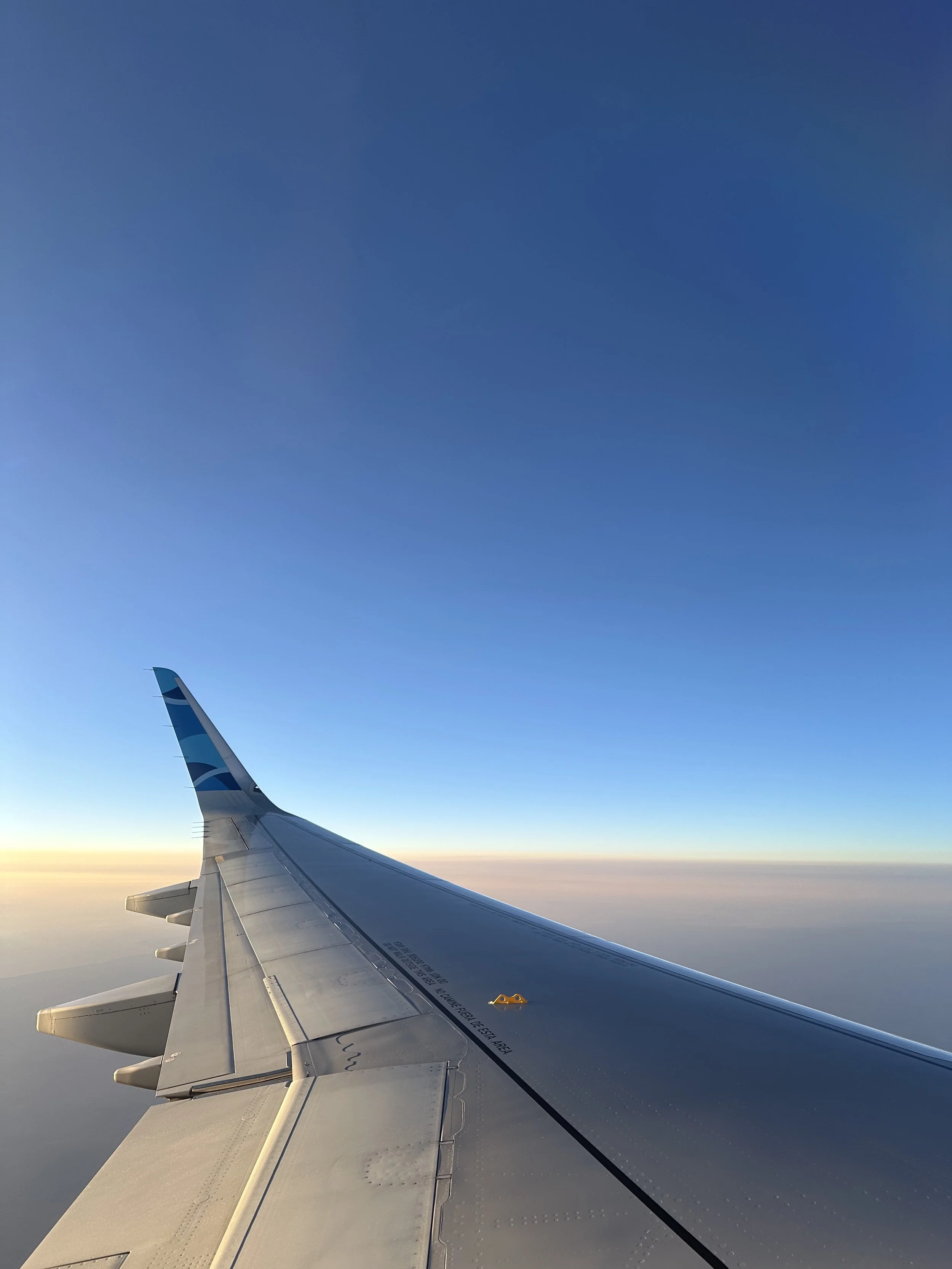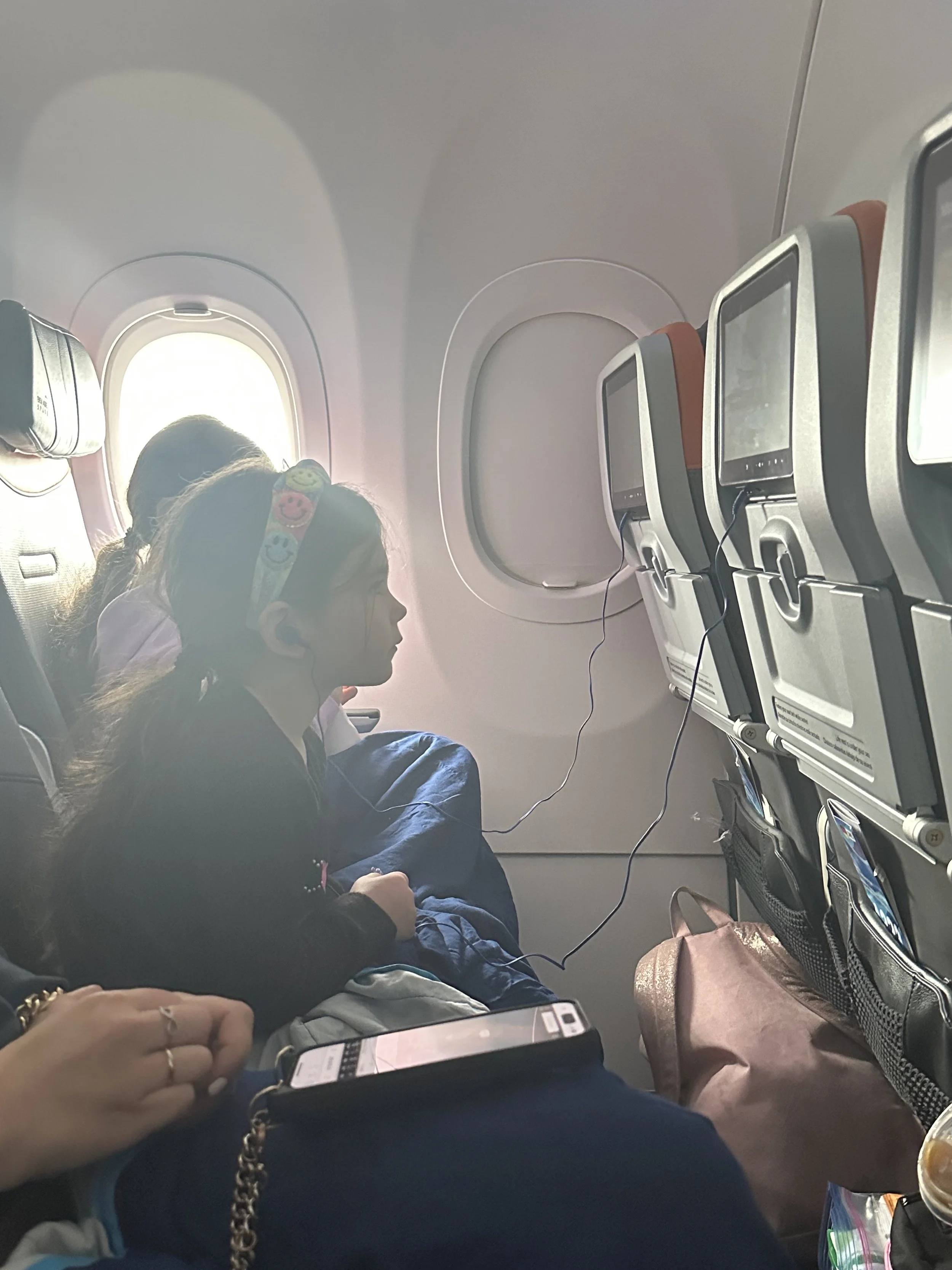 The flight itself was actually very nice. The captain came on the PA and gave us details: we’d push back, taxi for 20–25 minutes, and then take off. Flying time would be six and a half hours. I appreciated that—especially after our last horrible flights, where we just sat on the runway with no updates. And he was accurate: we taxied for about 25–27 minutes, just like he said.