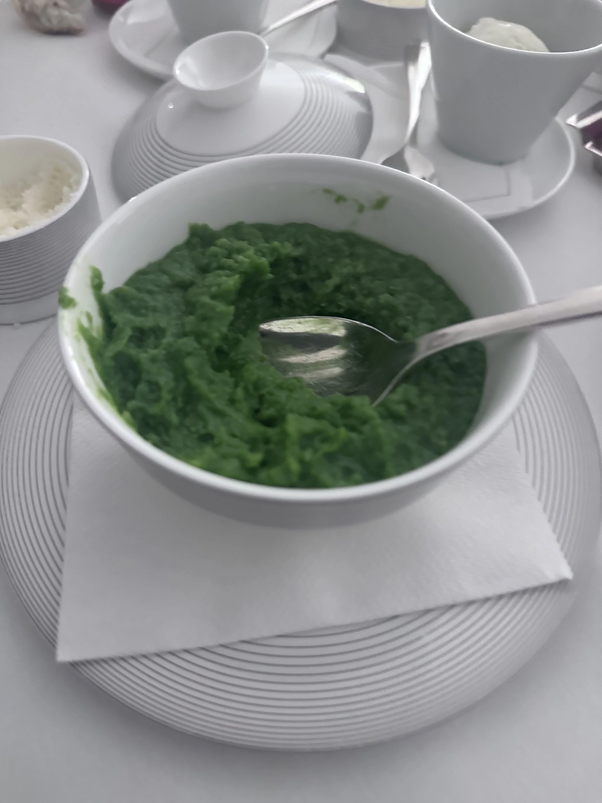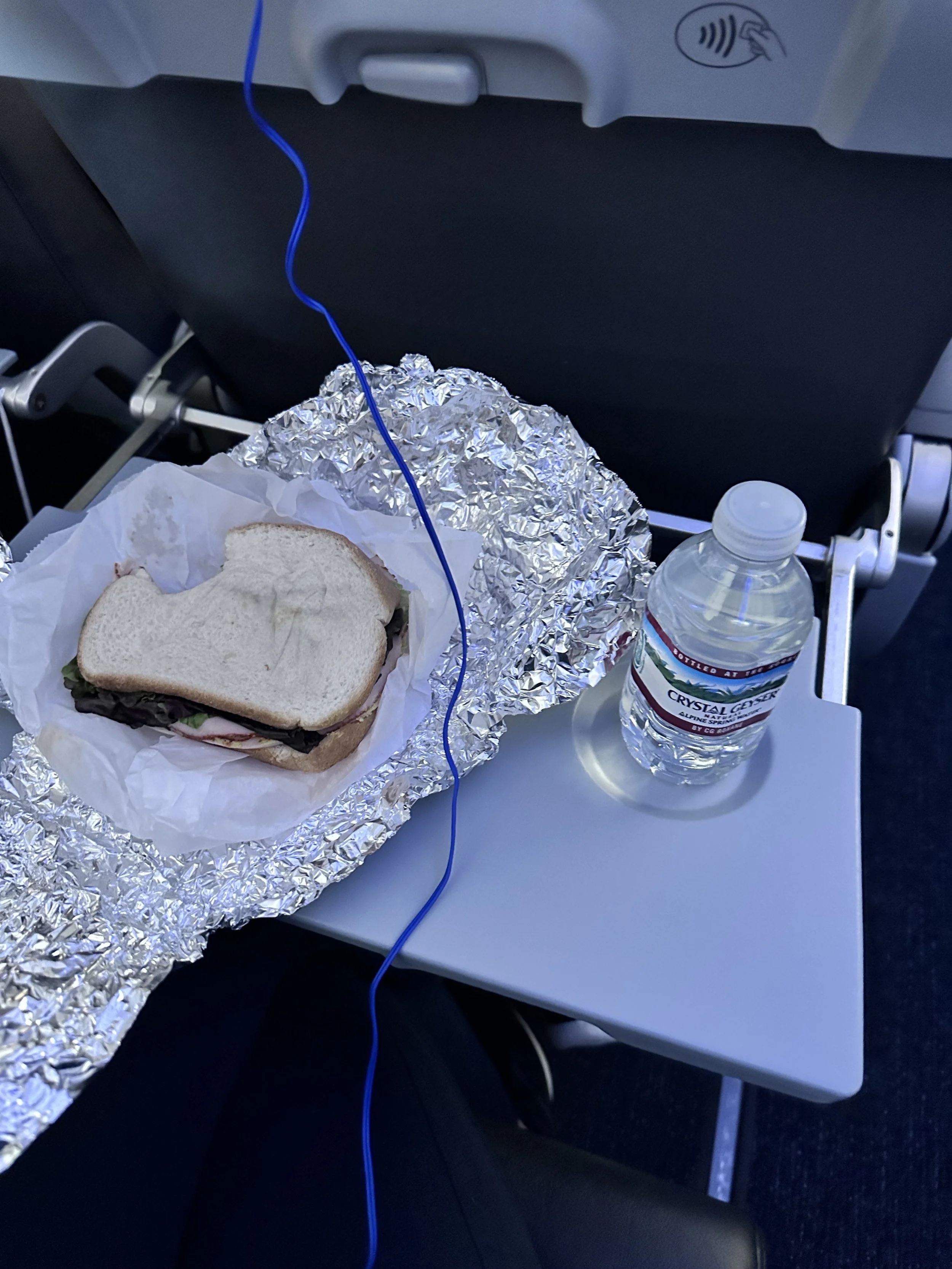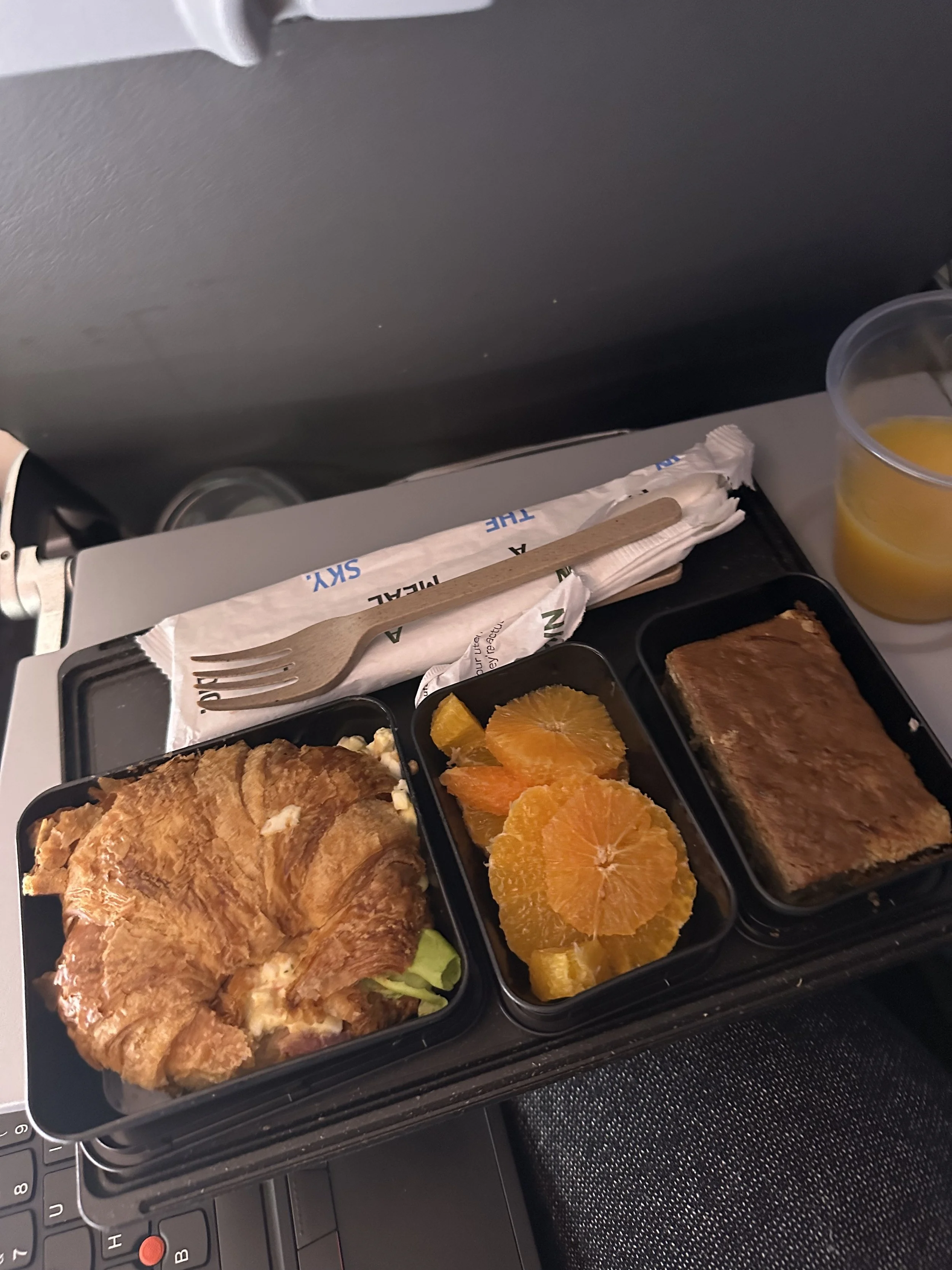 We were served one meal: breakfast. We had pre-ordered kosher but obviously they didn’t have it. The options were an egg salad croissant or a yogurt, plus a muffin-type thing and some fruit. Honestly, it was strange timing. We pushed back at 8:45, took off around 9:15–9:20, and then about an hour later they served breakfast. But you still had six hours of flying left. Why not just serve lunch later? It makes no sense—it feels too late in the morning for breakfast.