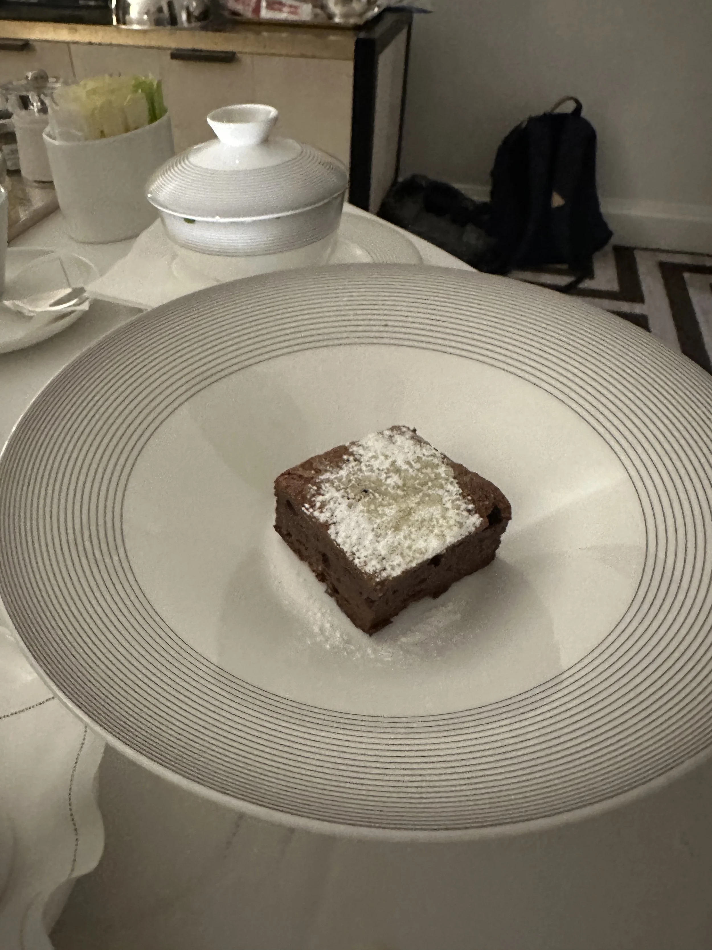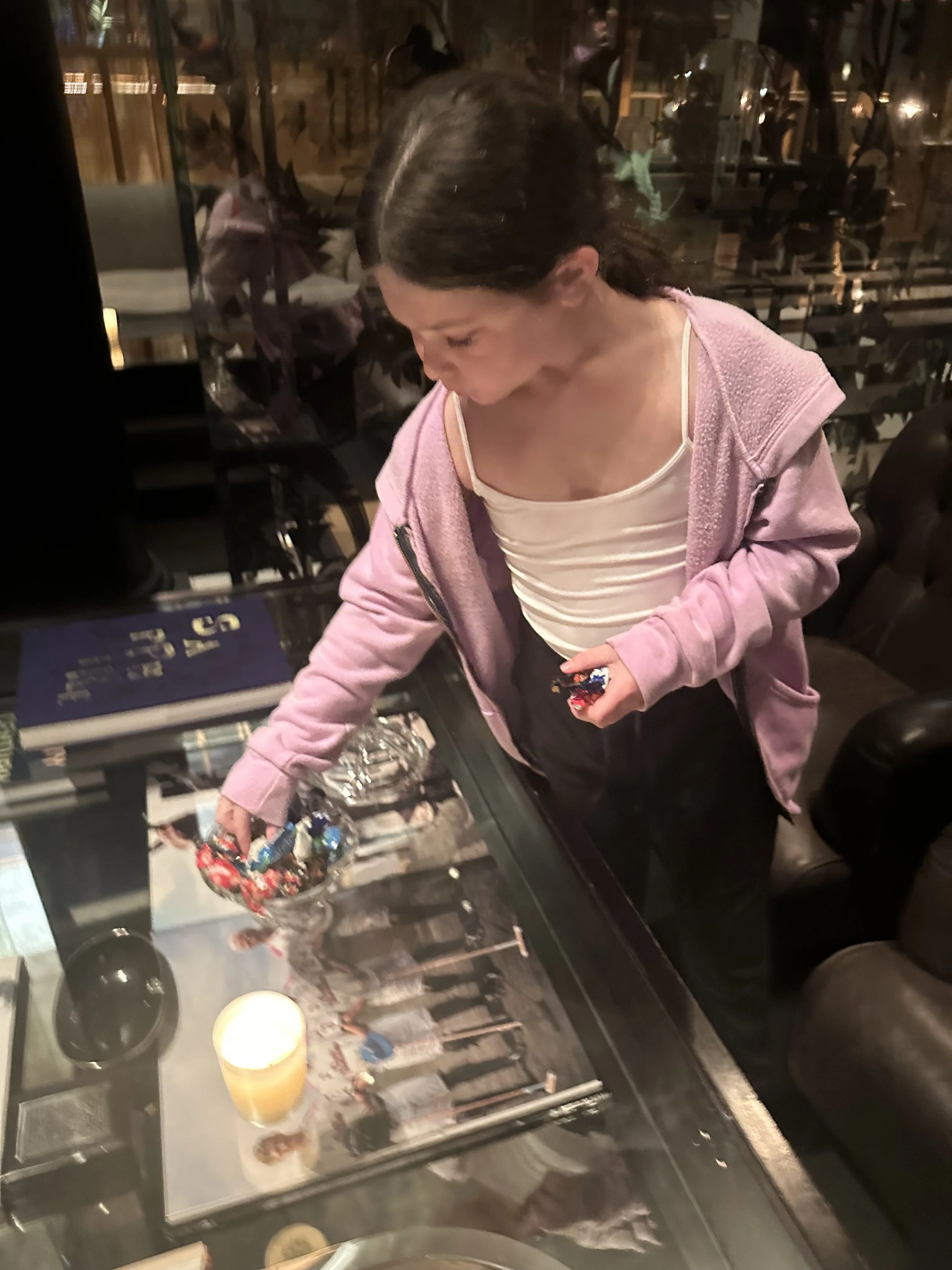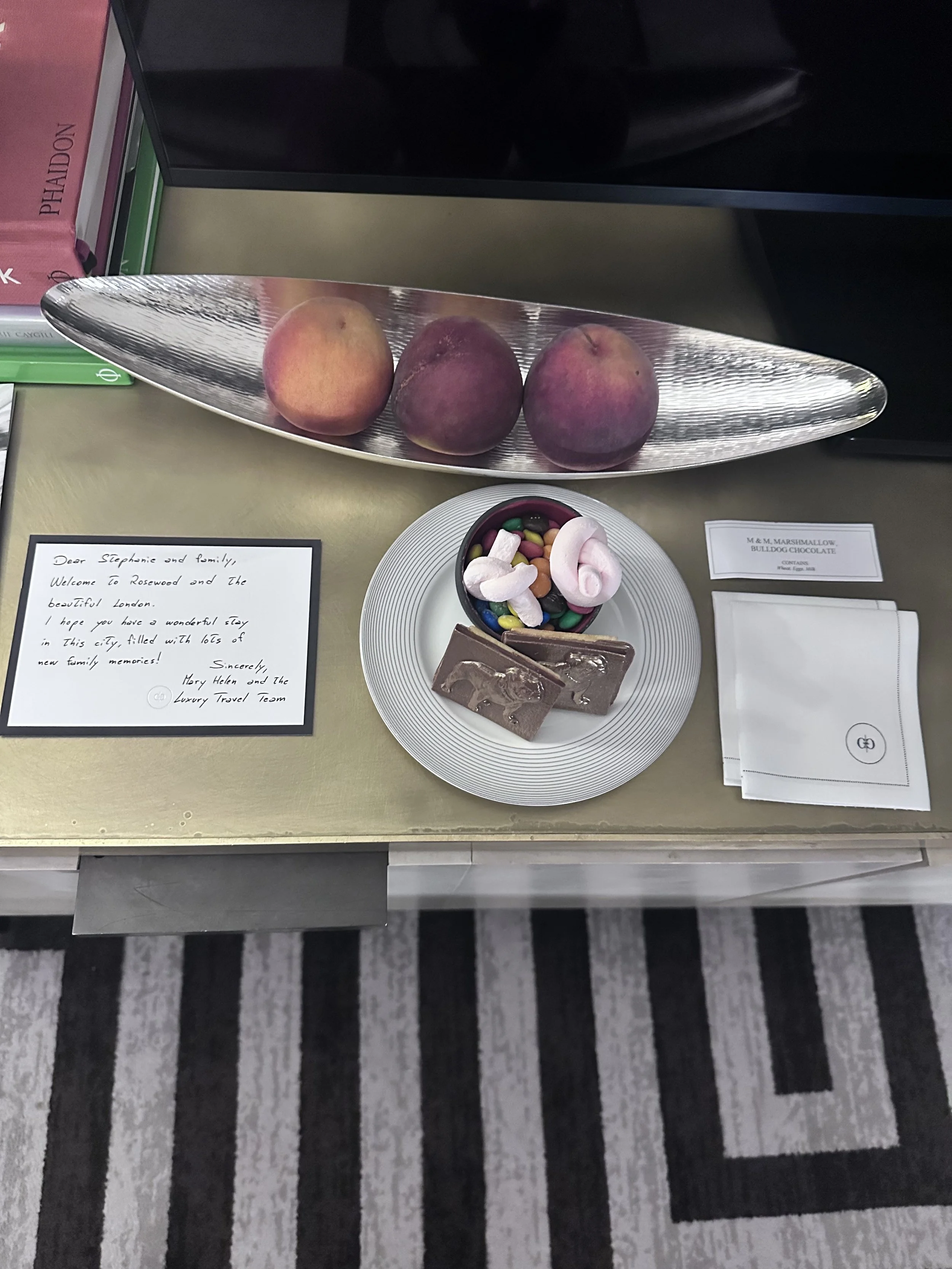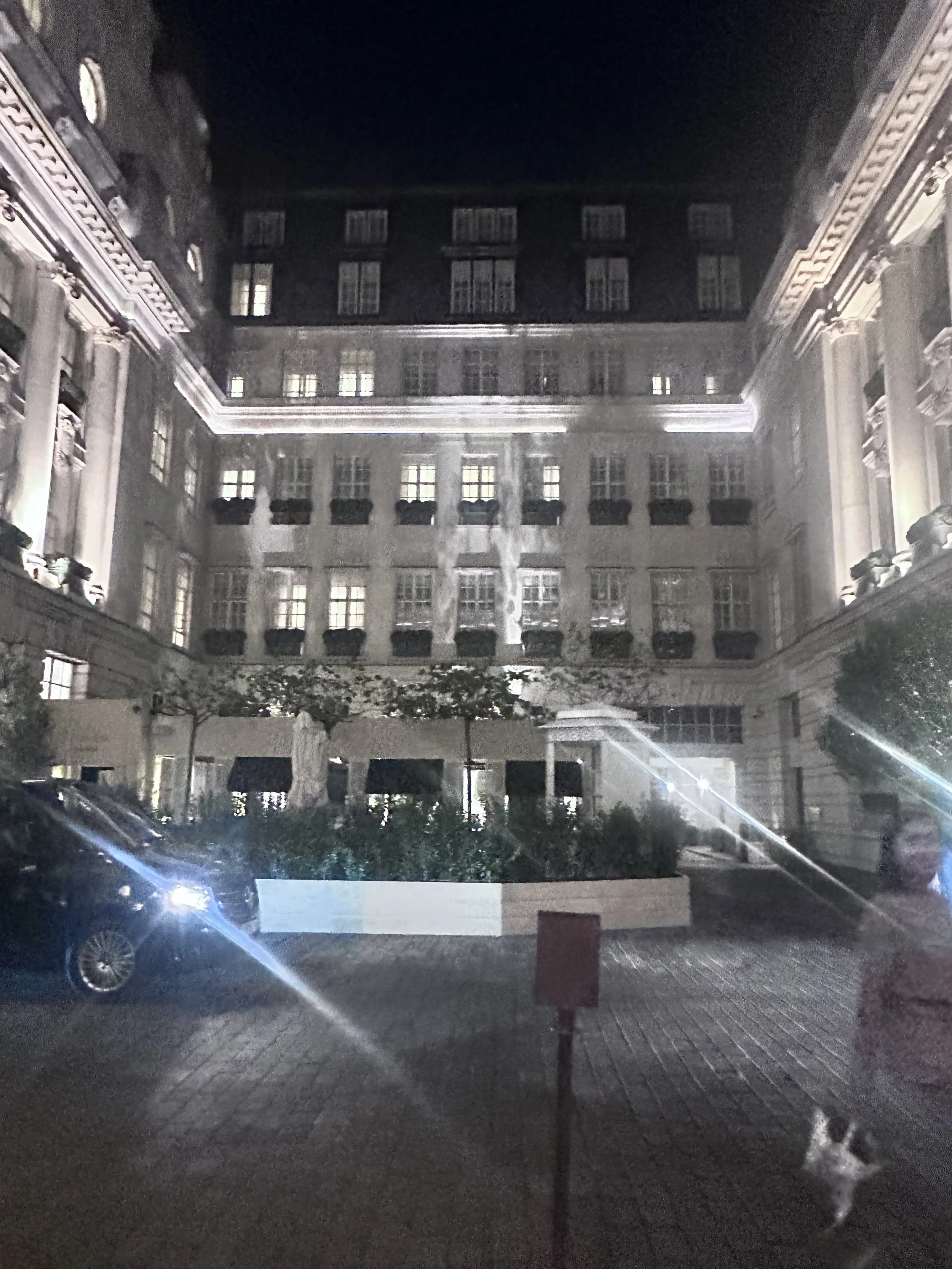 We pulled in, and it was beautiful. You drive into this gorgeous courtyard—even in the dark, when we could barely see, it was stunning. Inside, the lobby was just as gorgeous. Everything was dimly lit and atmospheric, so I’m sure it will look even more beautiful tomorrow in the daylight. And they had chocolate everywhere—little glass dishes filled with tiny chocolates scattered around. The kids were running from dish to dish collecting pieces.