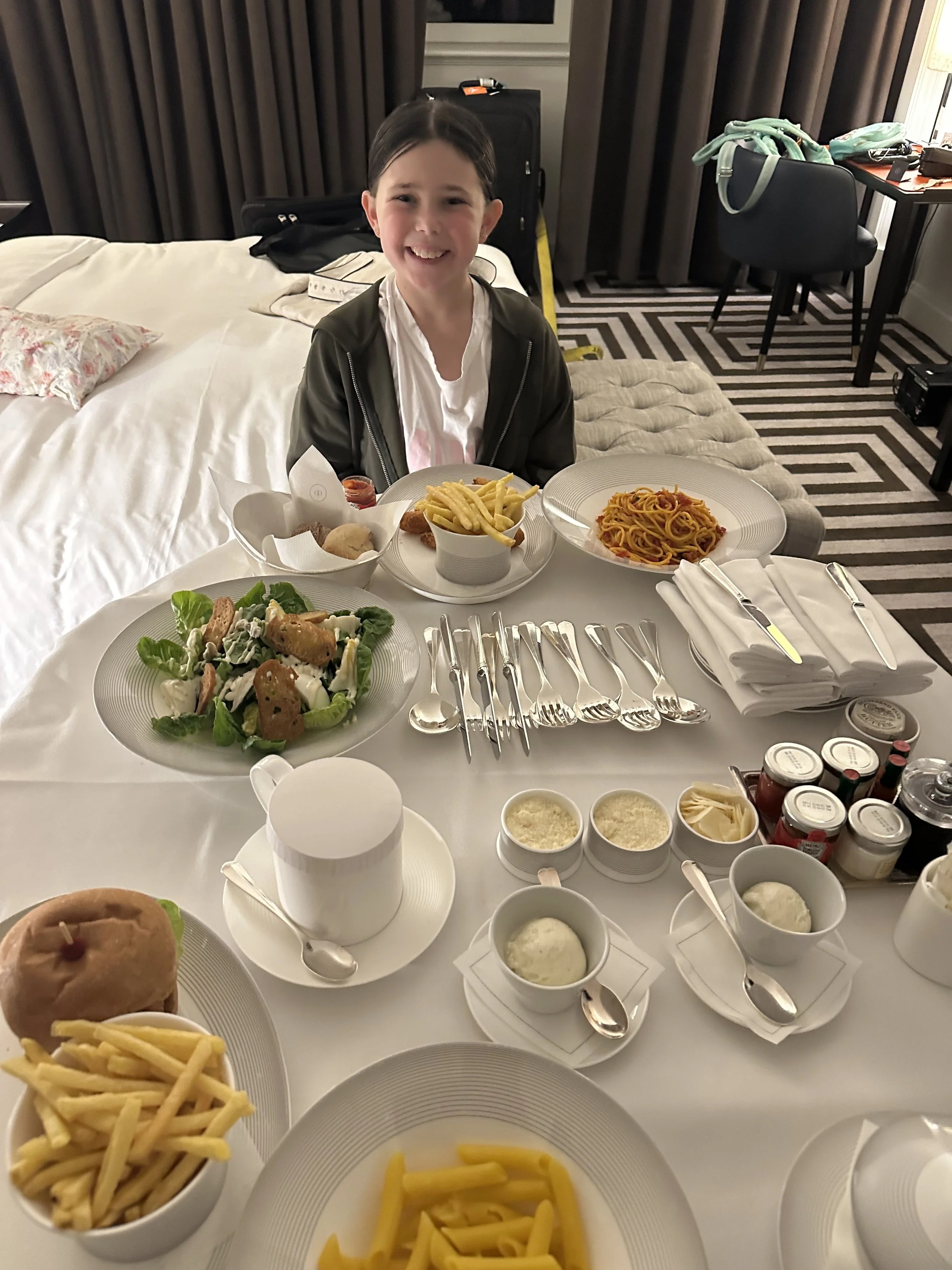 We unpacked a bit and ordered room service. I got this mushy vegetable dish from the kids’ menu that honestly looked like green vomit—but it actually tasted good. Tzvi and I also shared a veggie burger and Caesar salad. Hallie had fish goujons (which she didn’t like) and Madeleine had plain pasta (which she didn’t like), so basically the two kids just ate a lot of French fries. We also got a sticky toffee pudding and a chocolate brownie and doused both with caramel sauce. It was delicious.