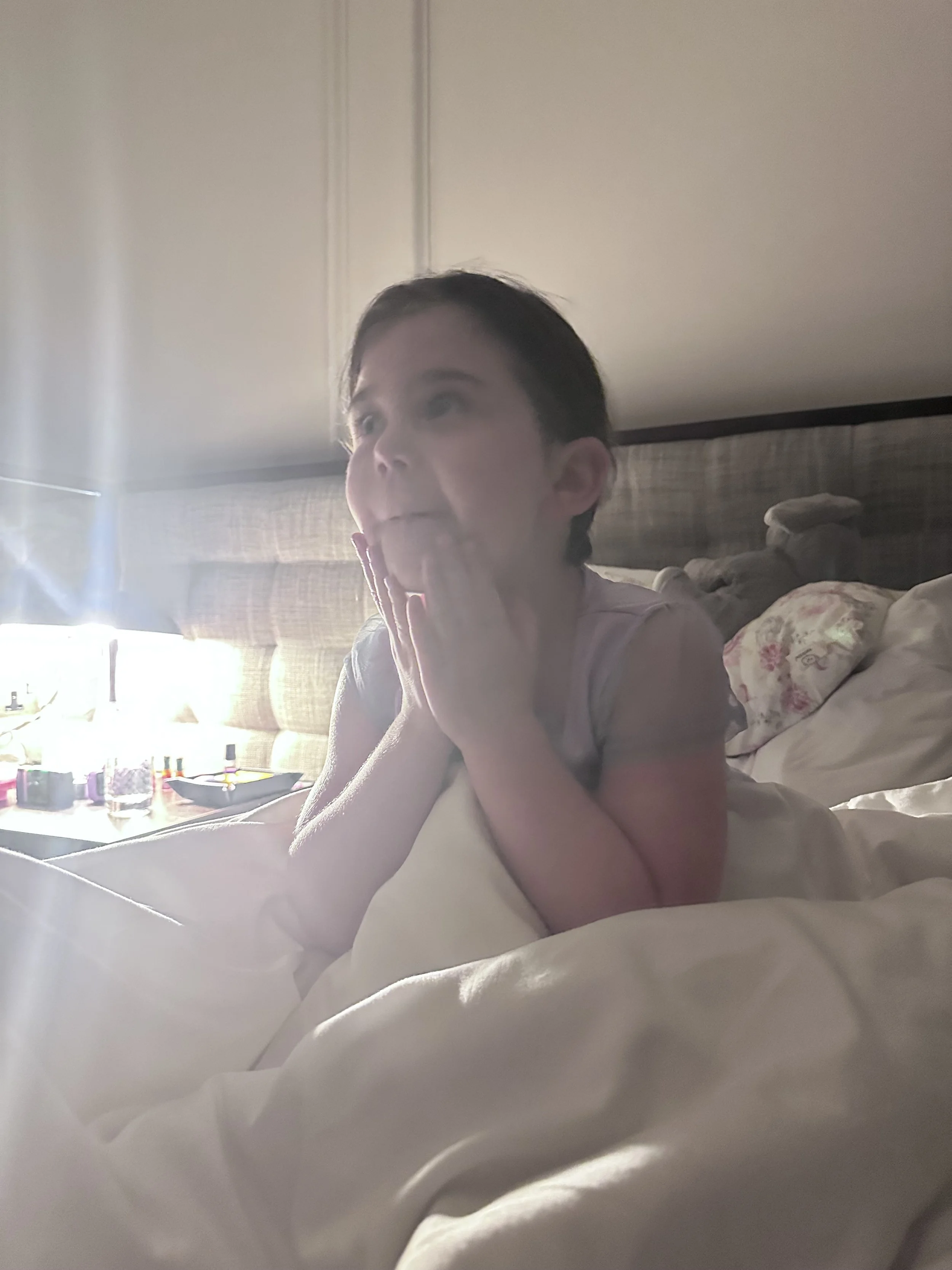 Meanwhile, Monday night rolls around and Madeleine says her head hurts. What do you know? She has a fever. Of course, I’m freaking out, thinking: Great, she has COVID. So, I take her to urgent care where they do a strep test and a COVID test. Both come back negative. But she’s also saying her stomach hurts, her throat hurts… and I’m thinking, okay, this could be strep (because those are the symptoms), but it could also be COVID.