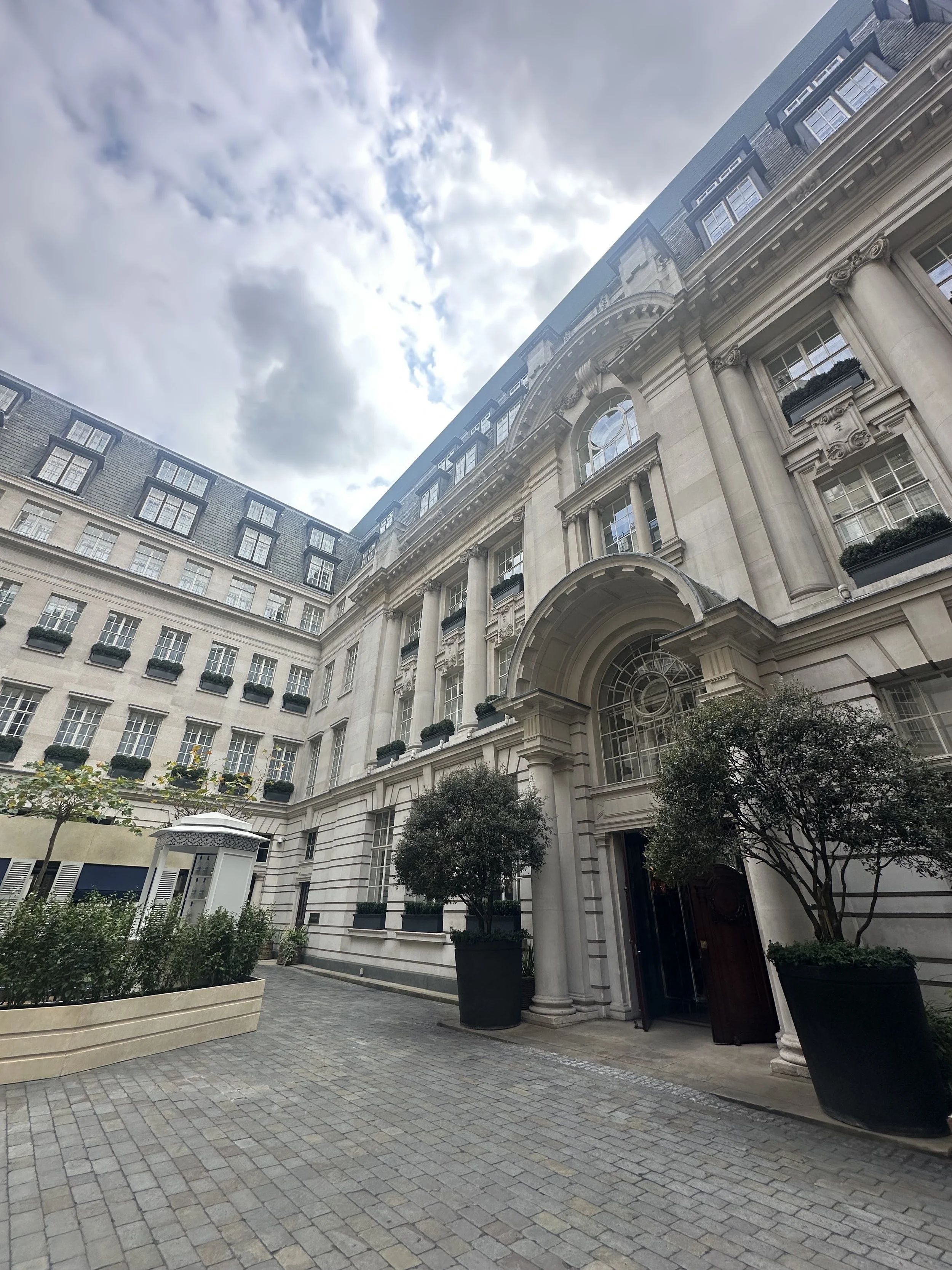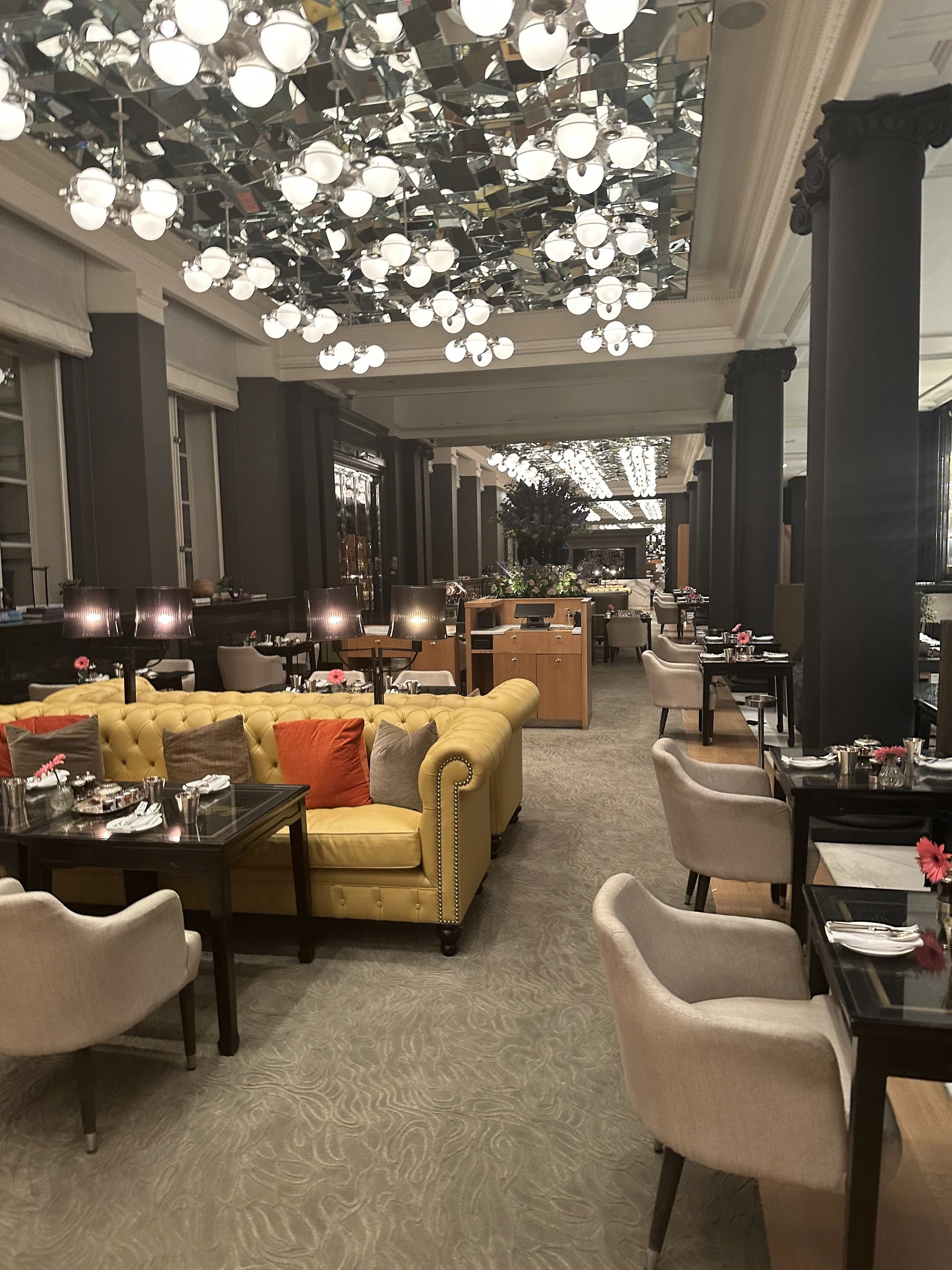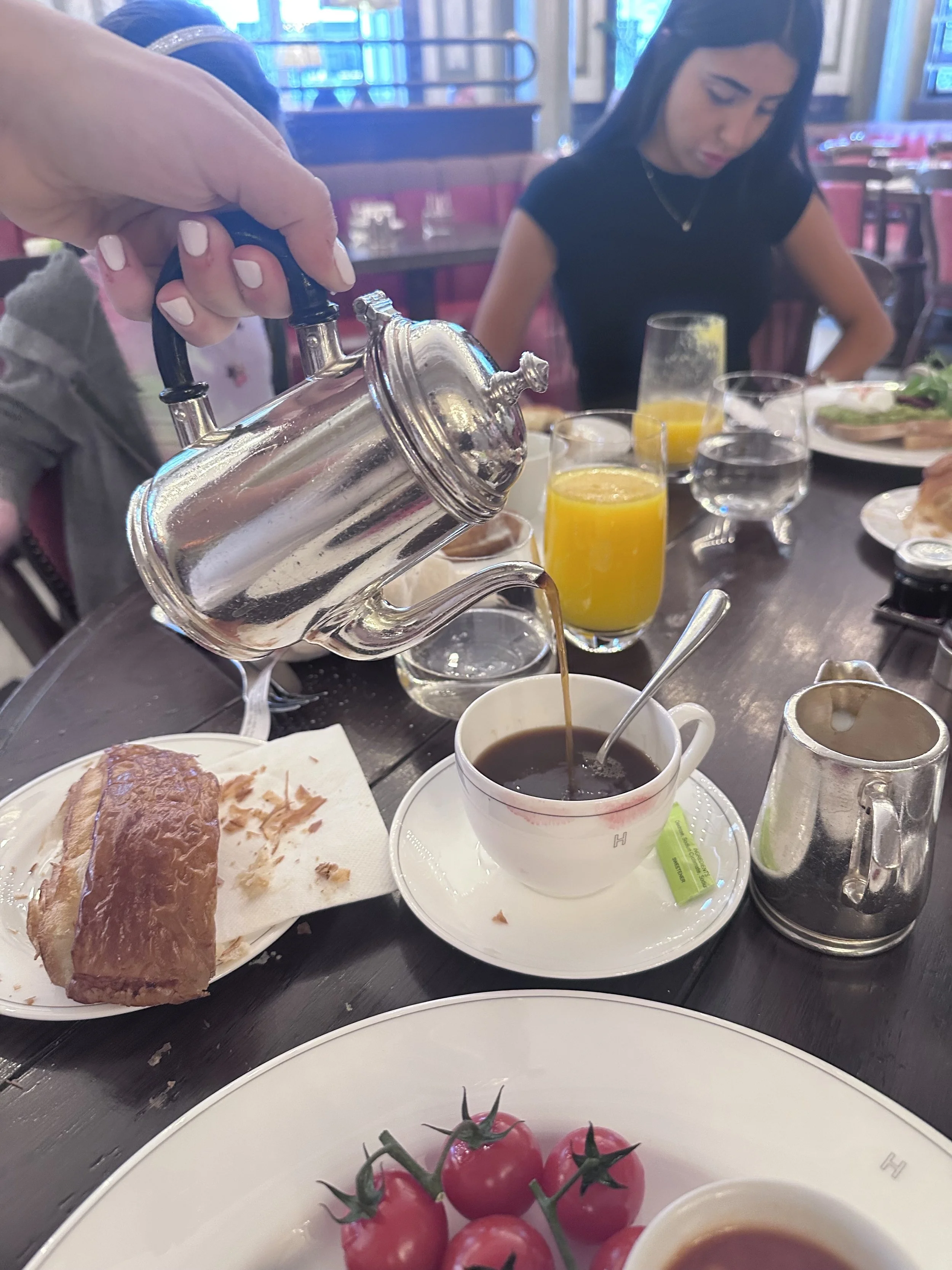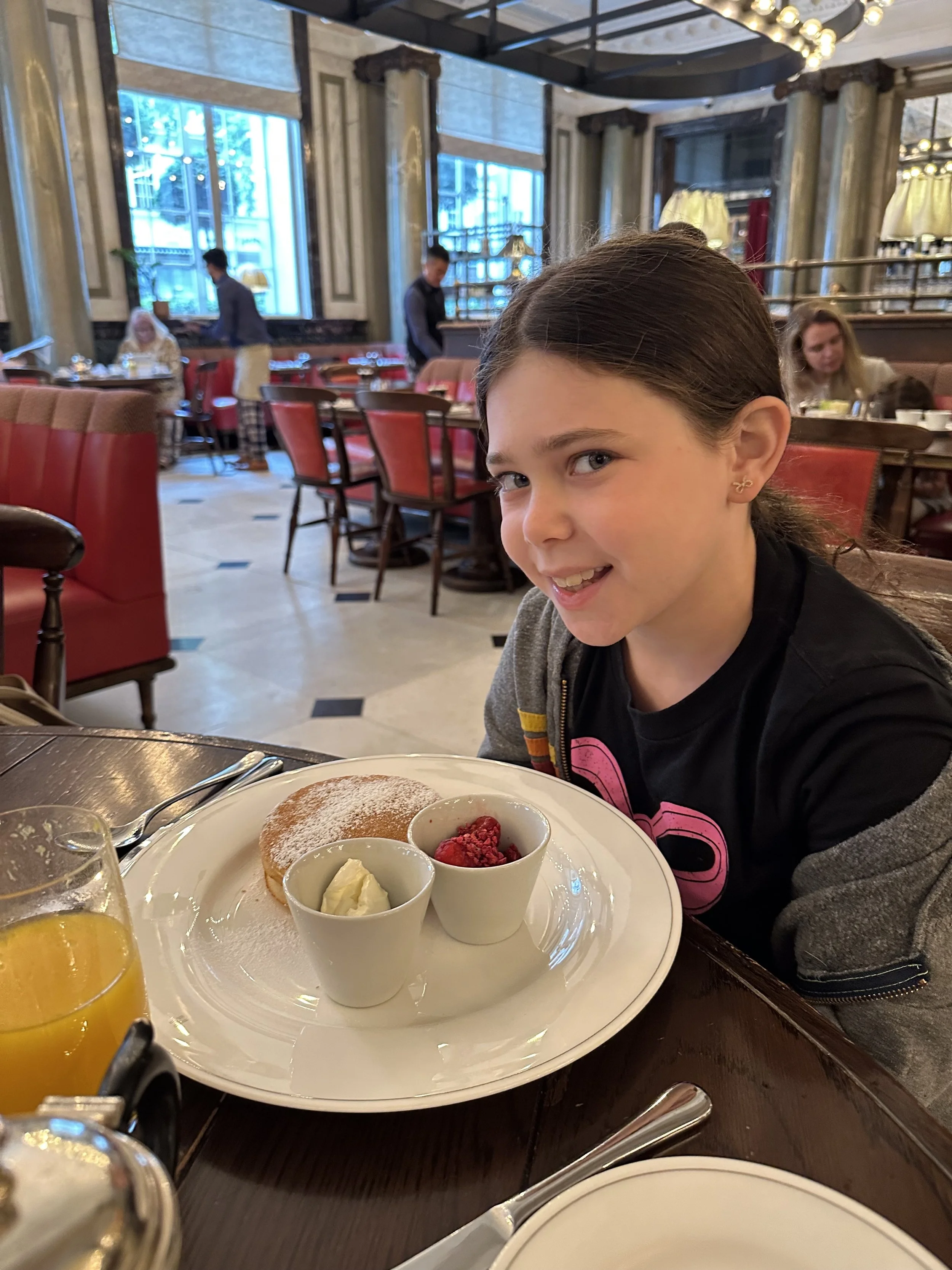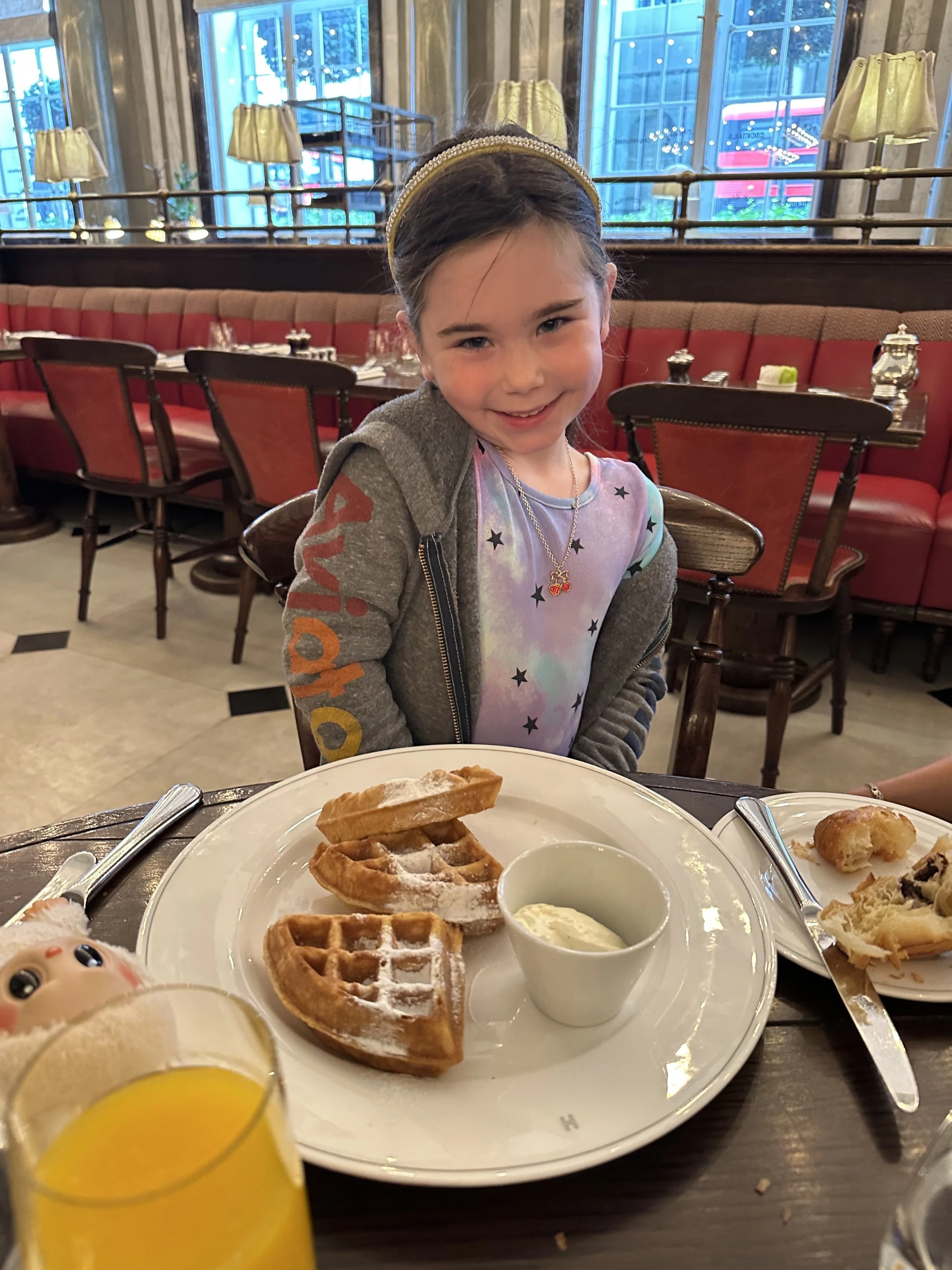 I gave the kids melatonin though, and everyone did OK, all things considered. We hadn’t scheduled anything for Friday because we knew we’d never be able to get anywhere at a specific time. The only thing we knew was that breakfast closed at 11. We got up by 9:45 and headed to breakfast in the Holborn Dining Room, the main restaurant at the hotel. We walked through the gorgeous courtyard to get to the dining room, and I was right, in the light it’s even nicer. The dining room is very nice too. For breakfast we had an option of either taking a pre-set package or a la carte but you were allotted up to 32 pounds each. Today we opted for the Traditional English Breakfast – coffee, juice, eggs, tomatoes, baked beans, veggie sausage, avocado toast, waffles, and more.