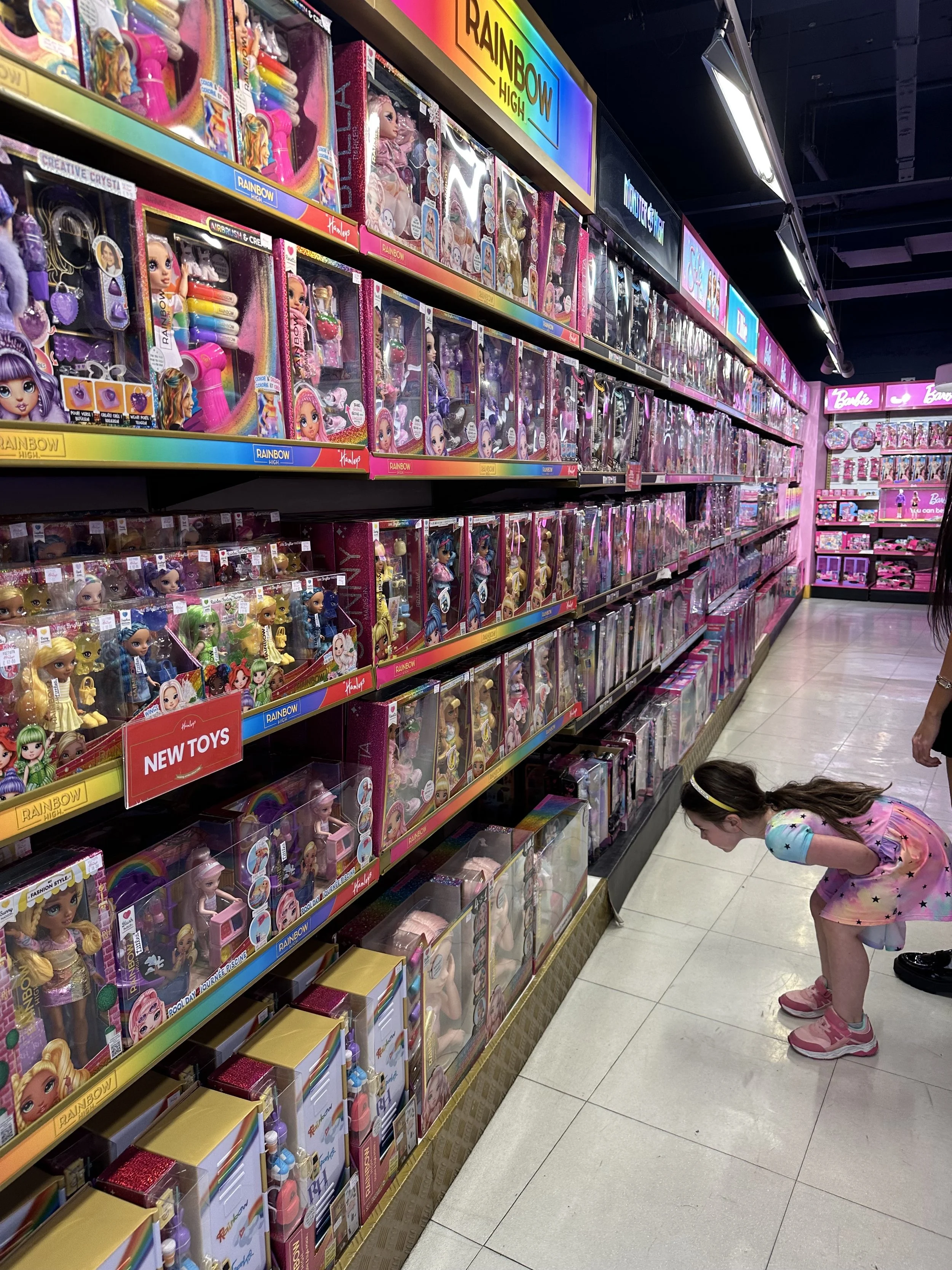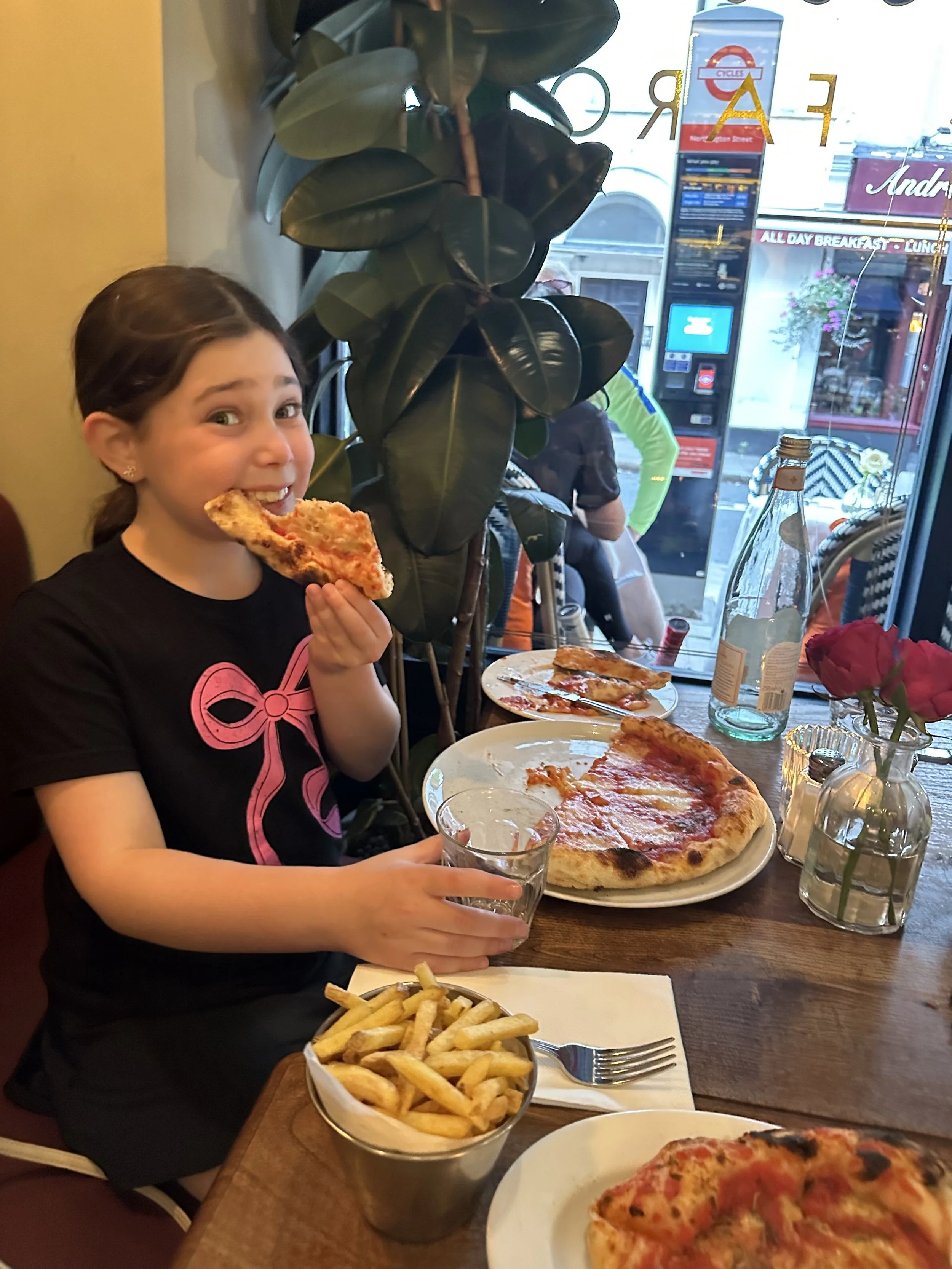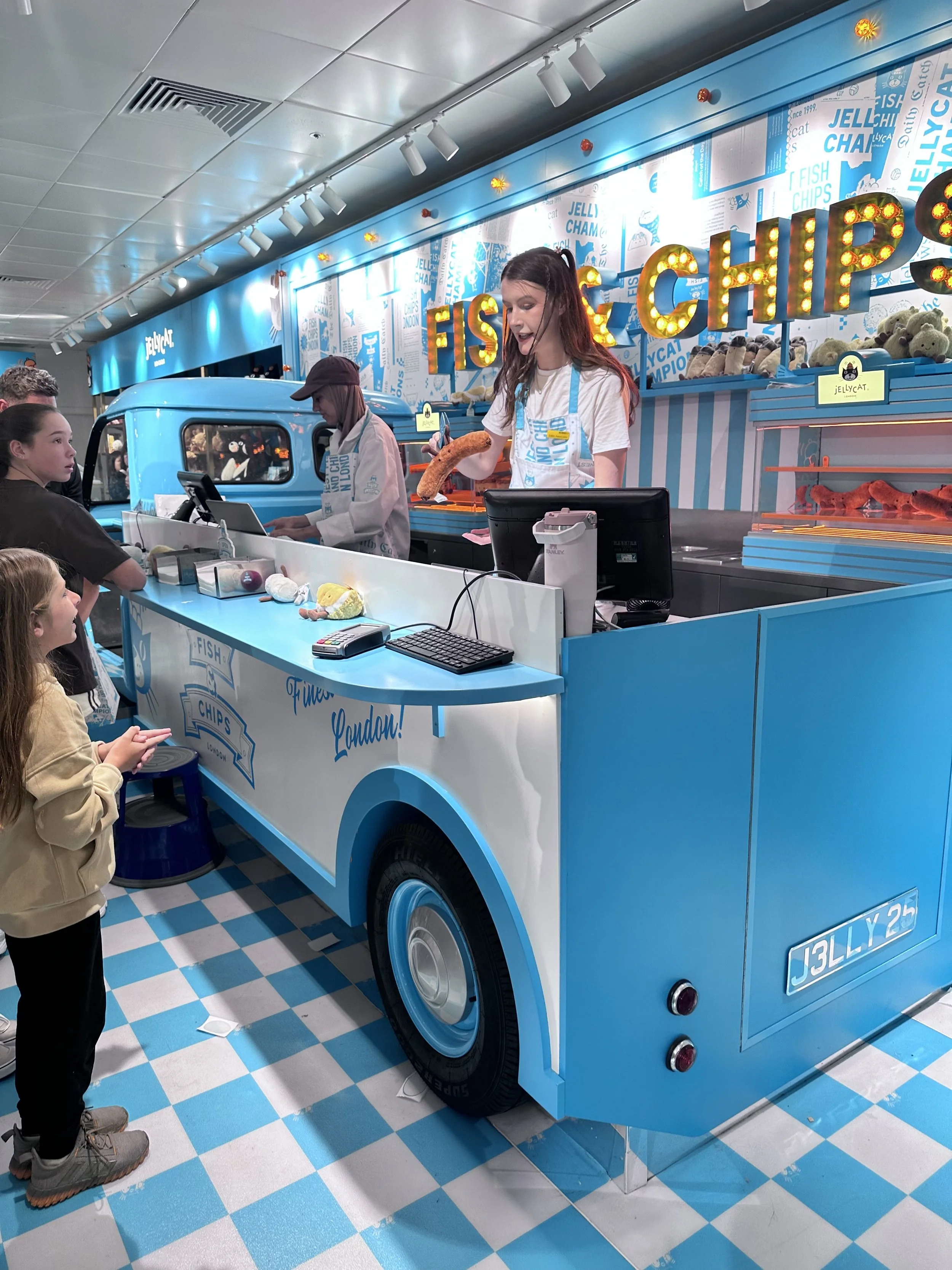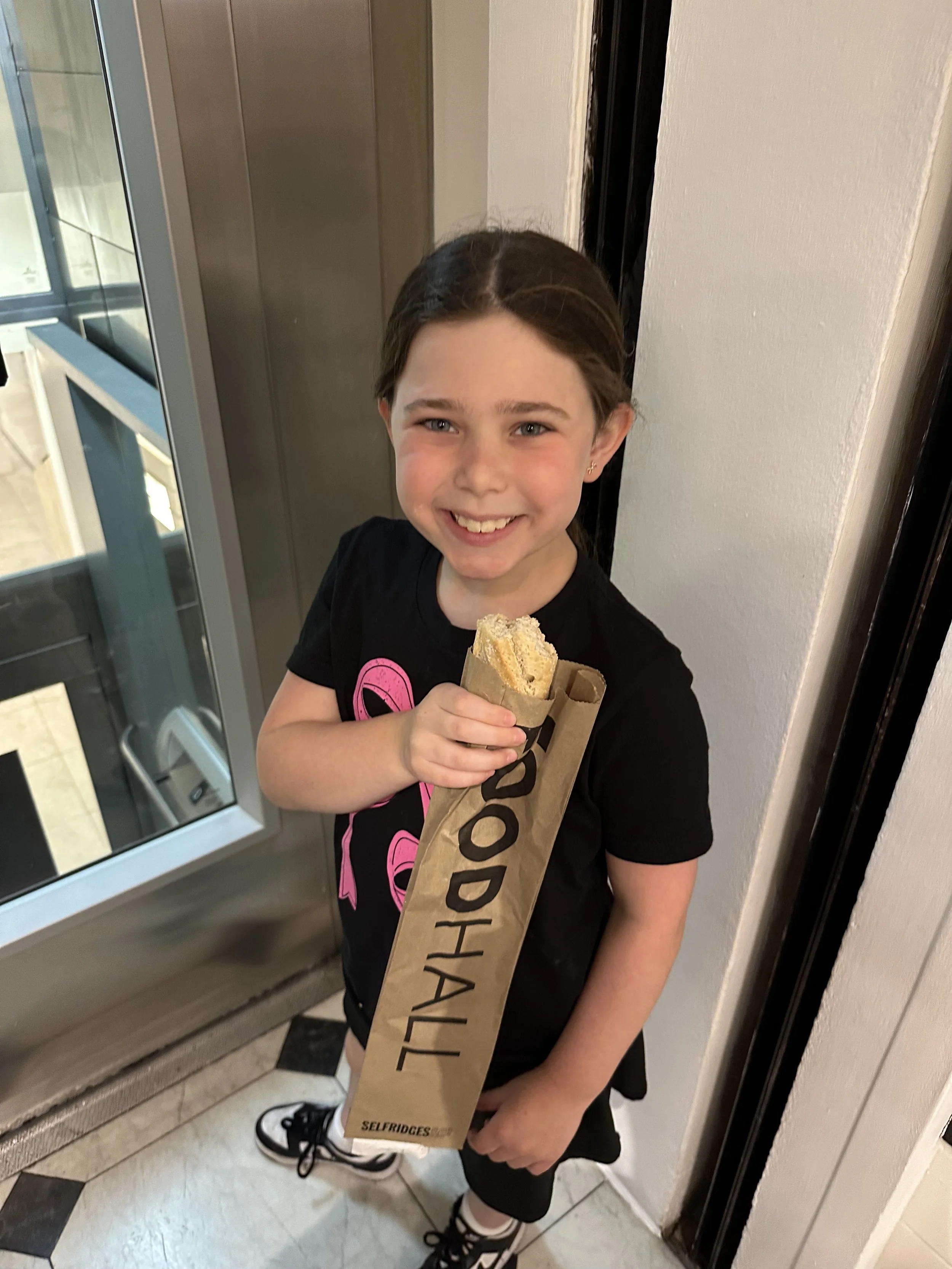 Then we walked to Hamleys, the biggest Toy Store (in the world?), which was five floors and huge. They had a large collection of Barbies and Rainbow High Dolls. Madeleine got a Rainbow High Doll and Hallie got some weird ball and some doll. We kept walking and Shir and I went shopping at Stradivarius, which a Spanish brand that we don’t have in America, and one of my favorites that I usually shop at in Israel (there is one in Mamilla Mall). Then we hit Selfridges where we walked around and got a coffee in the food hall, and Hallie got a baguette. We went upstairs to the Jellycat Flagship area. You can book a Jellycat appointment there at the Jellycat diner where they cook you up Jellycat fish and chips. I didn’t realize you could book it, but the kids didn’t need to do that anyway. They each bought Jellycats. Madeleine got a pizza, and guess what, Hallie got a baguette.