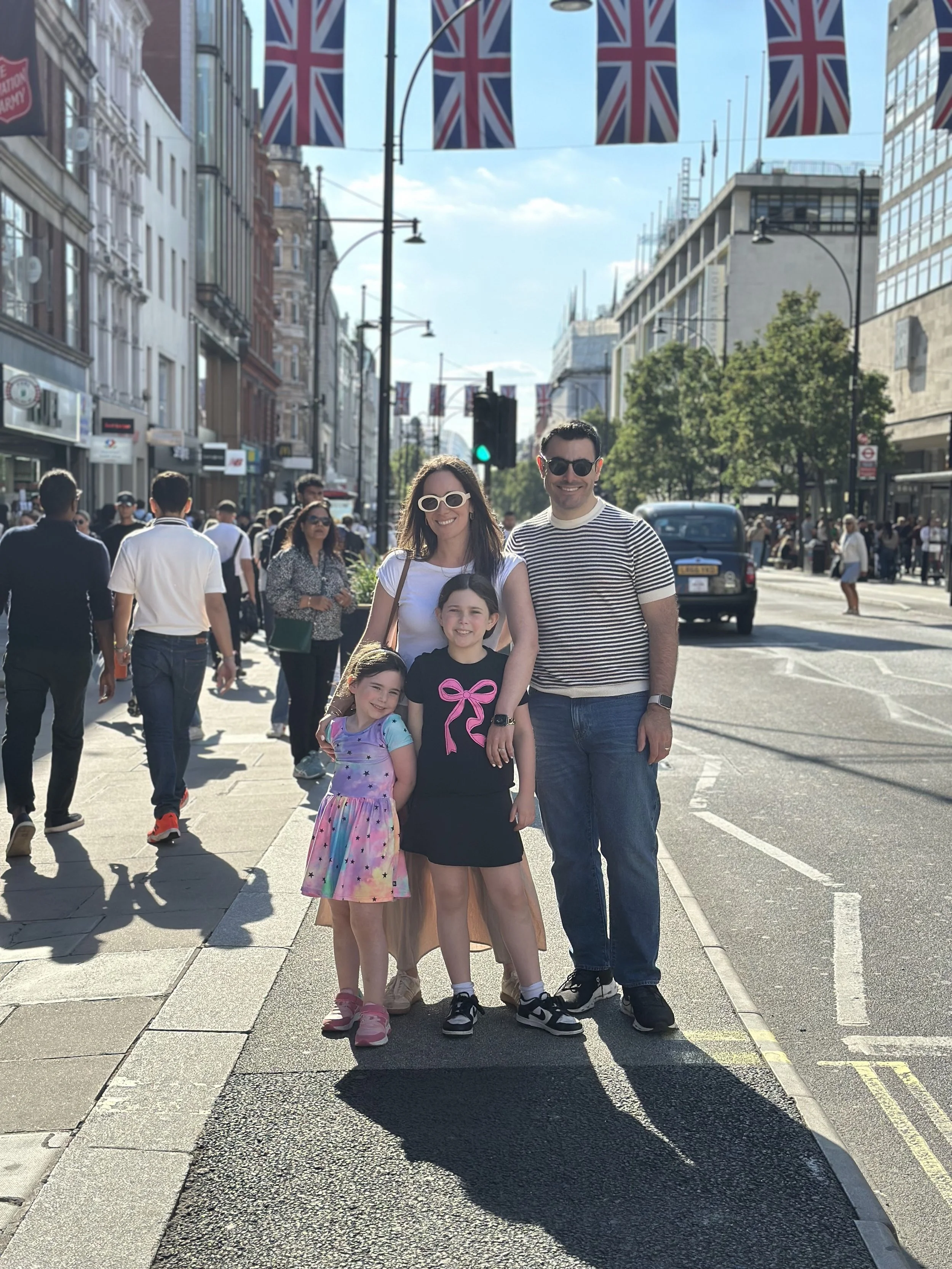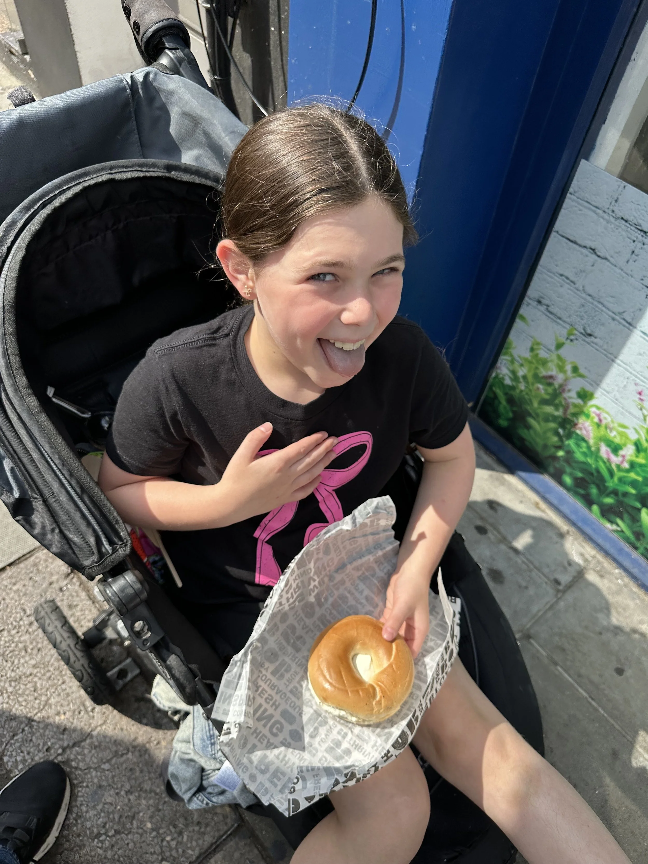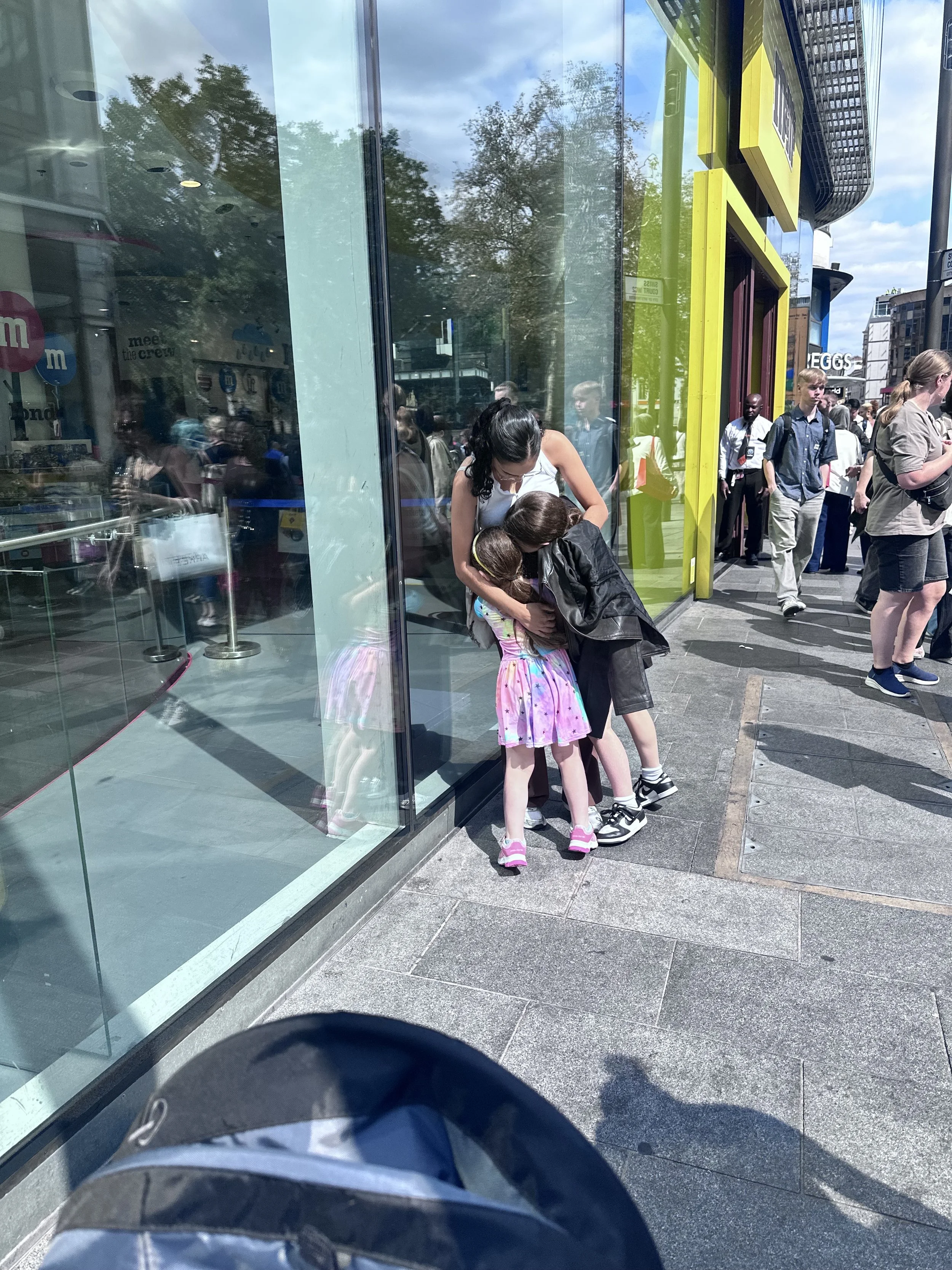 Then we walked to Hamleys, the biggest Toy Store (in the world?), which was five floors and huge. They had a large collection of Barbies and Rainbow High Dolls. Madeleine got a Rainbow High Doll and Hallie got some weird ball and some doll. We kept walking and Shir and I went shopping at Stradivarius, which a Spanish brand that we don’t have in America, and one of my favorites that I usually shop at in Israel (there is one in Mamilla Mall). Then we hit Selfridges where we walked around and got a coffee in the food hall, and Hallie got a baguette. We went upstairs to the Jellycat Flagship area. You can book a Jellycat appointment there at the Jellycat diner where they cook you up Jellycat fish and chips. I didn’t realize you could book it, but the kids didn’t need to do that anyway. They each bought Jellycats. Madeleine got a pizza, and guess what, Hallie got a baguette.