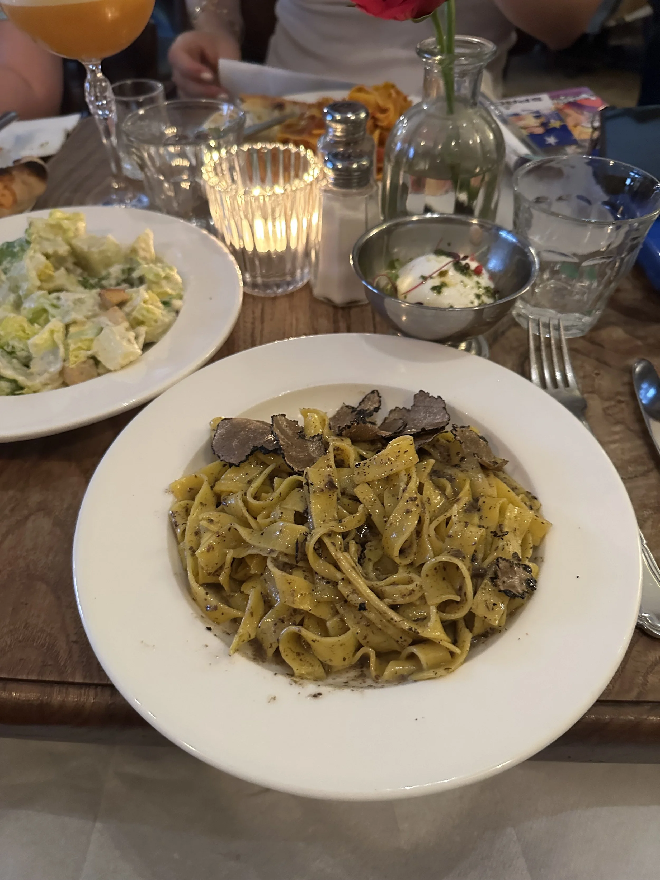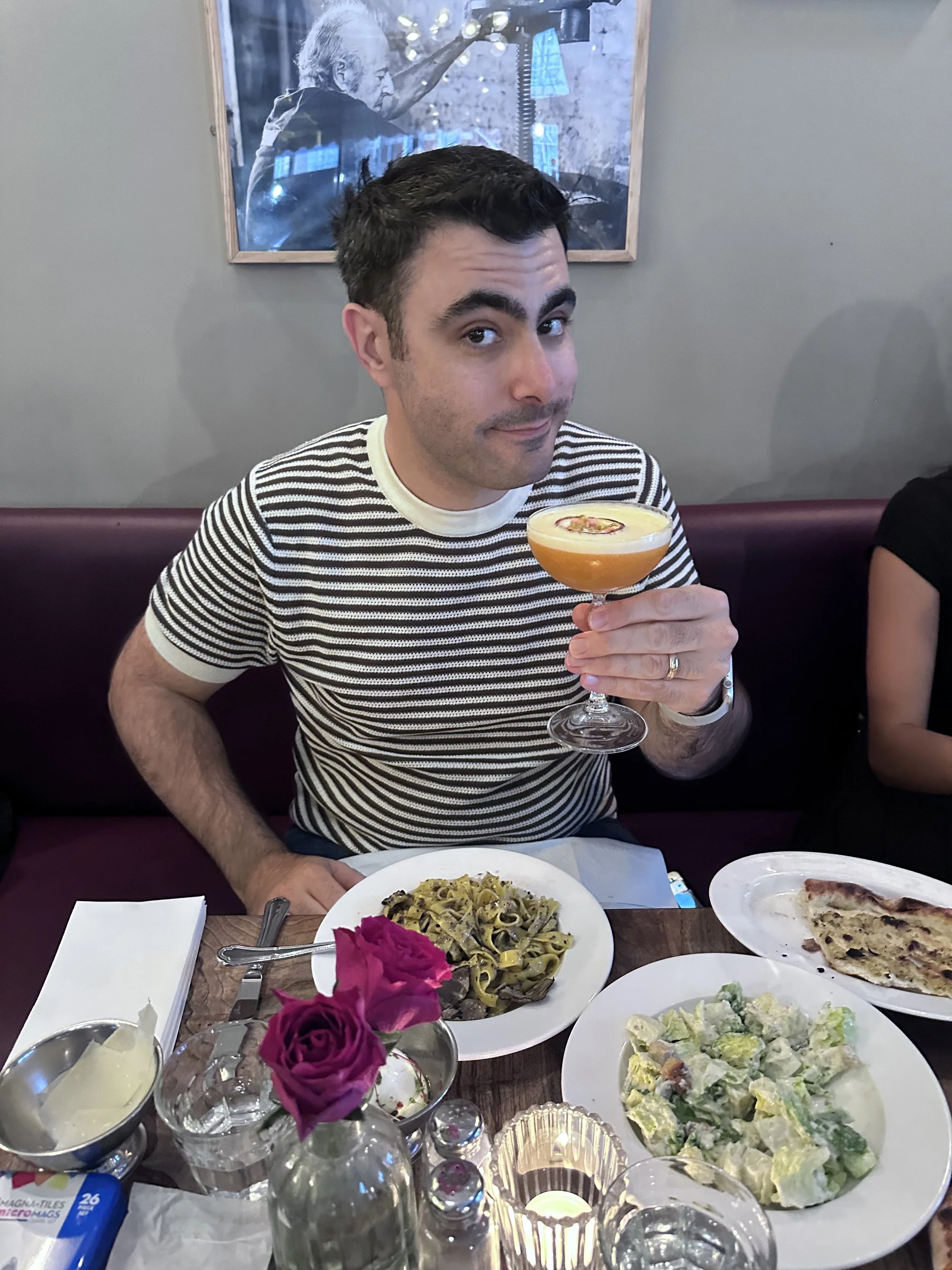 We went back to the hotel and dropped our stuff, then went straight back out and walked to dinner. Given Shabbos was starting soon we opted to eat somewhere in the neighborhood, only about ten minutes away, so we could walk back. Dinner was at Faros, a small Italian restaurant. It was very nice but had no air. It wasn’t hot, but it was just so stuffy. I don’t know how people function like this. The food was good but the kids were losing it. We shared a Pornstar Martini, which was nice, Hallie had pizza, Tzvi had a creamy truffle pasta and I had pasta with tomato sauce.