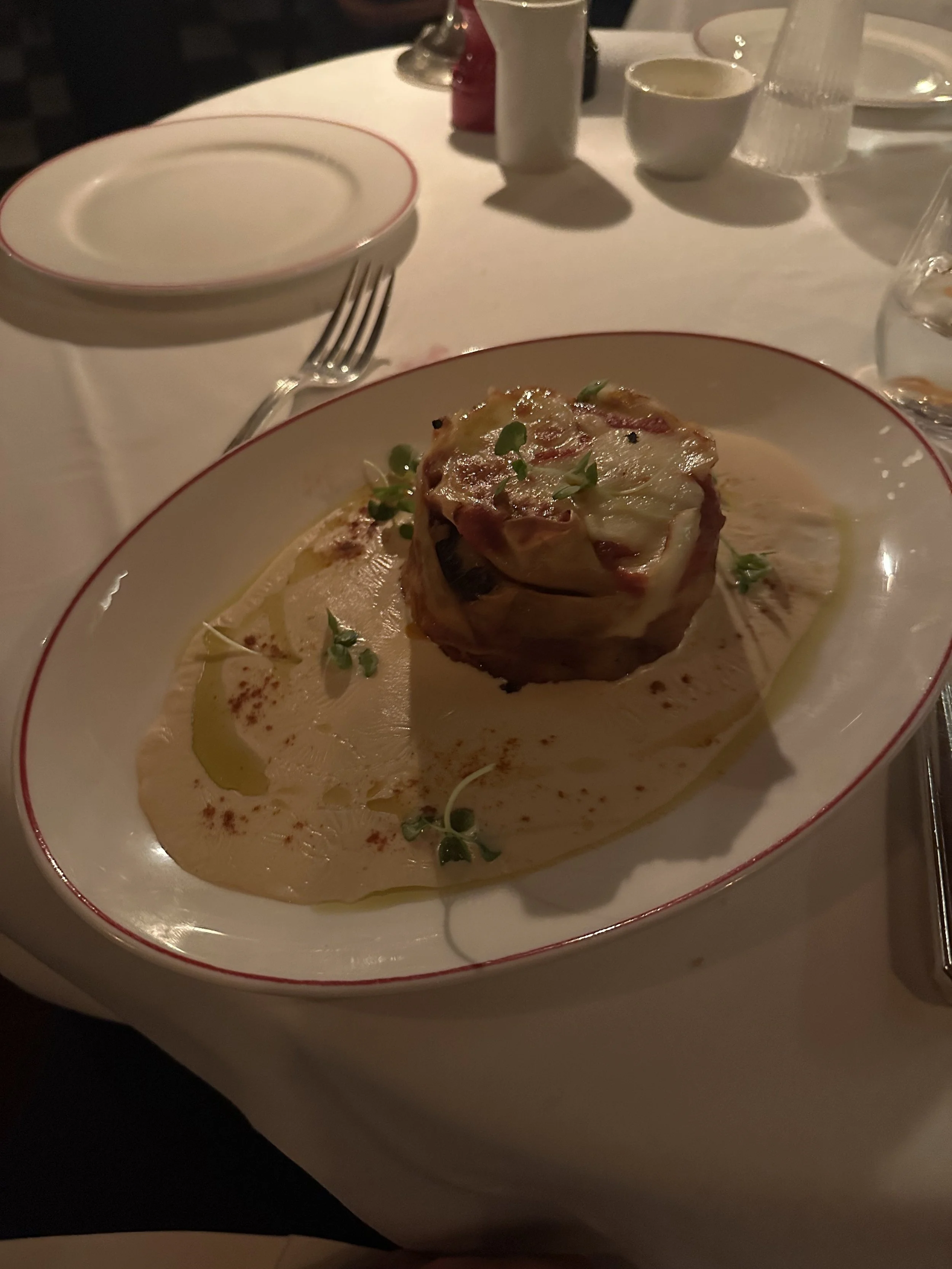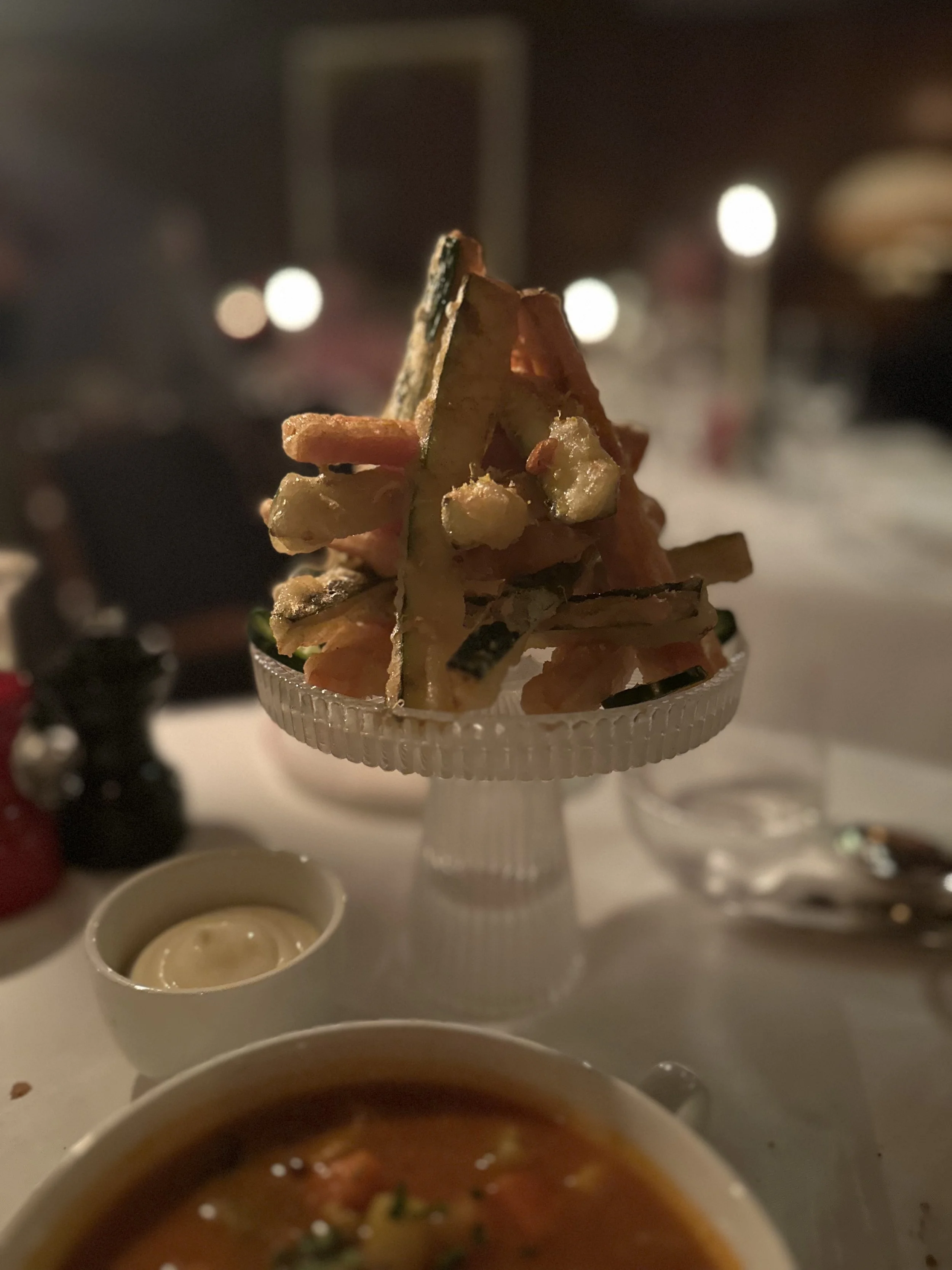 Anyway, dinner was very good. I started with a fruity martini that was amazing, and Tzvi had a more basic martini. For food, we shared fried zucchini and sweet potato that came in a tower like very thick matchsticks, minestrone soup, and a salad with beets and barley and pomegranate seeds. Then came the mains: Tzvi had a dish that was basically a cross between an eggplant parmesan and a lasagna (which he absolutely loved), and I had salmon (which was just okay). For dessert, we hesitated but finally ordered the salted caramel ice cream with brownie pieces, which turned out to be delicious—a perfect way to end the meal.