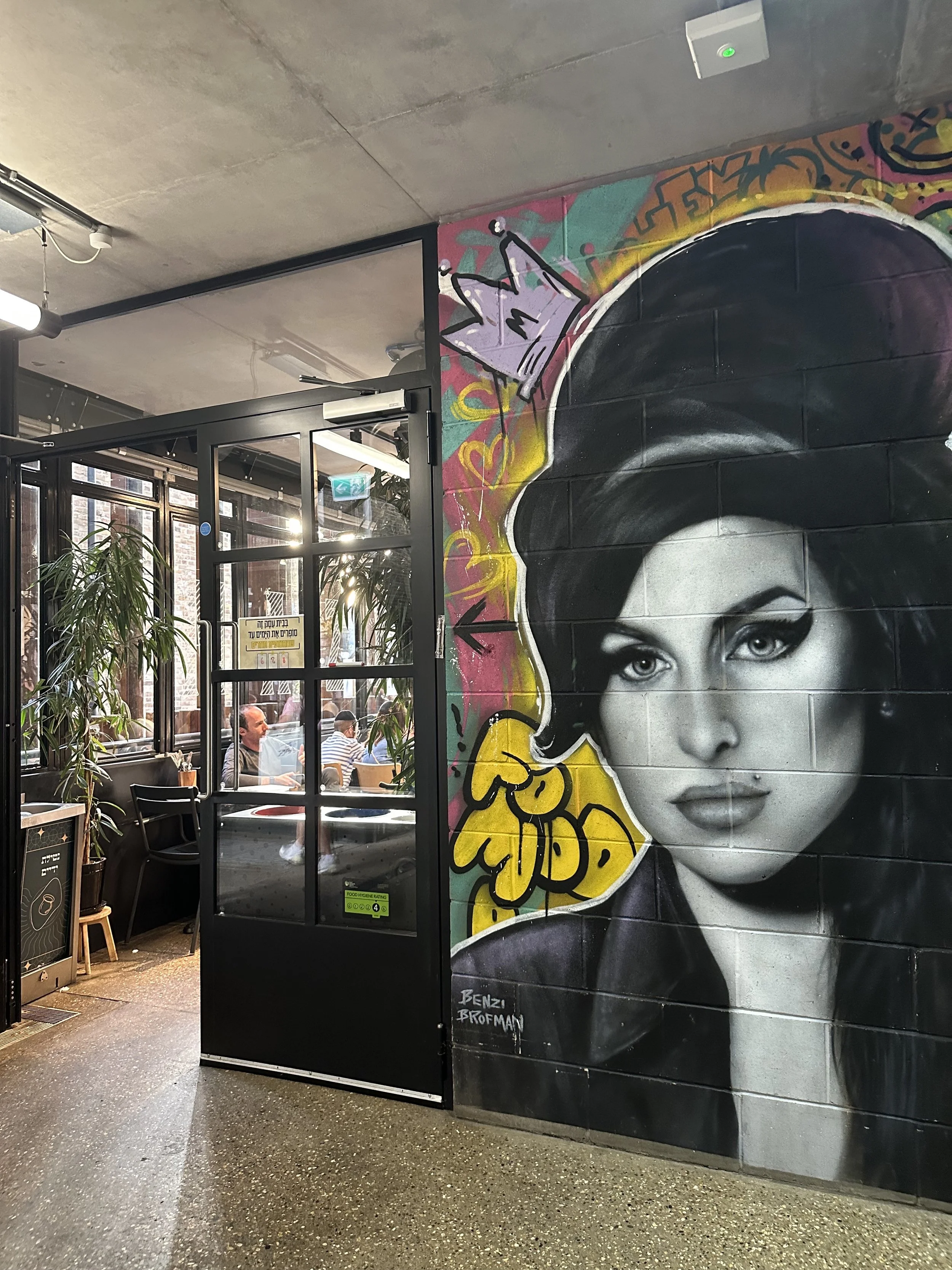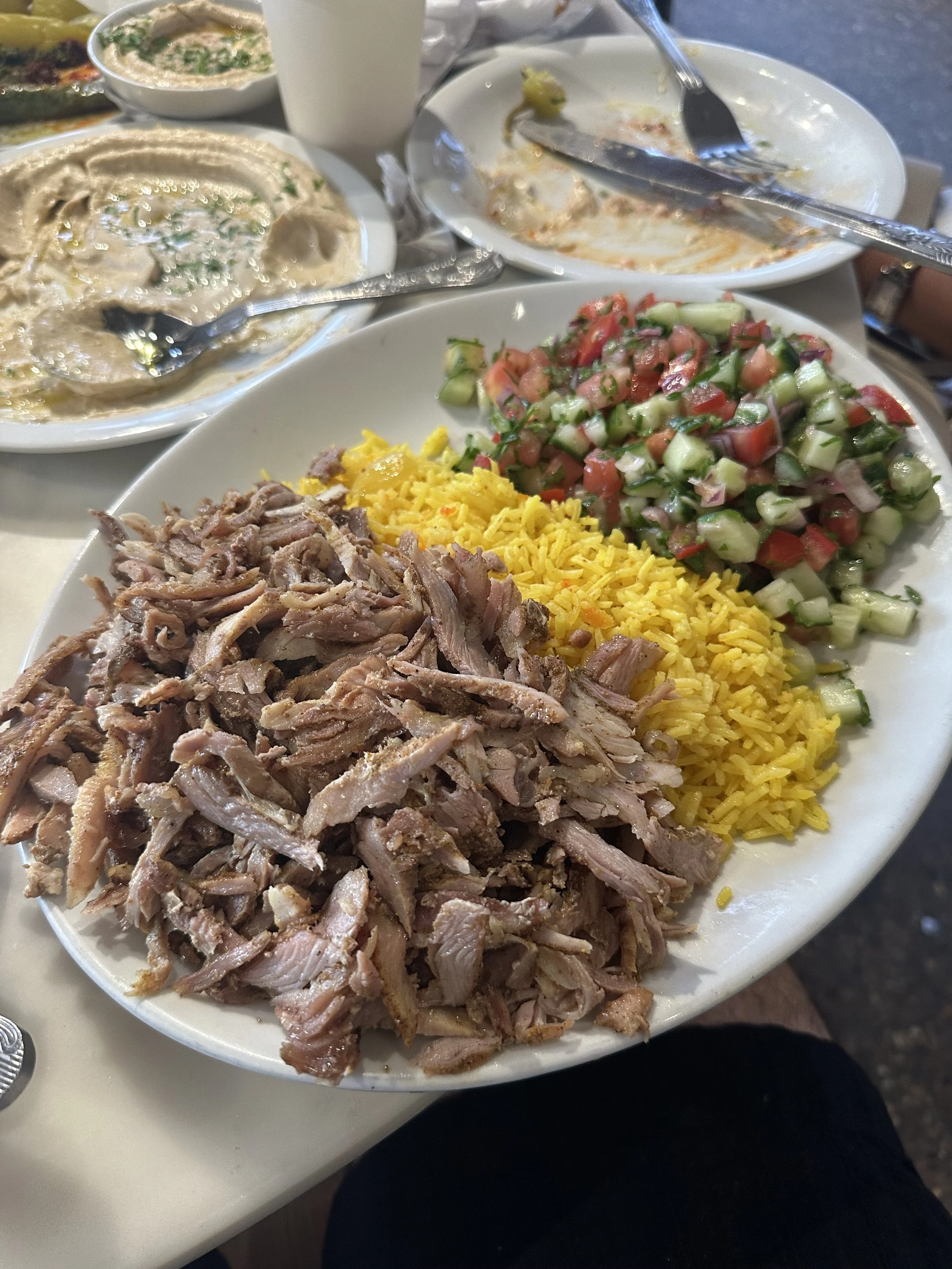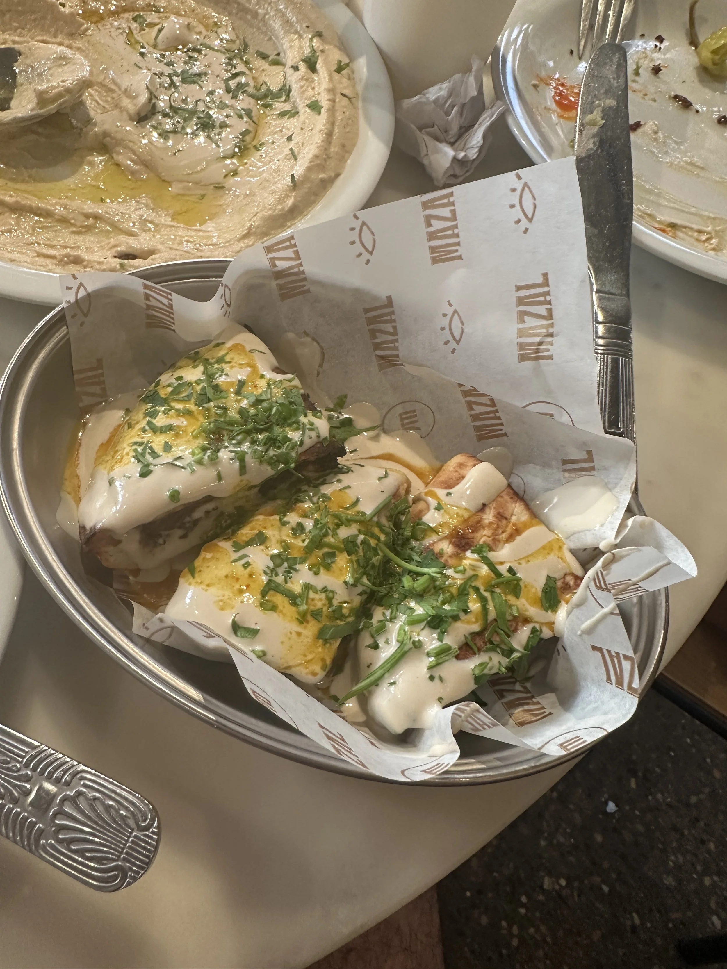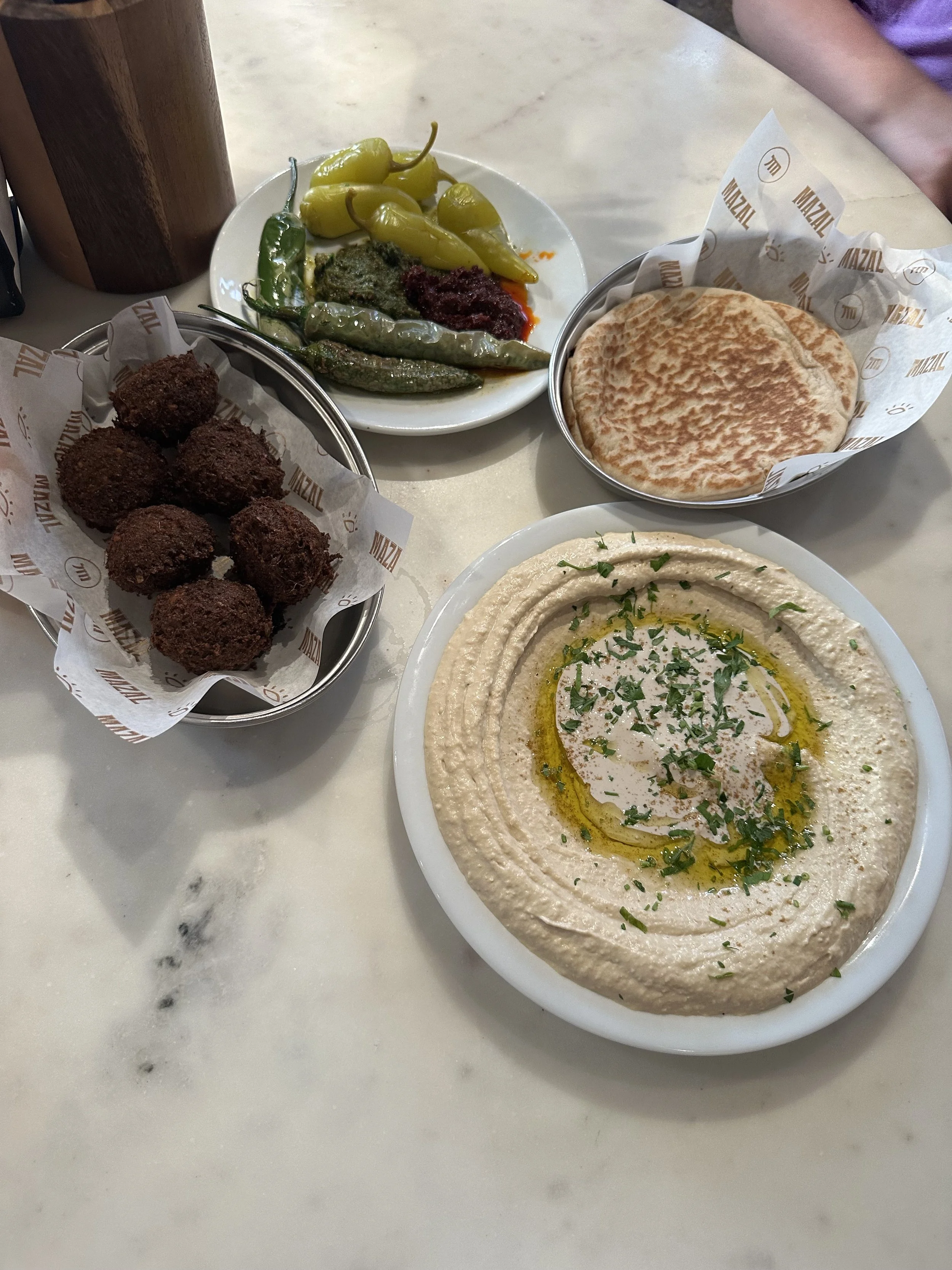 After the arcade, we walked to dinner at Mazal, a kosher Israeli restaurant in Camden Market. We ordered everything: schnitzel, cauliflower, chicken, pita, shawarma, humus, the “spicy plate”, and more. It was very good.