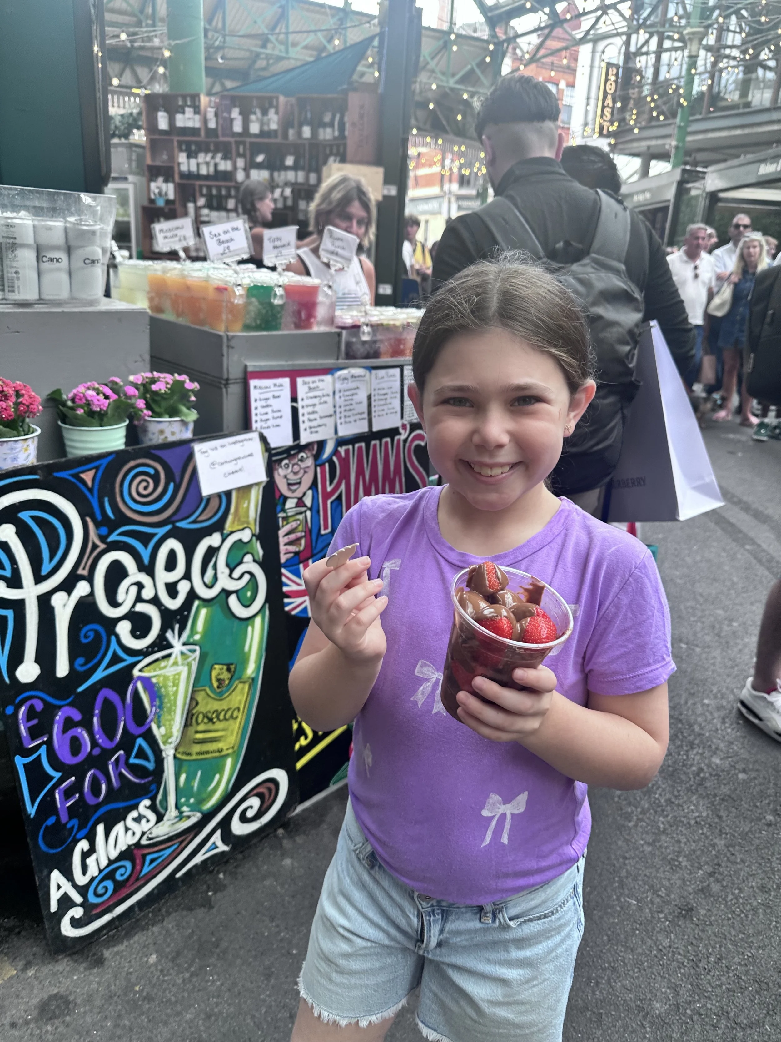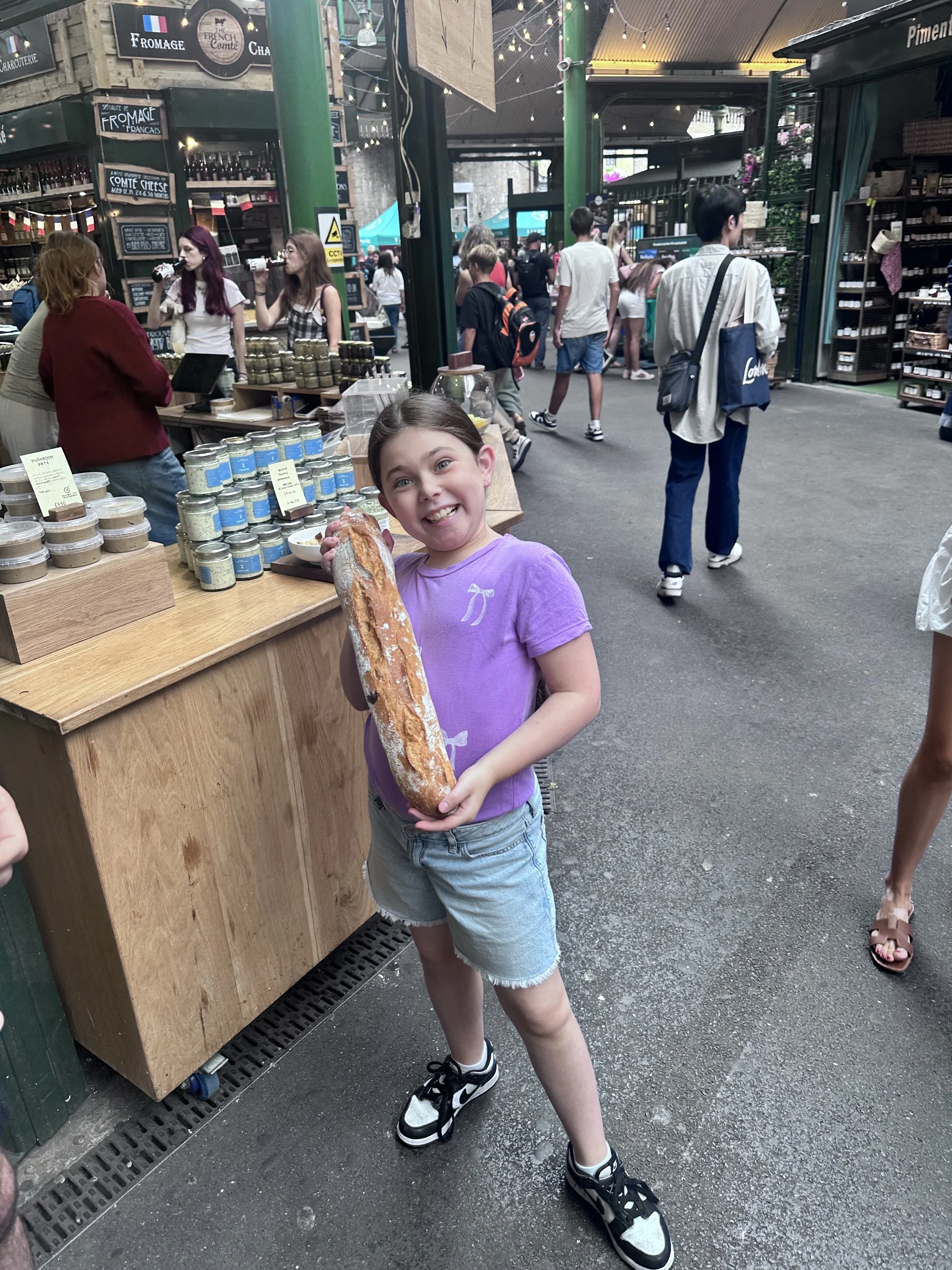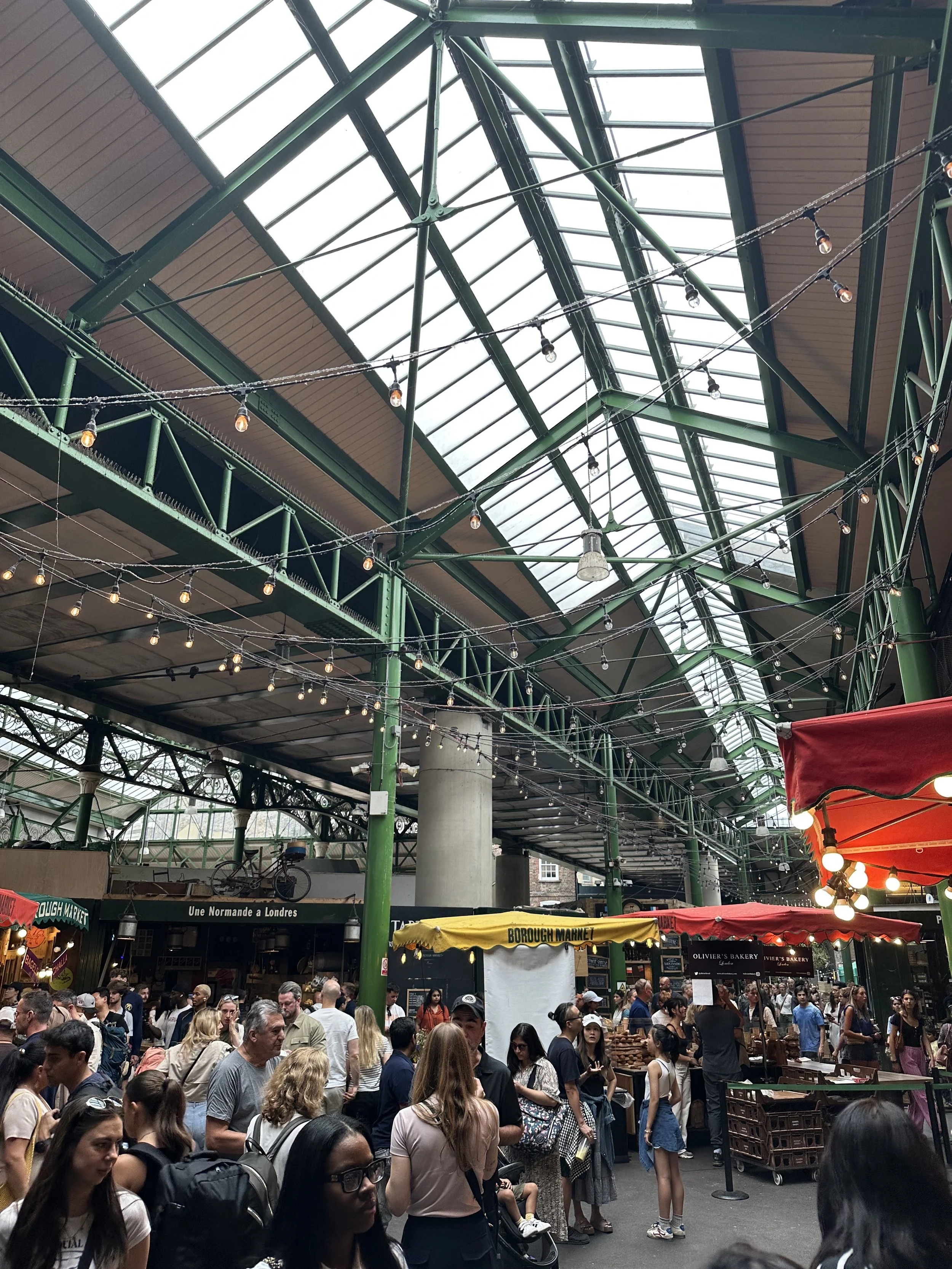 Instead, we walked to Borough Market, a famous food market, and sampled a ton of things. First, we tried a vegan pie—my favorite dish of the day—an Indian-style curry with chickpeas. Delicious. We also got a huge German pretzel and a bagel with cream cheese for Hallie (she’s such an adventurous eater!). Tzvi sampled cheese at a cheese stand, and then was like, ‘this is good, but what am I going to do, walk around with a big block of cheese?’ Well, everyone (including the man trying to sell him cheese) thought that was an excellent idea. He actually ended up buying three blocks of cheese, which everyone other than me and Hallie enjoyed. They also got a sourdough baguette that they could stick their cheese on. Of course we also got the famous chocolate-covered strawberries. Very good, though probably no better than other chocolate strawberries you could get elsewhere. We probably should’ve stopped there, but we walked further into the market and got an apple crumble from Humble Crumble topped with vanilla whipped cream—it had a huge line, but was worth it. While I waited on line the rest of the group found an Israeli stand and got drinks: a Spring mango drink, water, and an iced café that was actually passable for an Israeli slushy iced coffee. Somehow, we spent a lot of time at the market. We’d considered the Tower of London for the afternoon, but we didn’t leave the market until around 3:45, so there was no time.