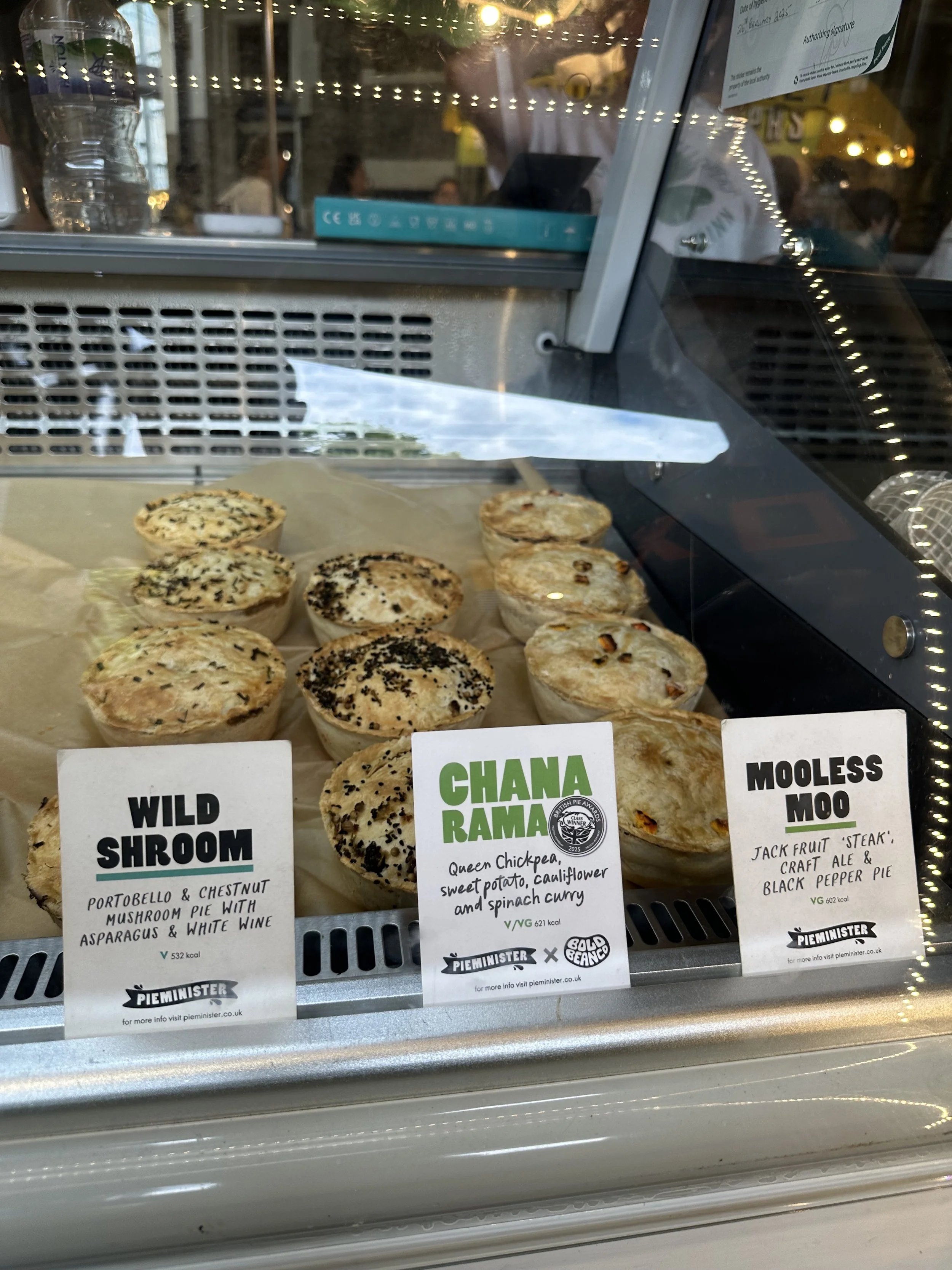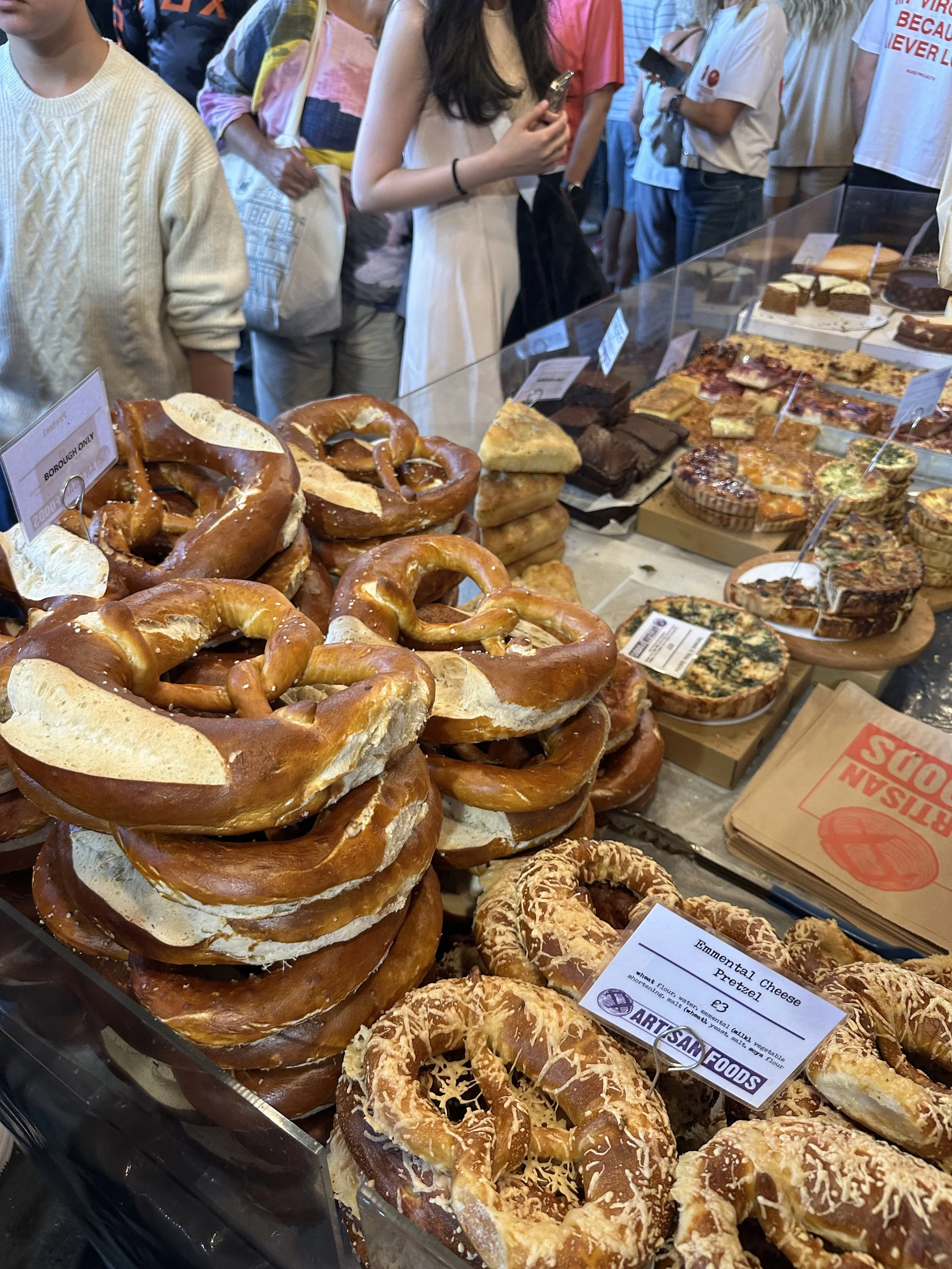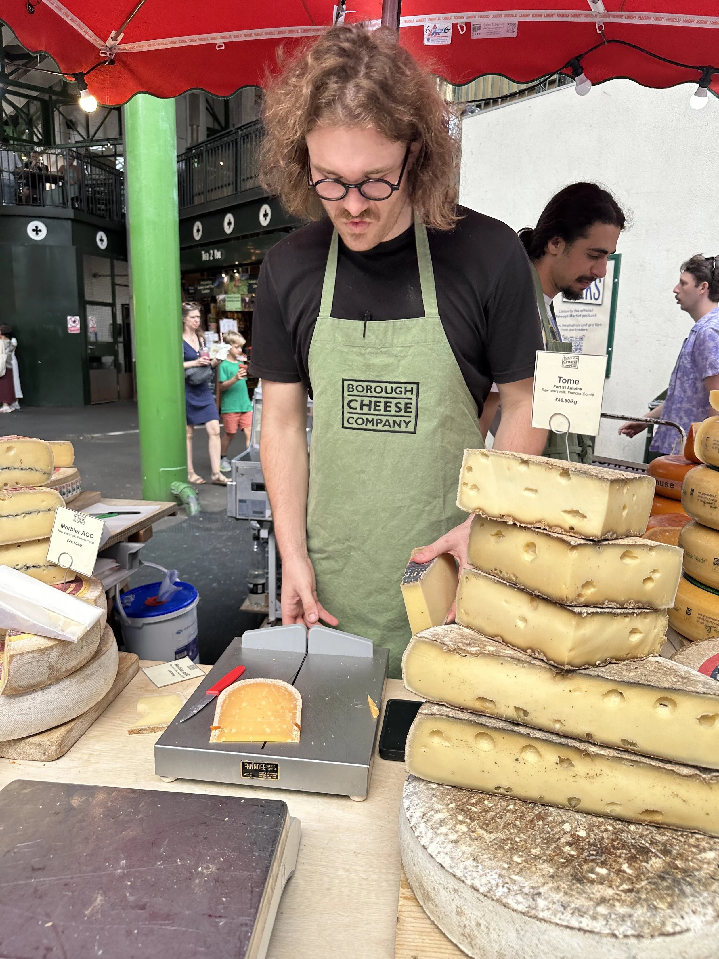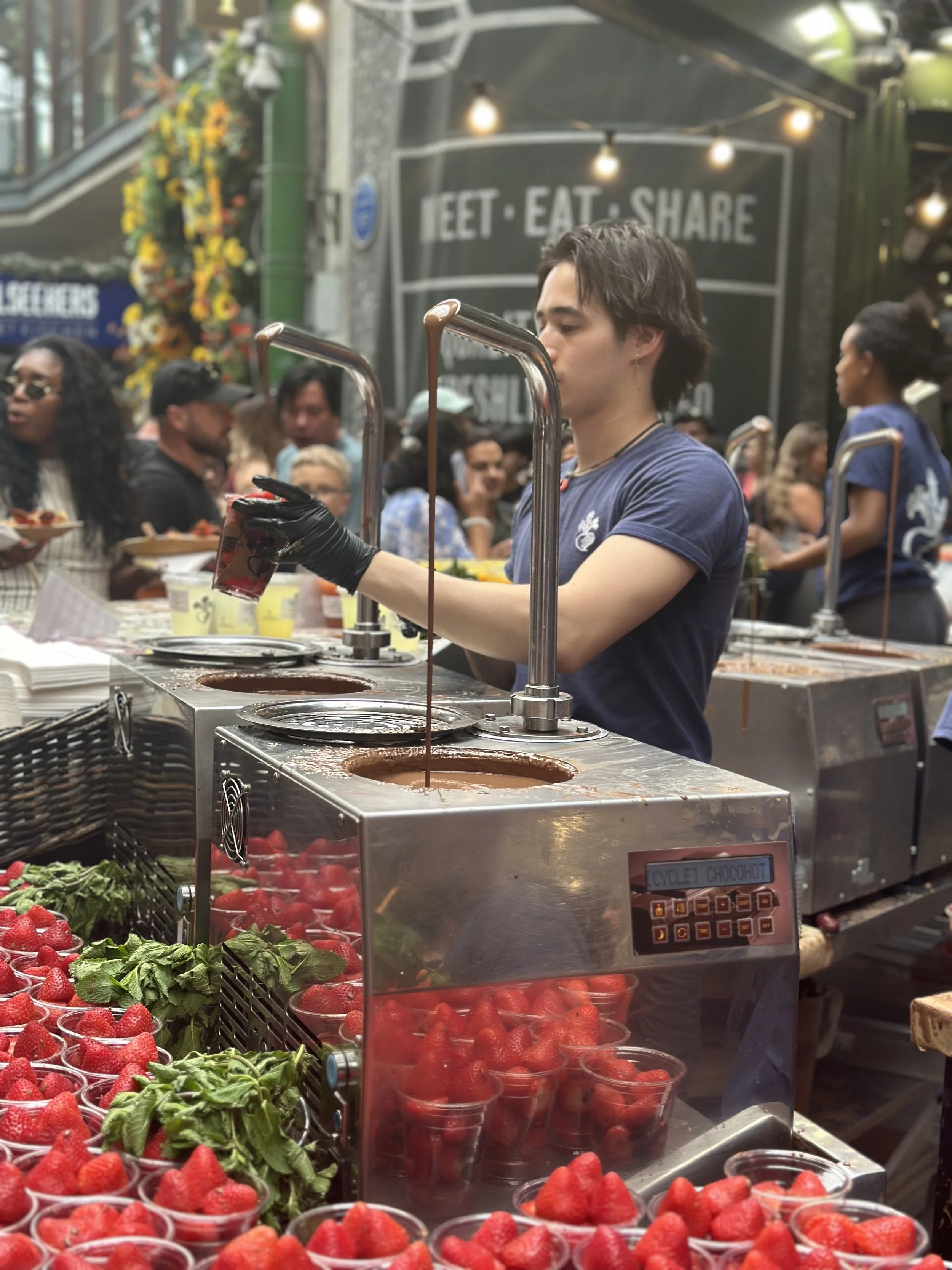 Instead, we walked to Borough Market, a famous food market, and sampled a ton of things. First, we tried a vegan pie—my favorite dish of the day—an Indian-style curry with chickpeas. Delicious. We also got a huge German pretzel and a bagel with cream cheese for Hallie (she’s such an adventurous eater!). Tzvi sampled cheese at a cheese stand, and then was like, ‘this is good, but what am I going to do, walk around with a big block of cheese?’ Well, everyone (including the man trying to sell him cheese) thought that was an excellent idea. He actually ended up buying three blocks of cheese, which everyone other than me and Hallie enjoyed. They also got a sourdough baguette that they could stick their cheese on. Of course we also got the famous chocolate-covered strawberries. Very good, though probably no better than other chocolate strawberries you could get elsewhere. We probably should’ve stopped there, but we walked further into the market and got an apple crumble from Humble Crumble topped with vanilla whipped cream—it had a huge line, but was worth it. While I waited on line the rest of the group found an Israeli stand and got drinks: a Spring mango drink, water, and an iced café that was actually passable for an Israeli slushy iced coffee. Somehow, we spent a lot of time at the market. We’d considered the Tower of London for the afternoon, but we didn’t leave the market until around 3:45, so there was no time.