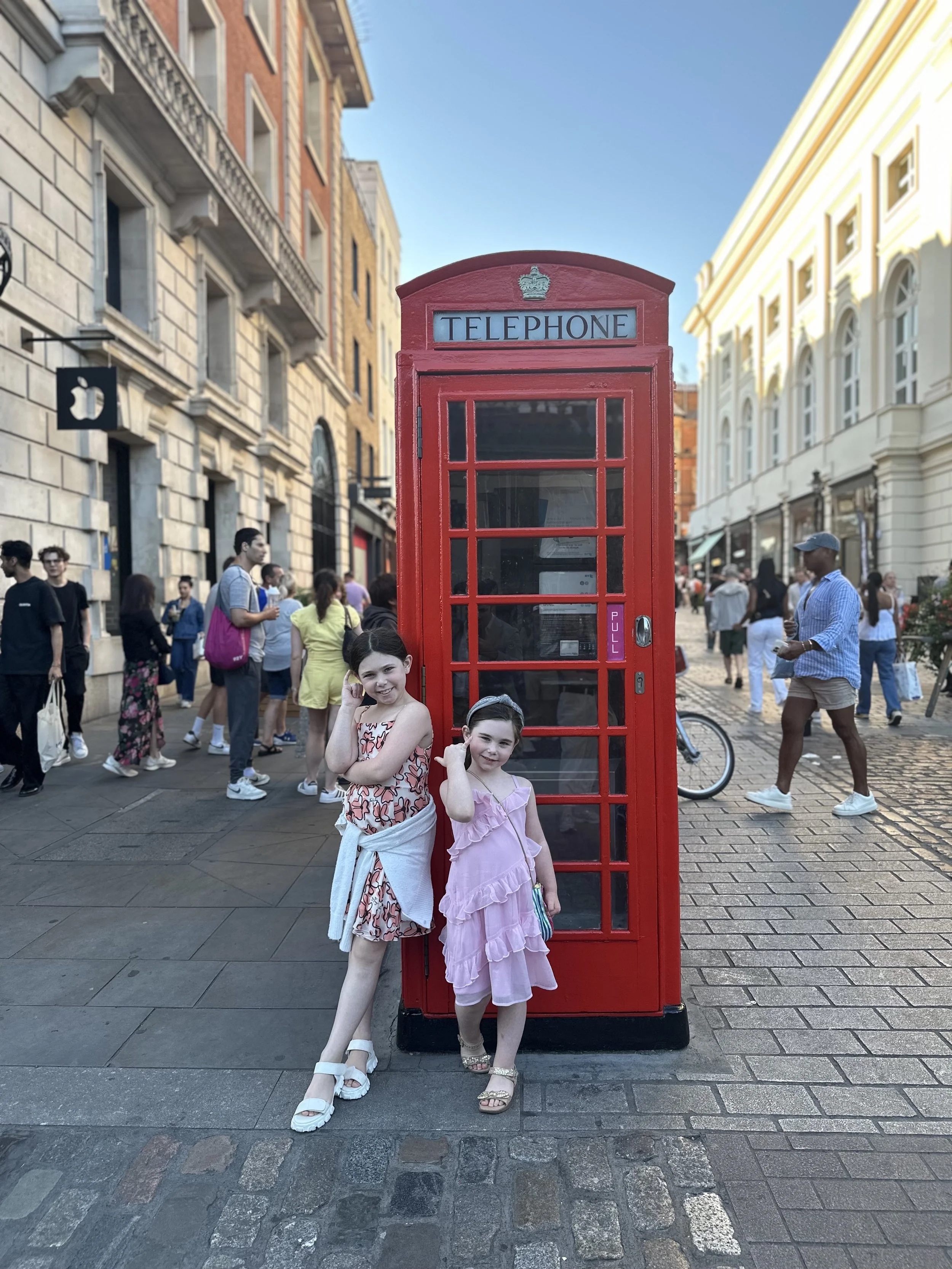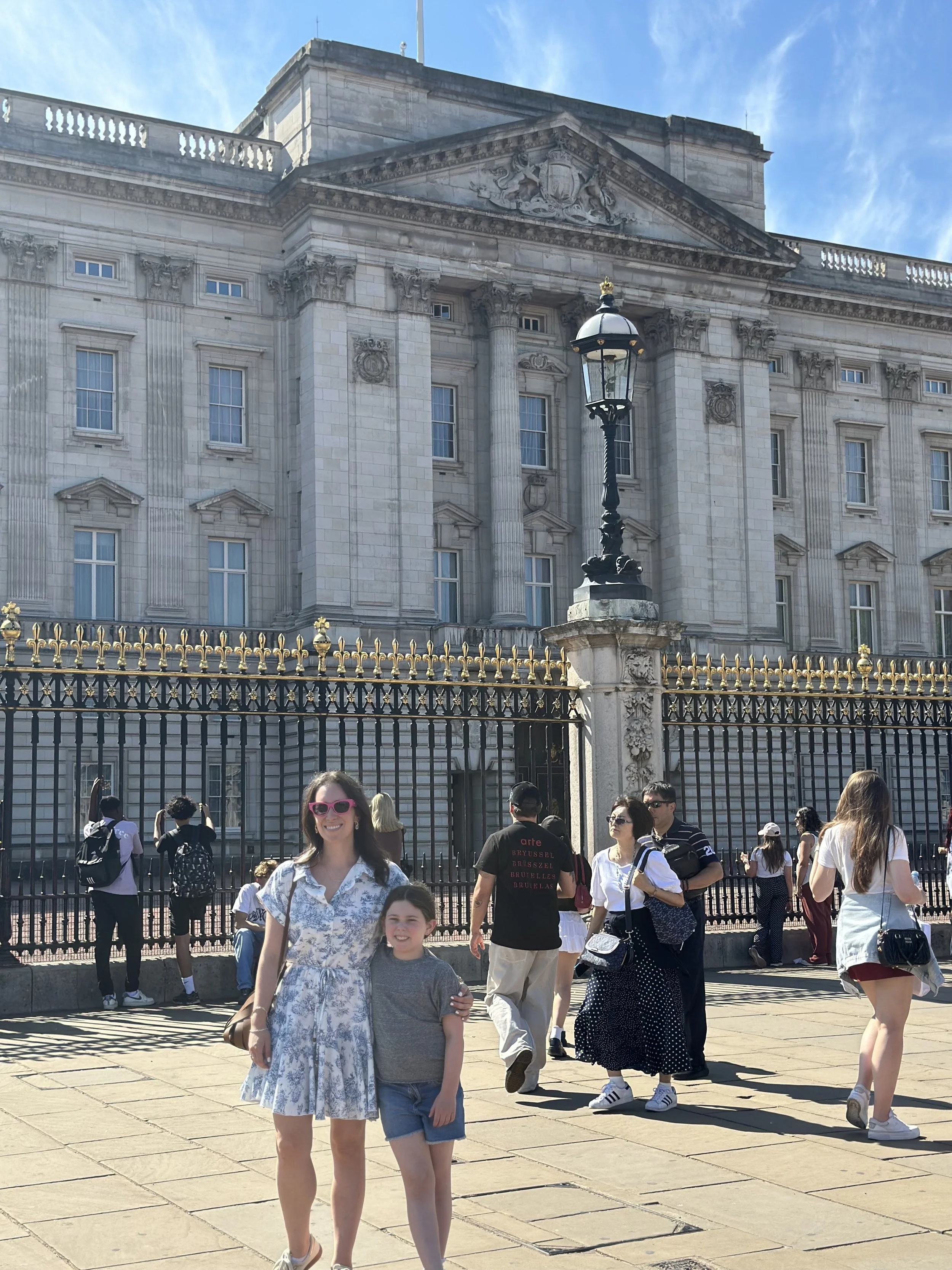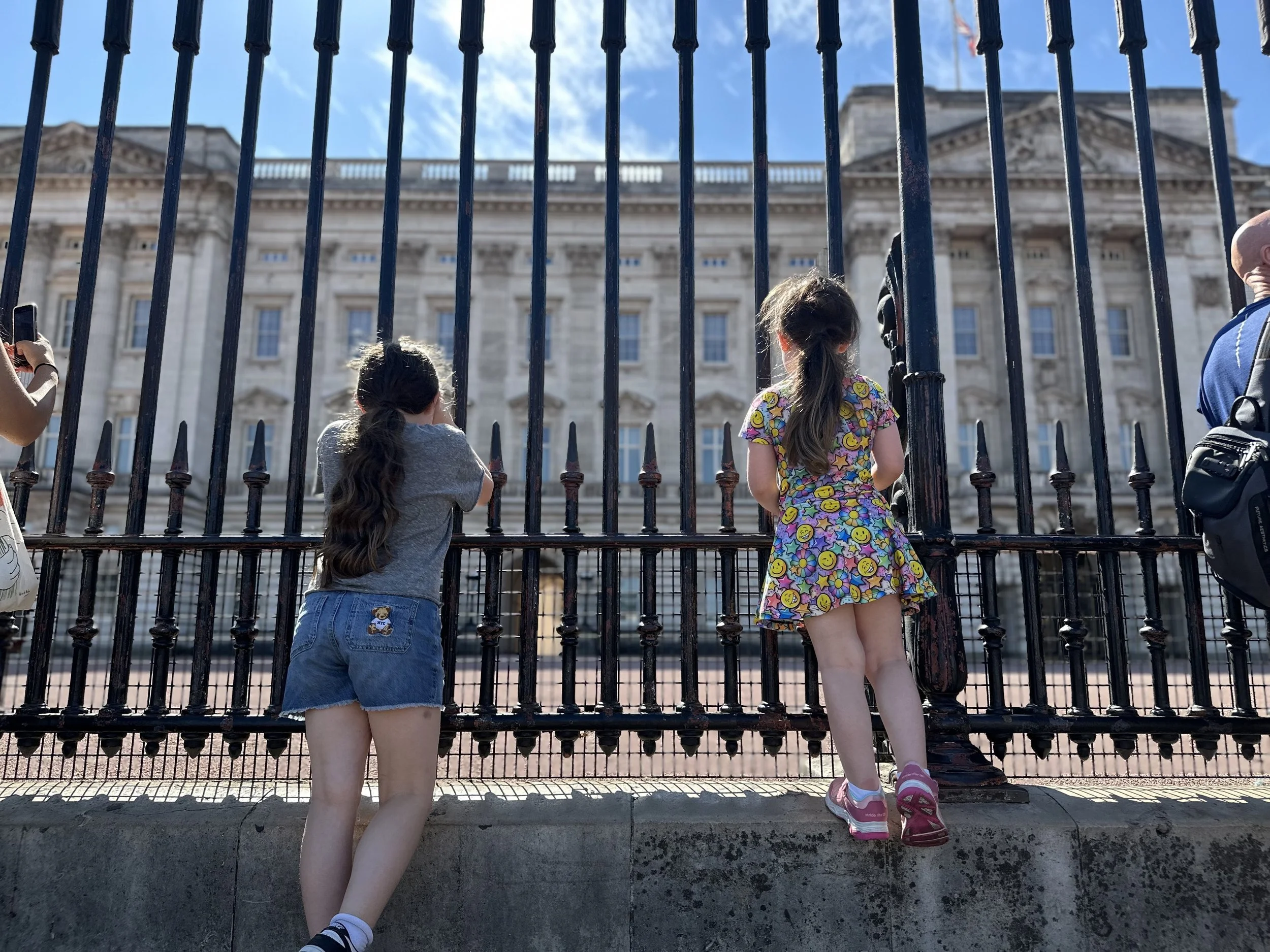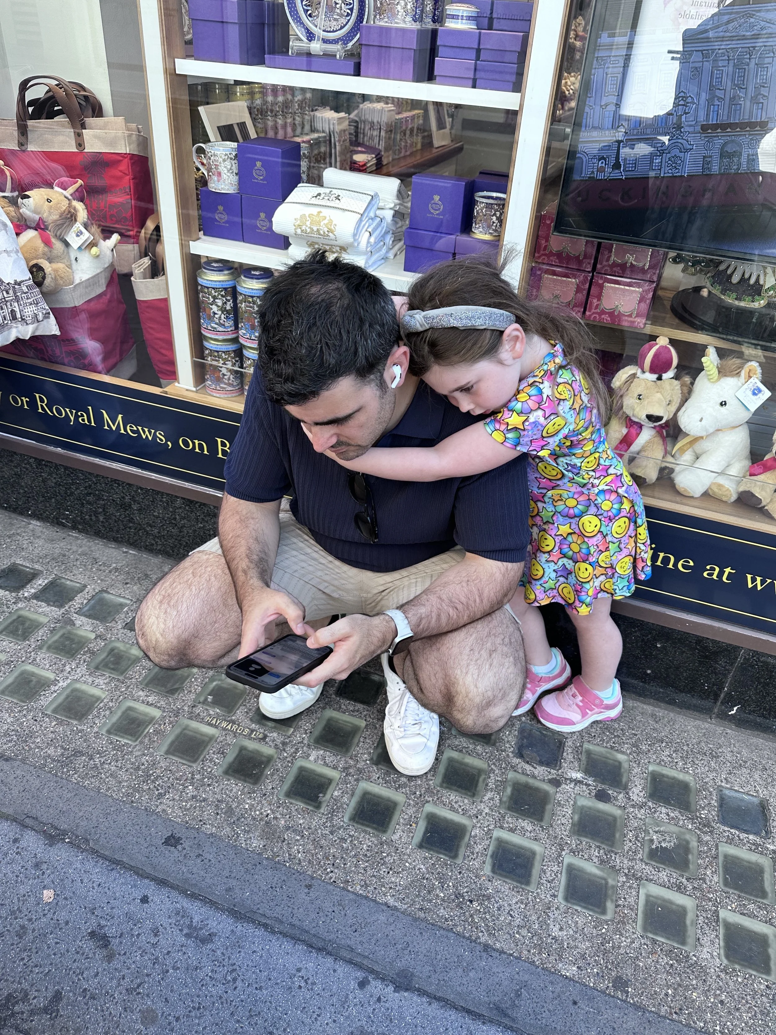 After Harrods, we took a cab to Buckingham Palace. We couldn’t go to England and not see it, and the girls were excited, though tired—it was the hottest day so far. At this point, Tzvi had to be on a work call, so he spent the end of the Harrods visit, the Buckingham palace visit and the next half hour walking around on a zoom call (no video). We left the palace area and walked a few blocks to some souvenir shops, including a candy shop where the girls picked out candy, and I got them ice cream. I hadn’t noticed that when we walked away from Buckingham Palace Tzvi was still standing there talking on his call; he said he couldn’t follow because it was windy and he was speaking. We ended up several blocks away by the time anyone realized, so I sent him my location and he spent fifteen minutes wandering around trying to find us.