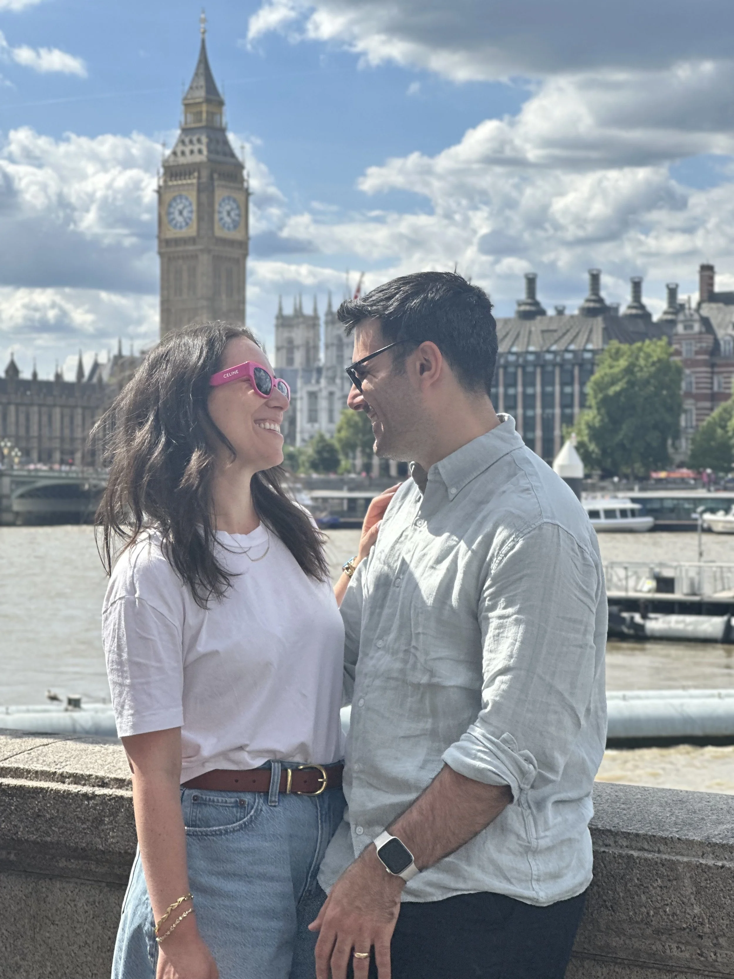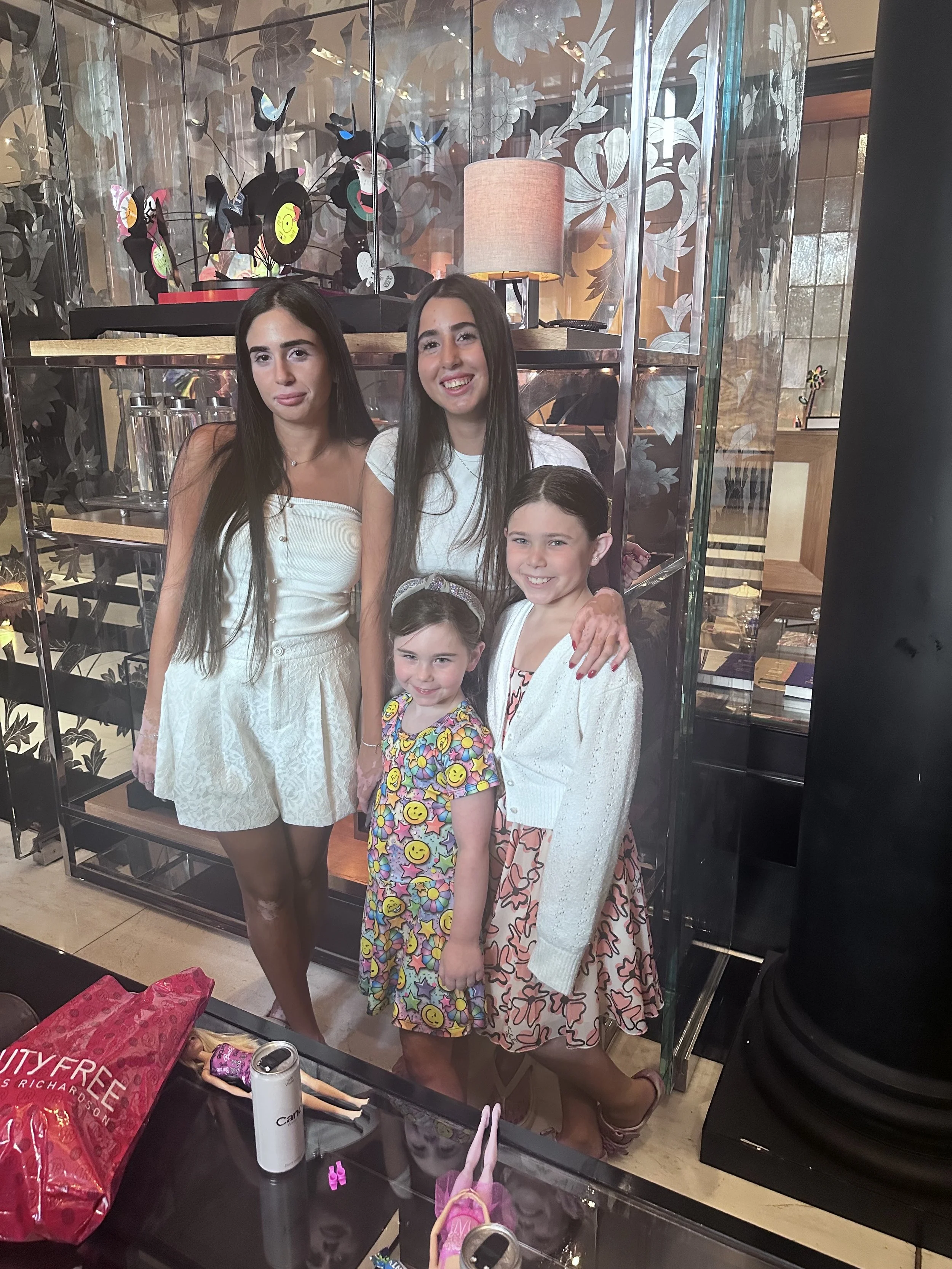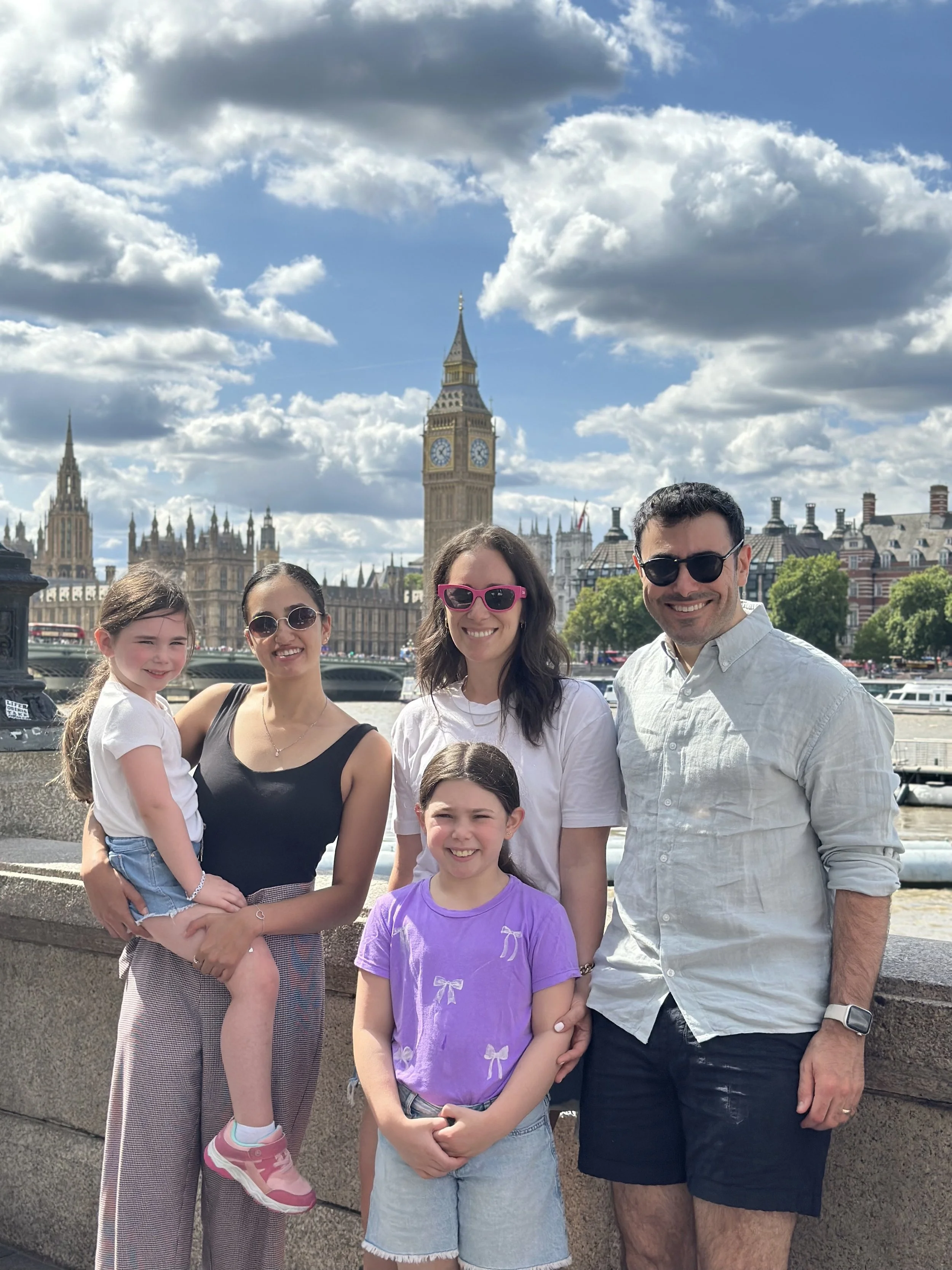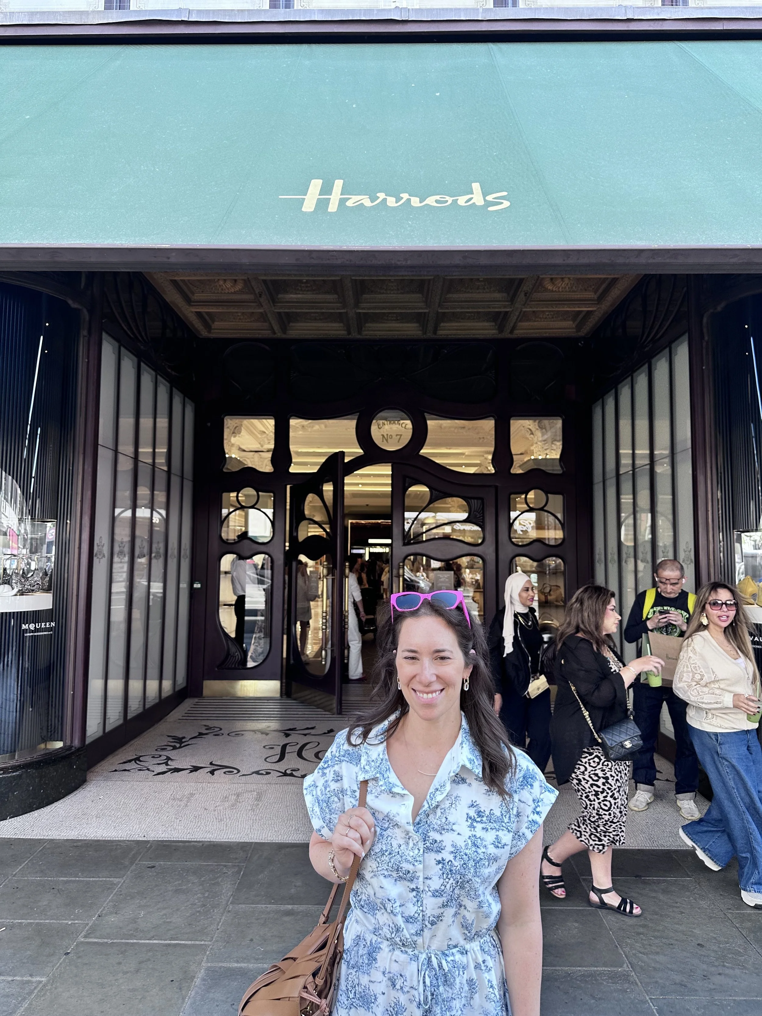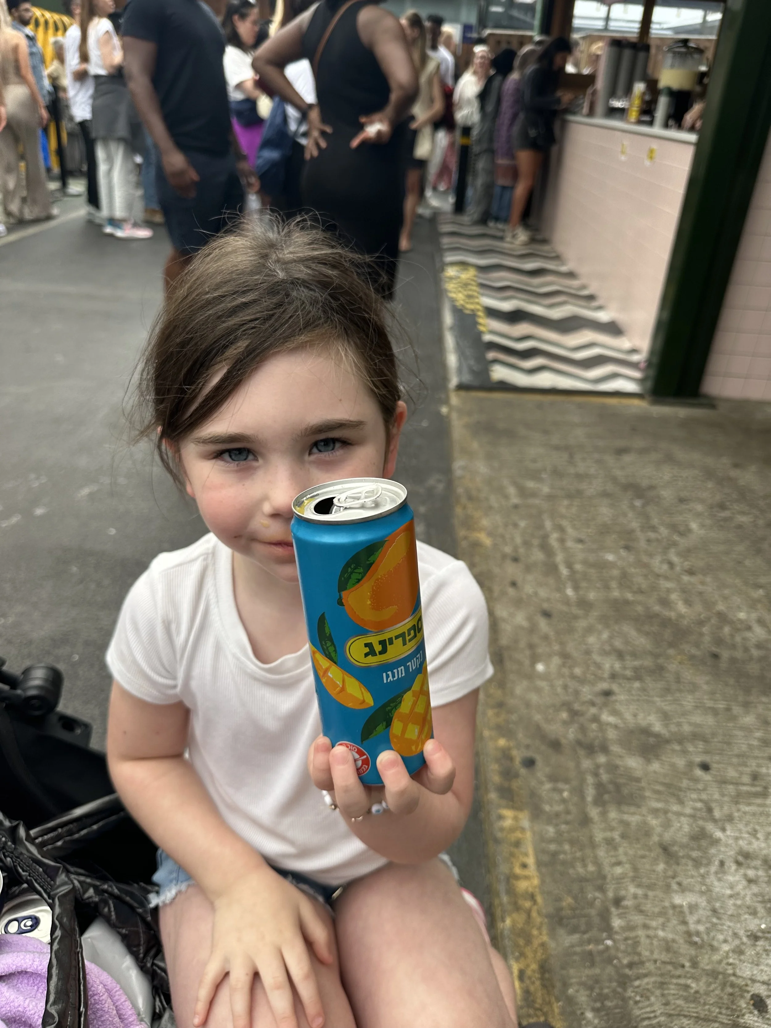 After Harrods, we took a cab to Buckingham Palace. We couldn’t go to England and not see it, and the girls were excited, though tired—it was the hottest day so far. At this point, Tzvi had to be on a work call, so he spent the end of the Harrods visit, the Buckingham palace visit and the next half hour walking around on a zoom call (no video). We left the palace area and walked a few blocks to some souvenir shops, including a candy shop where the girls picked out candy, and I got them ice cream. I hadn’t noticed that when we walked away from Buckingham Palace Tzvi was still standing there talking on his call; he said he couldn’t follow because it was windy and he was speaking. We ended up several blocks away by the time anyone realized, so I sent him my location and he spent fifteen minutes wandering around trying to find us.