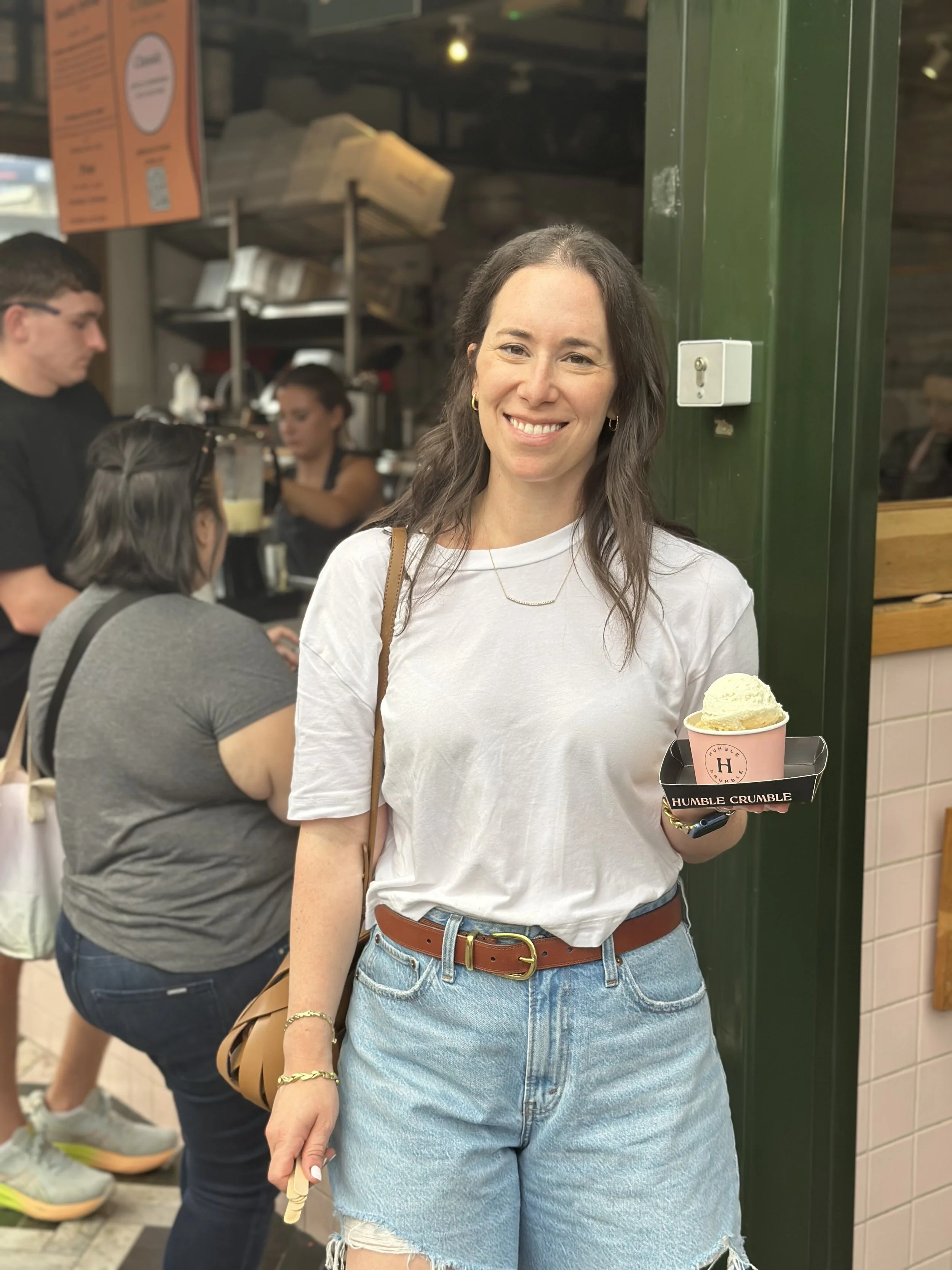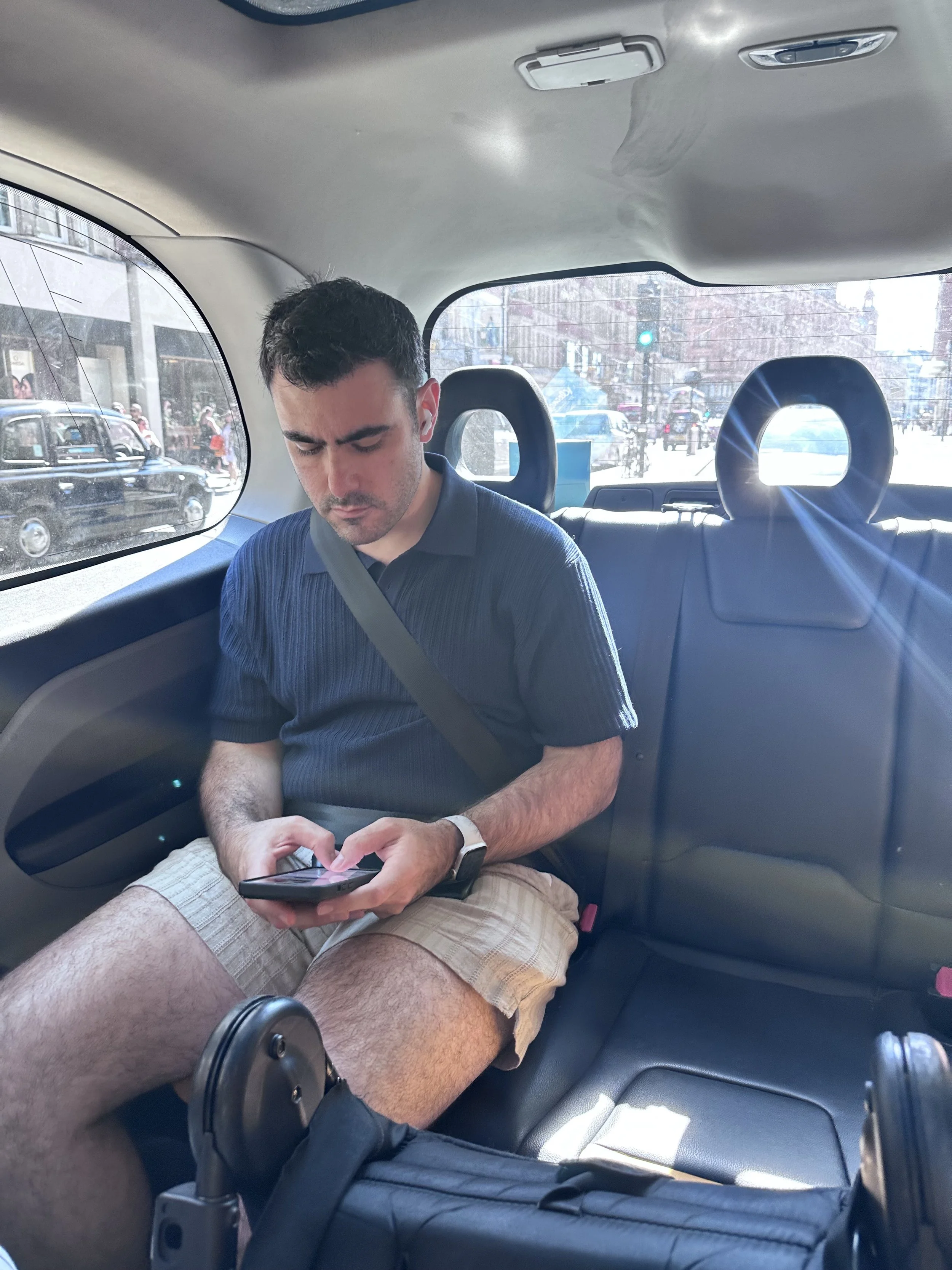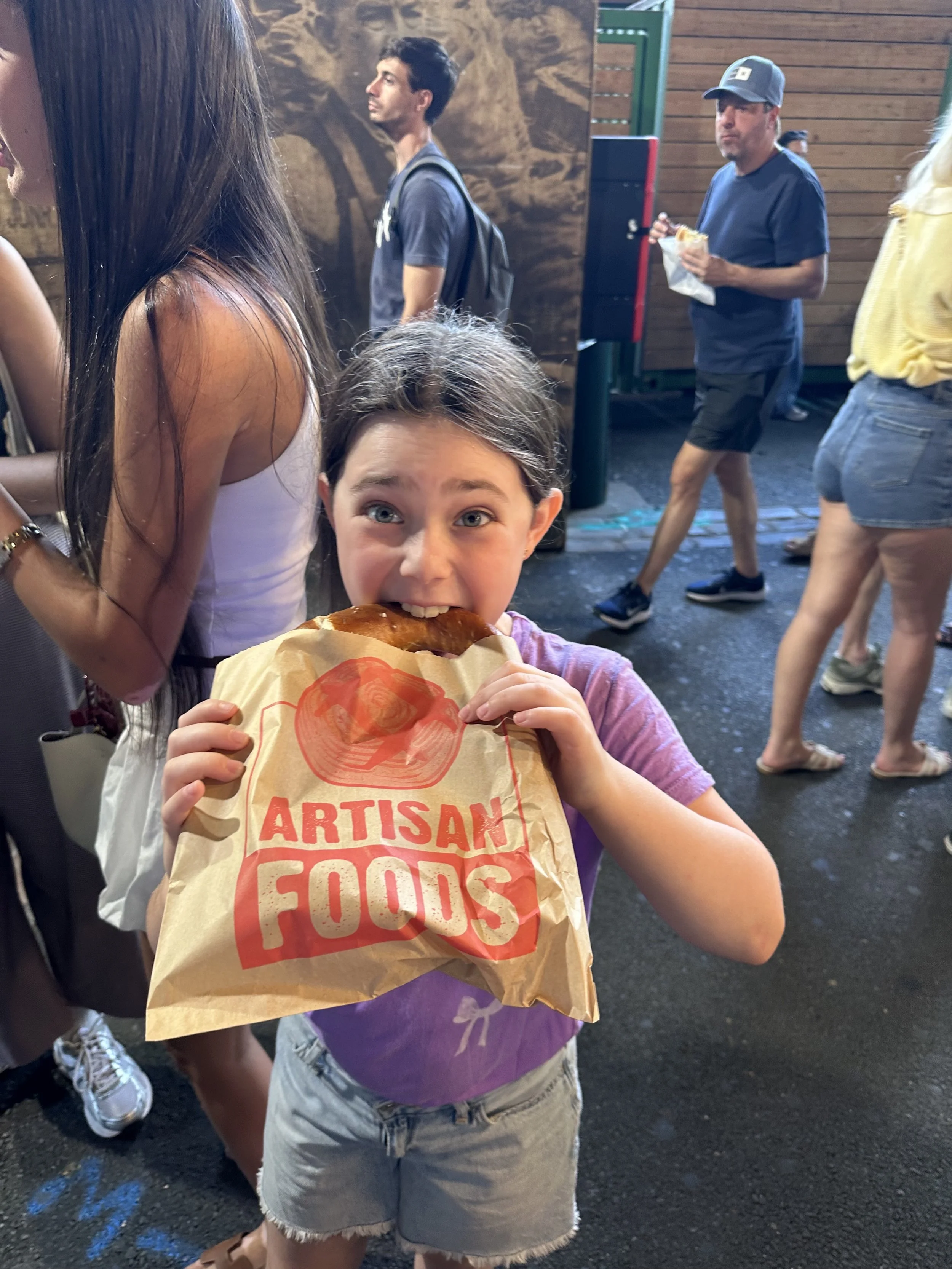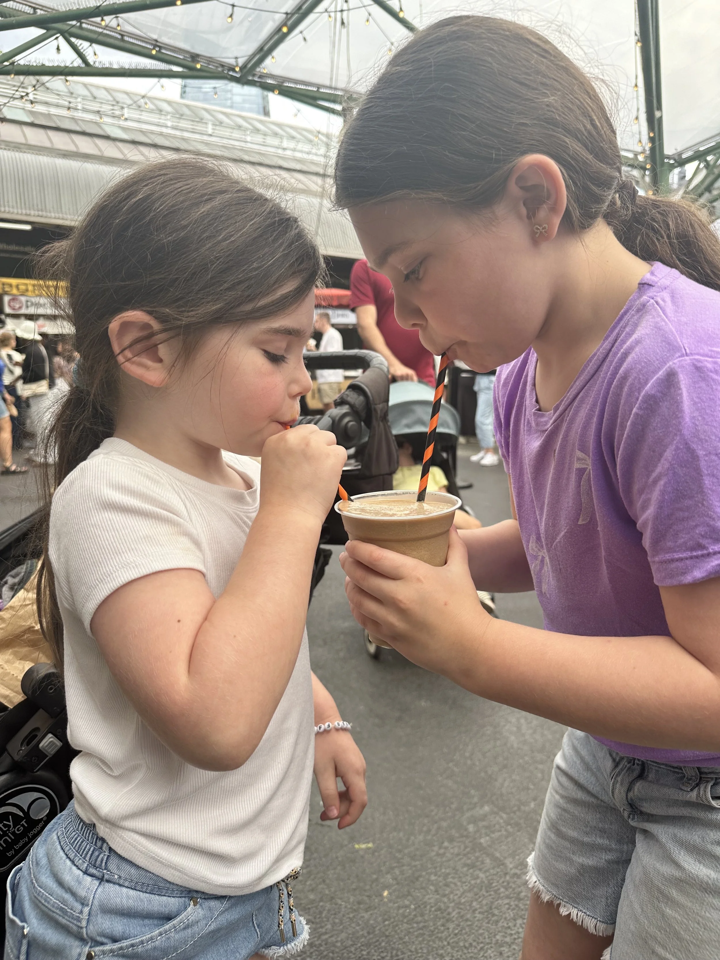 After Harrods, we took a cab to Buckingham Palace. We couldn’t go to England and not see it, and the girls were excited, though tired—it was the hottest day so far. At this point, Tzvi had to be on a work call, so he spent the end of the Harrods visit, the Buckingham palace visit and the next half hour walking around on a zoom call (no video). We left the palace area and walked a few blocks to some souvenir shops, including a candy shop where the girls picked out candy, and I got them ice cream. I hadn’t noticed that when we walked away from Buckingham Palace Tzvi was still standing there talking on his call; he said he couldn’t follow because it was windy and he was speaking. We ended up several blocks away by the time anyone realized, so I sent him my location and he spent fifteen minutes wandering around trying to find us.