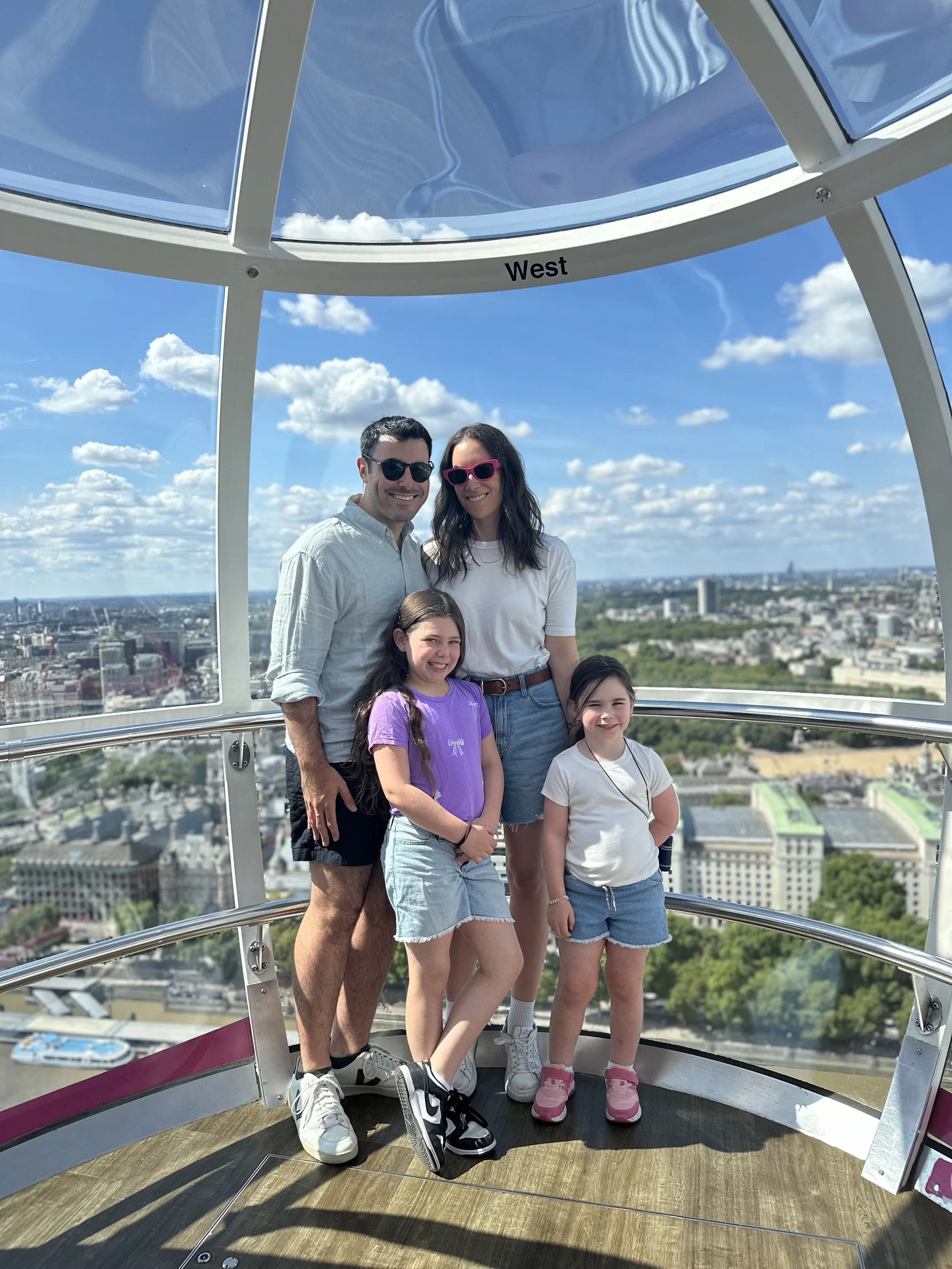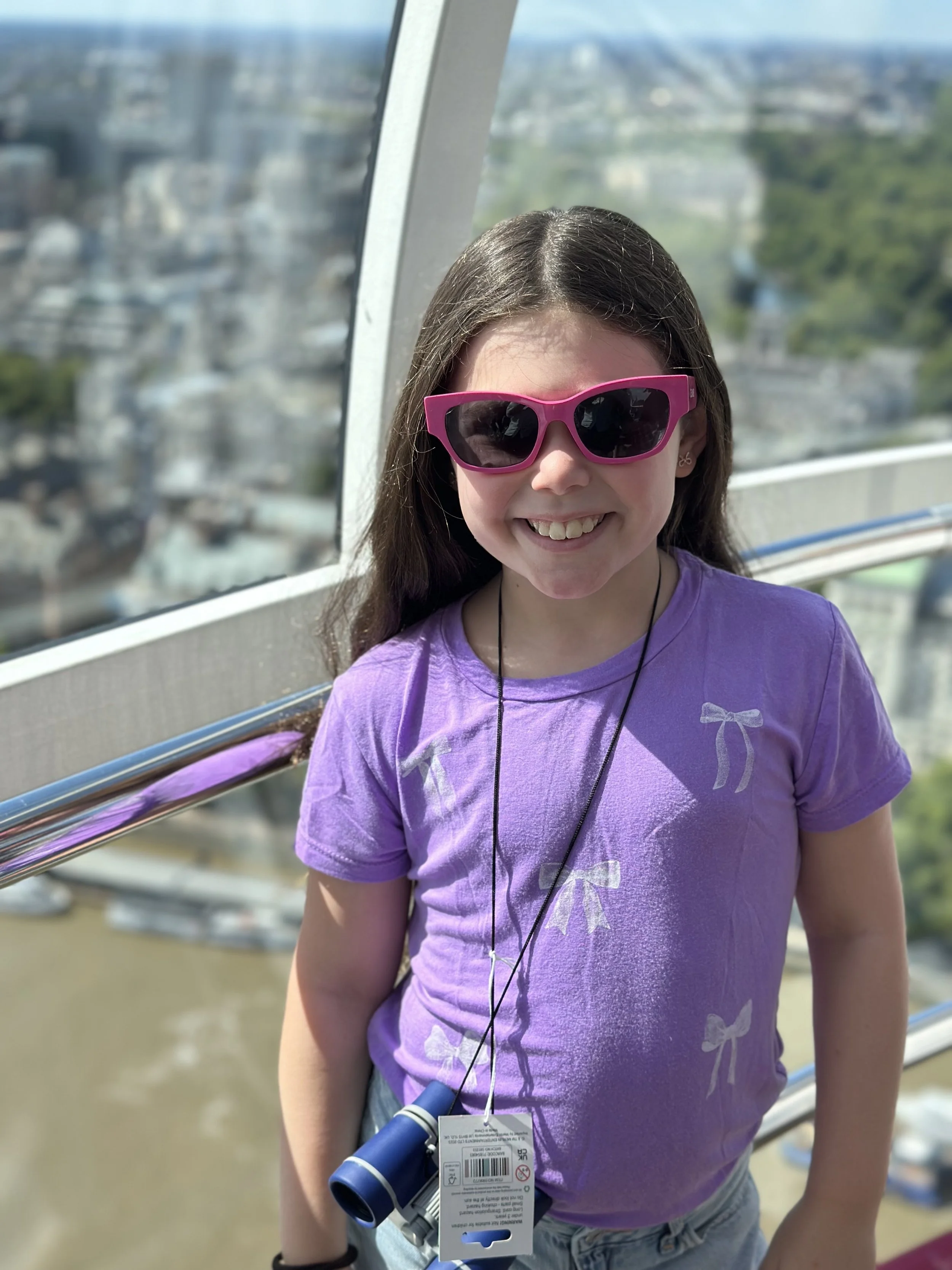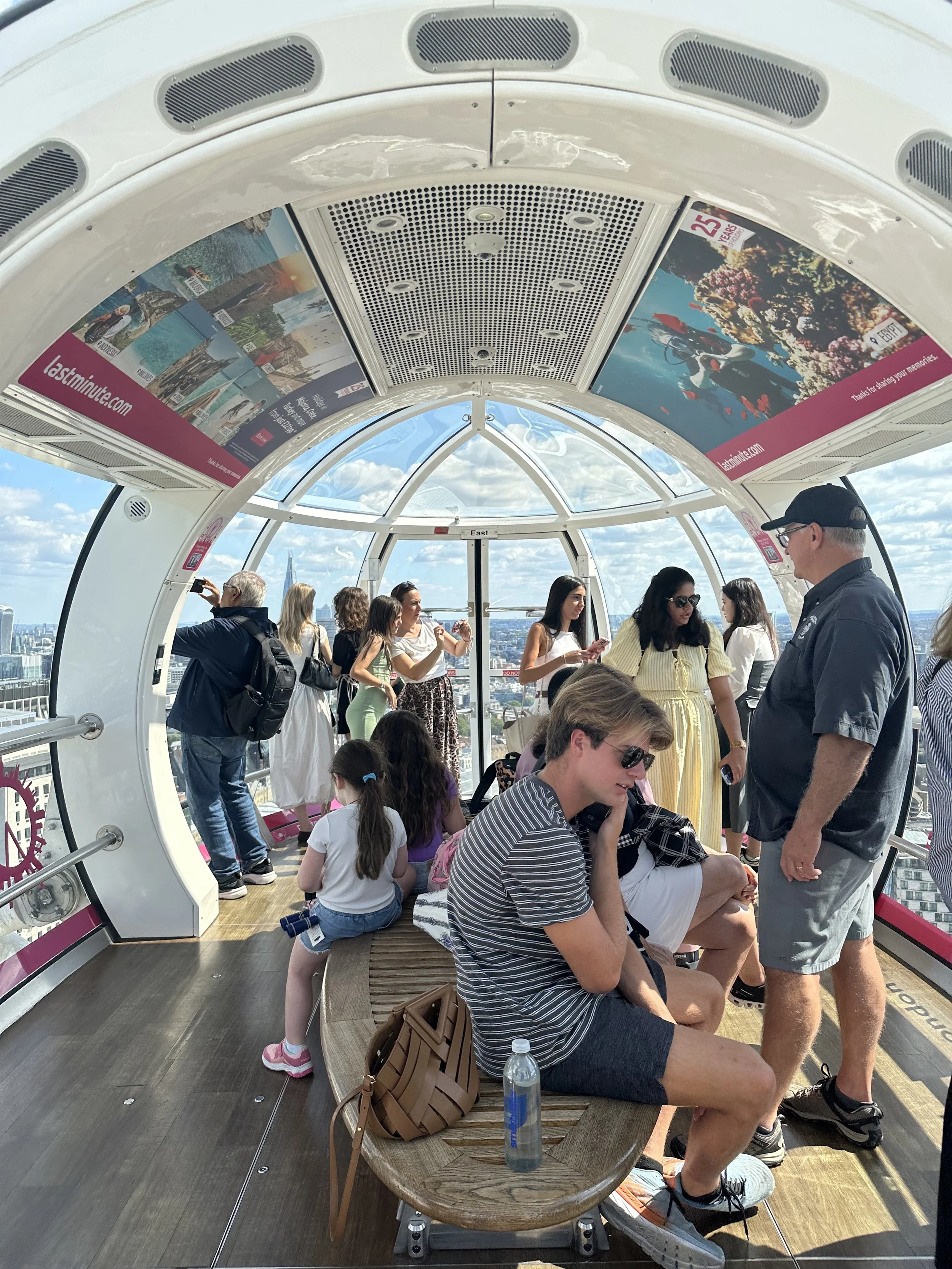 After a leisurely breakfast, we took a cab to the London Eye. Fourteen years ago, Tzvi and I came to London and did the Eye, and now we were doing it again. We got lucky this time: it was sunny, and we could see all of London. Everyone really enjoyed it—it was fun—but the kids got a little cranky as we came off. Of course we paid the extra 5 pounds for the mini binoculars, so that occupied the kids, until they started fighting over them.
