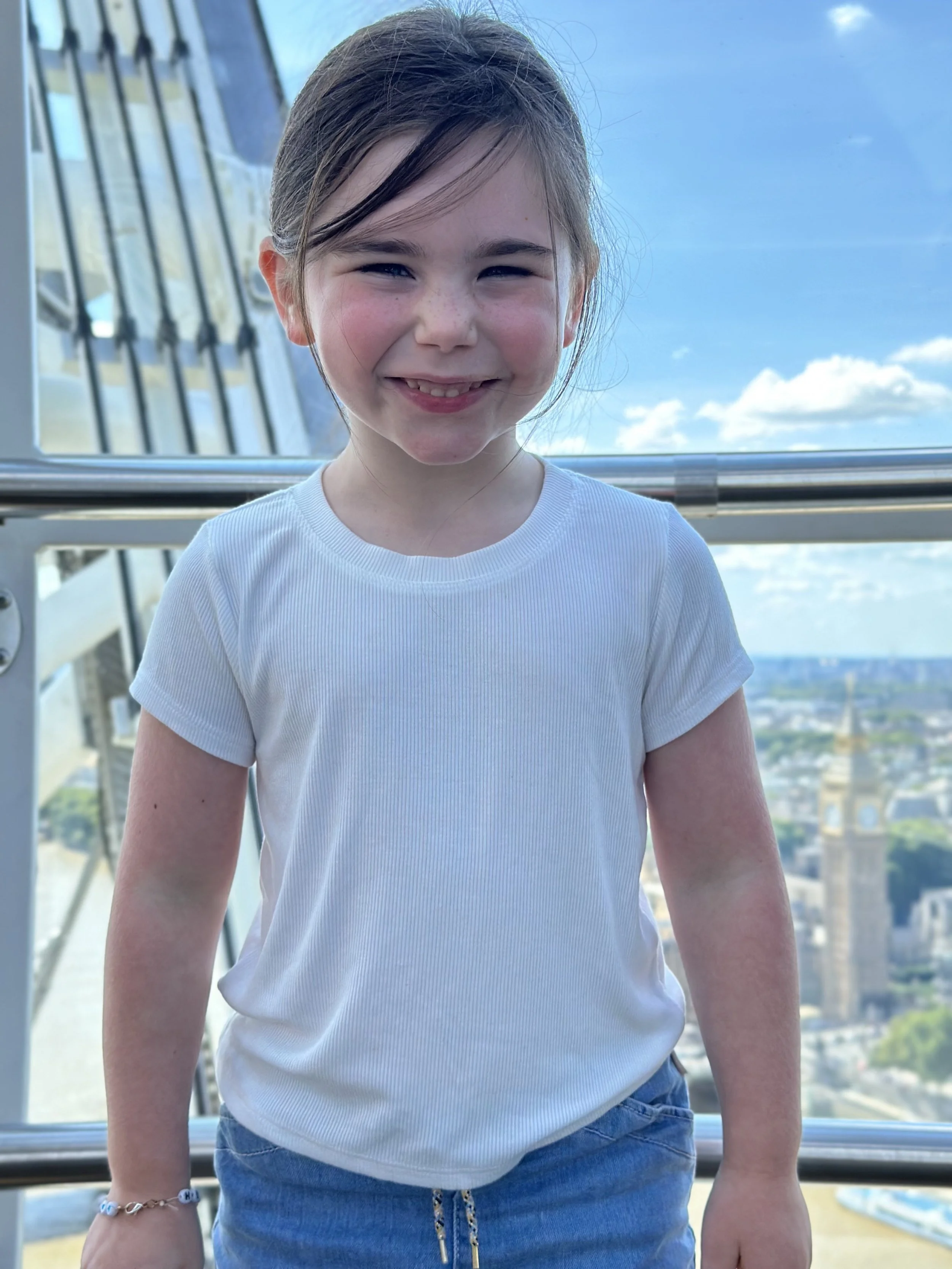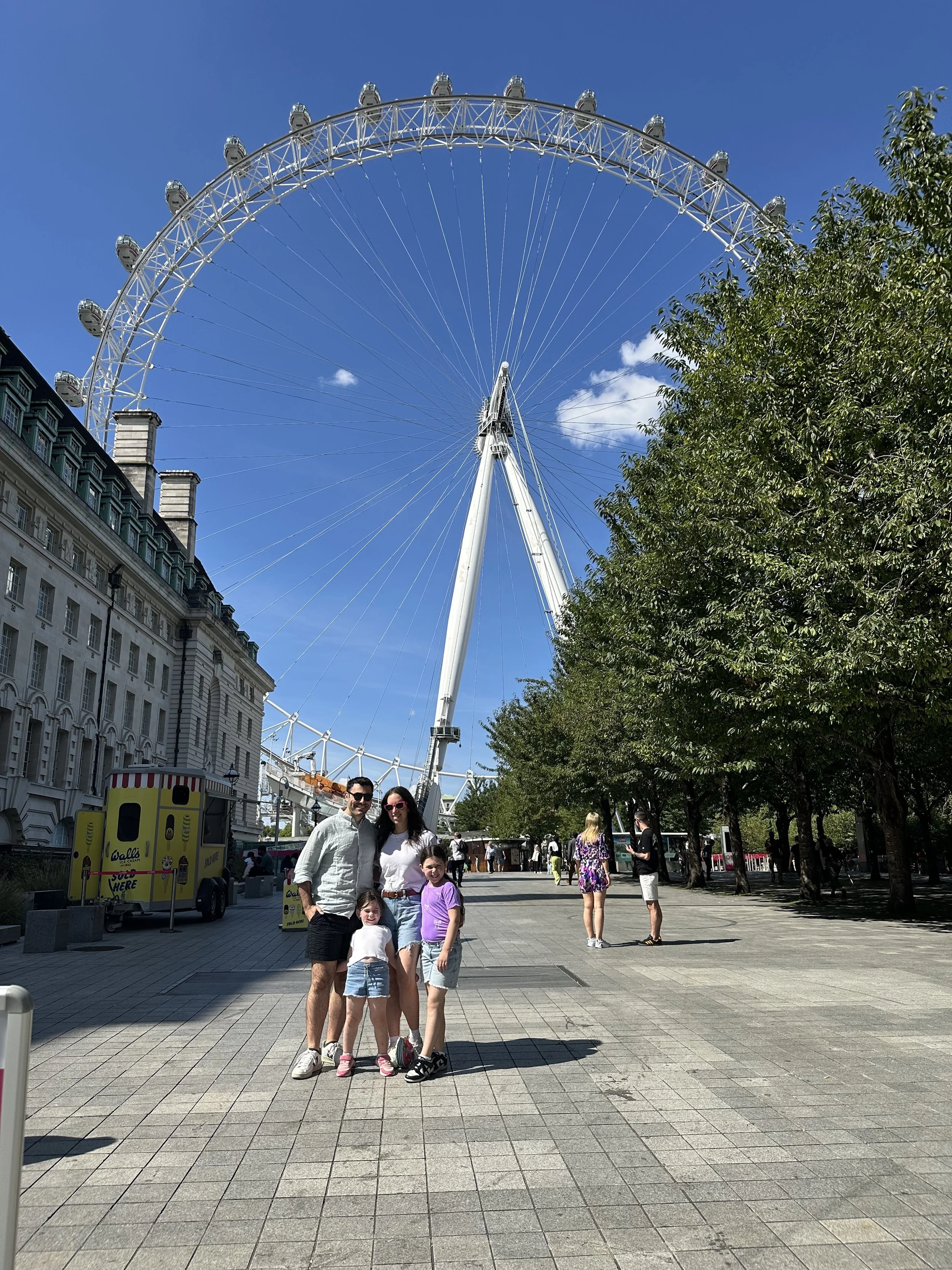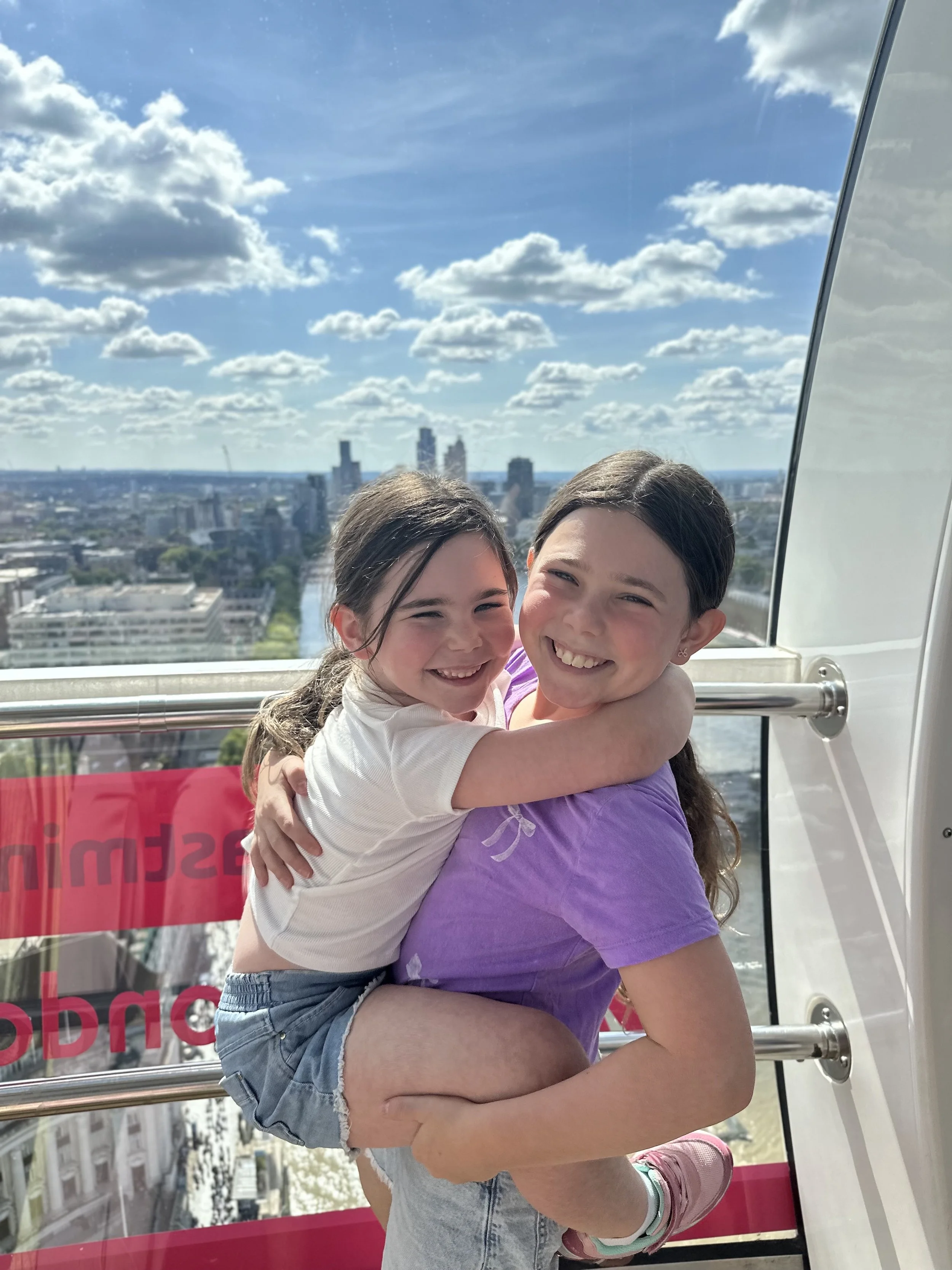 After a leisurely breakfast, we took a cab to the London Eye. Fourteen years ago, Tzvi and I came to London and did the Eye, and now we were doing it again. We got lucky this time: it was sunny, and we could see all of London. Everyone really enjoyed it—it was fun—but the kids got a little cranky as we came off. Of course we paid the extra 5 pounds for the mini binoculars, so that occupied the kids, until they started fighting over them.