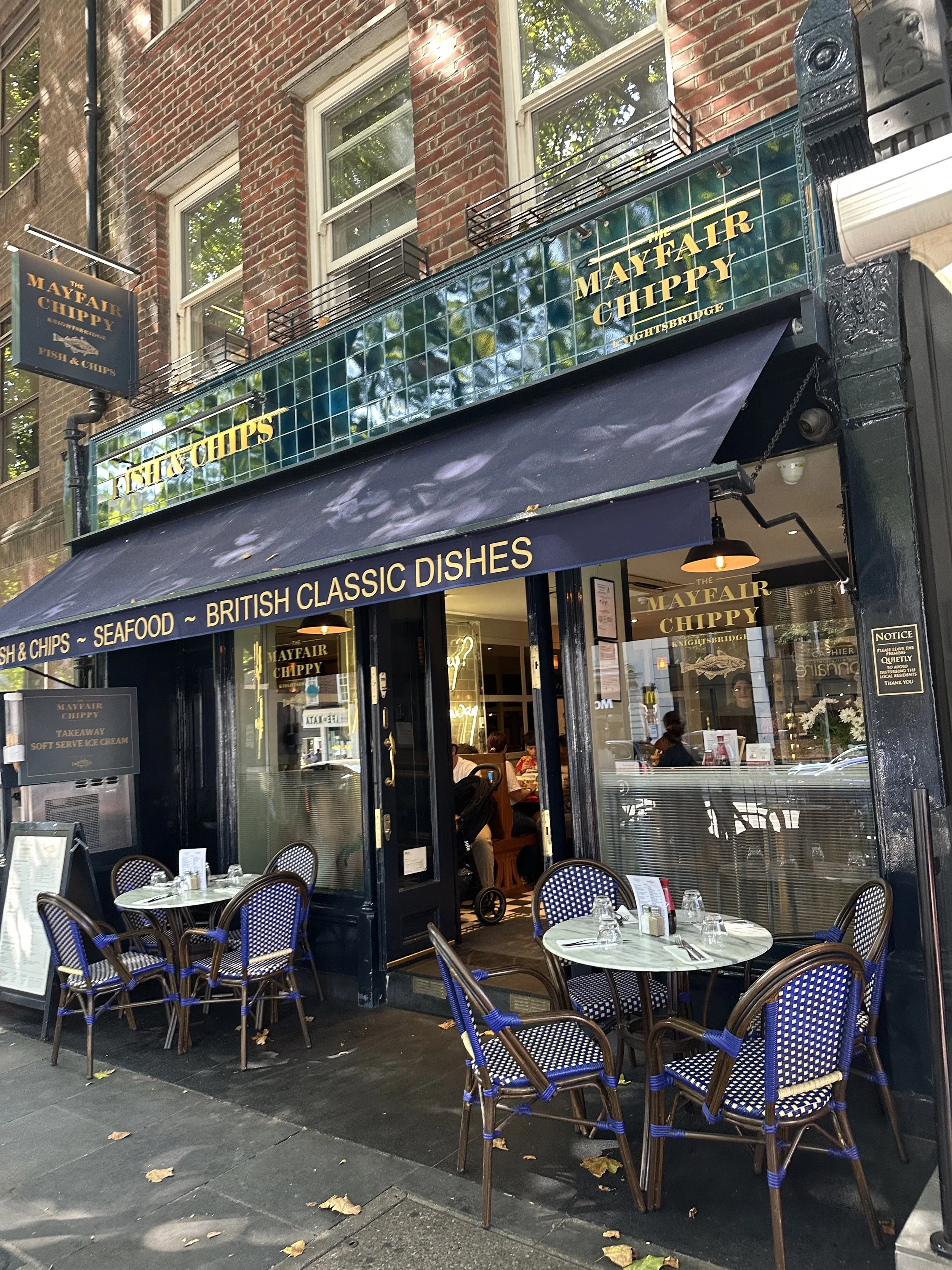 After the museum, we walked about 10 minutes to a restaurant called Mayfair Chippy. Madeleine was still sleeping at this point, so I sat in the front with her for a few extra minutes while we waited for Inbar to join us. Lunch was way better than I expected [Tzvi: for the record, I expected it to be great]. Tzvi, Hallie and Inbar got fish and chips. Madeleine and I got a fried tofu dish that was meant to mimic fried fish, and it was surprisingly good—Madeleine even ate it. The fish and chips also came with mushy peas and some kind of curry. Really enjoyable lunch.