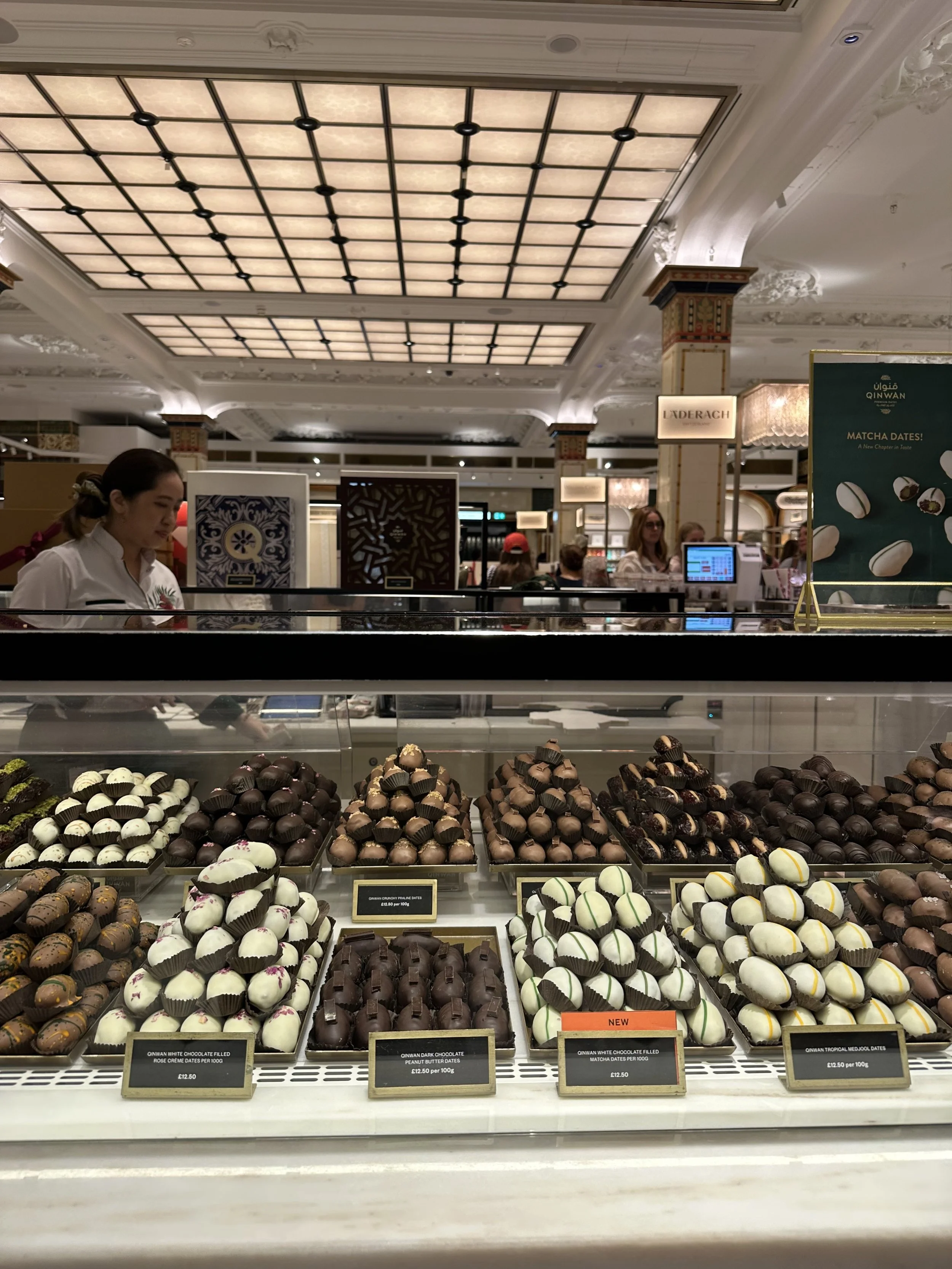 From there we walked to Harrods, which was close by. I picked up chocolate-covered dates from a company based in (I think) Qatar. One was white chocolate mango and the other was milk chocolate raspberry. Delicious, though I did feel a little bad about possibly indirectly funding H*m*s. Though I guess that pales in comparison to going to college in the United States nowadays. We walked around Harrods, including the gift shop. I did not buy a Harrods bag like I did 14 years ago, but I did get some dishtowels.