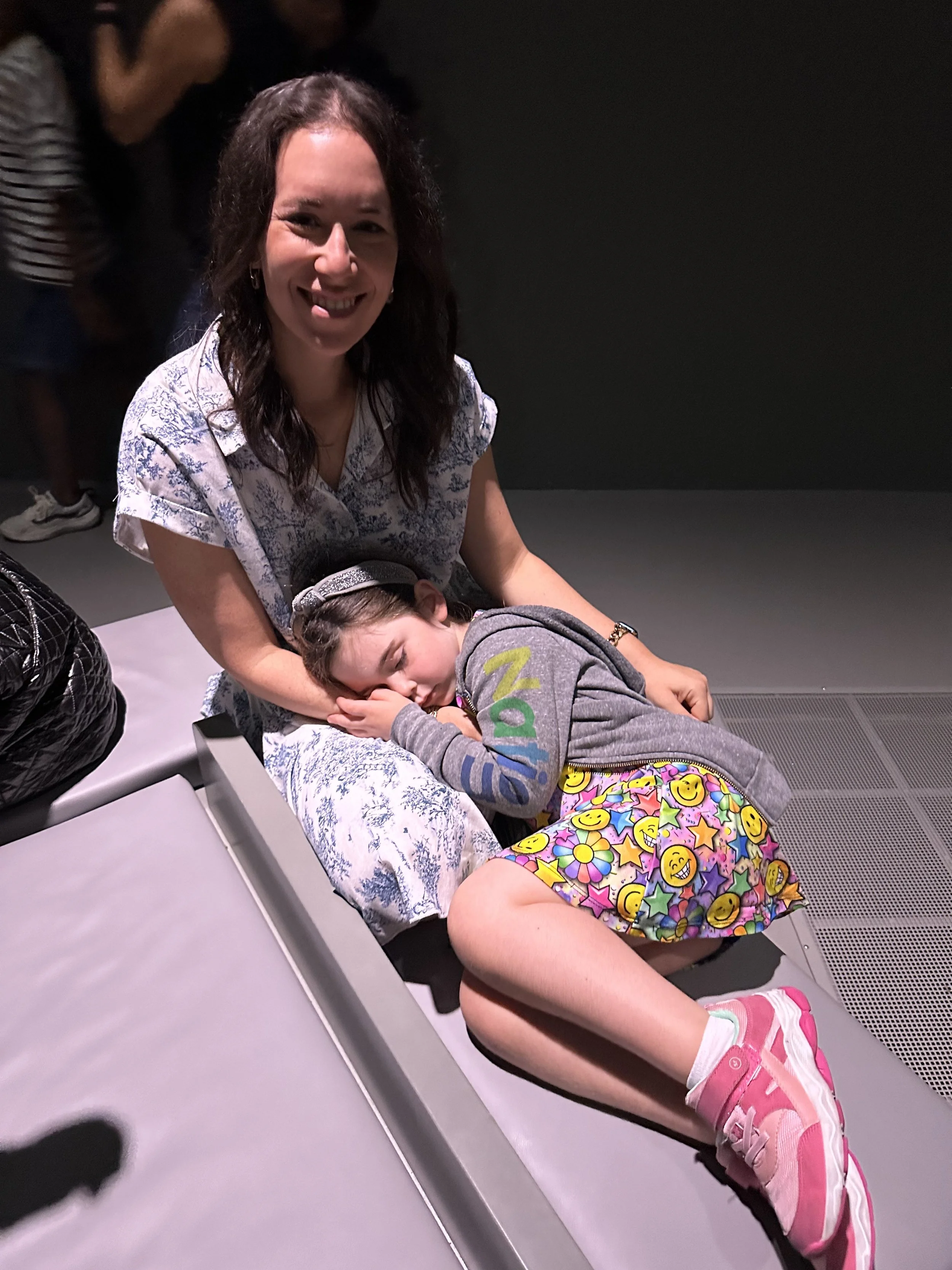 I forgot to mention that the kids were so tired because they’d stayed up late. Madeleine woke up at 5:00 a.m. and then woke Hallie, so neither of them got much extra sleep. As the exhibit started, Madeleine fell asleep and basically slept through the entire morning.