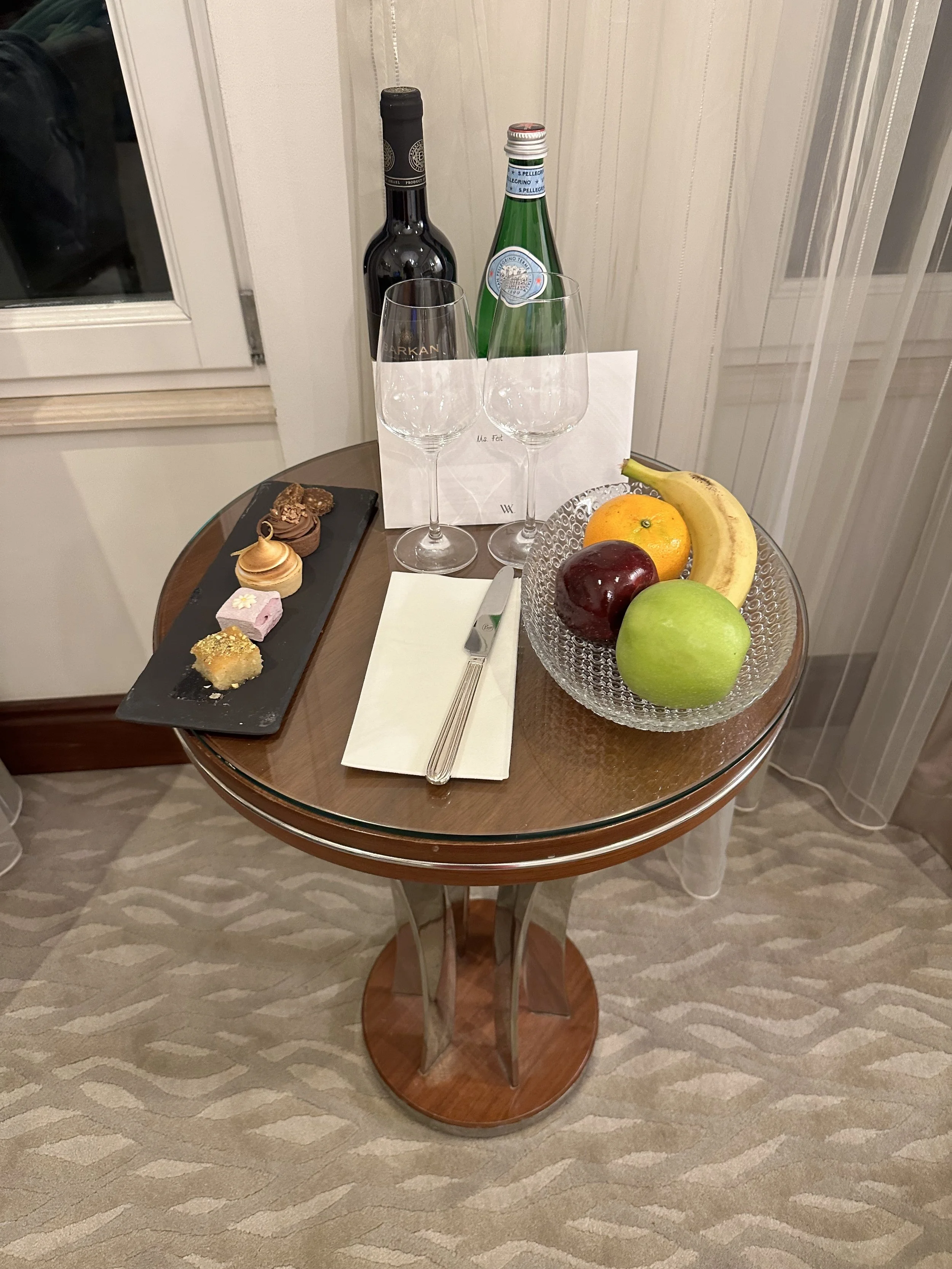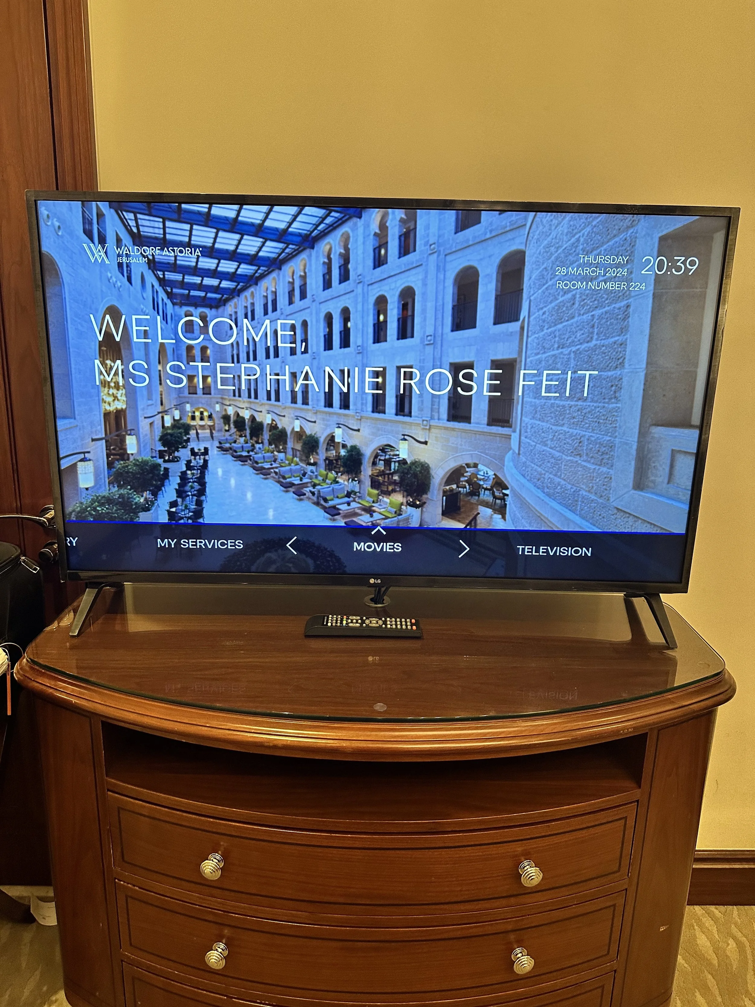 Then it was finally time to go to the hotel. Now, of course the Hilton Vista Level in Tel Aviv was nice, but you know what’s nicer? The Waldorf Astoria Jerusalem. We pulled up, I walked in the doors, and I felt like I was home. There was a beautiful spread, champagne, and our keys. They swept our luggage away. I don’t know, I mean the Hilton Vista level was really an amazing experience, but you can tell when you walk into a Waldorf that it is just another level of luxury. THIS is why the hotel is the destination for me, and I will die on this hill. The room had wine, pastries, and fruit. Of course, as we know, the bathtubs here are wonderful and the rooms are spacious. I was so happy.