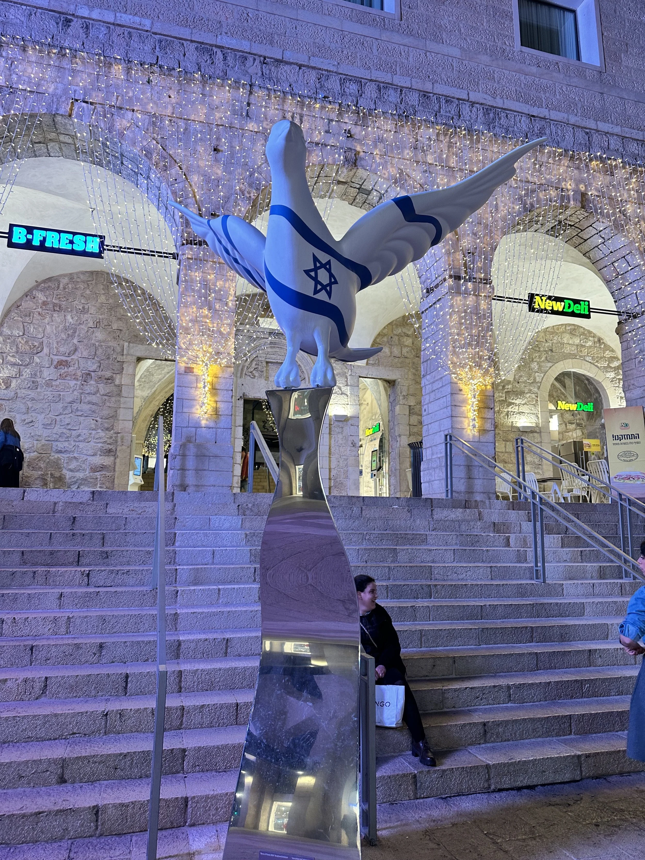 Next was on to Jerusalem!! We pulled up at the Nefesh B’Nefesh center, which is in Cinema City and right next to the Waffle Factory (you can imagine how depressing it was to bypass that restaurant). It’s the relatively new building which was gorgeous. We went into a room and got a presentation from the head of the Lone Soldiers at NBN. We had a subpar dinner there (why can’t they just give us some falafel and hummus?). Anyway, we were assigned to tables with lone soldiers. Our two were actually brothers in law. One was from NY and had gone to an Italian private school and then decided to go to Gush to learn. The other was from Portland. They married sisters. I also met a lone soldier who is the daughter of someone I worked with at JNF. Small world.