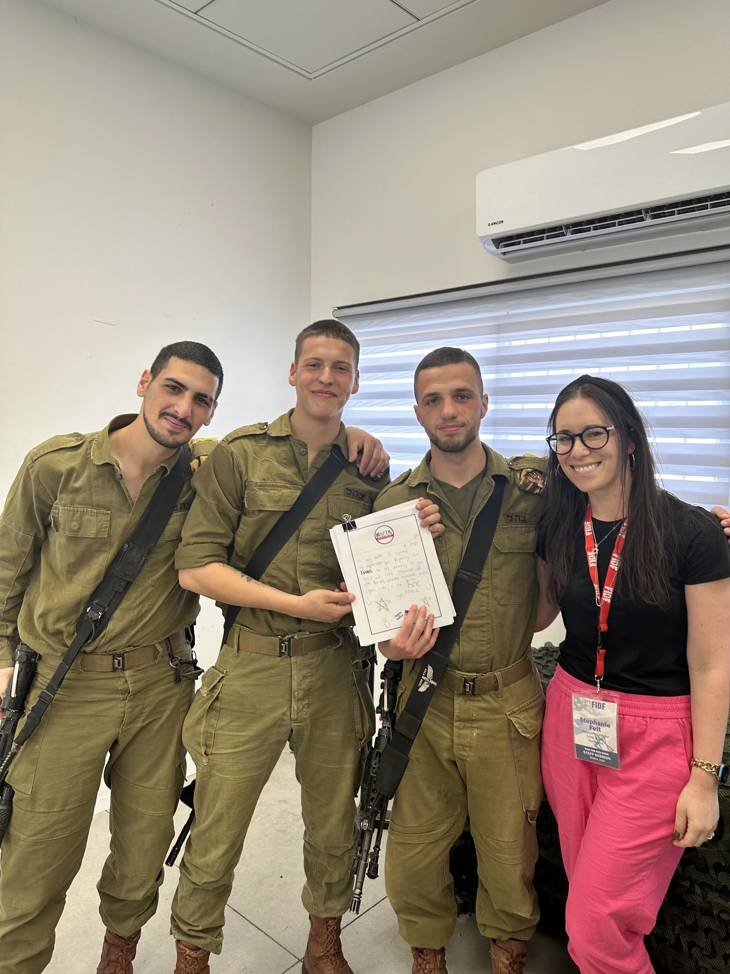 We heard from some of the soldiers there, a few lived in local settlements like Ariel. They showed us some of their gear and I got to try on a vest. It was heavy. And smelly. I gave them letters from HAFTR kids and they were genuinely surprised that people care so much. I told them all HAFTR kids learn is to love the IDF and Israel. I showed them a video HAFTR posted of kids just thanking chayalim. They were really surprised and touched by it. It was nice.
