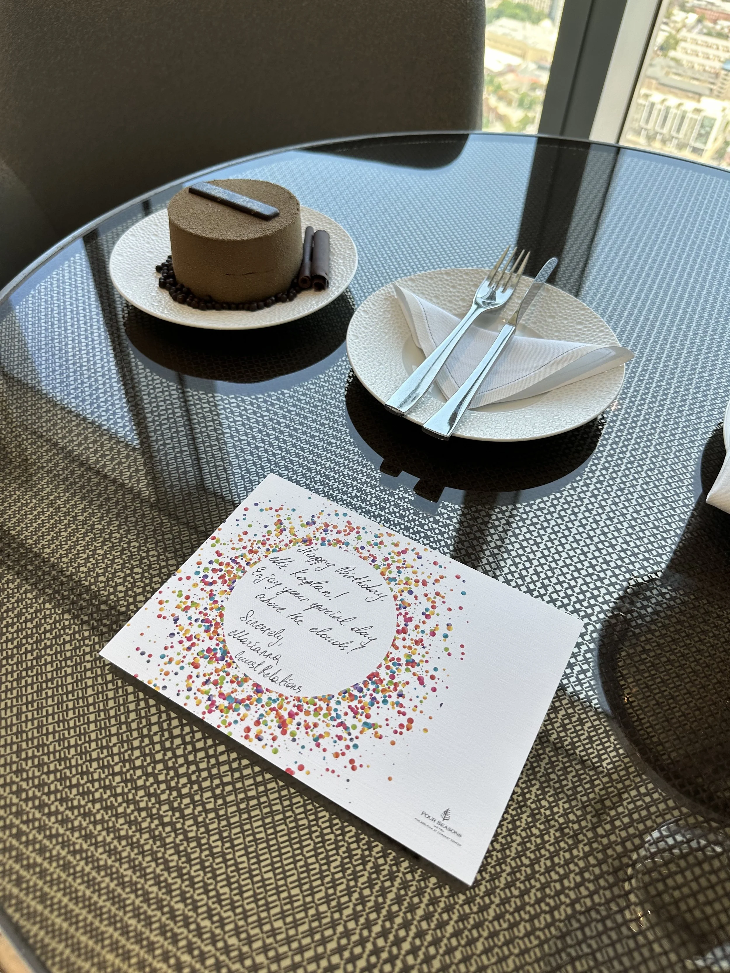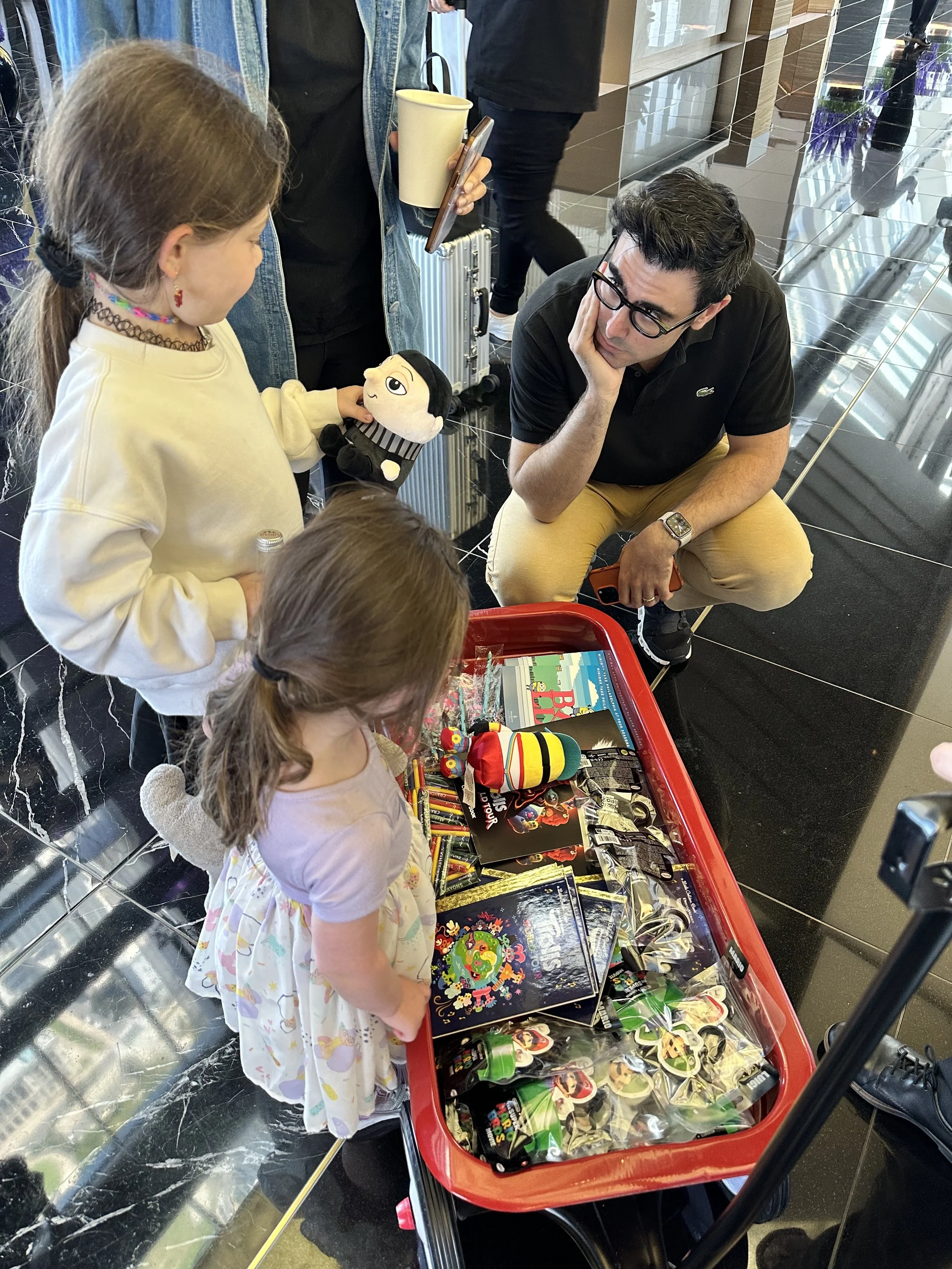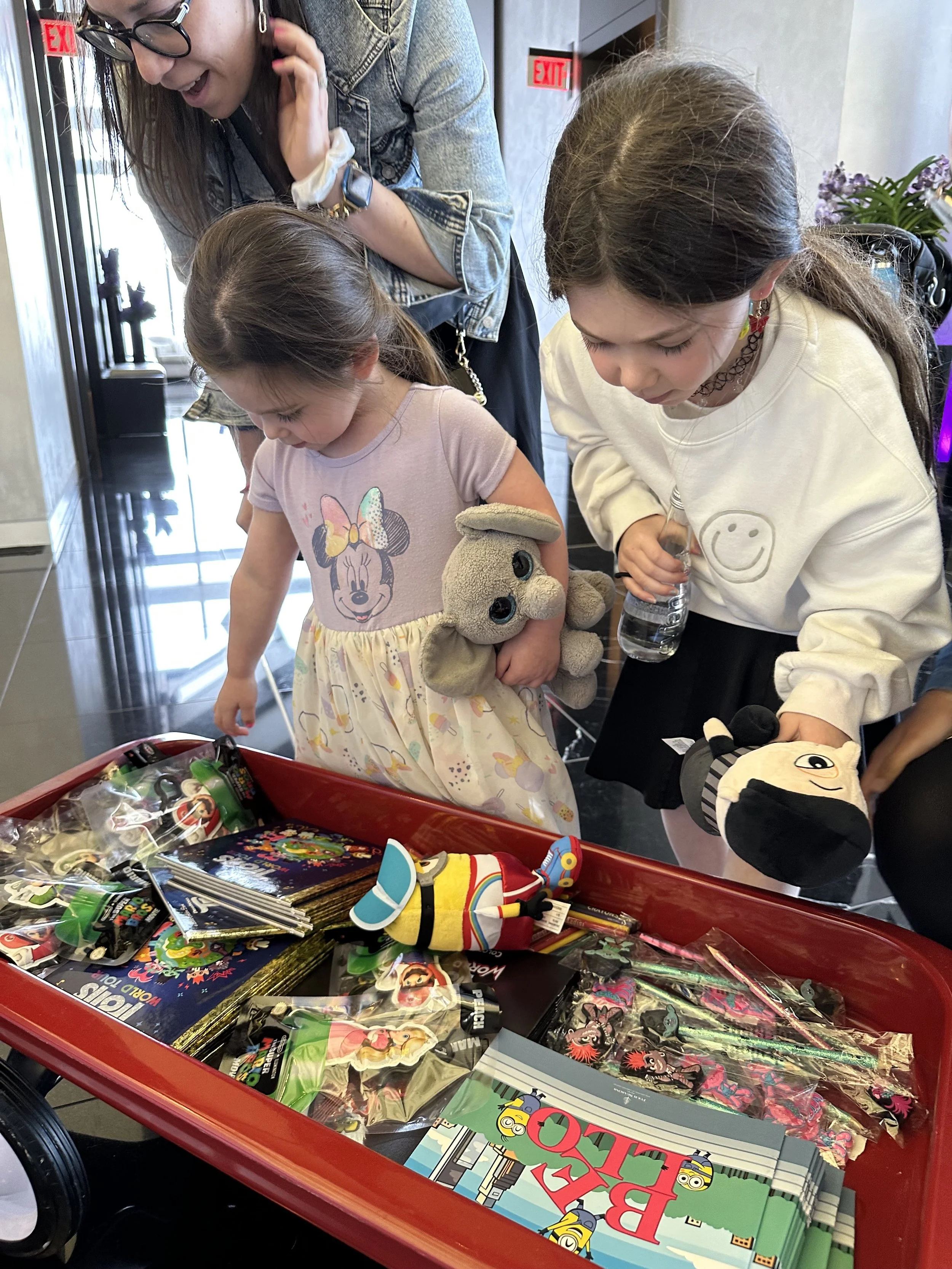 When we got back to the hotel we found they had left a little Minions themed cupcake for the girls (all of the kids stuff here is Minions because the hotel is at the top of the Comcast Center (and Comcast owns Universal, the studio that made Minions)). They also left a cake for Tzvi because I told them it was his birthday. There are also mini robes and slippers that the girls love, and Minions kids toothbrushes and full size toothpaste!