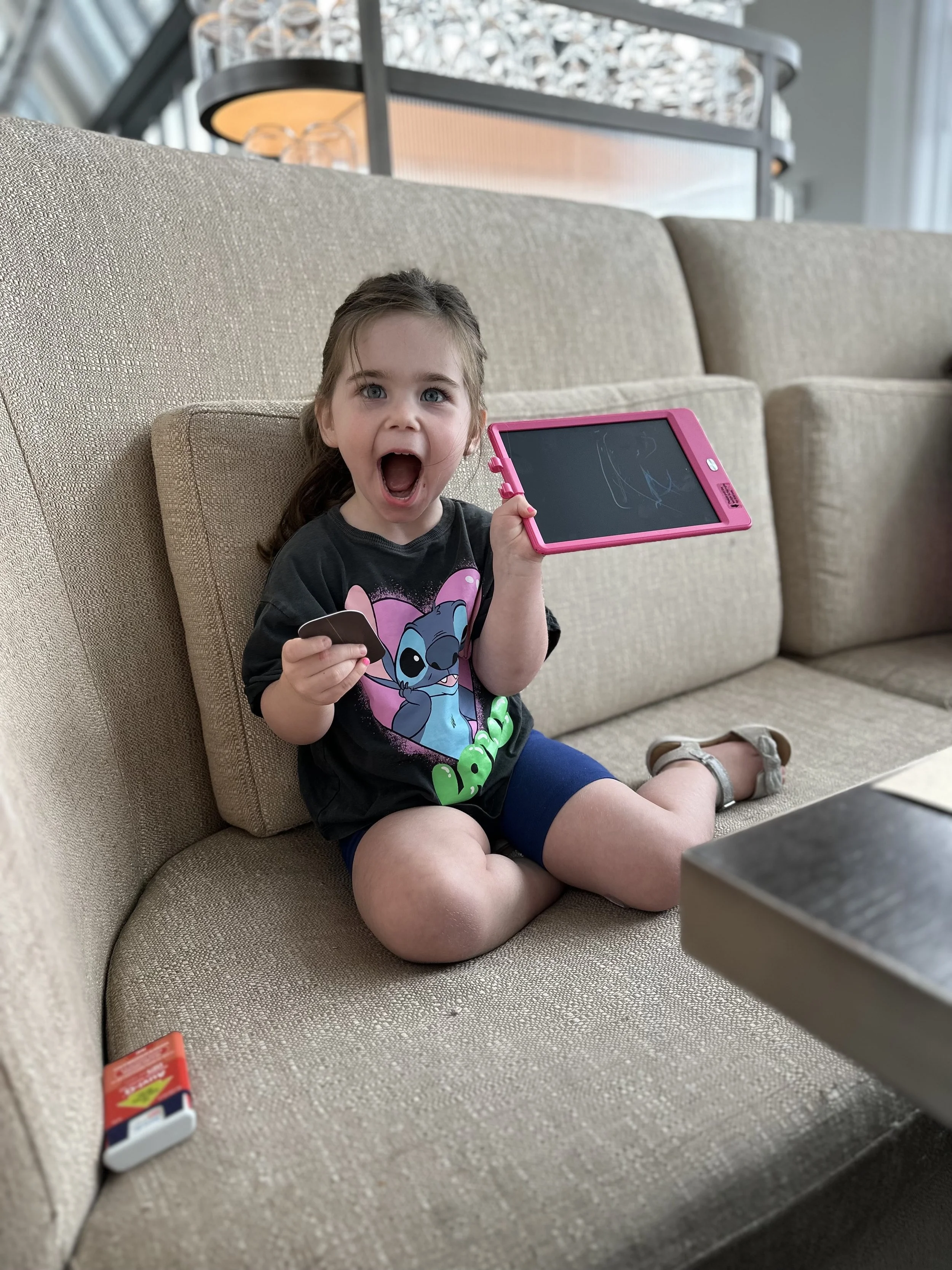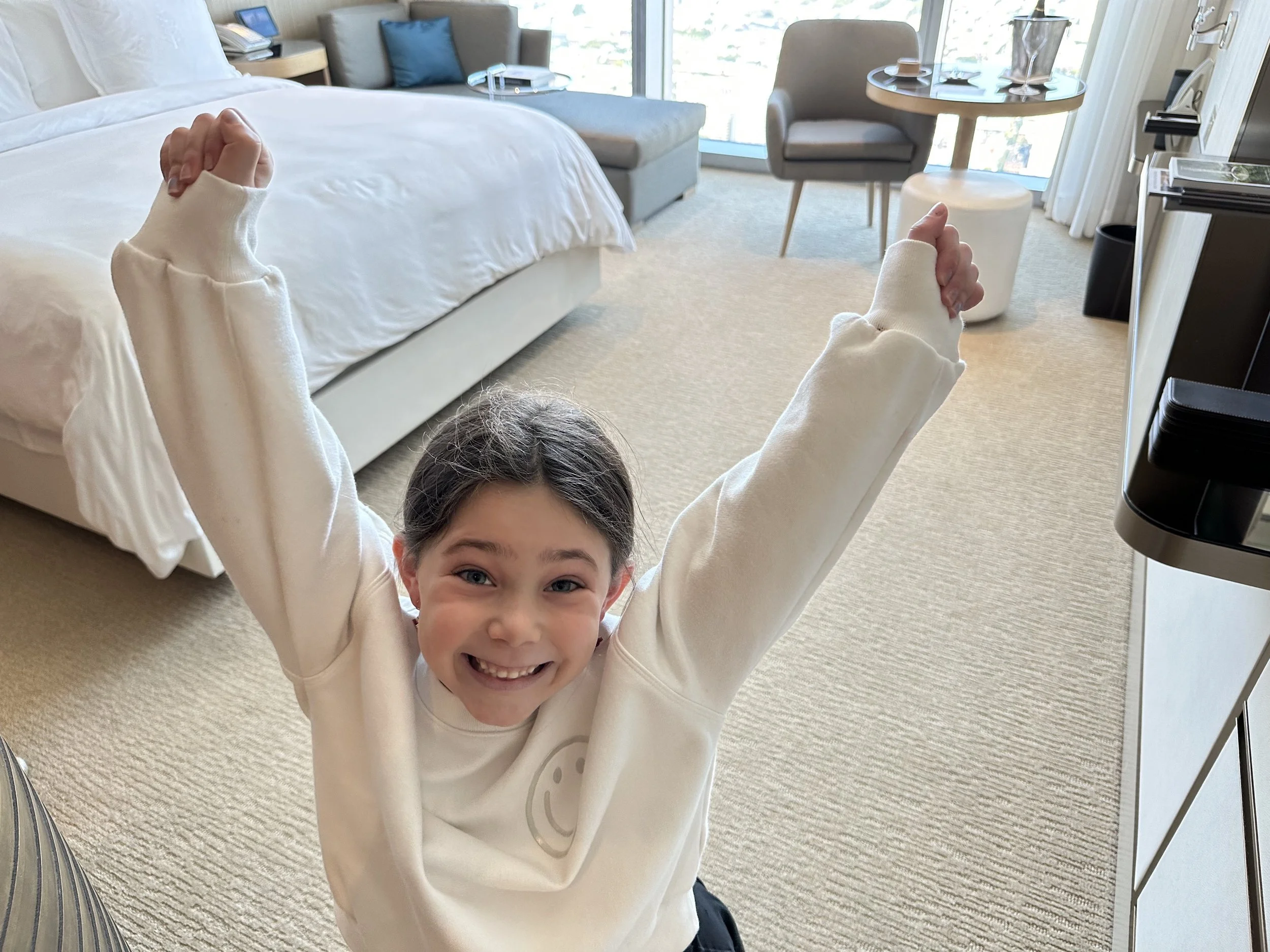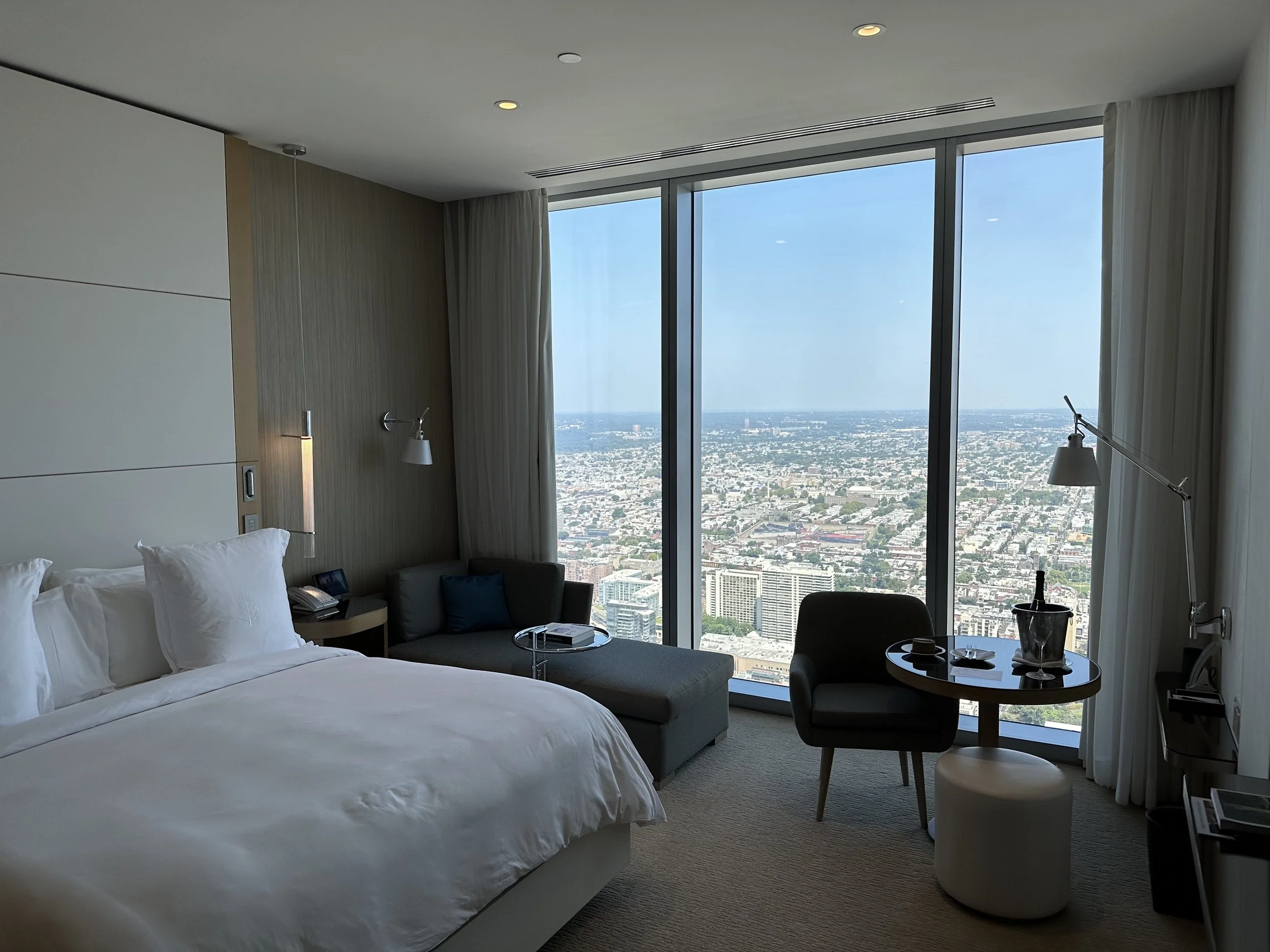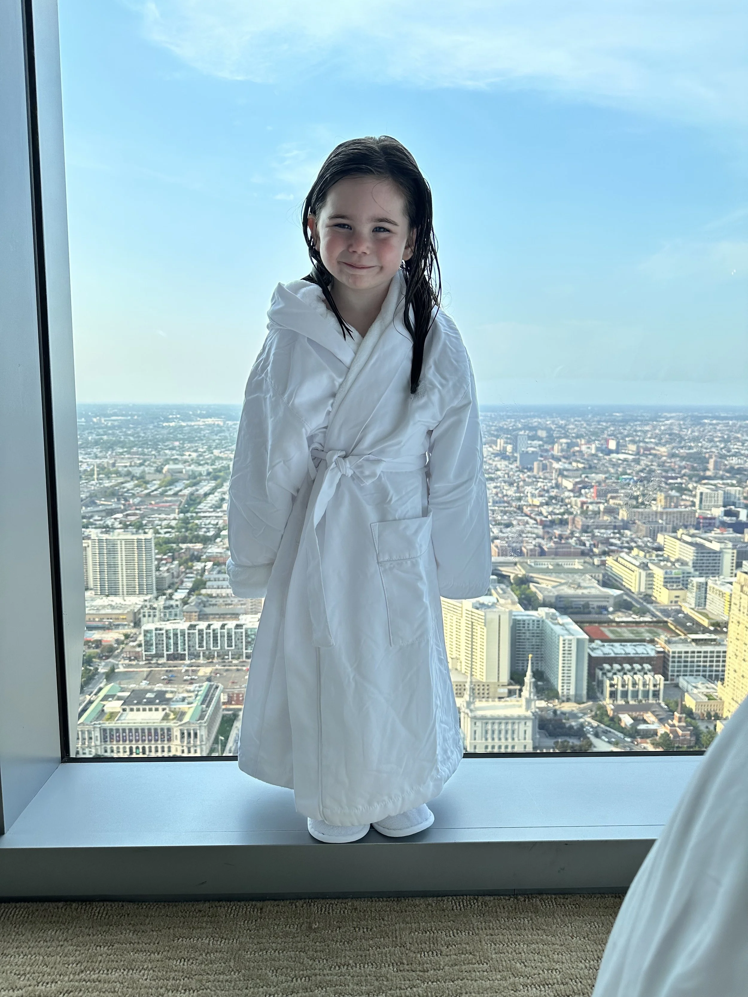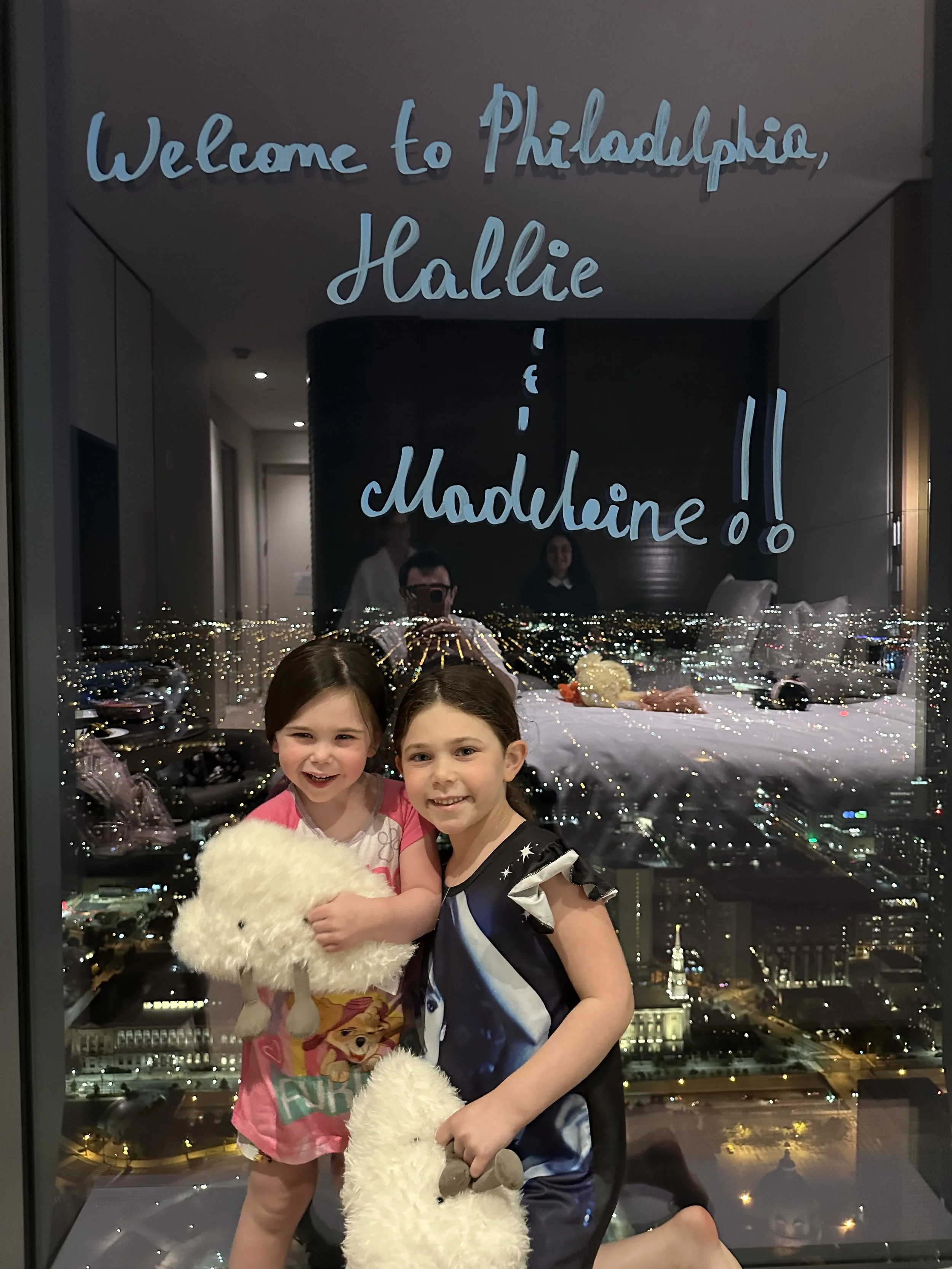 When we got back upstairs we found that they had written “Welcome to Philadelphia Hallie and Madeleine” on the window and left cloud pillows (because we are “above the clouds”), as well as really nice cases of colored pencils and coloring books. They are really doing it up for the kids, it’s so nice. Last time they had a little tee-pee that they set up in the room, but apparently they’ve stopped that because it was cultural appropriation, so now they just give you lots of nice stuff. Still, we’re so impressed.