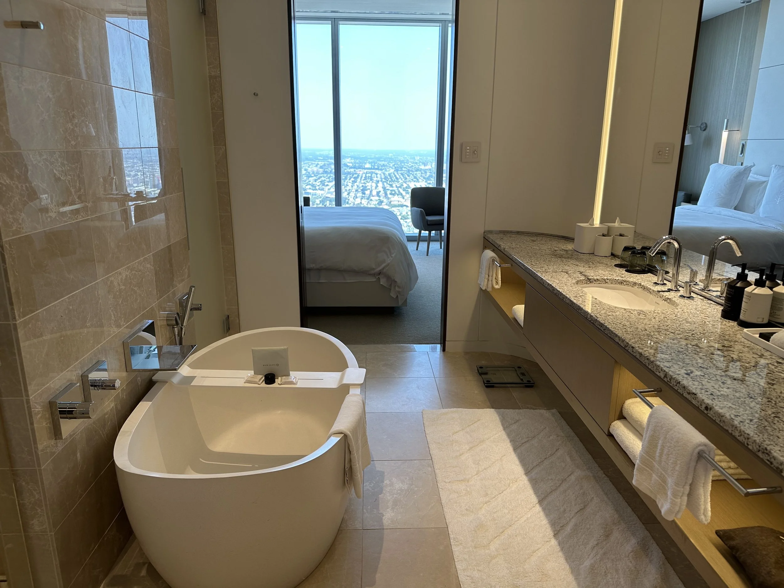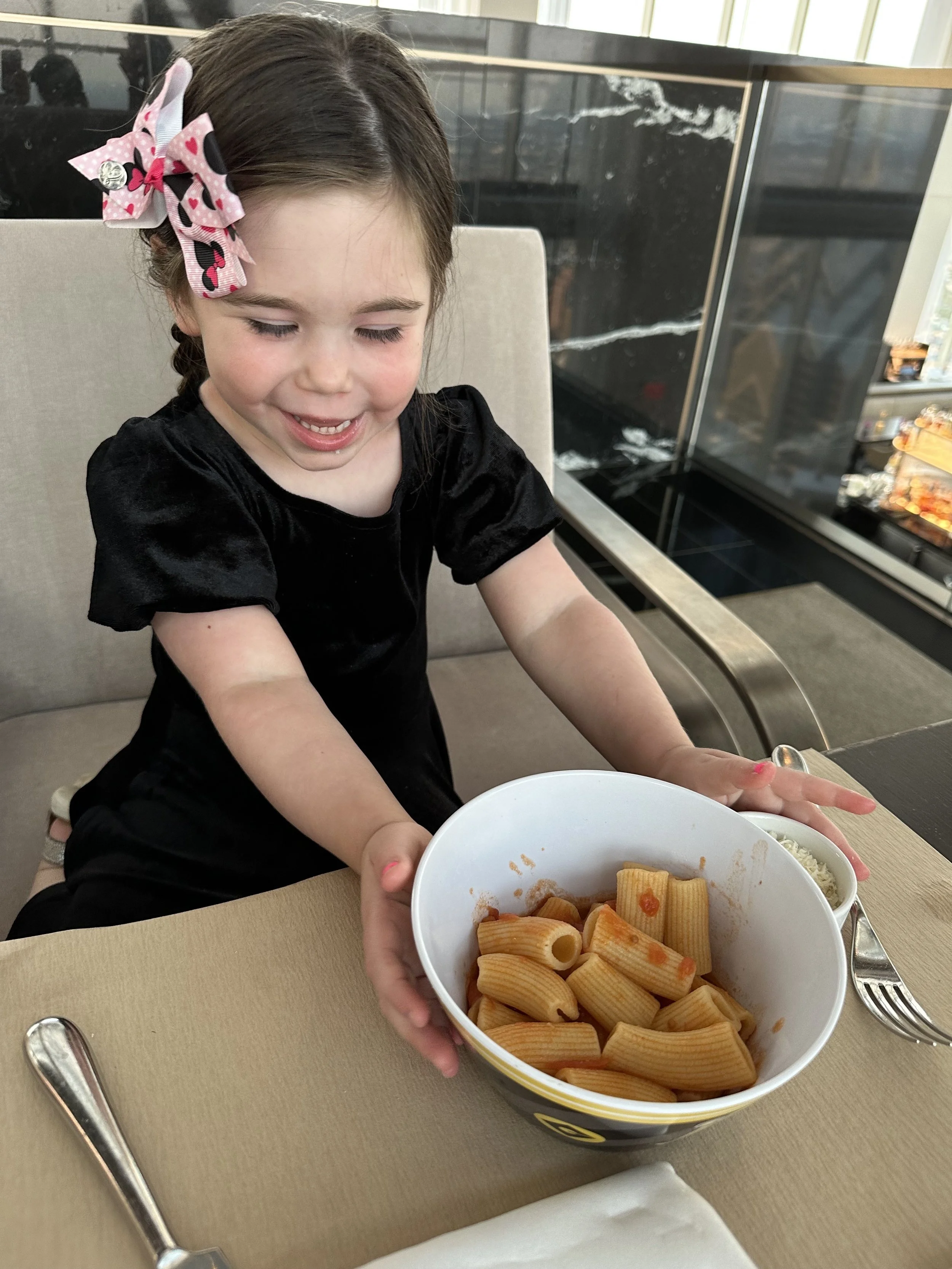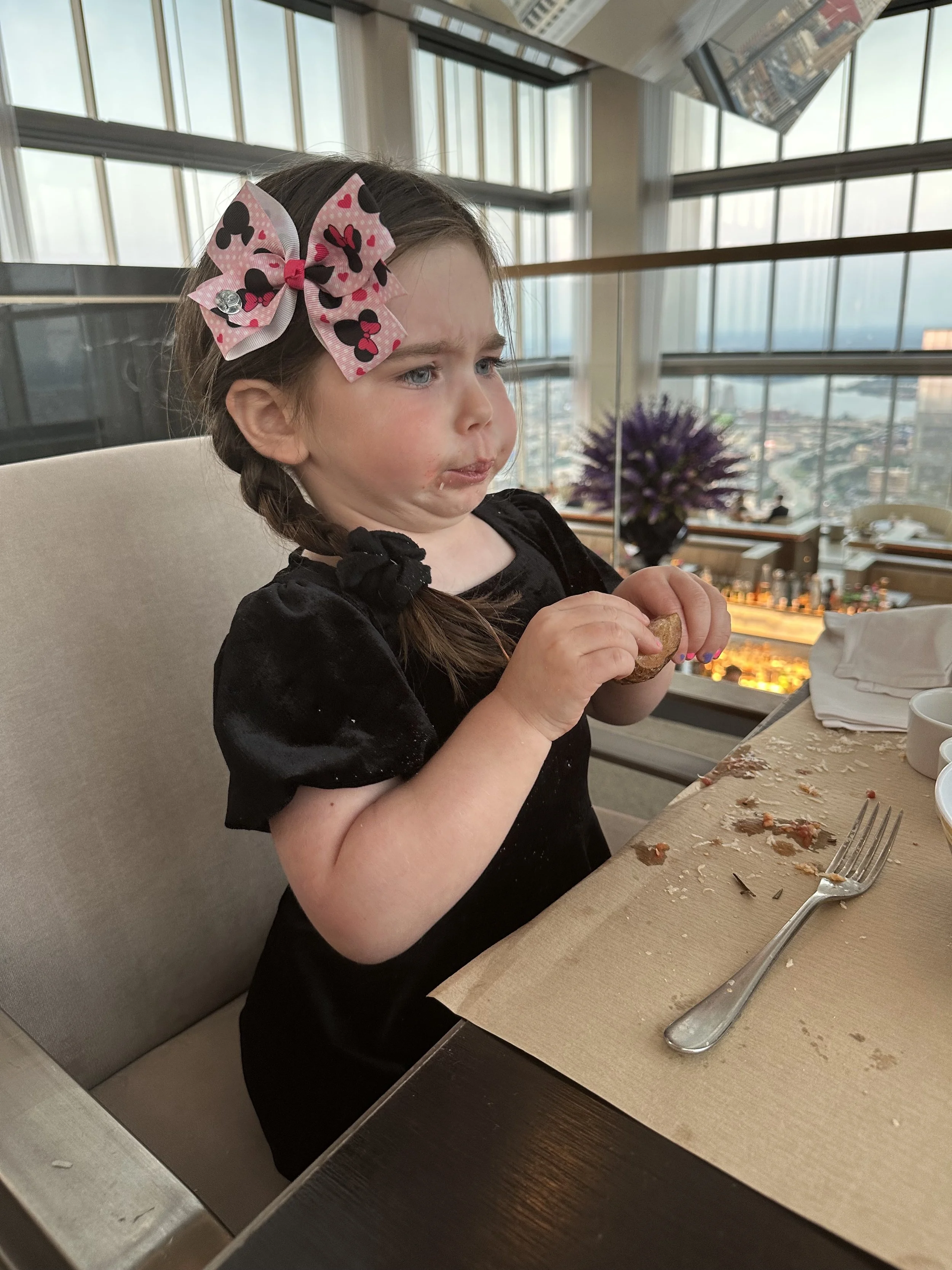 We aimed to leave the house at 9am, but didn’t make it out until 9:30, which wasn’t surprising. It didn’t actually matter because the drive was shorter than expected. Including one rest stop, it was door to door in under 2.5 hours. We approached the Four Seasons Philadelphia, our regular spot. We were met with pink lemonade and Evian water bottles upon arrival. Then we headed up the 60 flight elevator and checked in. Madeleine was a little scared of how high it went, but she got over it. At check in they wheeled out a big red wagon and let the girls pick toys. They both chose plush Minions dolls, even though they’ve never seen those movies. Luckily one of our rooms was already ready, so we dropped our bags and then took the house car to brunch.
