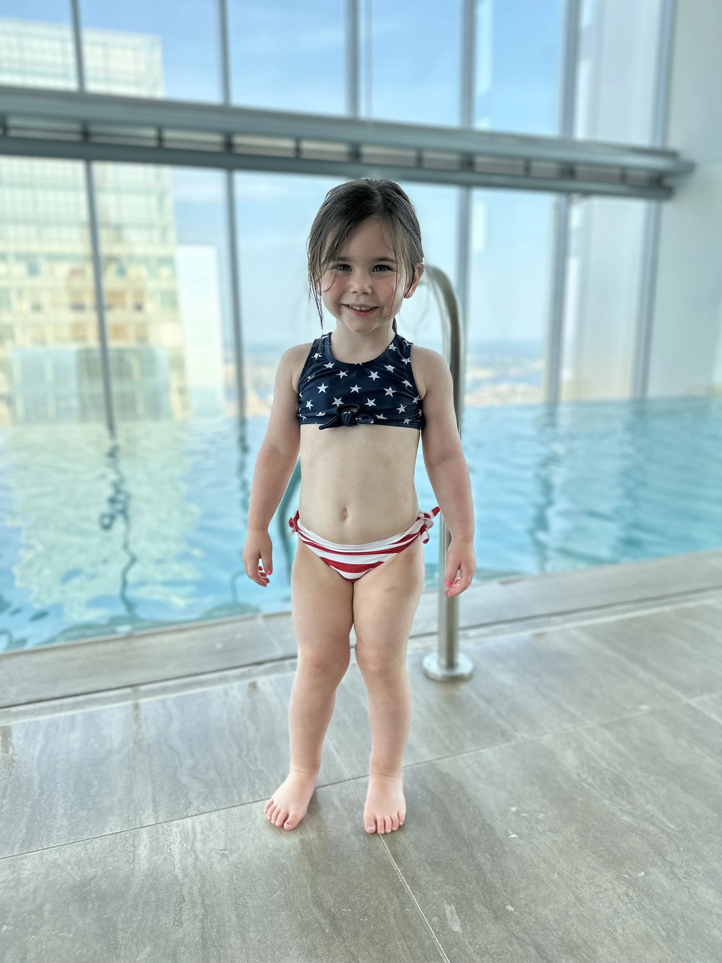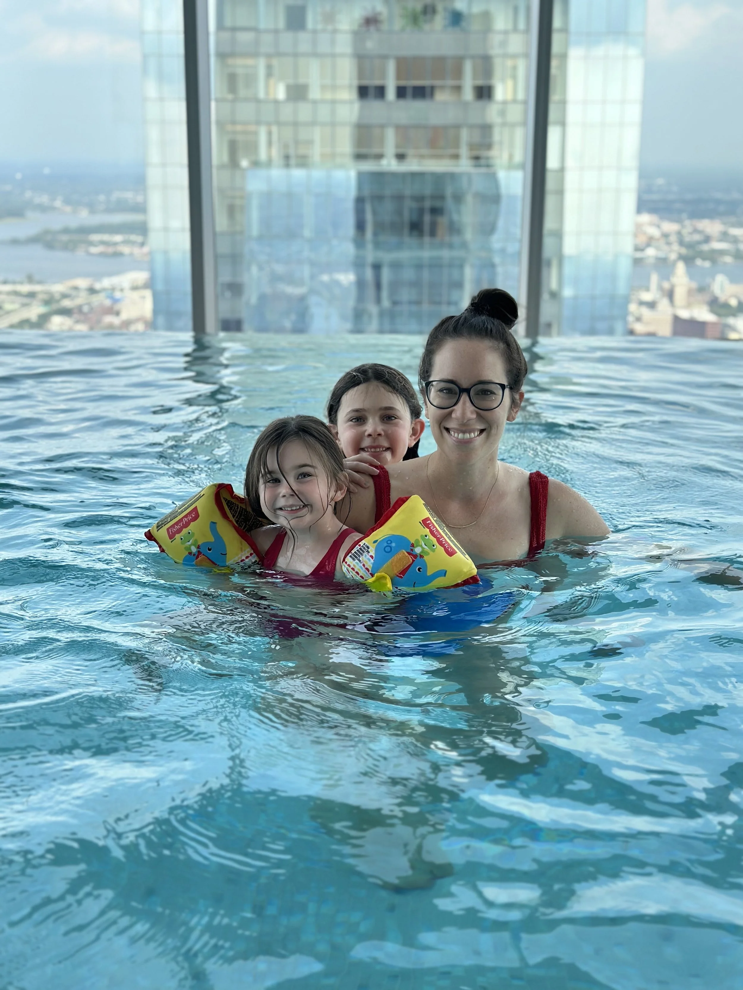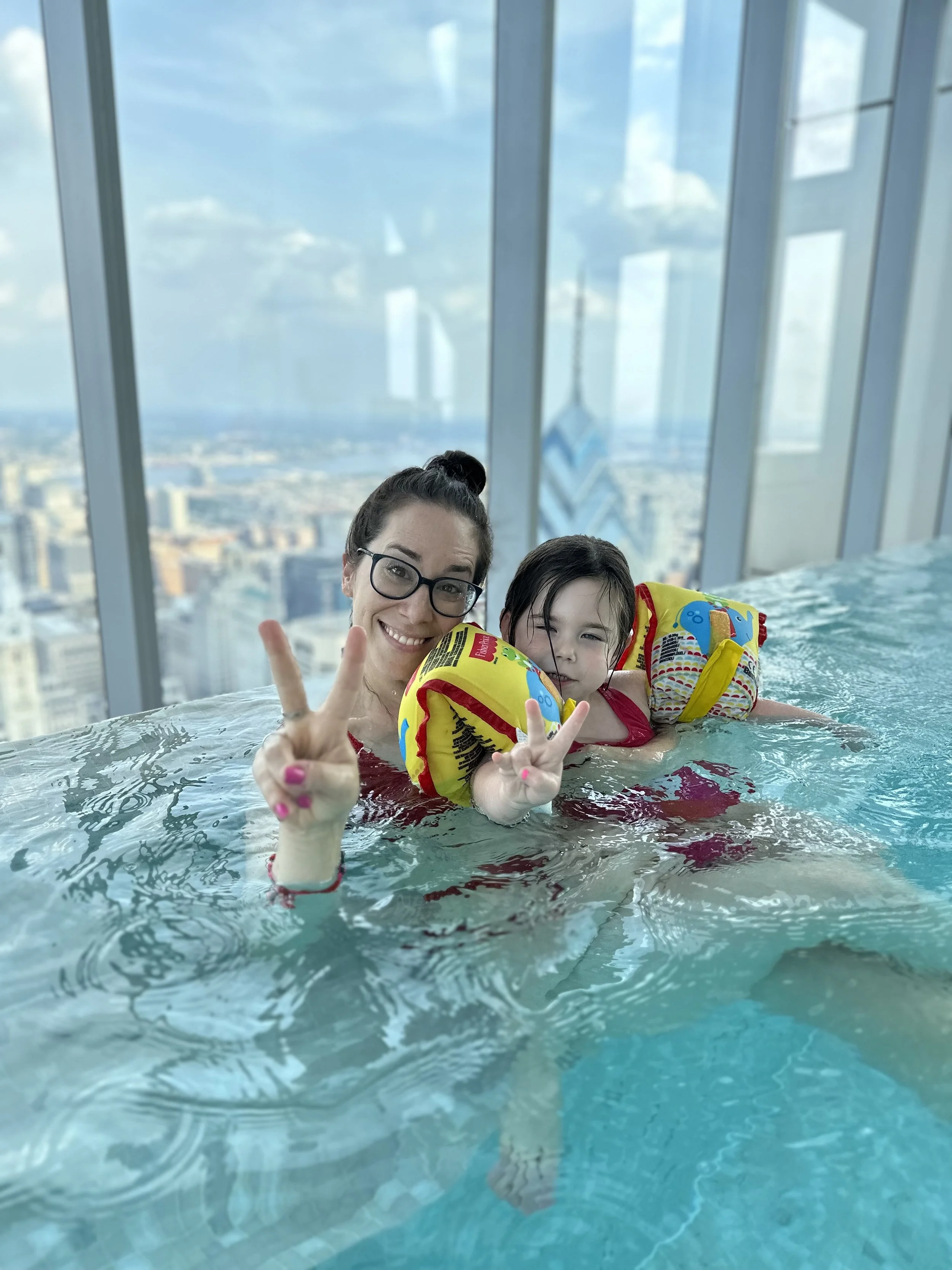 From there we walked back to the hotel, Madeleine once again insisting on riding on Tzvi’s shoulders. We walked through the Love Park, where Madeleine saw a fountain and said she wanted to go in it. We said we were going back to the hotel to swim in the pool, but she insisted she was going in the fountain. Even once we got back to the hotel she continued to insist she was going back to the park to the fountain. Eventually she acquiesced and we spent some time in the pool, before going back and changing for dinner.
