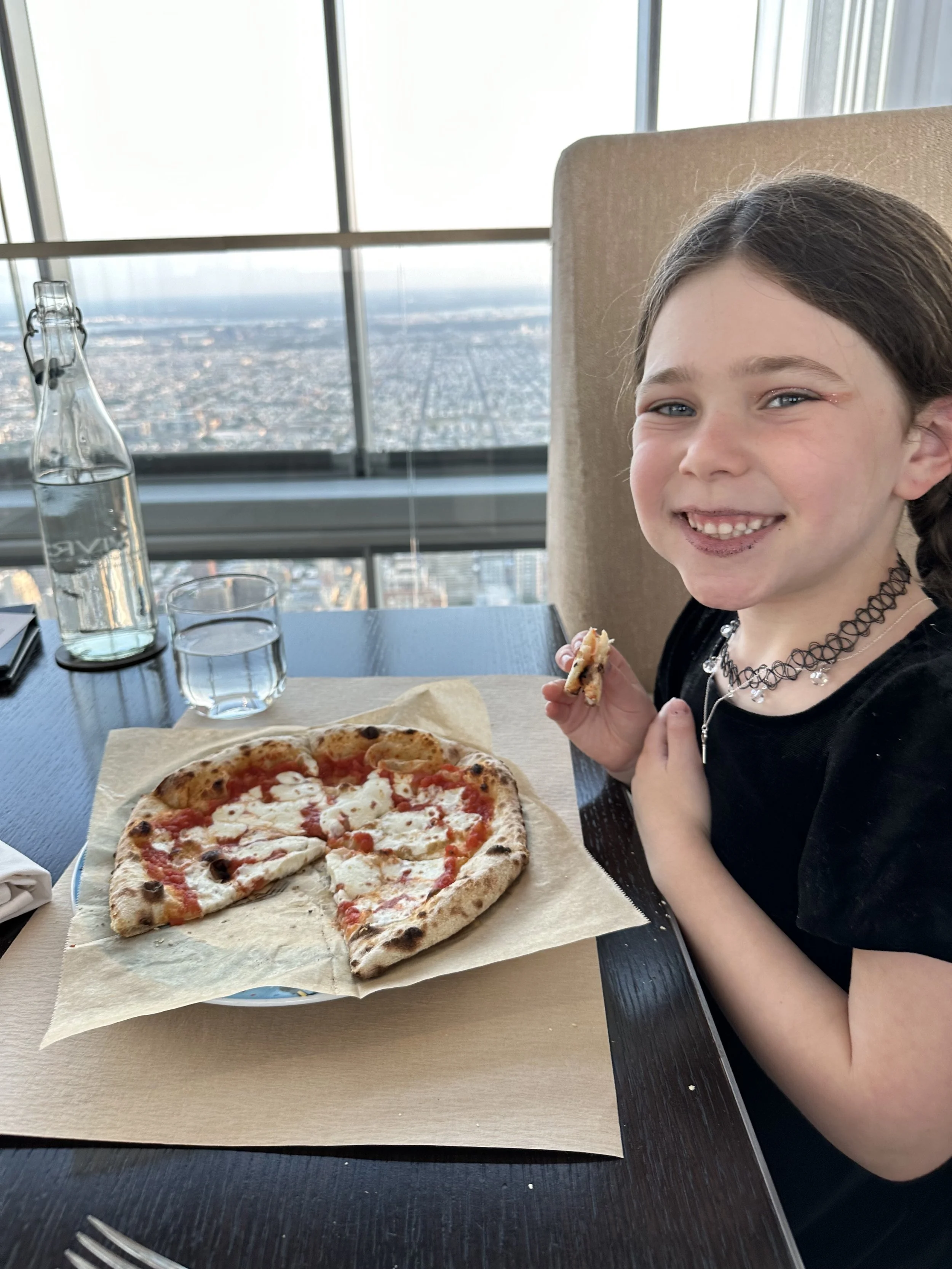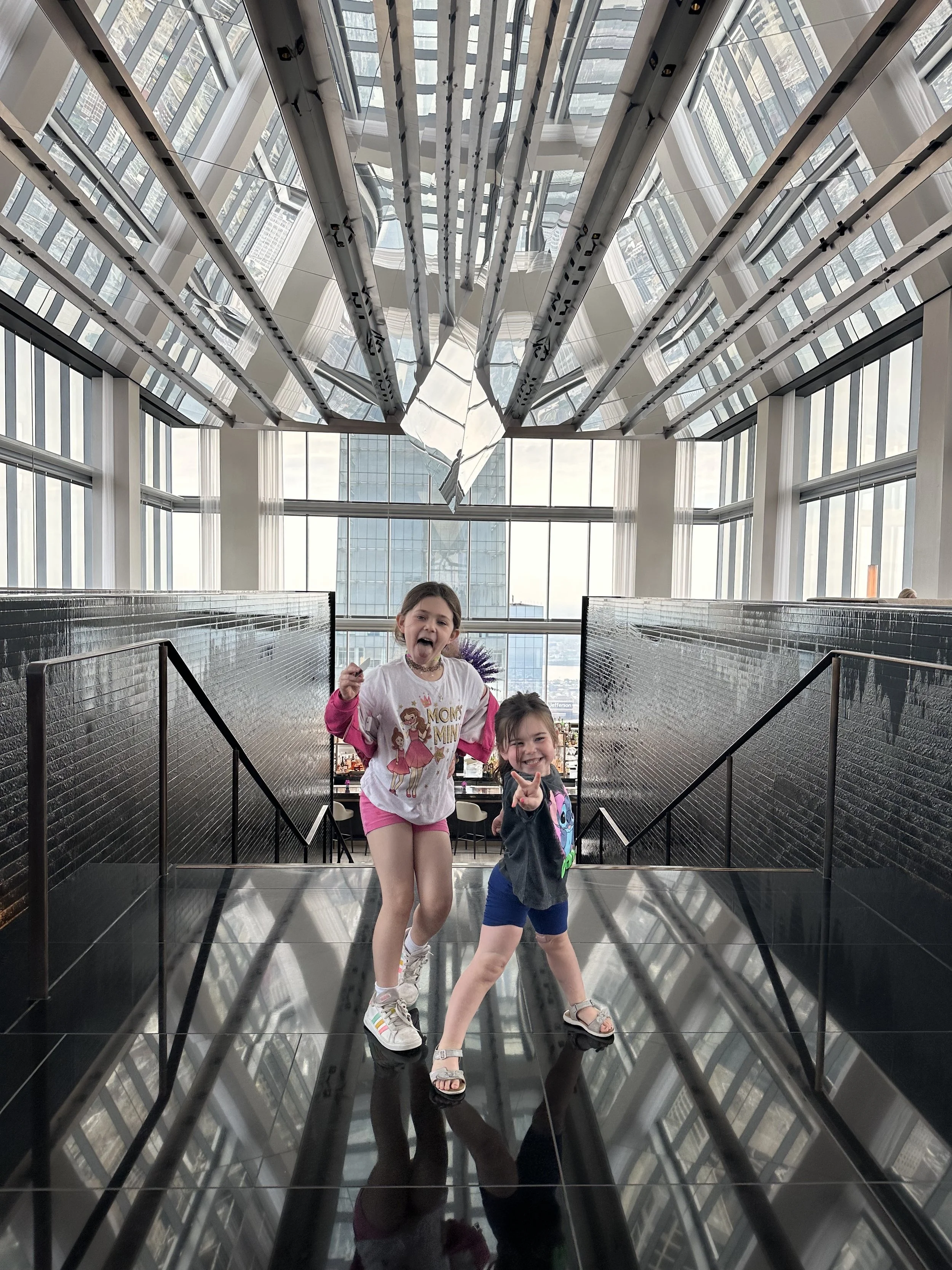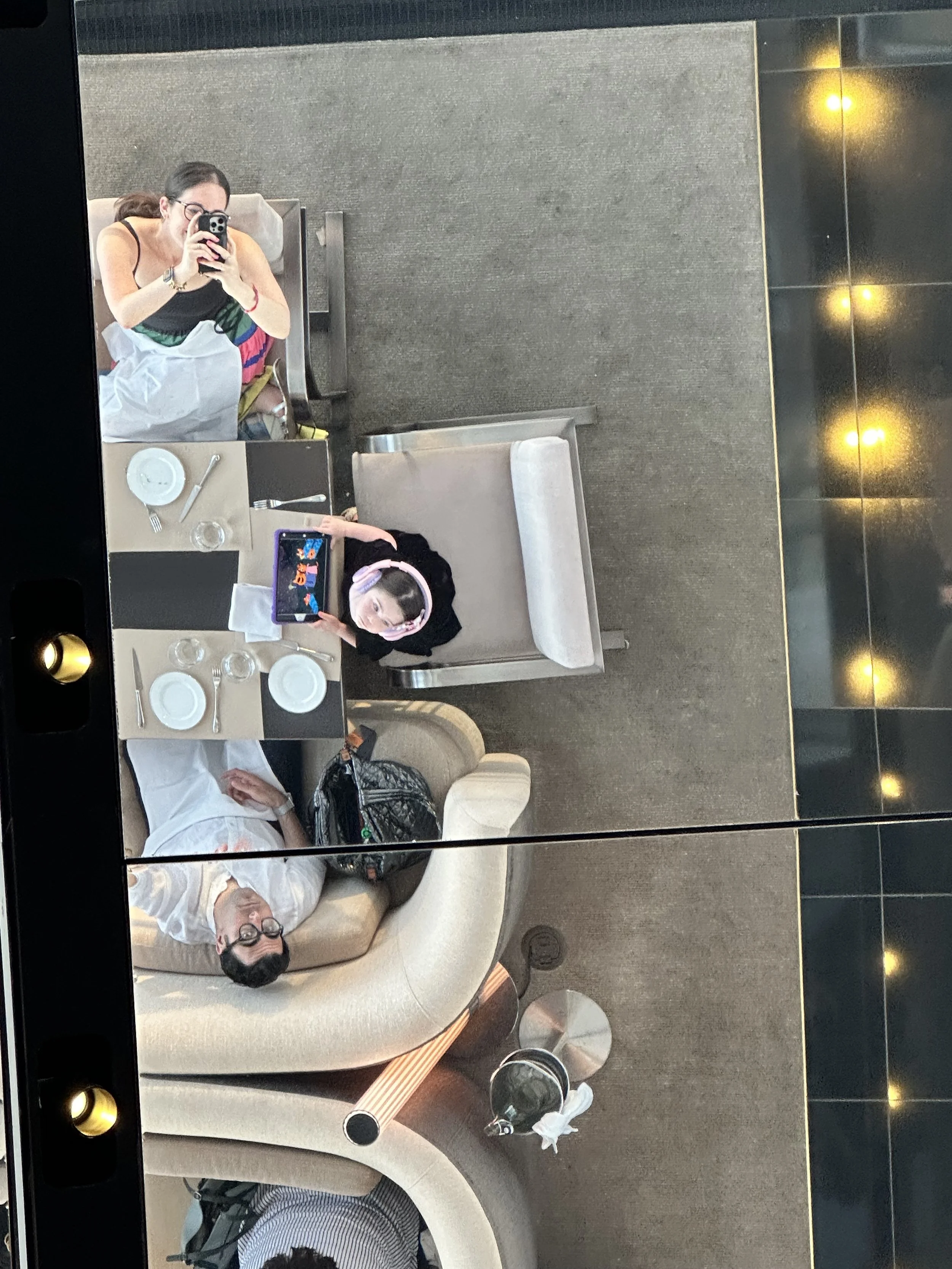 Tonight we ate at the hotel restaurant J.G. Sky High, which is the lobby Jean Georges restaurant, not the main Jean Georges restaurant that charges $300 per person. Hallie decided to wear her Wednesday Adams outfit, right down to the black lipstick. Of course Madeleine followed, but luckily without the lipstick. Inbar wore hers as well. For appetizers we shared corn soup, corn-basil pot stickers, and chips and guac. For the main Inbar and I both had salmon and Tzvi had Fish and Chips. Hallie had pizza and Madeleine had plain pasta. Madeleine also got two sides of parmesan cheese that she gobbled up. For dessert we shared almond cake, hot chocolate cake, and a strawberry sundae. It was delicious. The kids were nuts (when they weren’t on their tablets), but it was a really nice dinner.