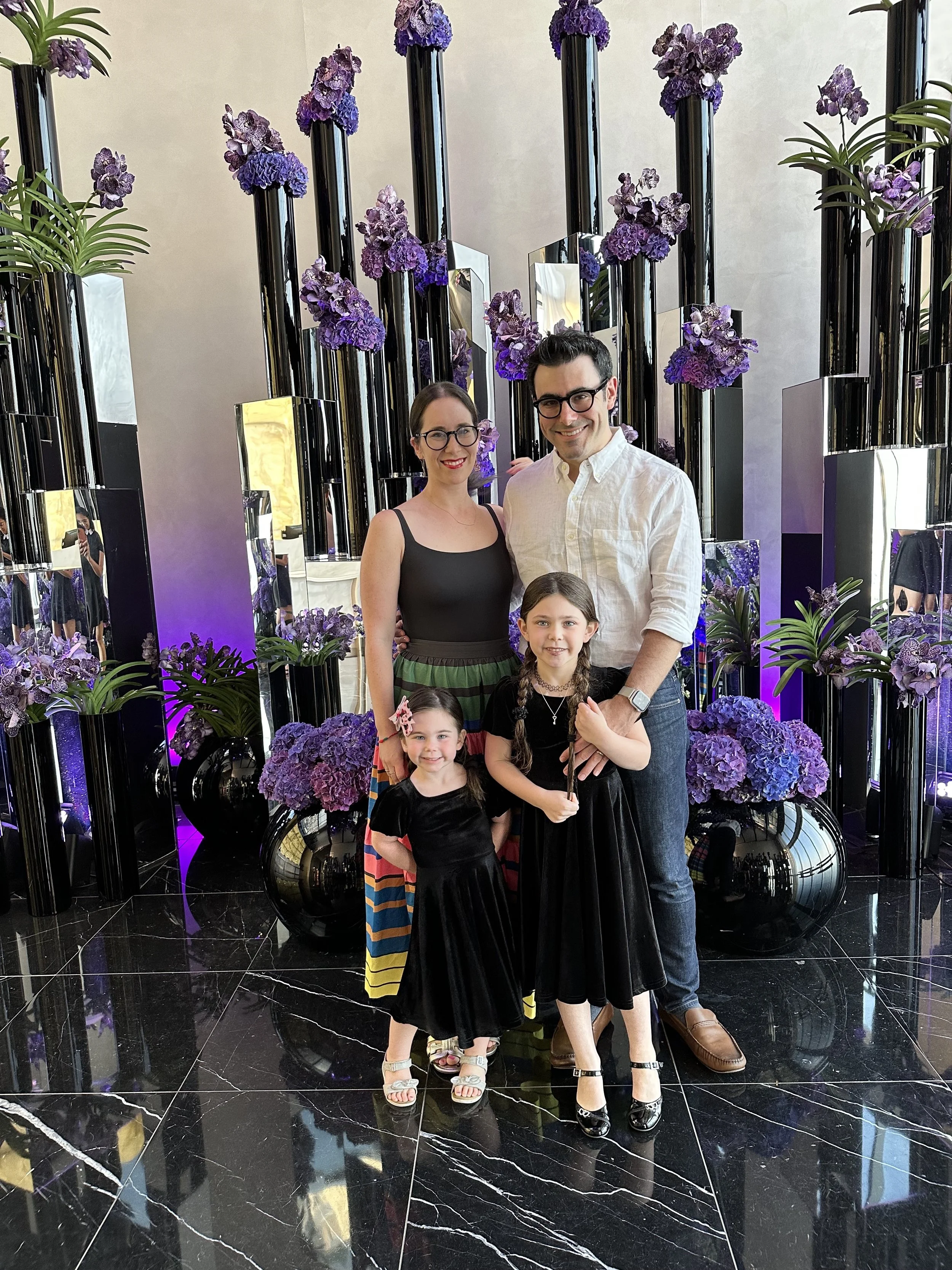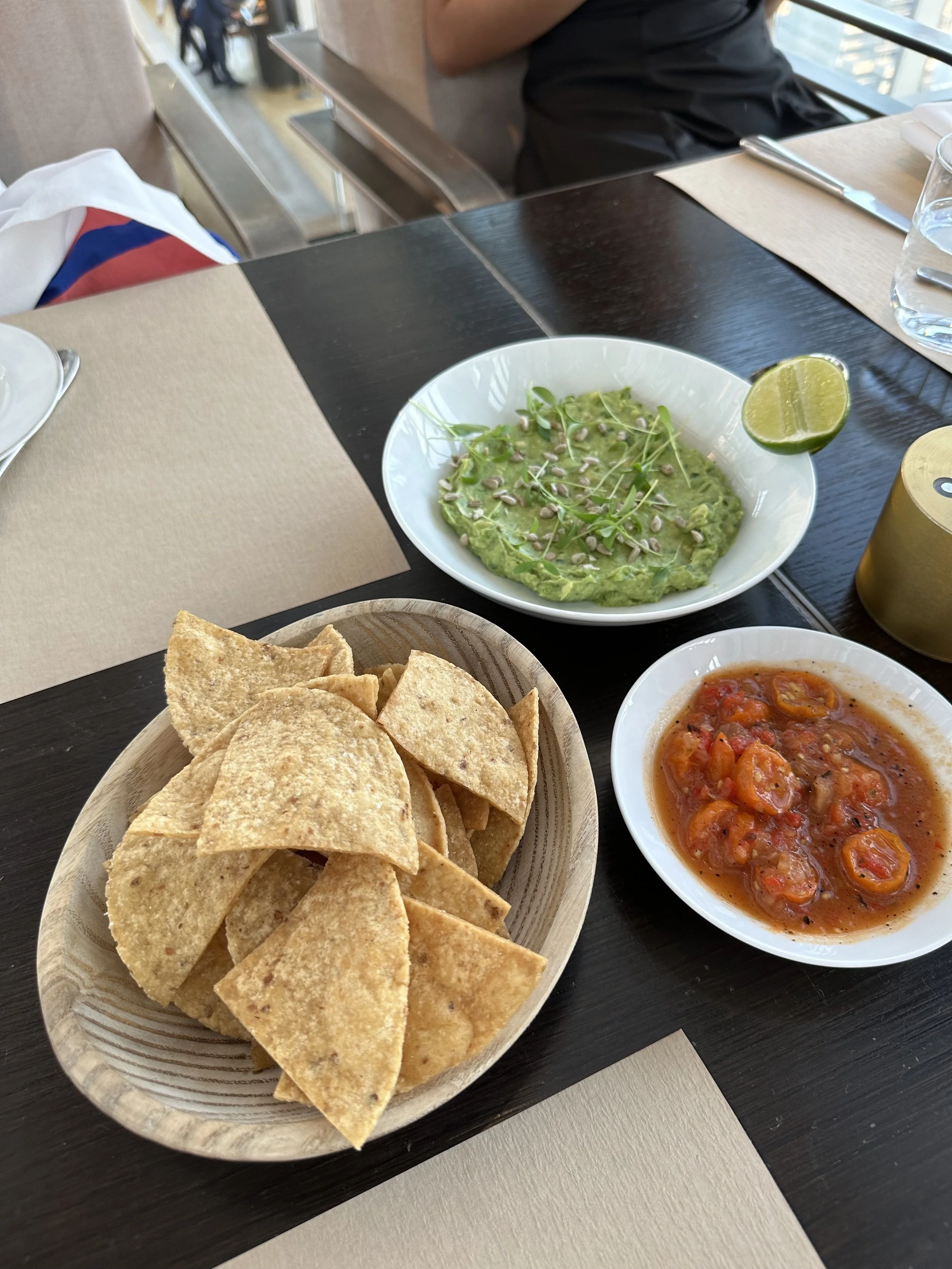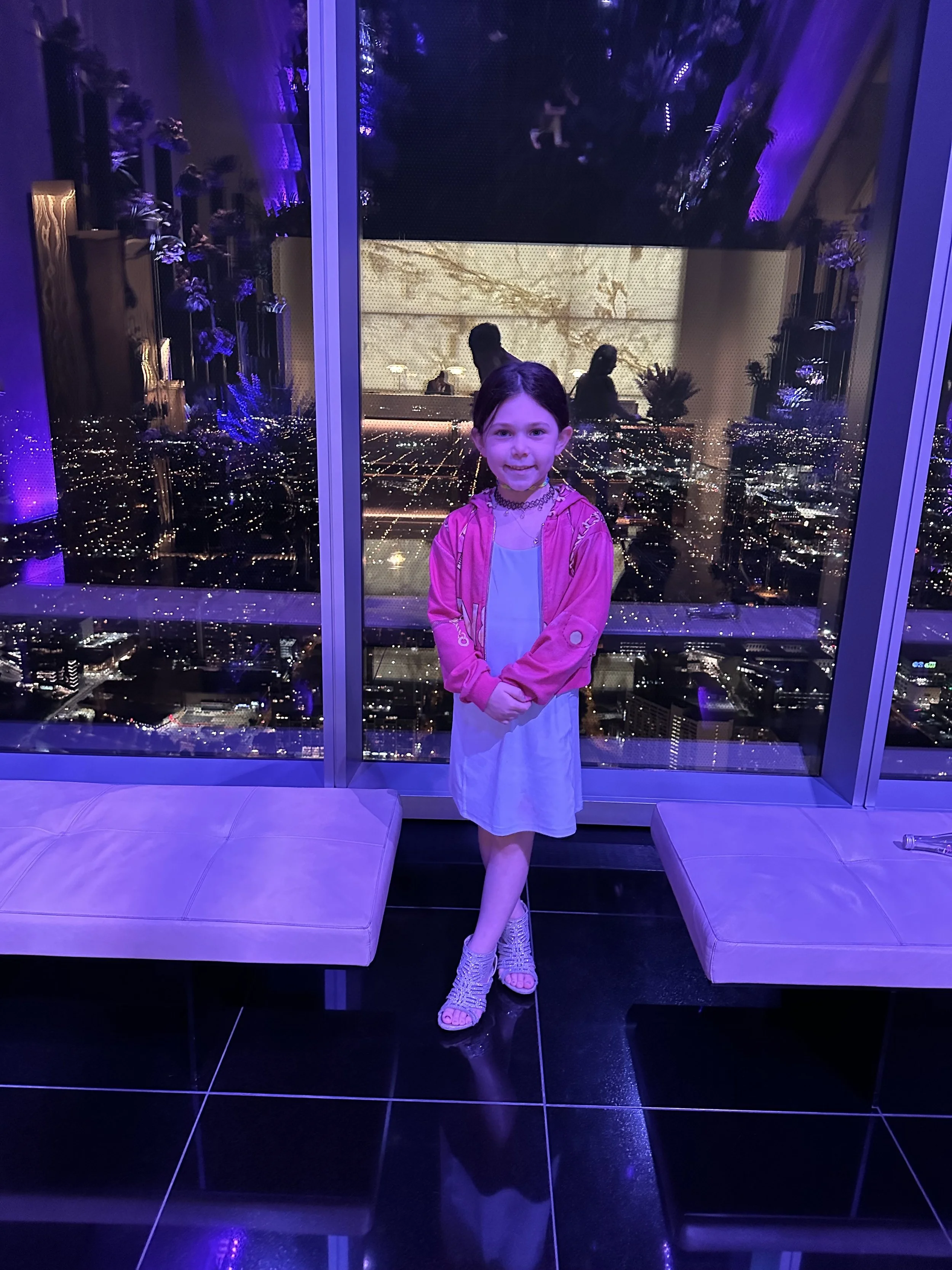 Tonight we ate at the hotel restaurant J.G. Sky High, which is the lobby Jean Georges restaurant, not the main Jean Georges restaurant that charges $300 per person. Hallie decided to wear her Wednesday Adams outfit, right down to the black lipstick. Of course Madeleine followed, but luckily without the lipstick. Inbar wore hers as well. For appetizers we shared corn soup, corn-basil pot stickers, and chips and guac. For the main Inbar and I both had salmon and Tzvi had Fish and Chips. Hallie had pizza and Madeleine had plain pasta. Madeleine also got two sides of parmesan cheese that she gobbled up. For dessert we shared almond cake, hot chocolate cake, and a strawberry sundae. It was delicious. The kids were nuts (when they weren’t on their tablets), but it was a really nice dinner.