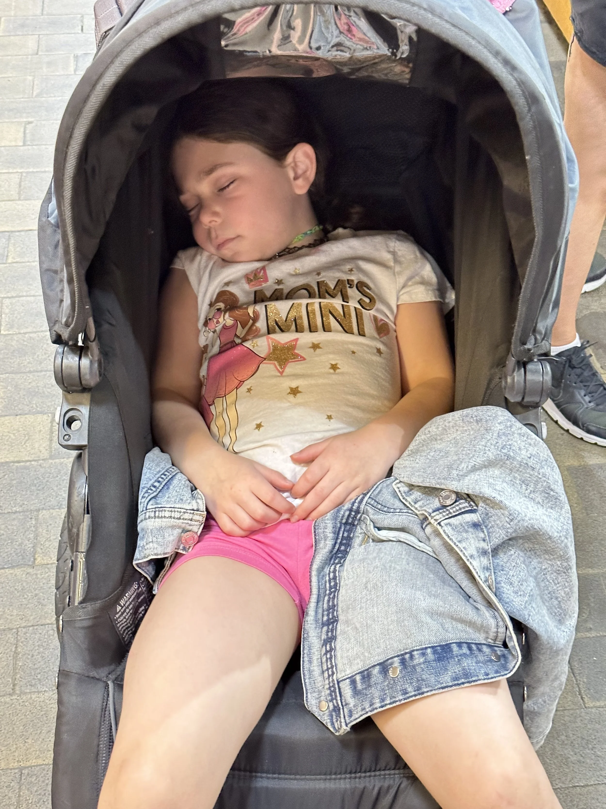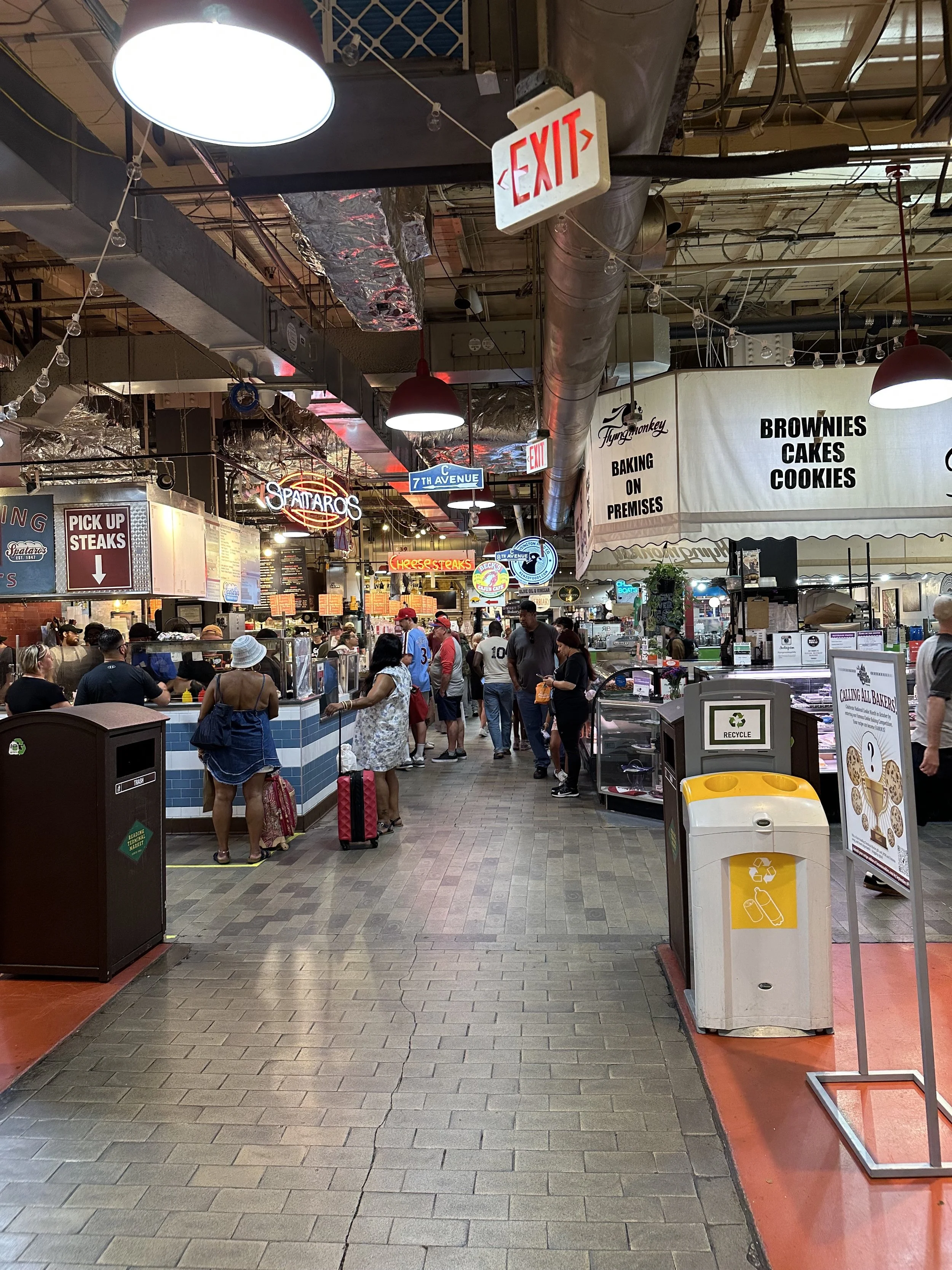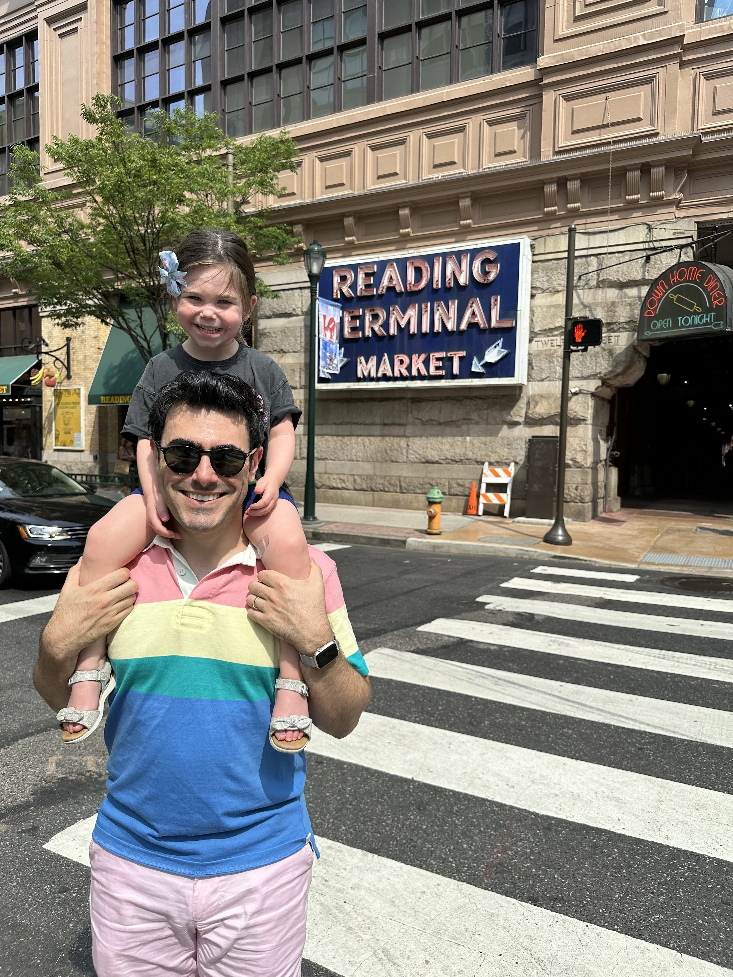 After lunch we walked to Reading Terminal Market, a famous Philly food market. Hallie was so tired she insisted on being in the stroller, so Tzvi carried Madeleine on his shoulders for about a mile. Hallie ended up falling asleep and missing the market entirely. We didn’t buy anything, but Madeleine bought some candy. [Tzvi: All I really wanted was a soft pretzel from the pretzel vendor the hotel recommended. We walked by and saw the pretzels, and *someone* said we should see the rest of the market and then circle back, but by the time we got back they had run out. That was sad.]