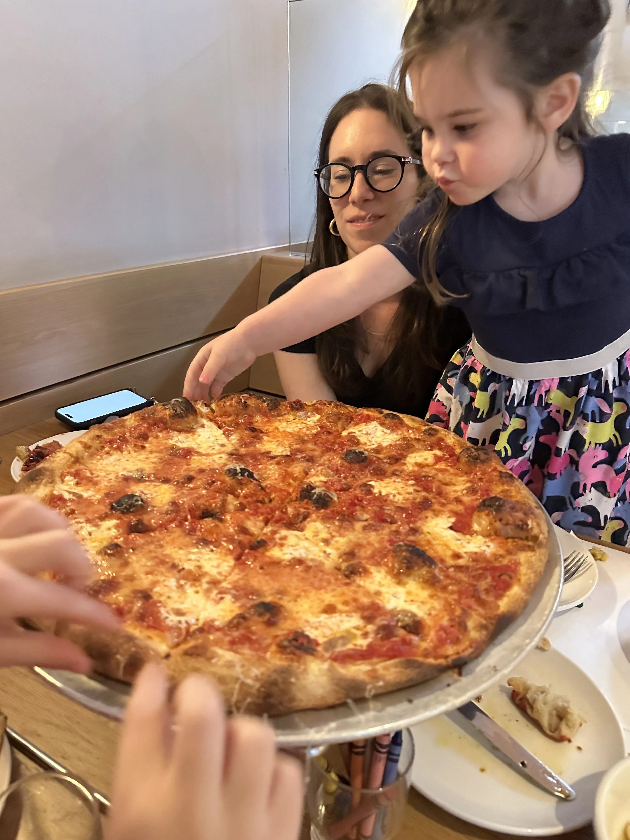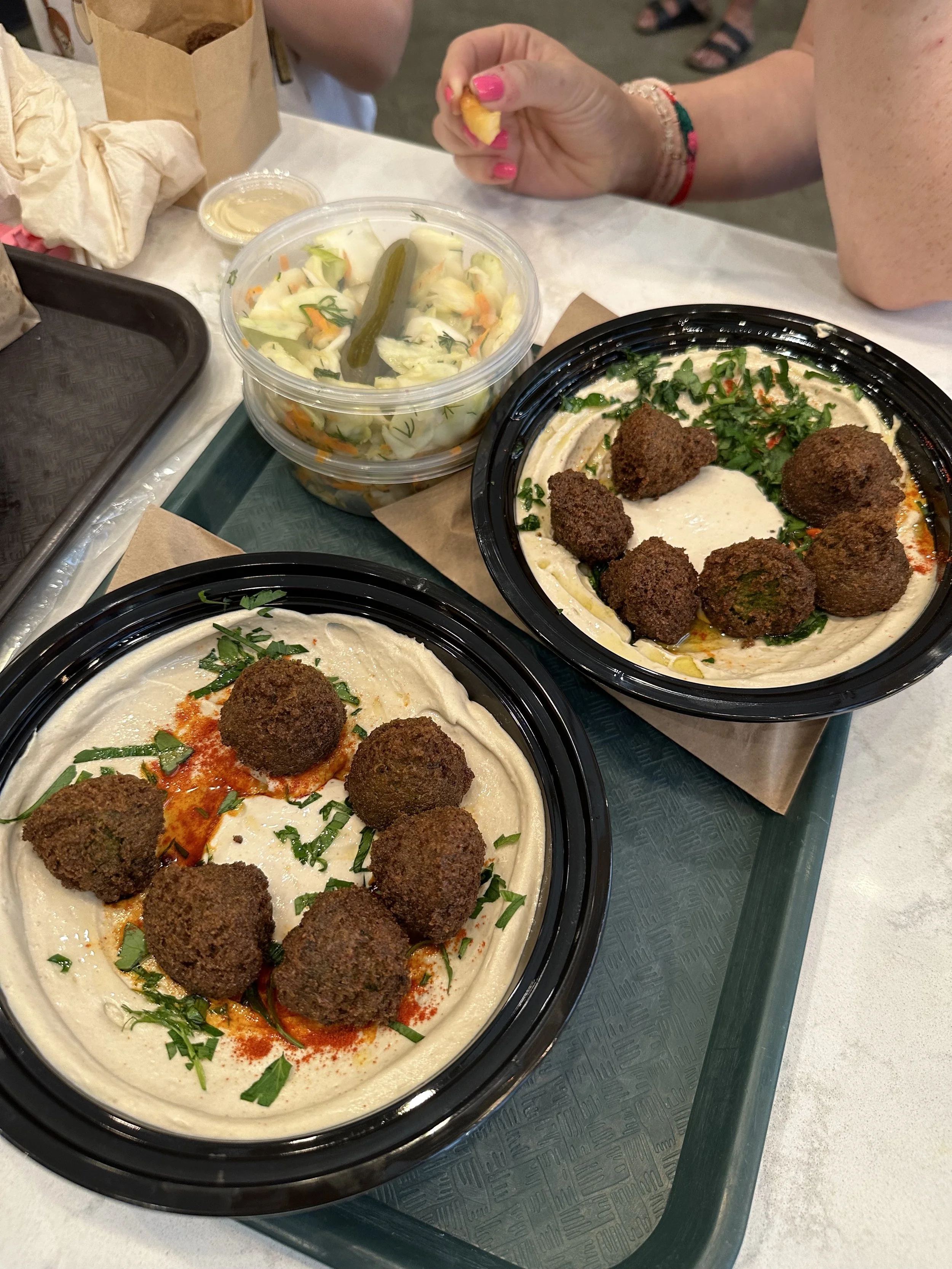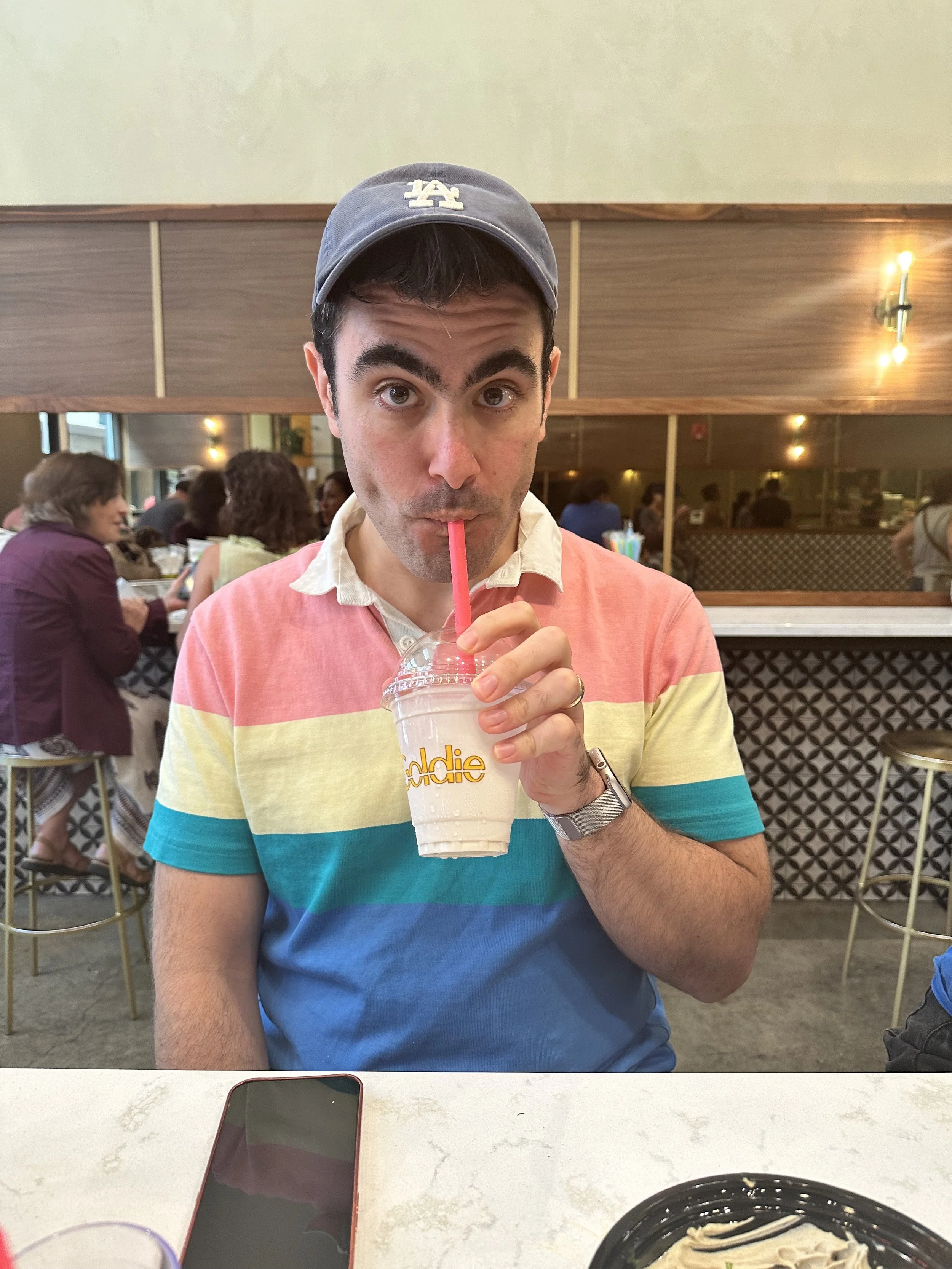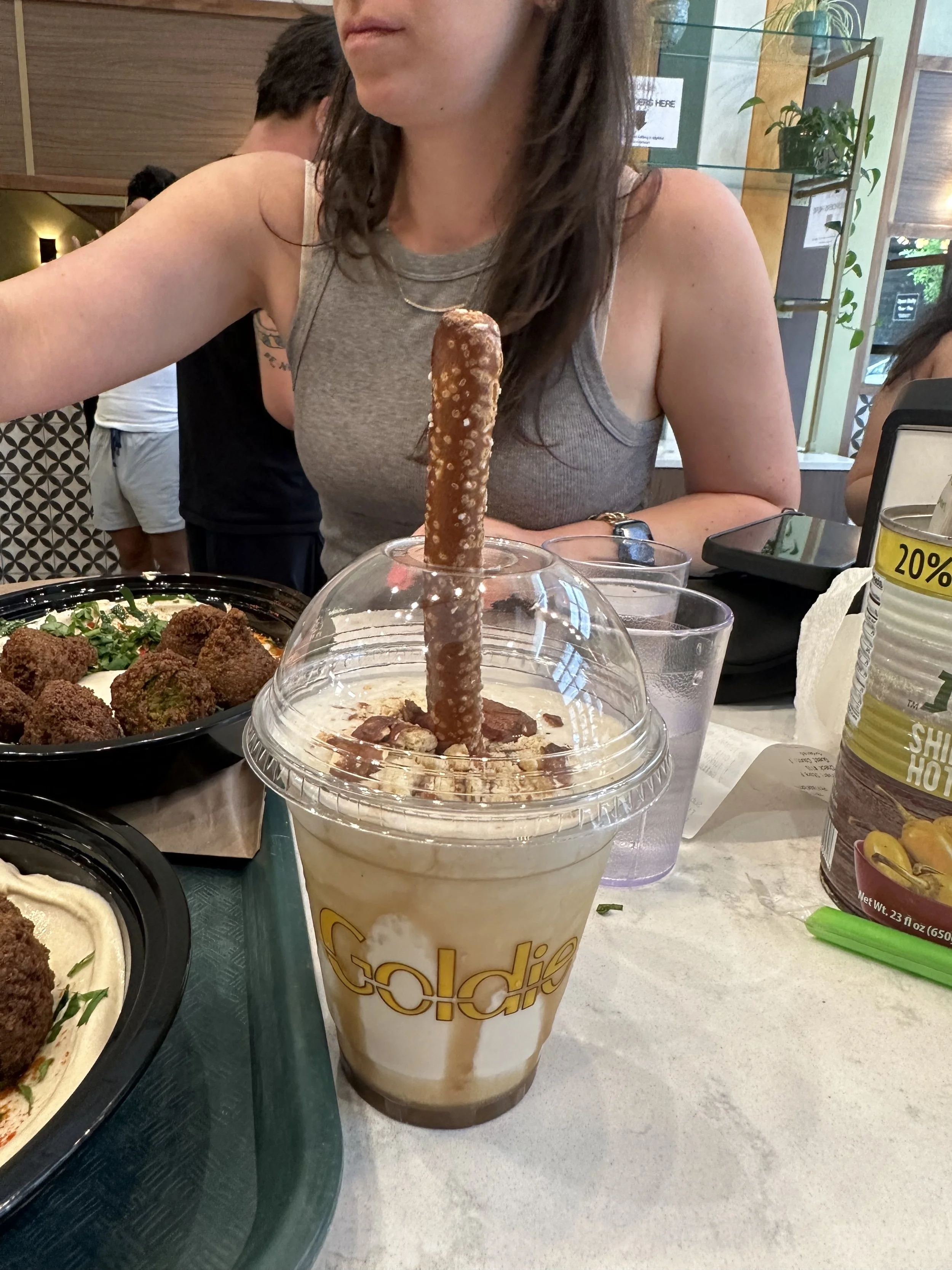When we were done, we Ubered to Goldie, the Michael Solomonov falafel shop. All along the drive Madeleine was complaining she was so hungry and wanted to eat. As soon as we got to the restaurant she literally got in her stroller, closed her eyes and fell asleep. Lunch was delicious. We had hummus and falafel platters, pita, and techina milkshakes. I think the best one was the salted caramel but Tzvi loved his coffee one. He also loved the plain one that we got to “share”, and yes, he did drink two whole milkshakes.