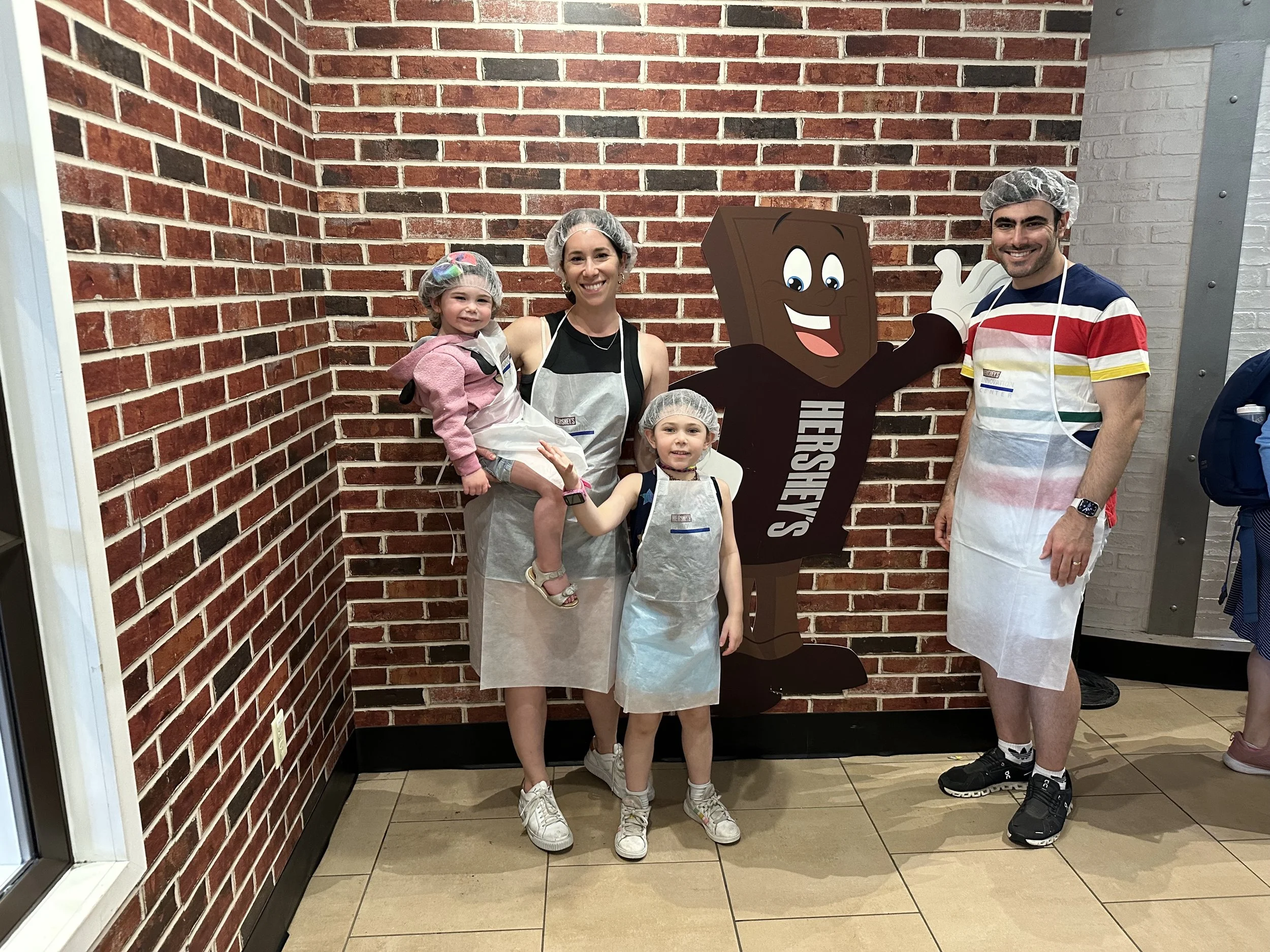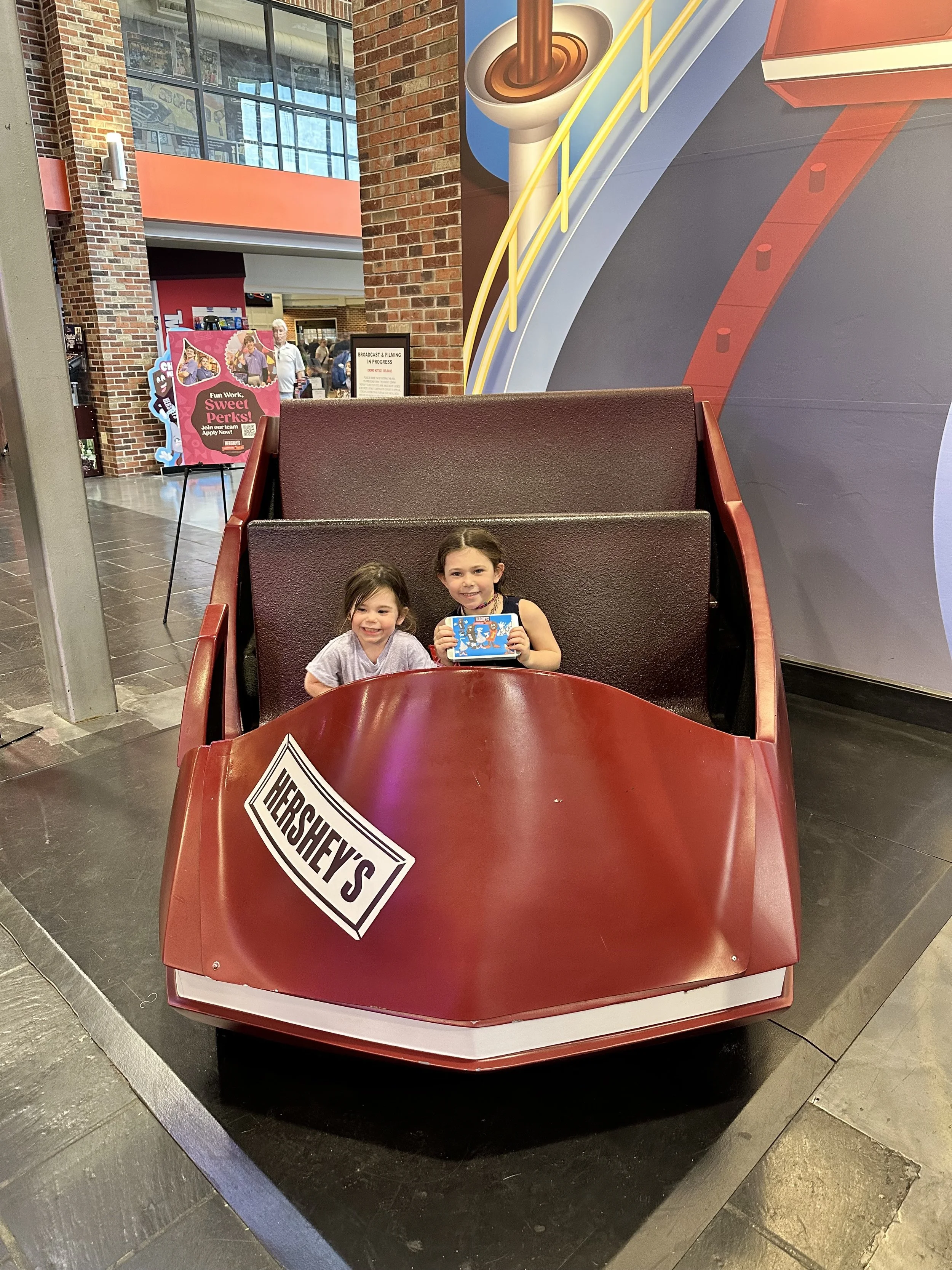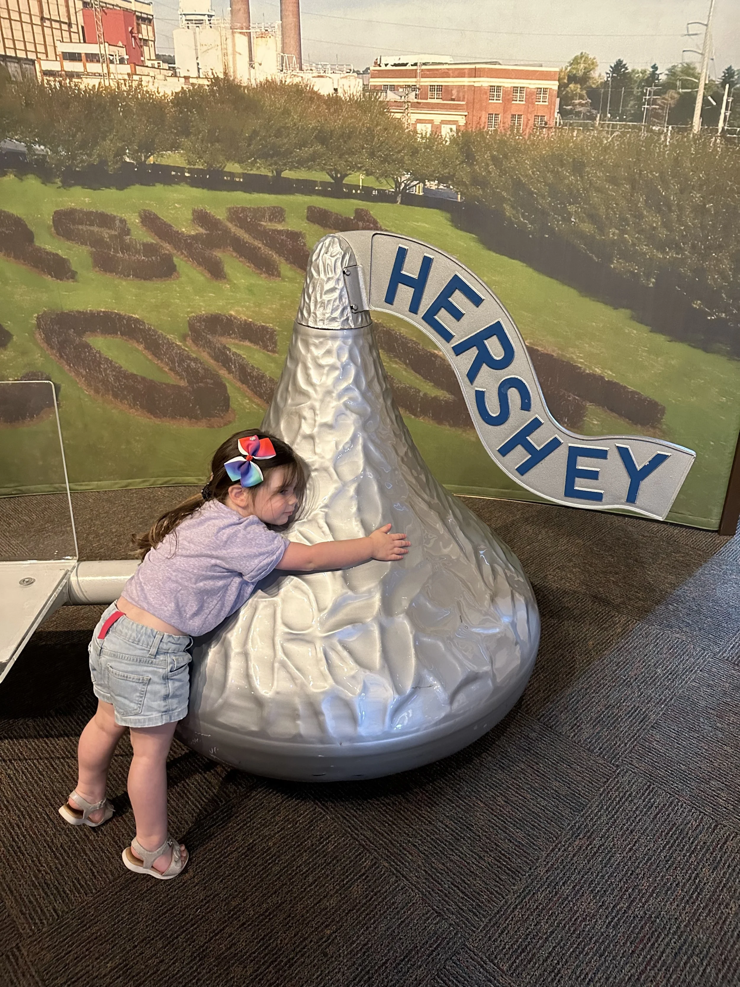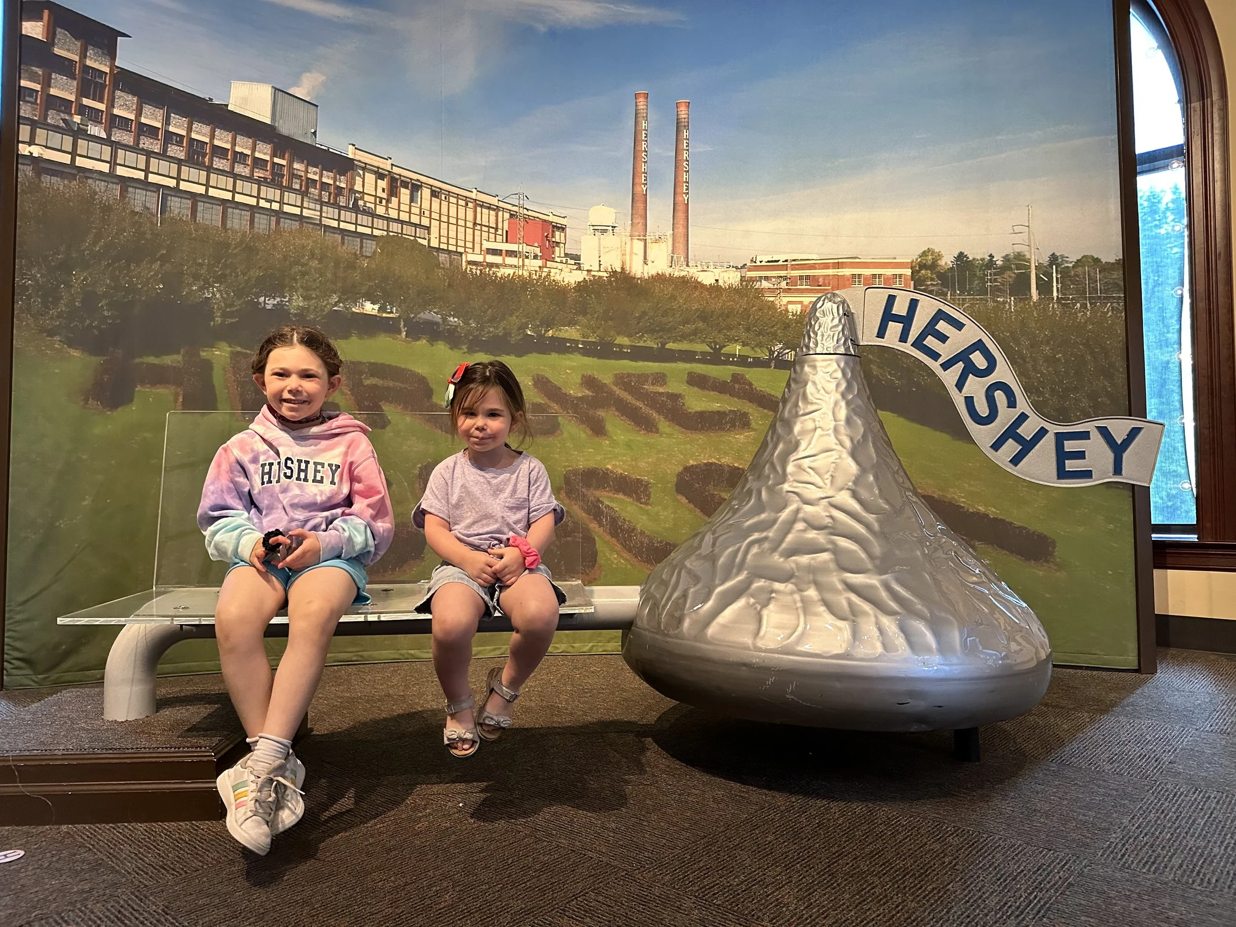 After breakfast we left the hotel and went to the Hershey Story Museum. It’s a great museum and the tickets were included in our hotel stay. We spent about an hour walking around and learning about Milton Hershey and the history of the company. We learned a bunch of interesting things, like the fact that Hershey started out making caramels before he got into chocolates; he sold the caramel business for $1 million so he could buy chocolate making equipment. Before Hershey, chocolate was expensive and more of a luxury. His goal was to make chocolates accessible to everyone. We also learned that he had purchased the Reese’s company from Harry Reese in the 1960s. Hershey was friendly with Reese, who originally worked at the Hershey dairy farm, but saw what Hershey was doing and figured he could do it too. There was also a cute scavenger hunt for the kids, but at the end they just got a sticker, which was surprising because you’d think the prize would be chocolate. The man giving out the scavenger hunt sheets at the entrance to the museum was a kind older man. That seems like it would be a good job for my dad when he retires.