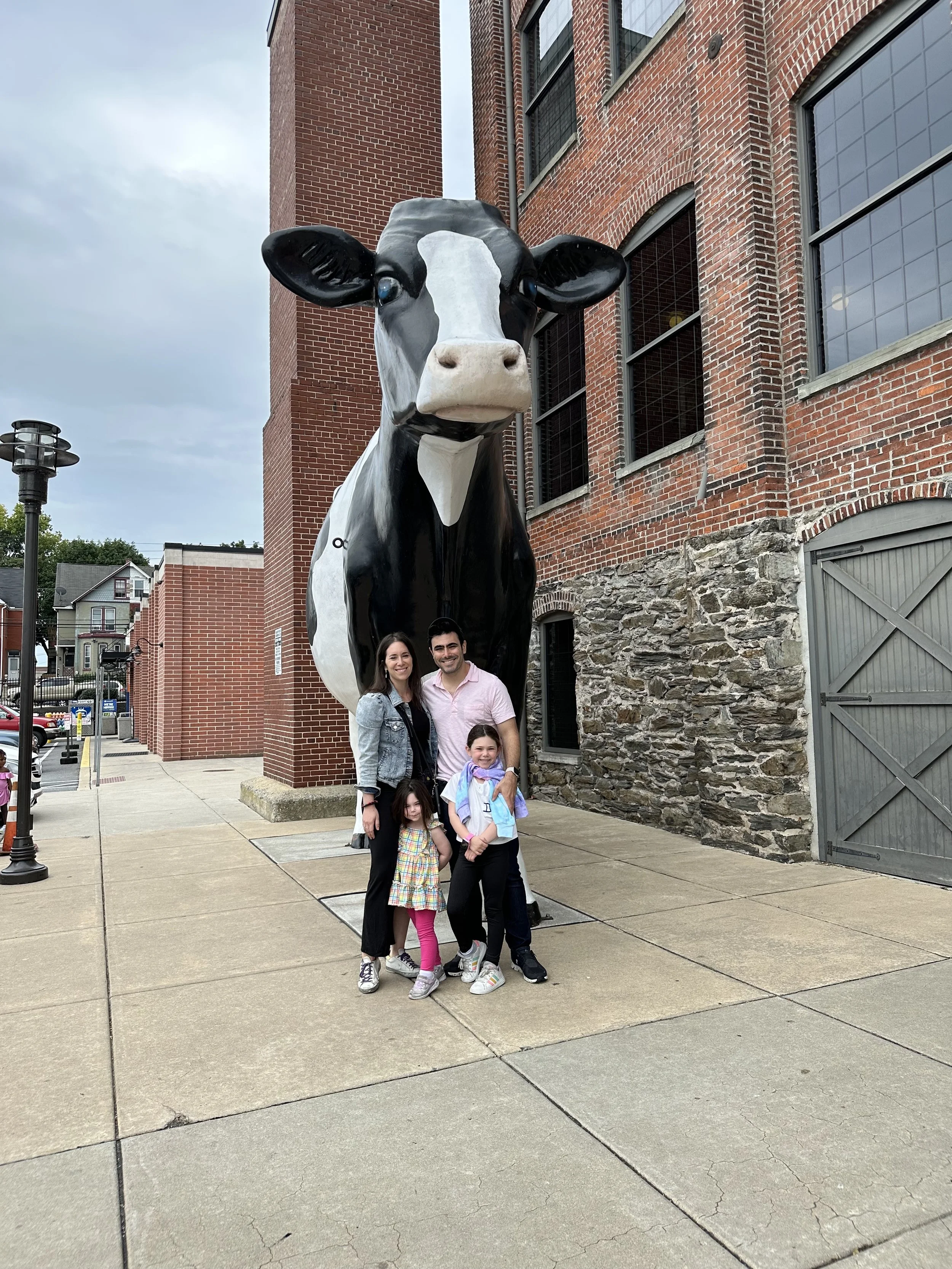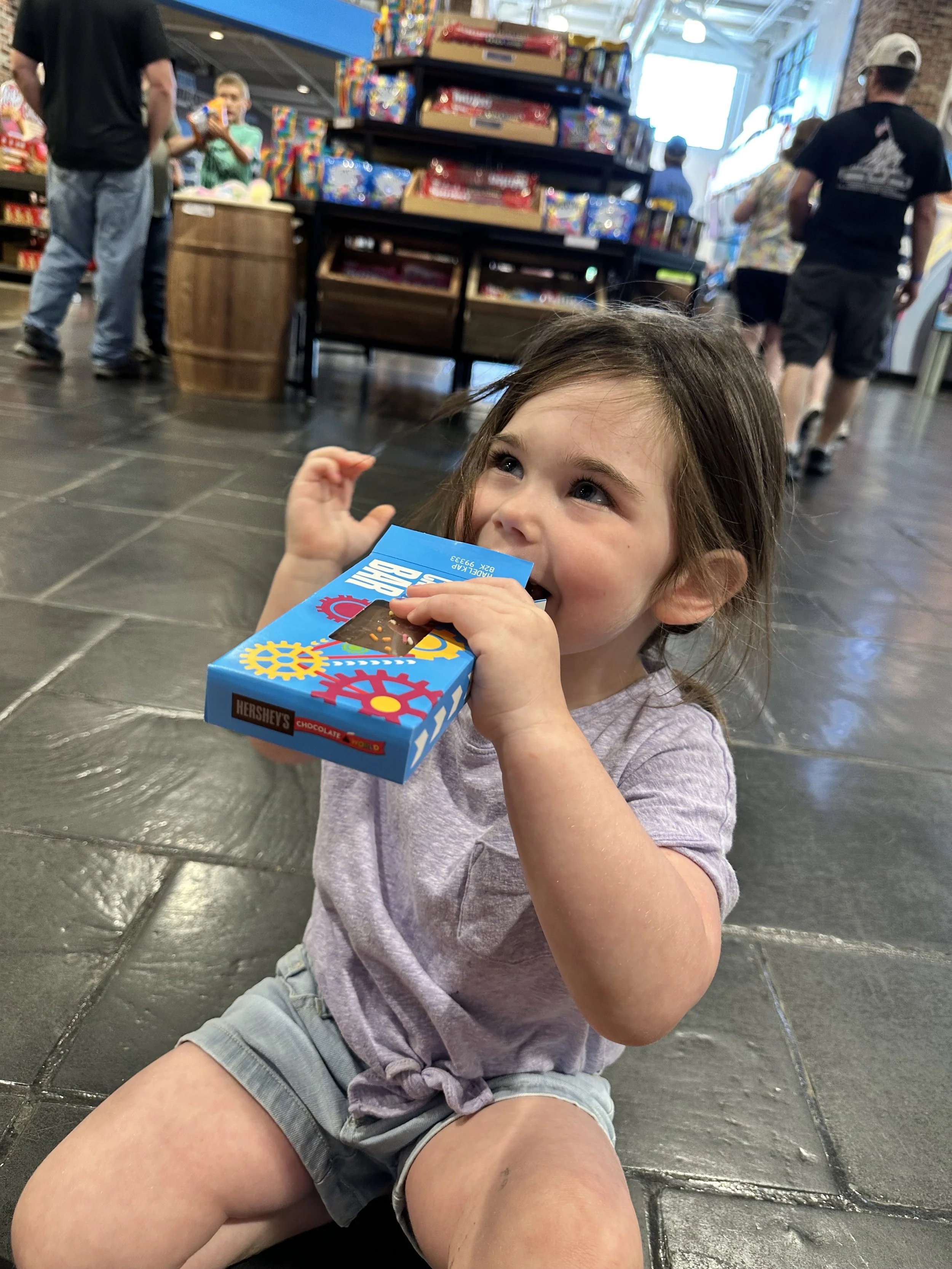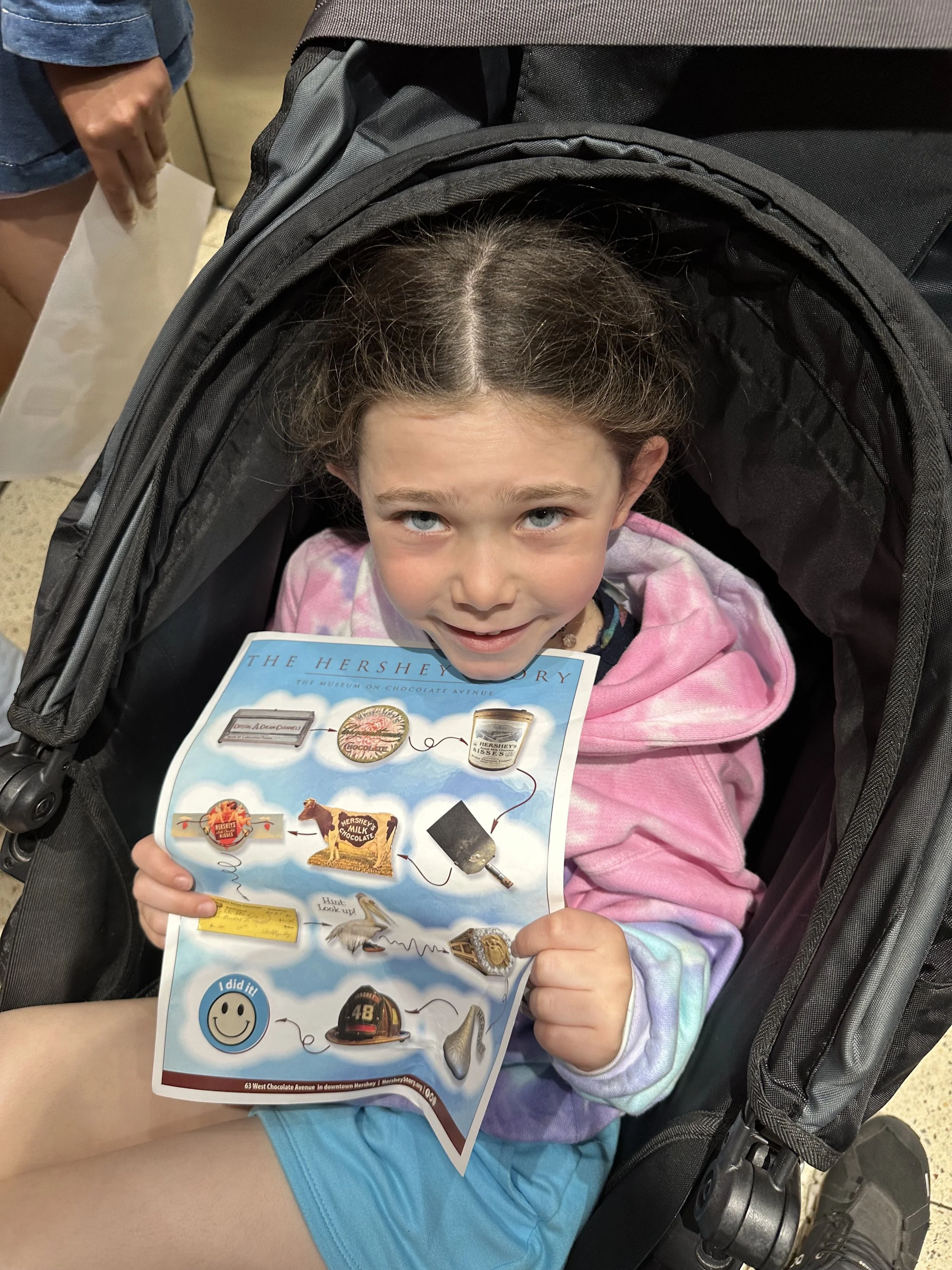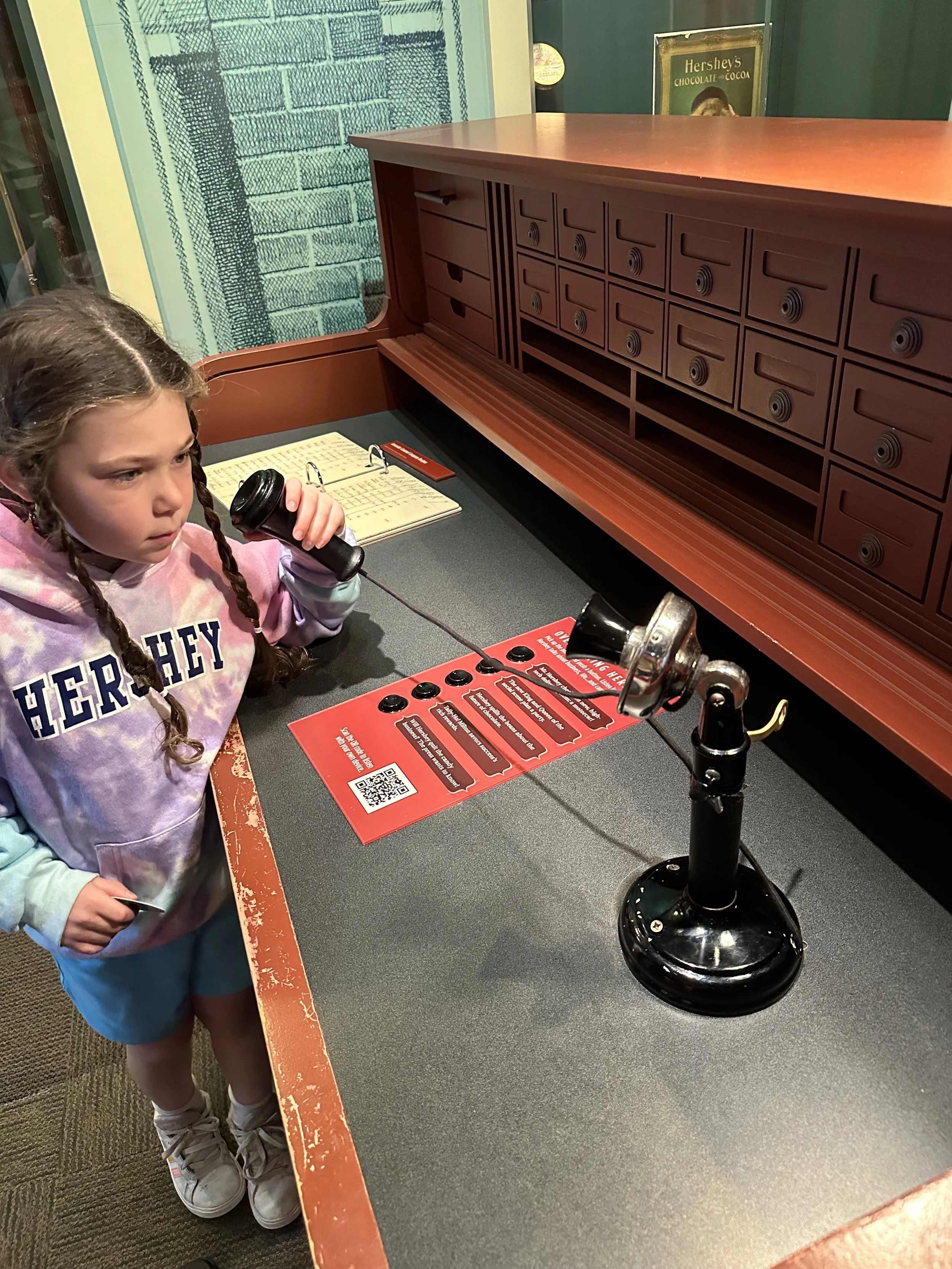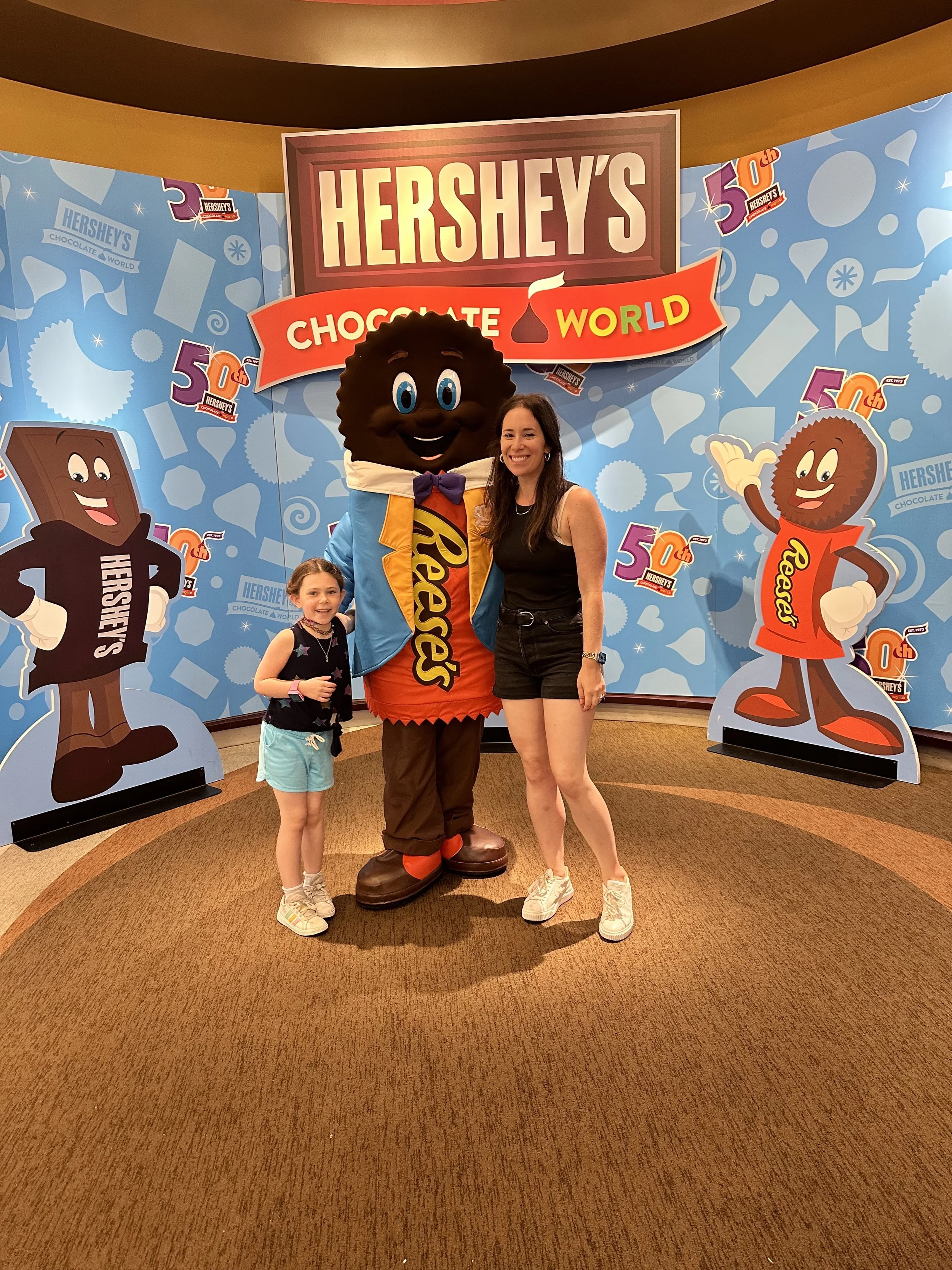 After breakfast we left the hotel and went to the Hershey Story Museum. It’s a great museum and the tickets were included in our hotel stay. We spent about an hour walking around and learning about Milton Hershey and the history of the company. We learned a bunch of interesting things, like the fact that Hershey started out making caramels before he got into chocolates; he sold the caramel business for $1 million so he could buy chocolate making equipment. Before Hershey, chocolate was expensive and more of a luxury. His goal was to make chocolates accessible to everyone. We also learned that he had purchased the Reese’s company from Harry Reese in the 1960s. Hershey was friendly with Reese, who originally worked at the Hershey dairy farm, but saw what Hershey was doing and figured he could do it too. There was also a cute scavenger hunt for the kids, but at the end they just got a sticker, which was surprising because you’d think the prize would be chocolate. The man giving out the scavenger hunt sheets at the entrance to the museum was a kind older man. That seems like it would be a good job for my dad when he retires.
