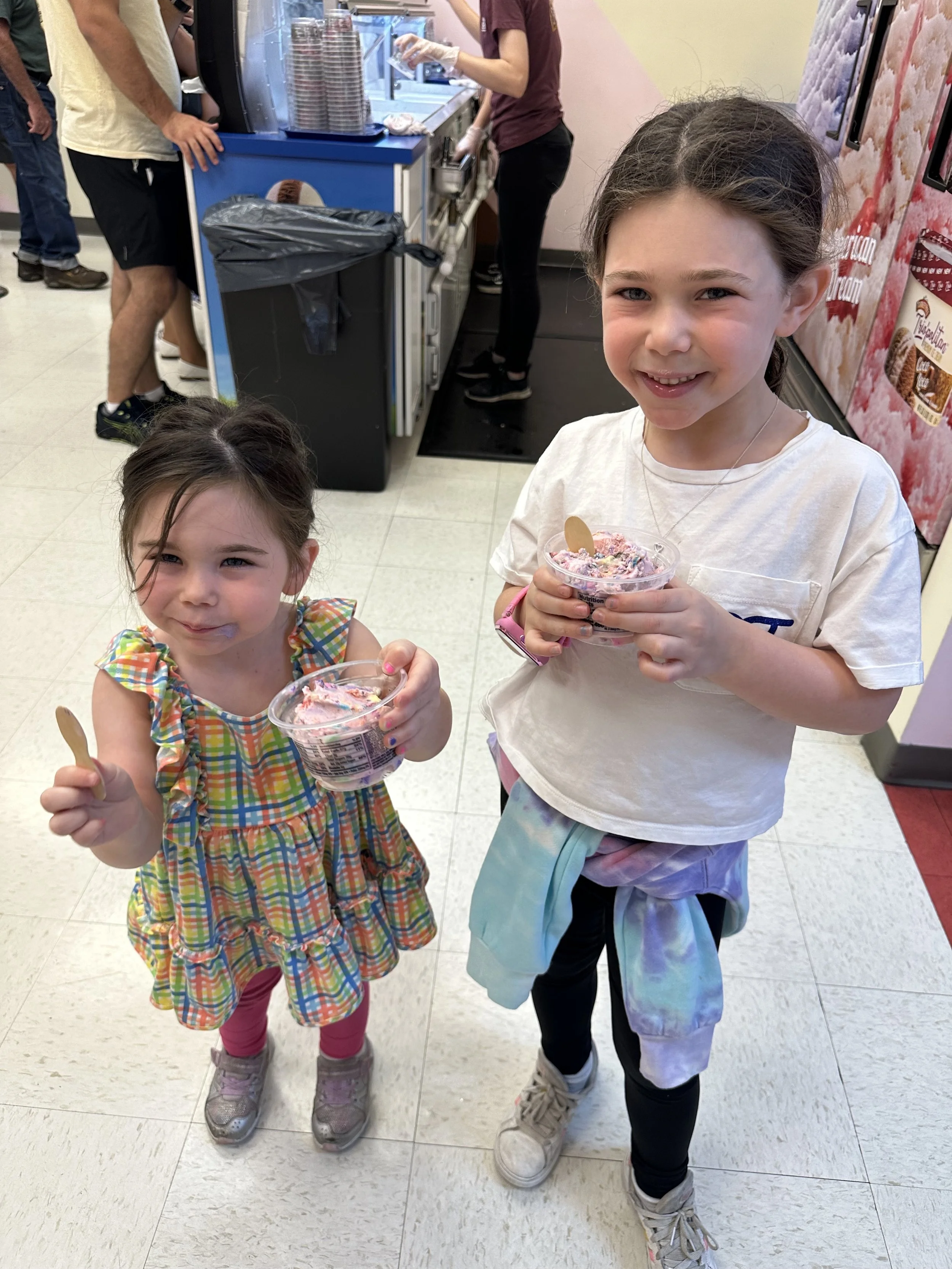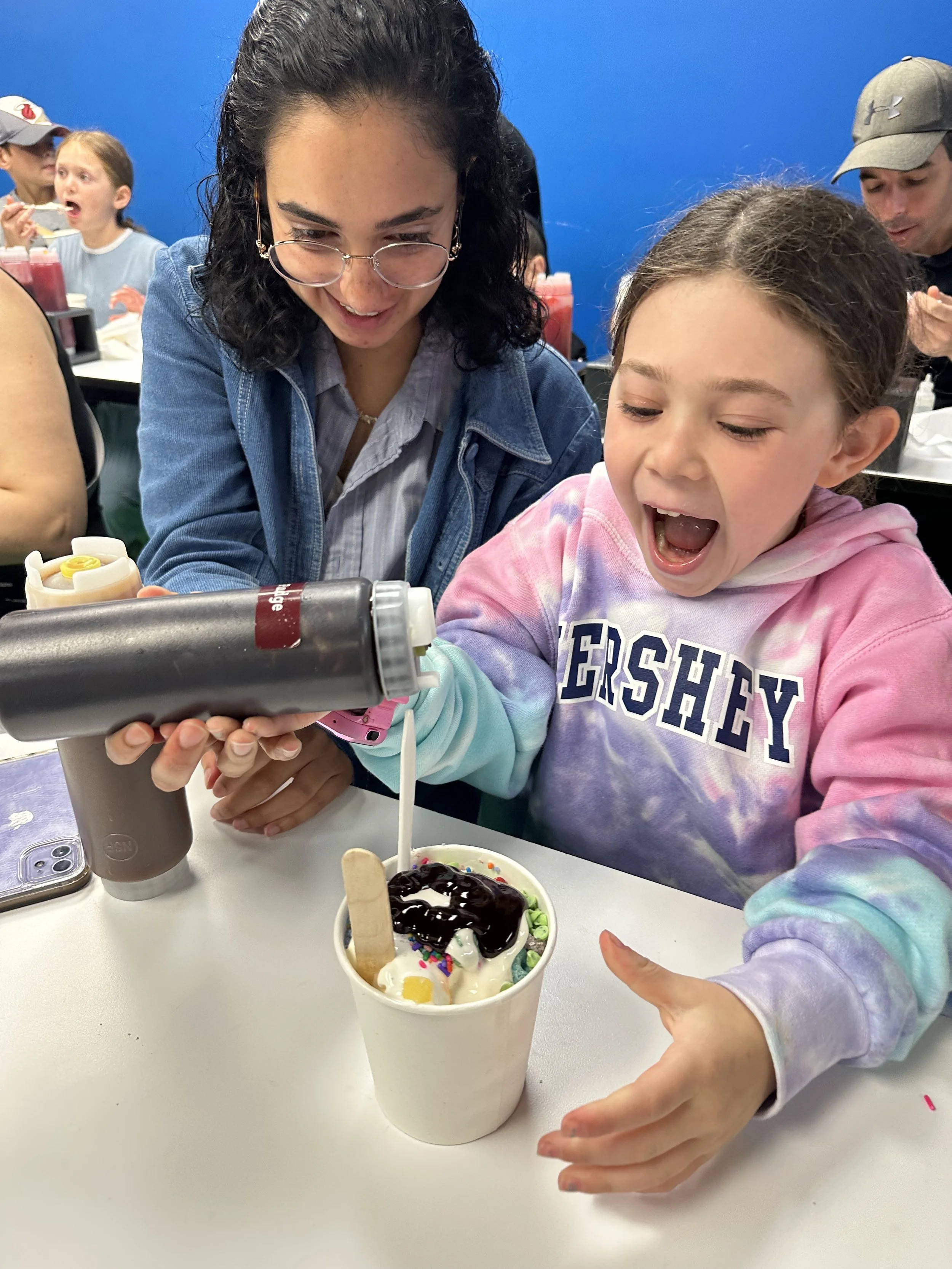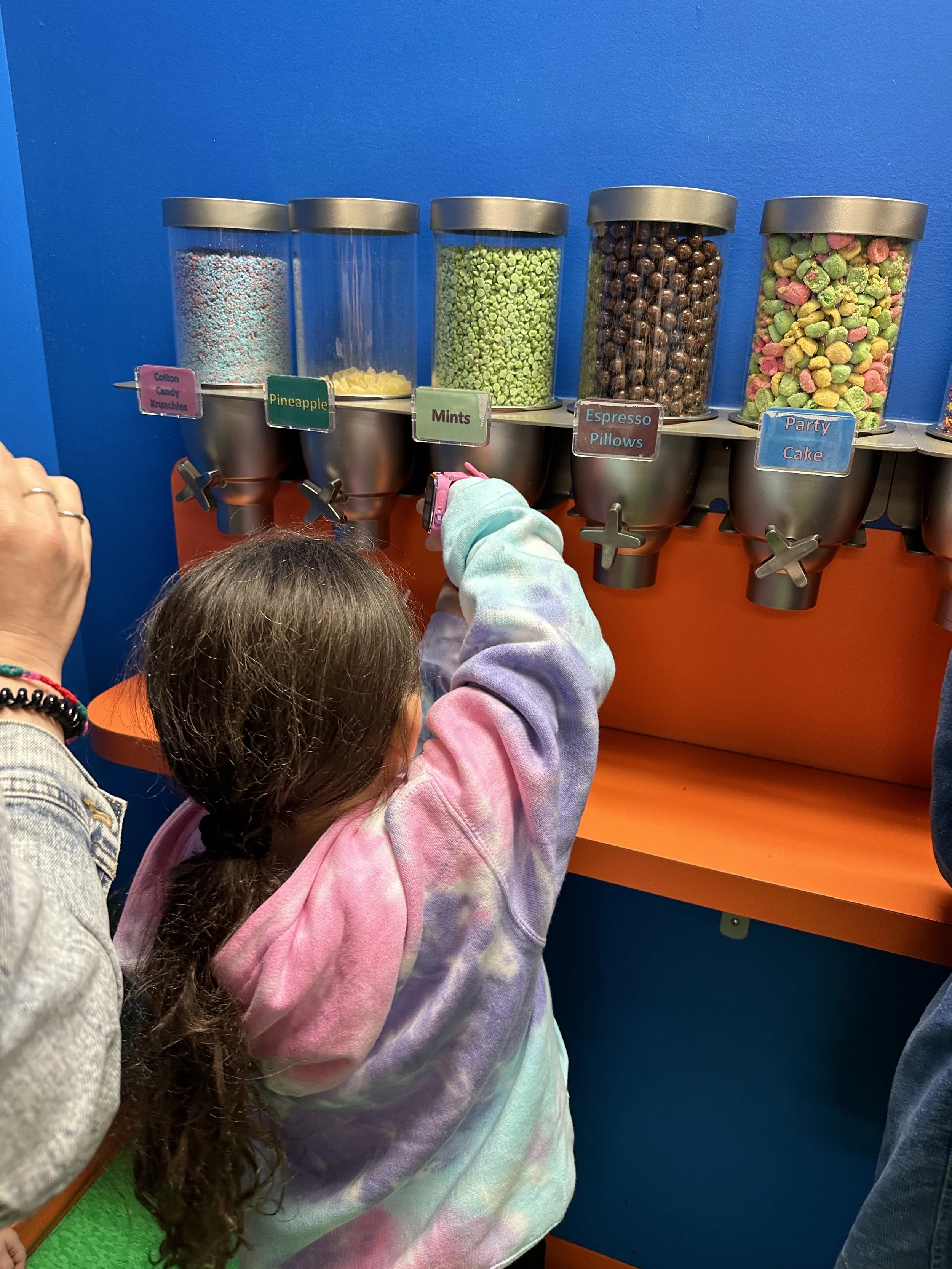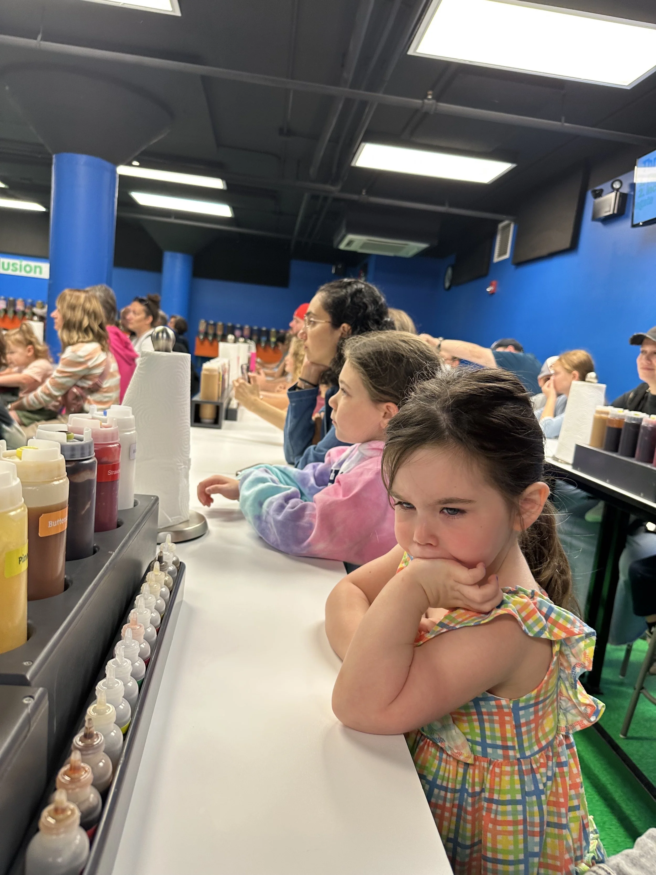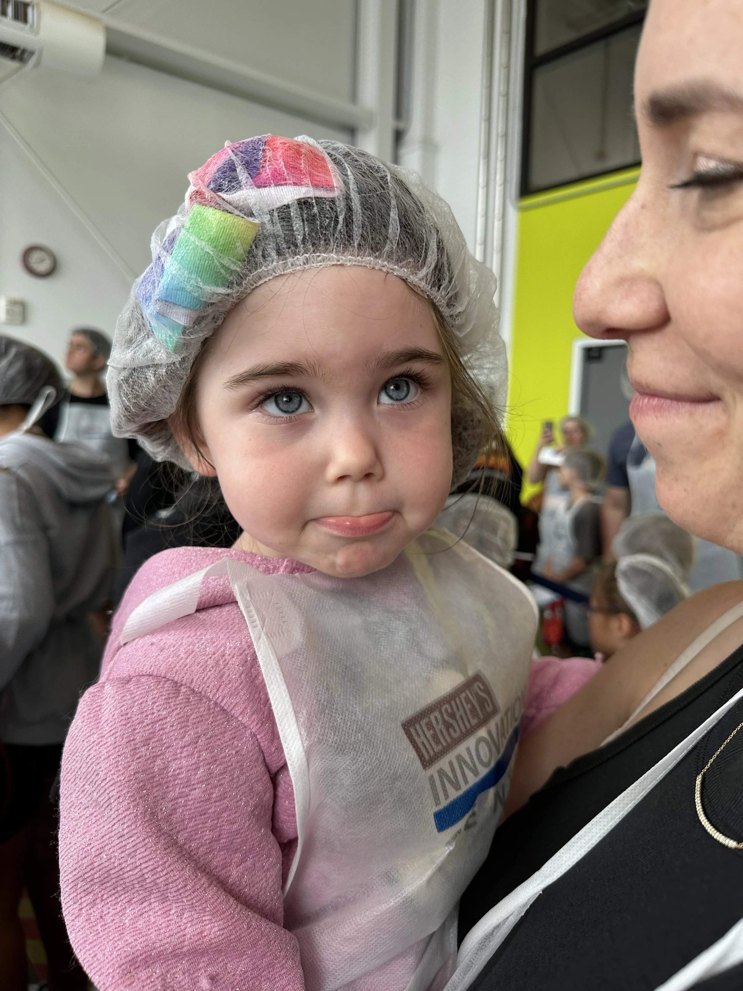 We started the walk-through but stopped mid-way for our 11:15 make-your-own ice cream class. We had to pay extra for this one. Basically they bring you into a classroom where they teach you about the flavoring process. I should mention once again the tour was full of Jews. Anyway, they give you a cup of ice cream, probably a sweet cream kind of flavor. Then in front of you are 10 or so different flavor extracts including coffee, maple, lemon, cotton candy, etc. You can try all of them and then decide what to put in your ice cream. Then you go to the wall of “Inclusions,” which are mix-ins, and take whichever you want. So basically it’s a very expensive make your own Hewlee situation. I succumbed to my lack of willpower and just got all the mix-ins (except for chocolate covered coffee beans because I forgot about them and I still regret it). Tzvi made a more normal flavor which was maple coffee with waffle cone. The kids obviously went overboard. After we were done and stuffed with our own ice cream we went to the upstairs tasting room for more ice cream. I tasted a graham cracker flavor which had chocolate covered marshmallows. It was delicious. Tzvi had cookies and cream and they actually opened up a new tub for him which was nice. When we were done we visited the gift shop and purchased bowls that will likely collect dust. Overall, a good stop.