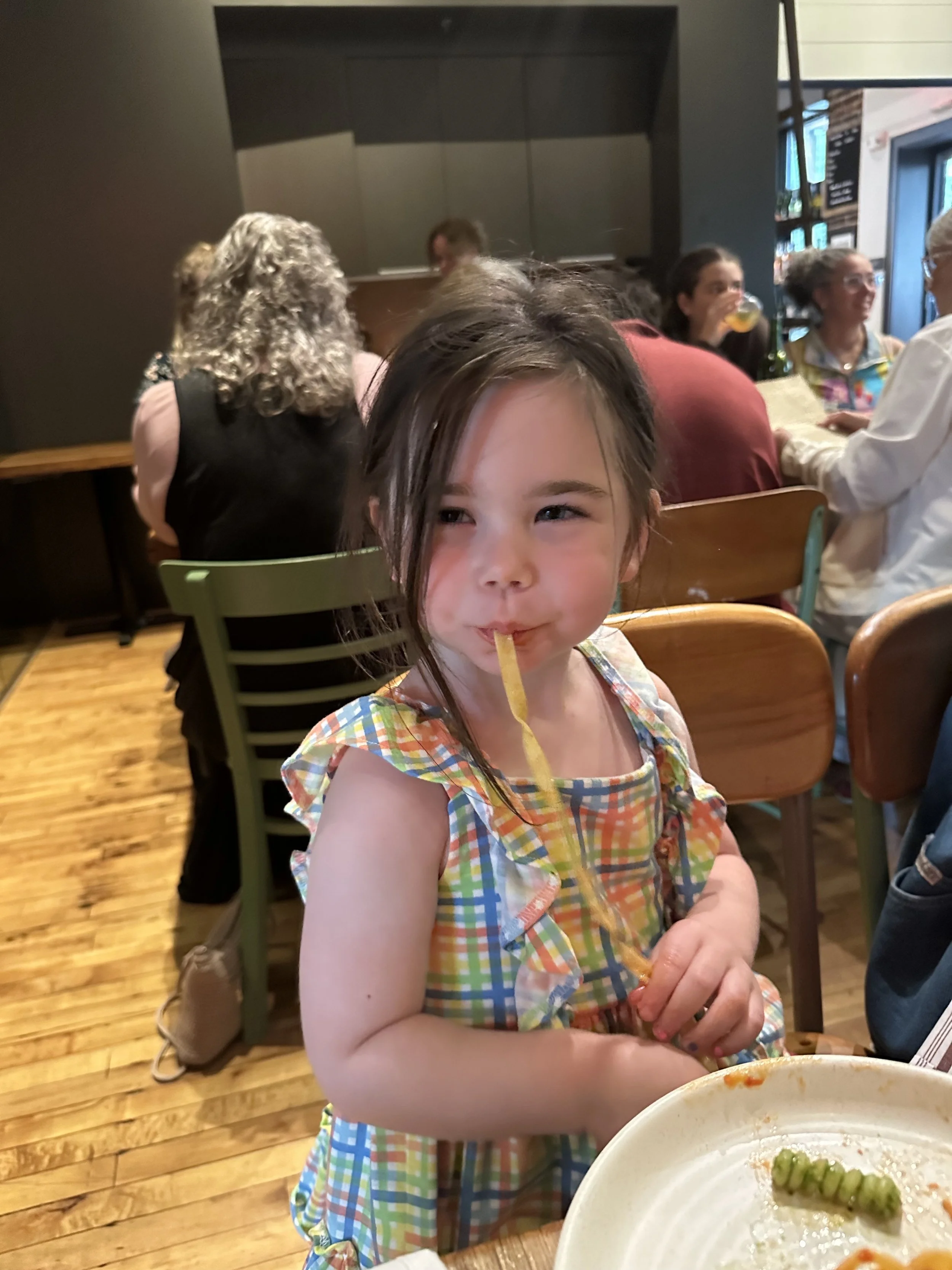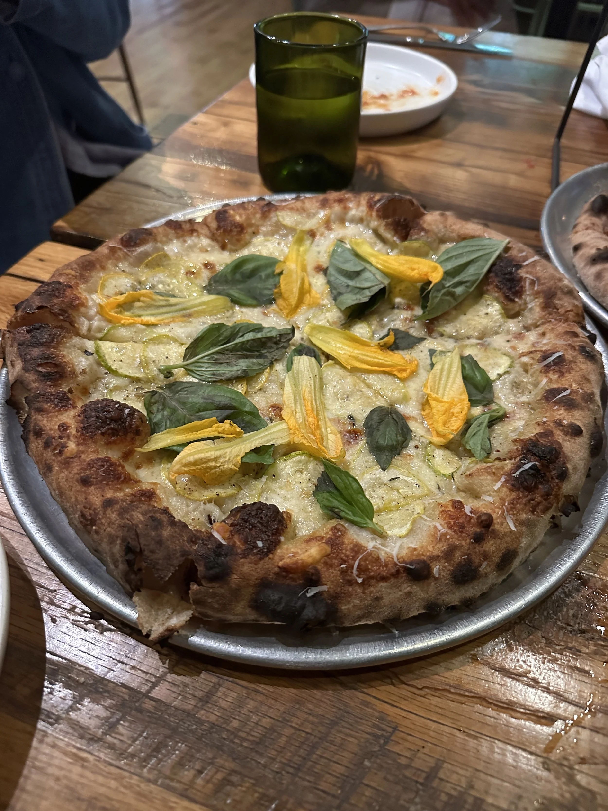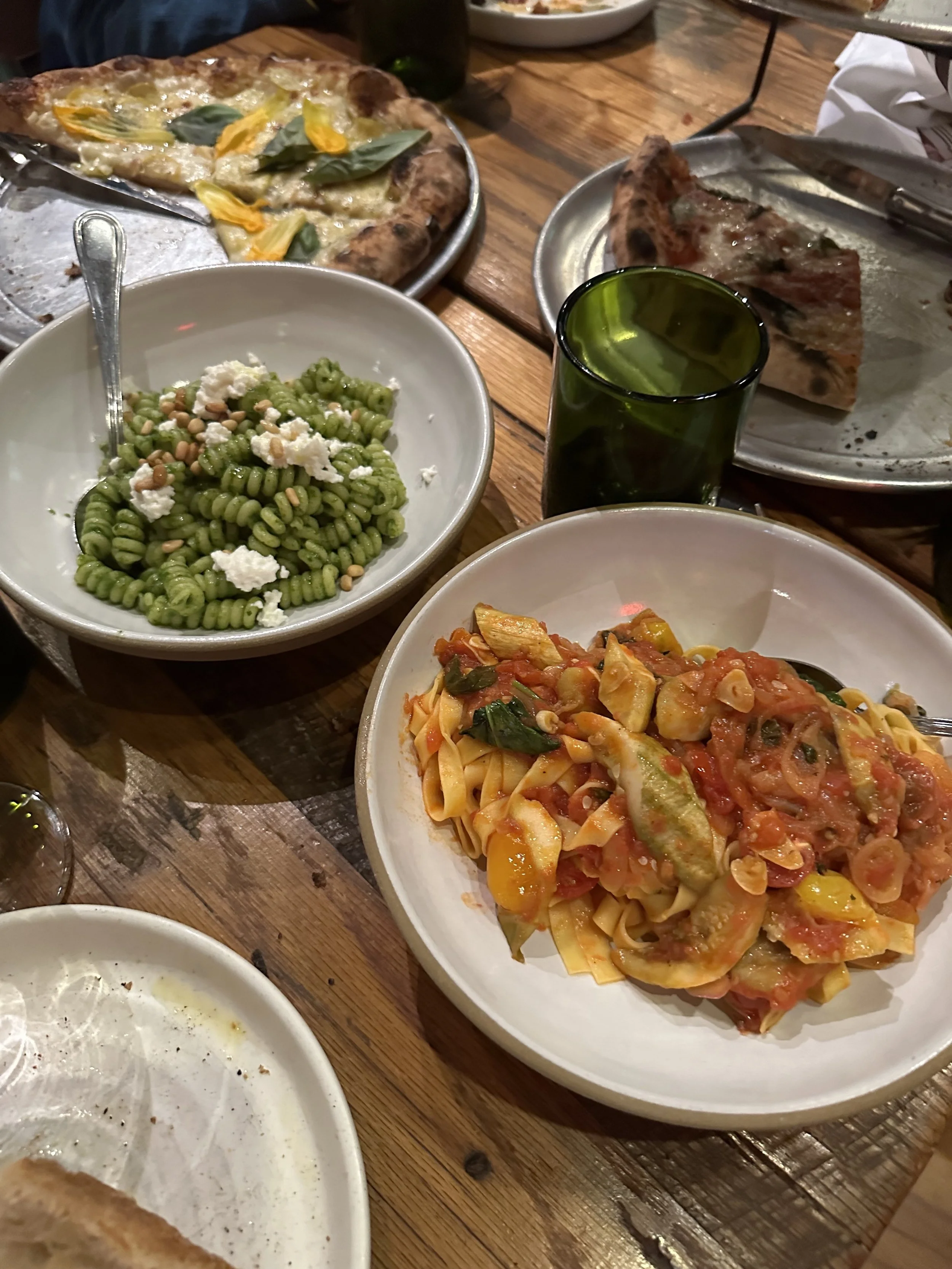 We didn’t have a real lunch. I had brought sandwiches that I made that morning, but by 5pm people were hungry and cranky. We drove back to Lancaster (the closest city near the Farm/Turkey Hill and about a 40 minute drive from Hershey) for dinner at a restaurant called Luca. It was a pizza/pasta place. We had delicious fried squash blossoms that didn’t have cheese, which is rare. We had three pizzas (one margherita, one spicy tomato pie with hot honey and one white pie with zucchini) and two pastas, all of which were delicious. Madeleine was exhausted and cranky. Tzvi had a drink made with gin that had been fat-washed in olive oil, whatever that means, and had a dash of olive oil in it. [Tzvi: fat-washing is a process whereby you mix a spirit with a fat, chill it, then skim off the fat. What you’re left with is a spirit that has a different texture, usually softer. This was delicious.]