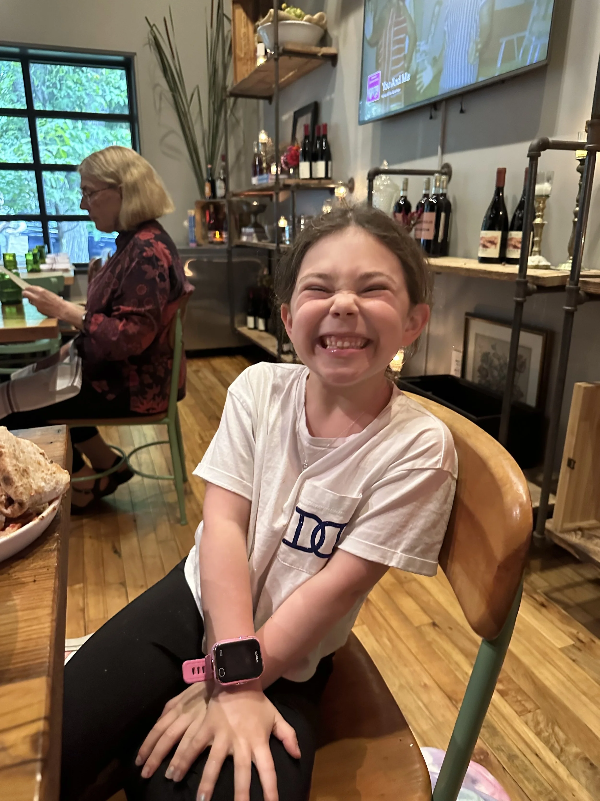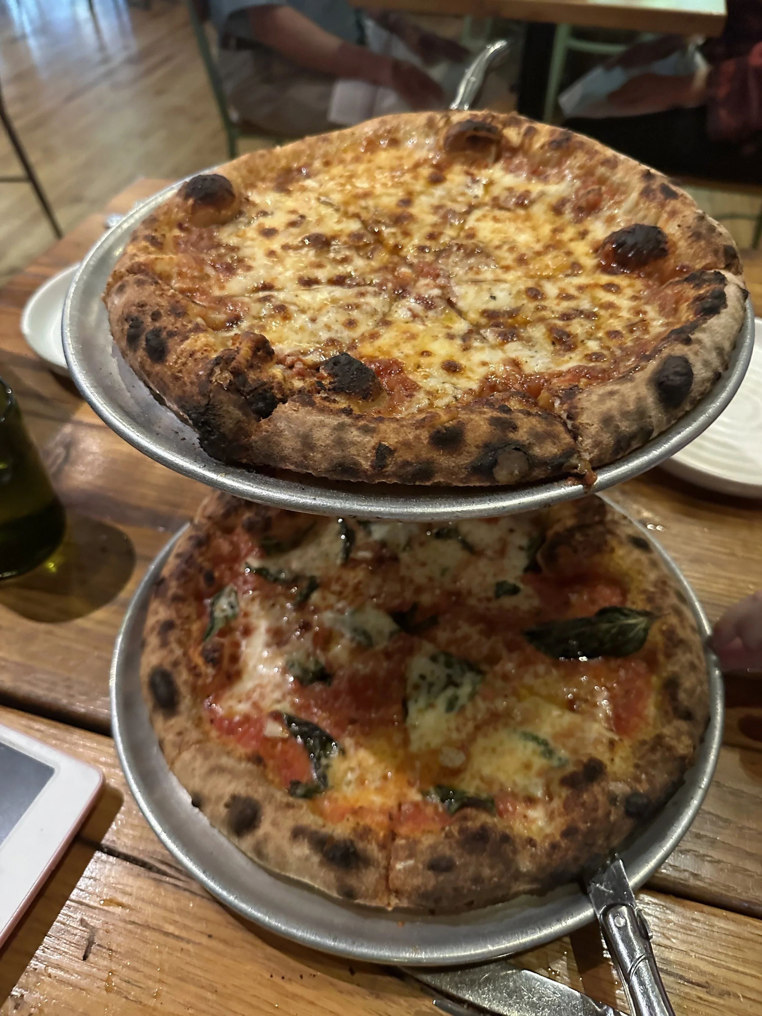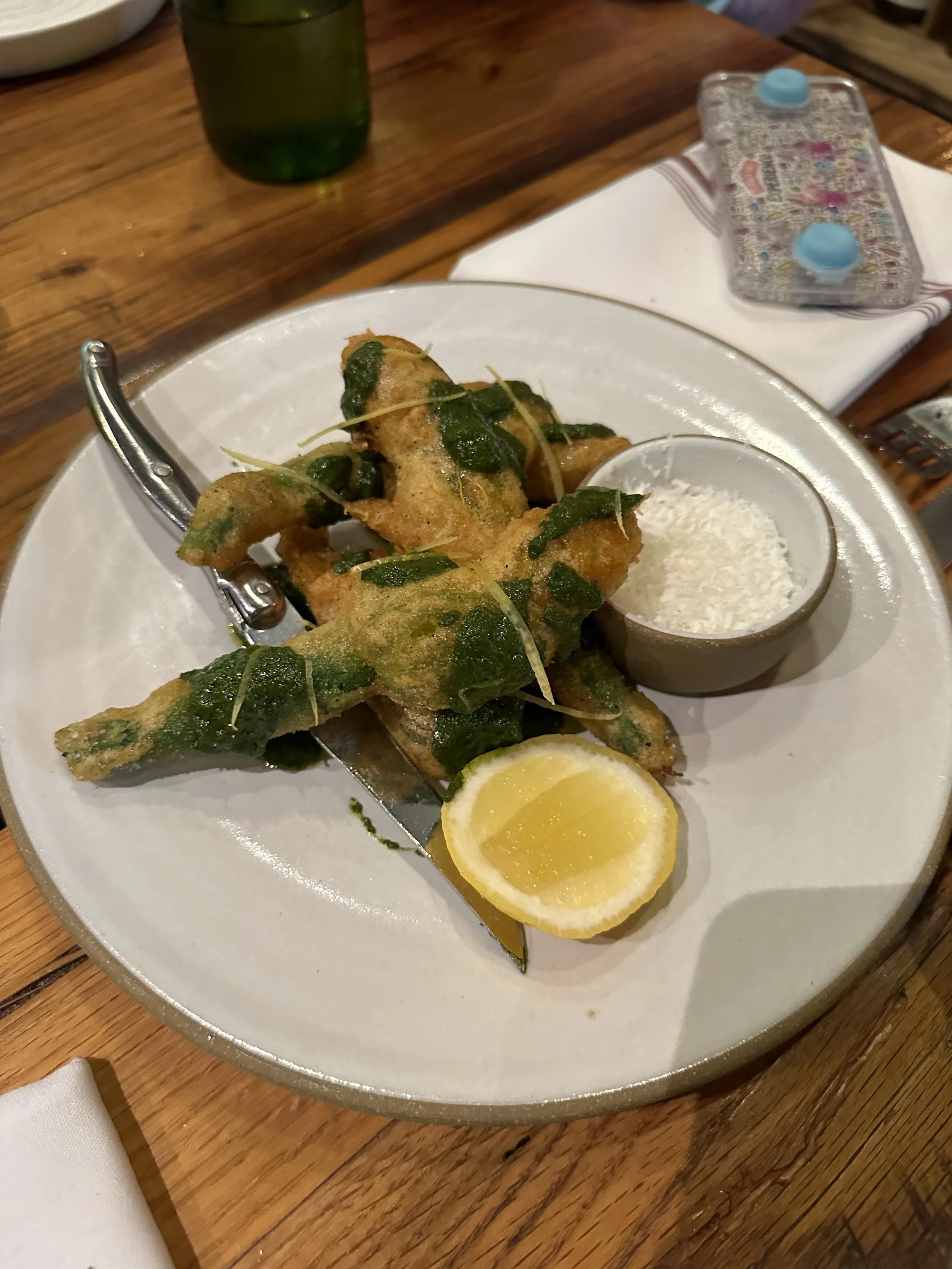 We didn’t have a real lunch. I had brought sandwiches that I made that morning, but by 5pm people were hungry and cranky. We drove back to Lancaster (the closest city near the Farm/Turkey Hill and about a 40 minute drive from Hershey) for dinner at a restaurant called Luca. It was a pizza/pasta place. We had delicious fried squash blossoms that didn’t have cheese, which is rare. We had three pizzas (one margherita, one spicy tomato pie with hot honey and one white pie with zucchini) and two pastas, all of which were delicious. Madeleine was exhausted and cranky. Tzvi had a drink made with gin that had been fat-washed in olive oil, whatever that means, and had a dash of olive oil in it. [Tzvi: fat-washing is a process whereby you mix a spirit with a fat, chill it, then skim off the fat. What you’re left with is a spirit that has a different texture, usually softer. This was delicious.]