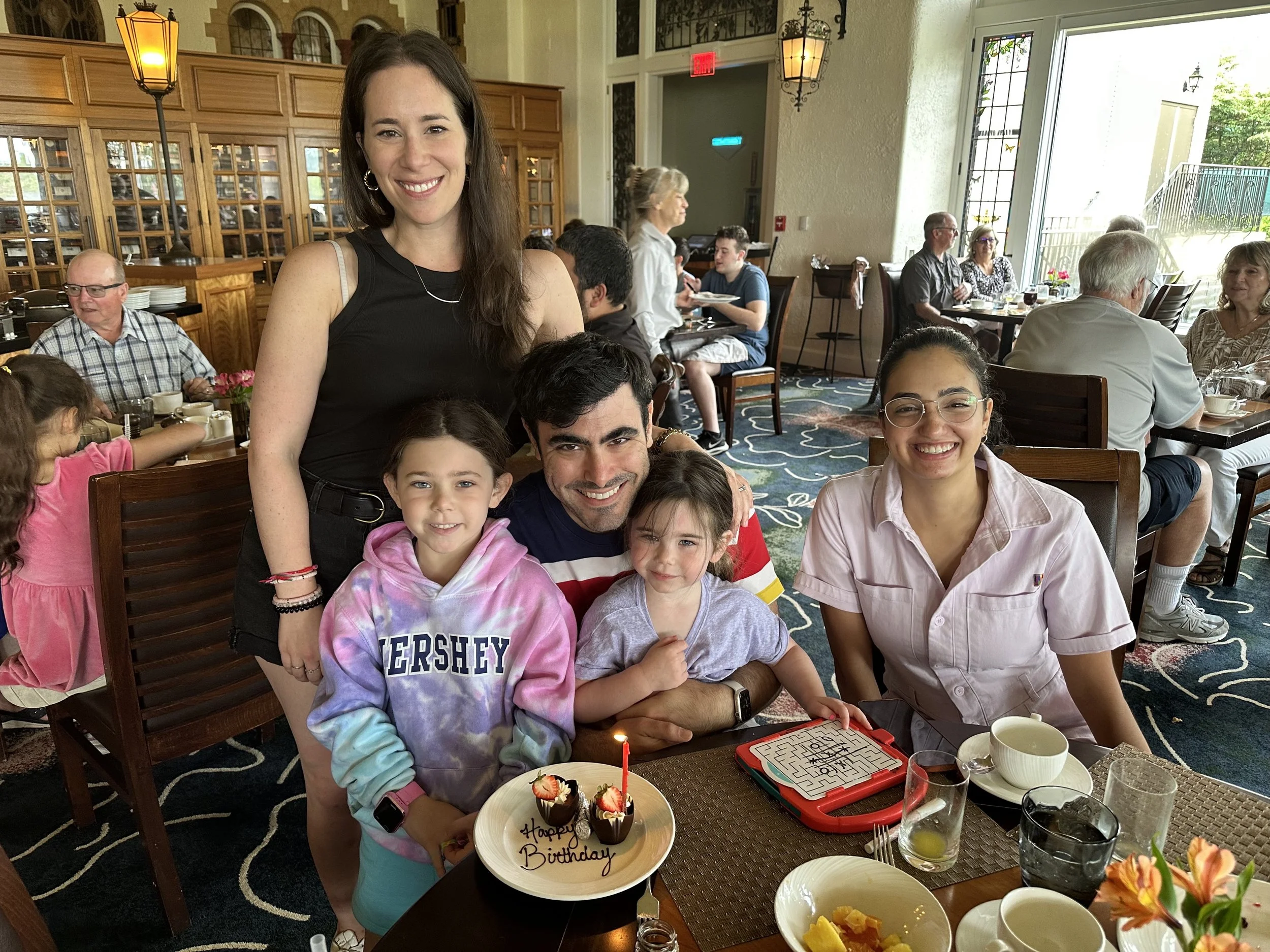Friday we got up and went to the Circular for breakfast, our first buffet breakfast at Hershey. The buffet is fine - the pastries aren’t great, they’re kind of like the mass produced pastries you typically get on a buffet. There was a very good omelet station though – they par cook the veggies, which is great. There was also a good pecan sticky bun. Our waitress was ridiculously nice, and she’s been working here for ten years. I don’t know how someone can be that nice, especially after dealing with annoying tourists for so many years. She was so friendly it was strange. We told them it was Tzvi’s birthday so they brought him a little chocolate thing with a candle.