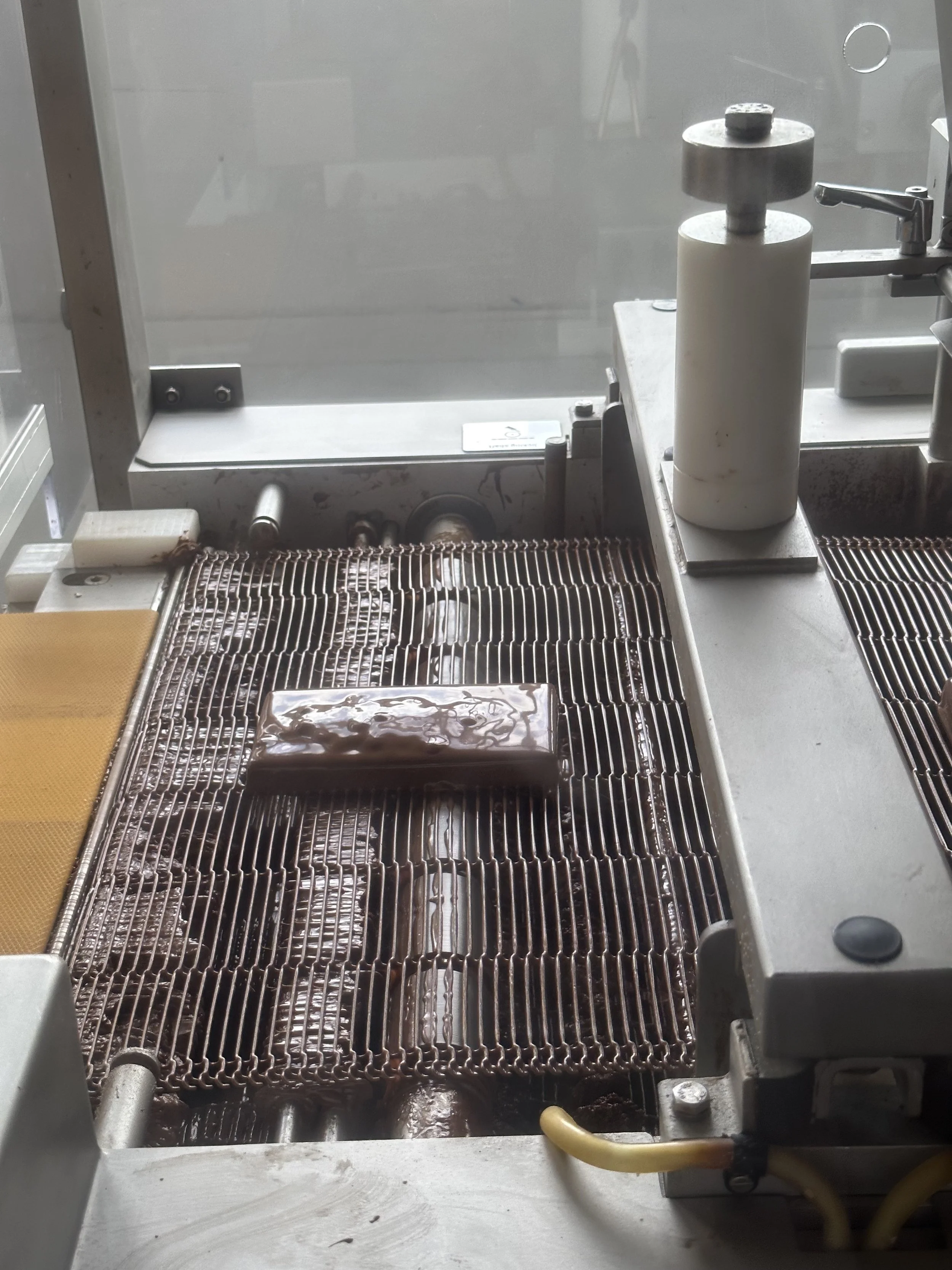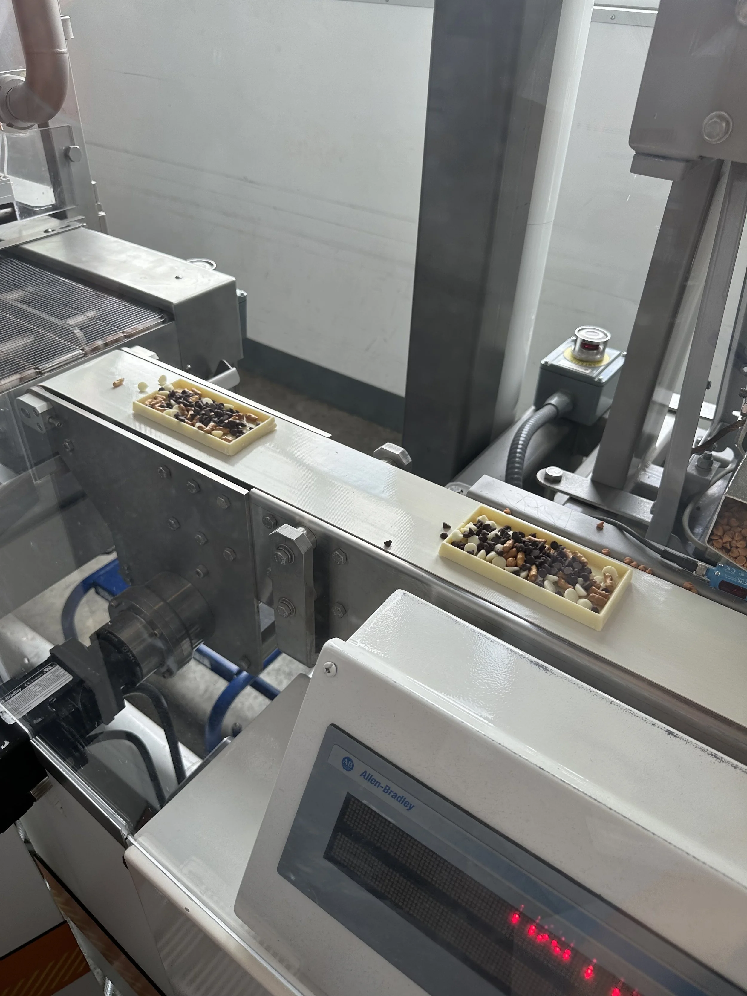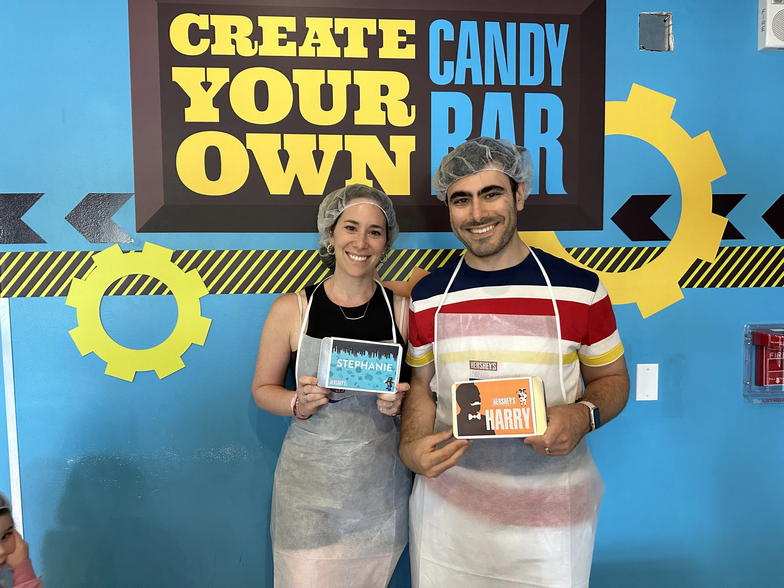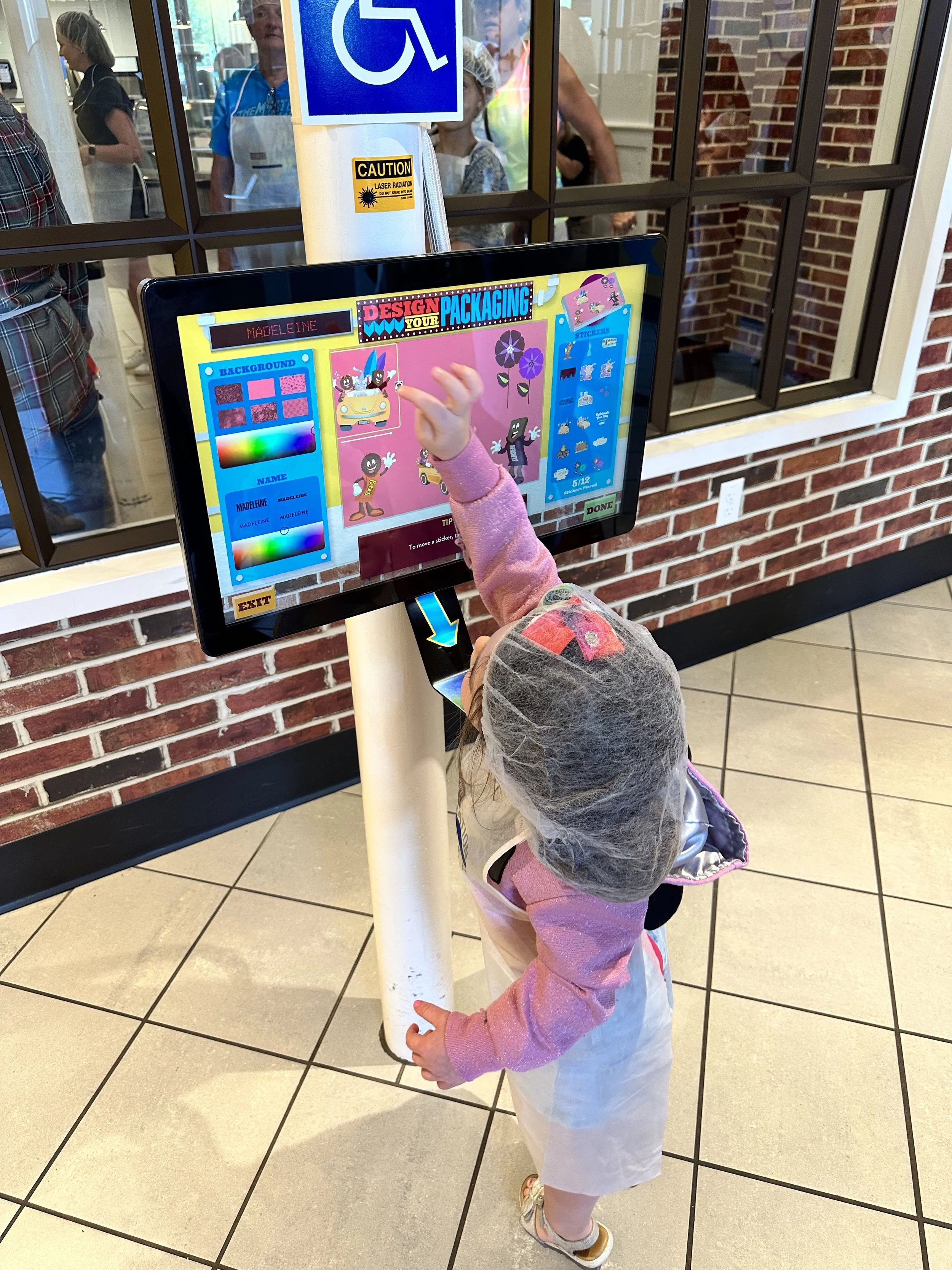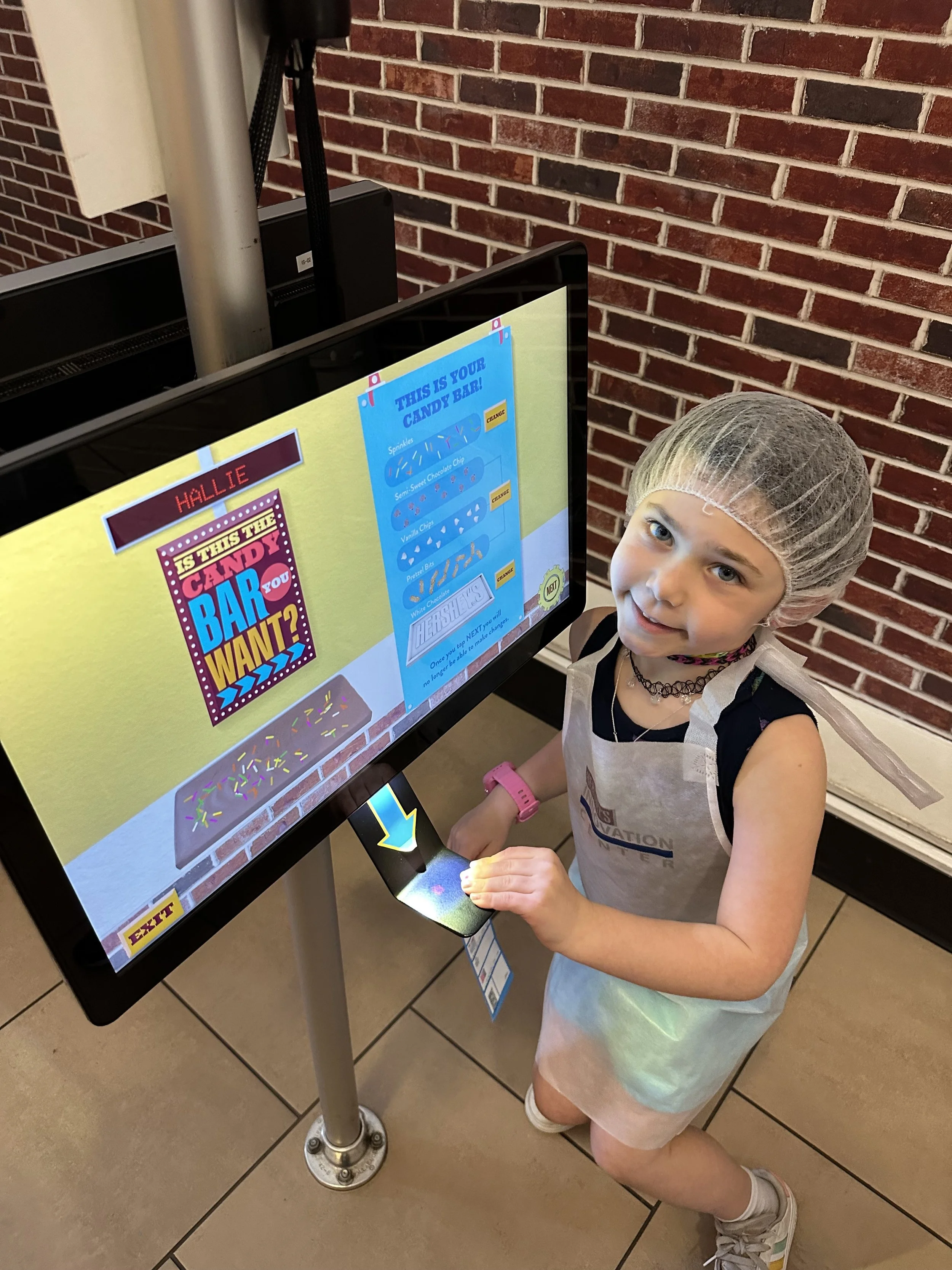 Then we all went for the Make Your Own Chocolate Bar Experience. You start by putting on an apron and hairnet, which is kind of silly because then you go into a room where you “design” your bar on a computer, and then watch (through Plexiglas) your bar being made by machines. It was still very cool – you get to choose the chocolate bar base, the add-ins (chocolate chips, pretzels, etc.) and sprinkles, and then watch as it goes through the machines being filled, topped, cooled and then packaged (you also get to design your own package on another computer) – but the hairnet was just unnecessary.