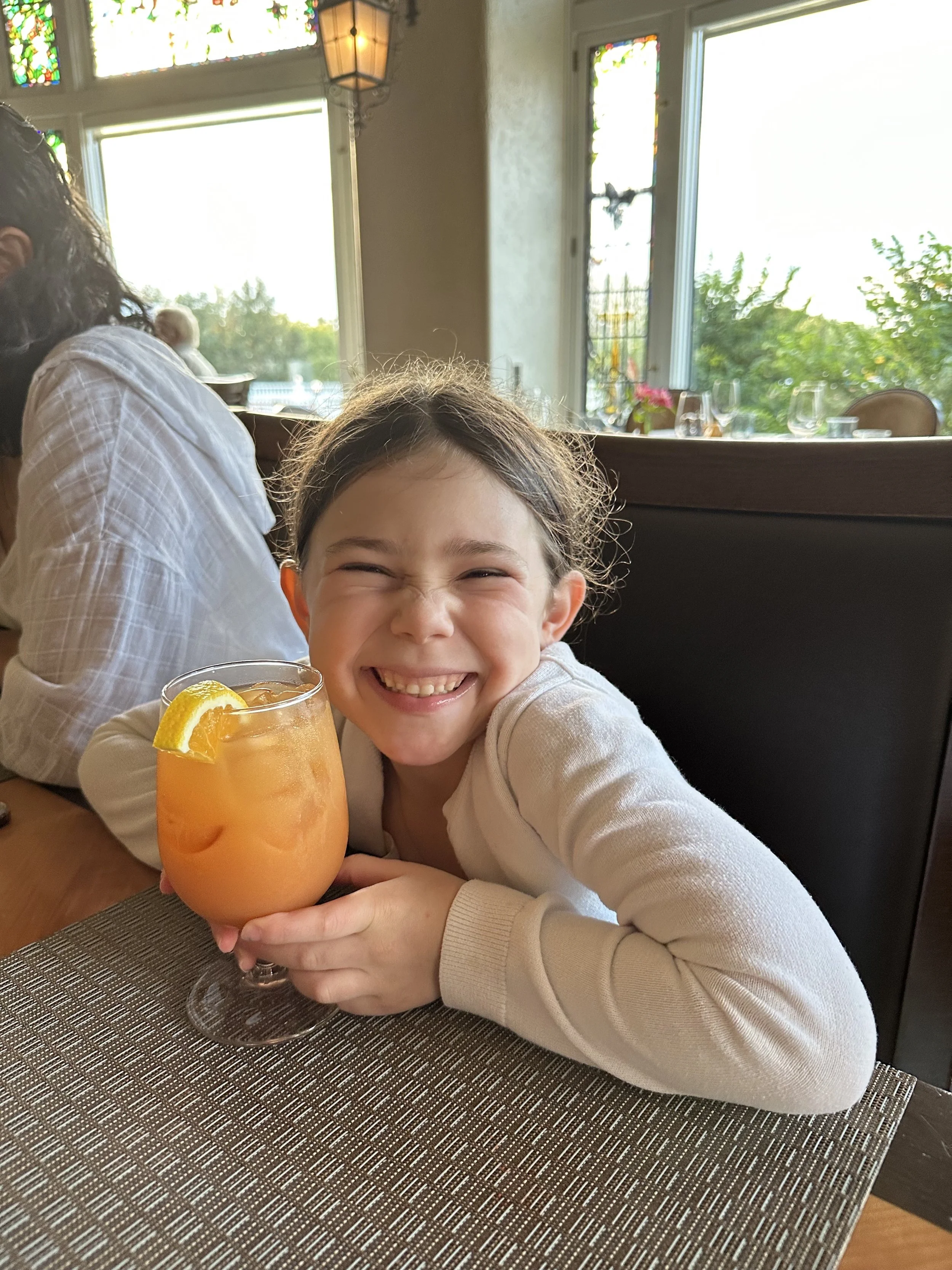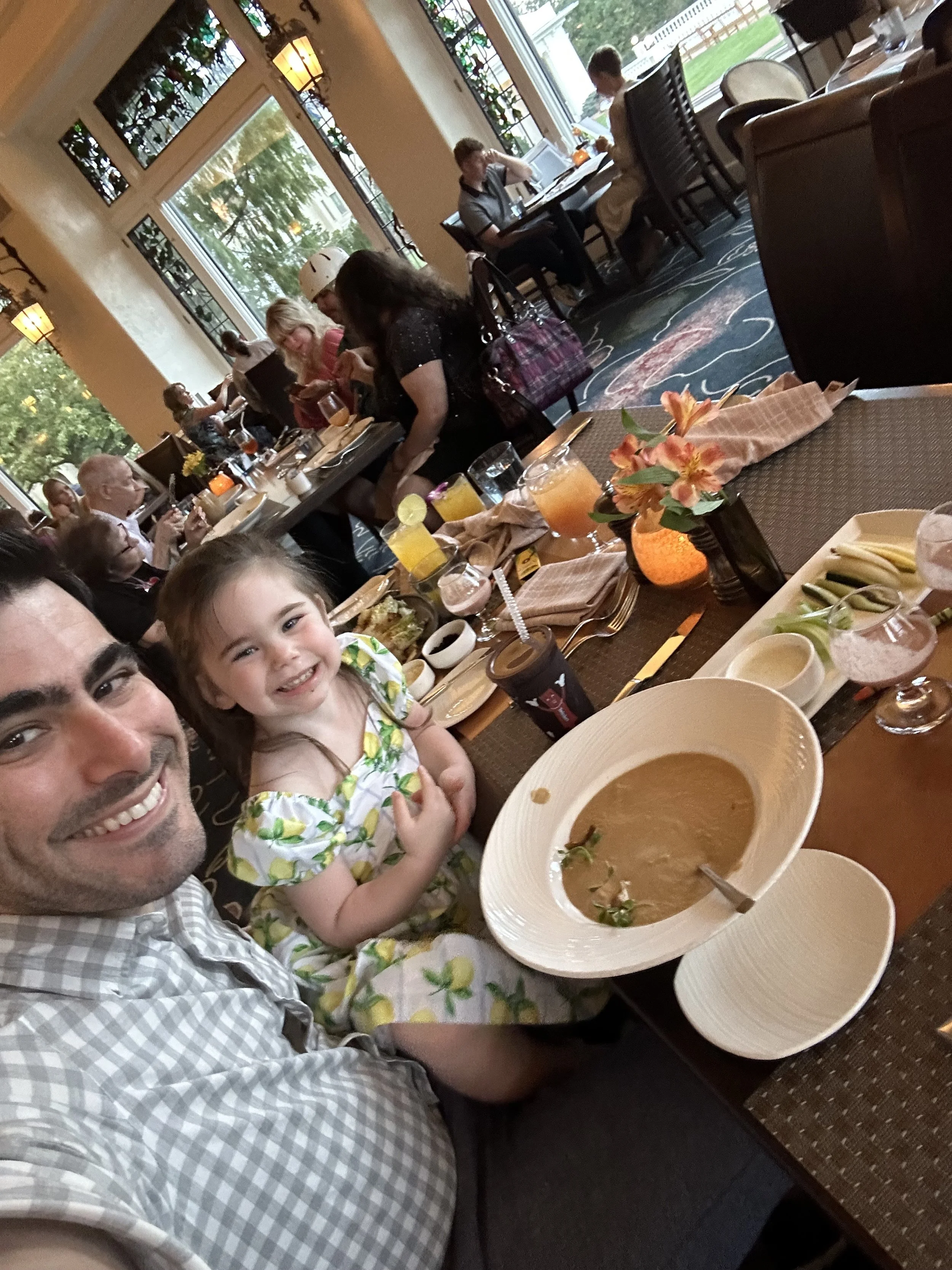 We sat down for dinner at 630, ordered and got drinks. That was the point where I found out that the prescription that Hallie needed was ready at the CVS 10 minutes away from the hotel and I needed to go get it before Shabbos started. Tzvi was all upset that I was going to miss the entire dinner, but what can you do. [Tzvi: Steph was gone for over a half hour, during which time Madeleine cried that she wanted mommy and needed to be taken outside, twice, and we received an amuse bouche. At one point the waiter looked at our table and just looked confused. I asked about the food and his response was, ‘I was just wondering that myself.’ Then I mentioned we were still waiting for the bread course, and it turned out he’d forgotten to put that in. Steph came back shortly after that and everything seemed to move okay from there.]