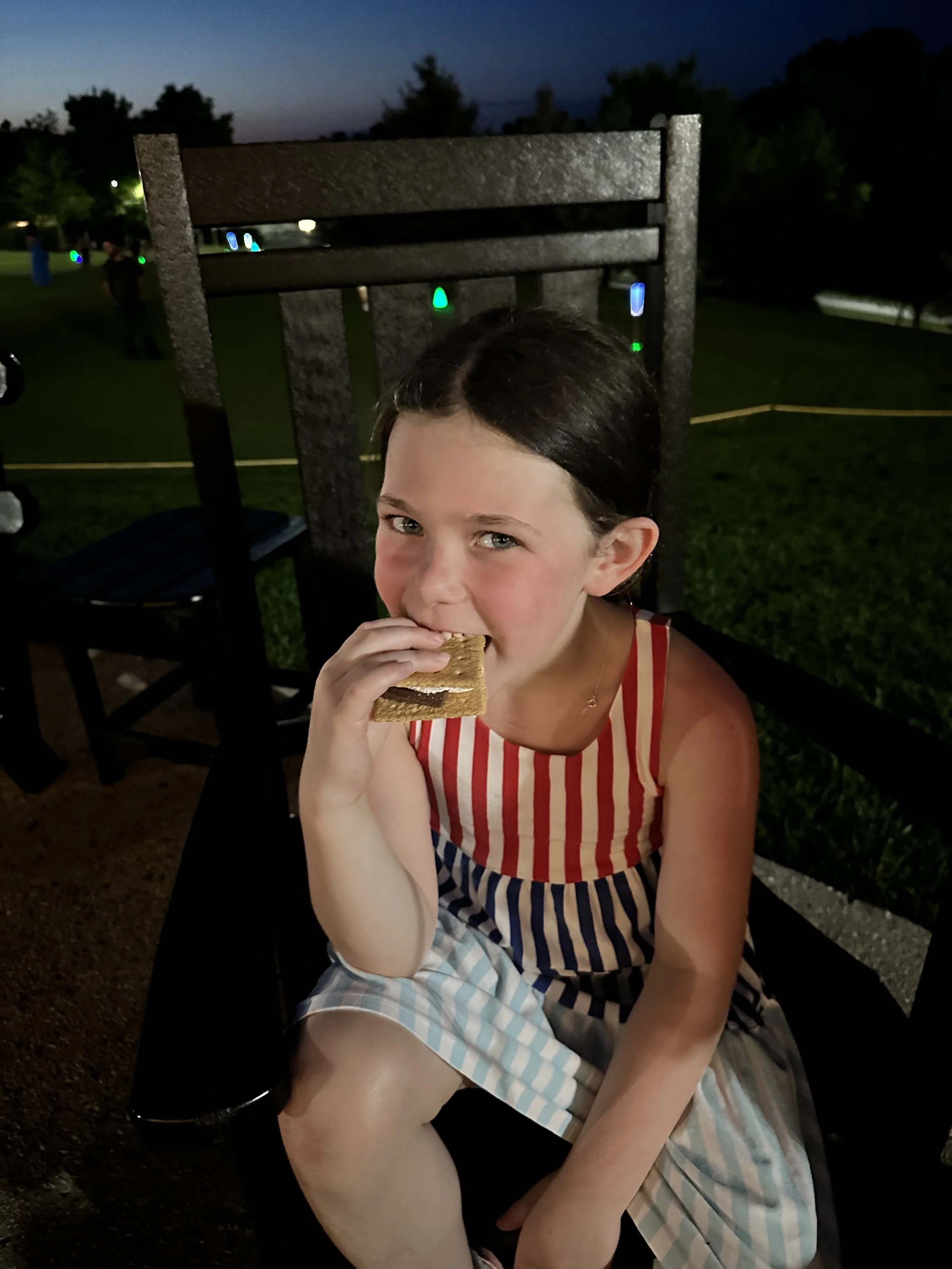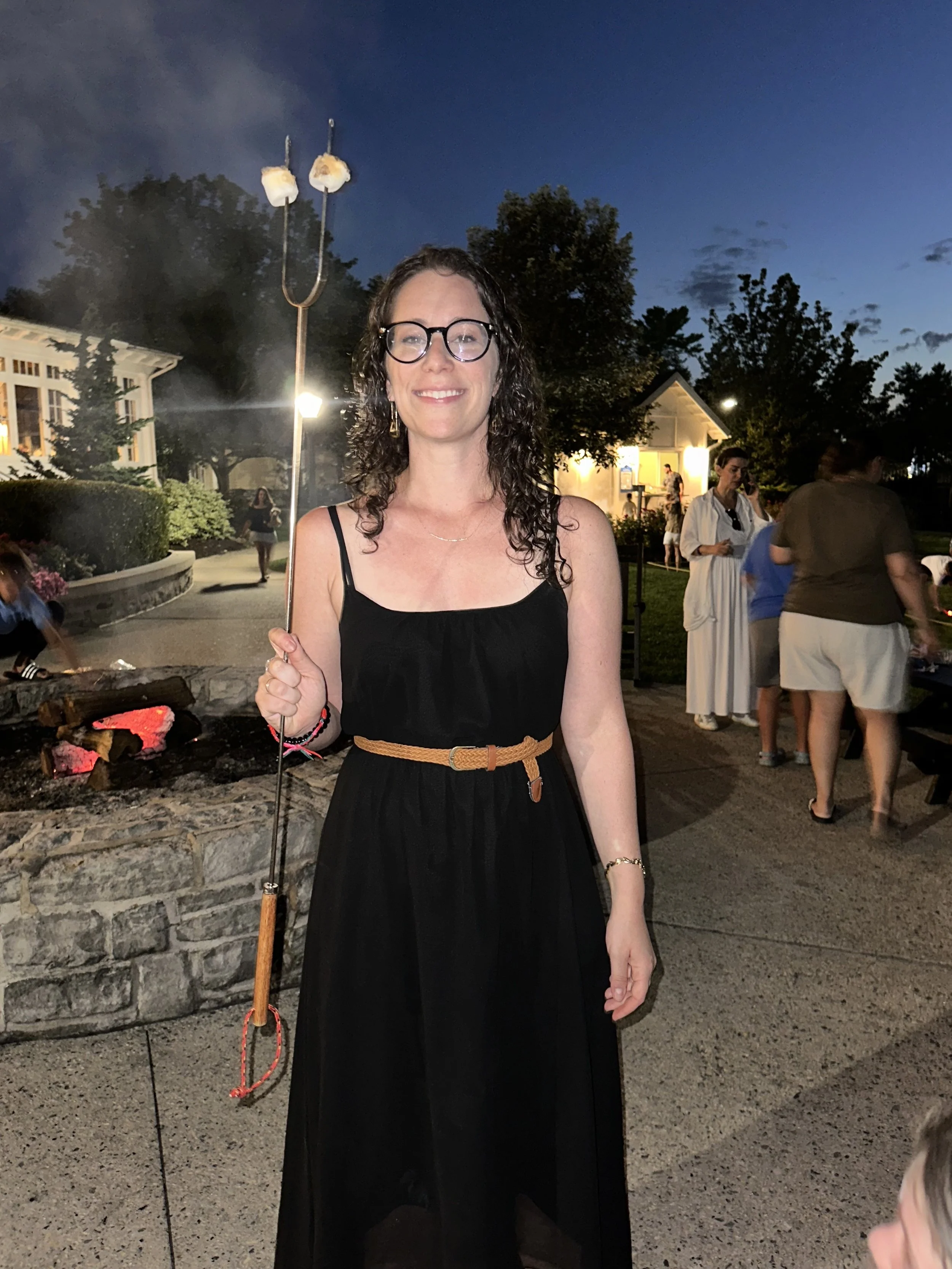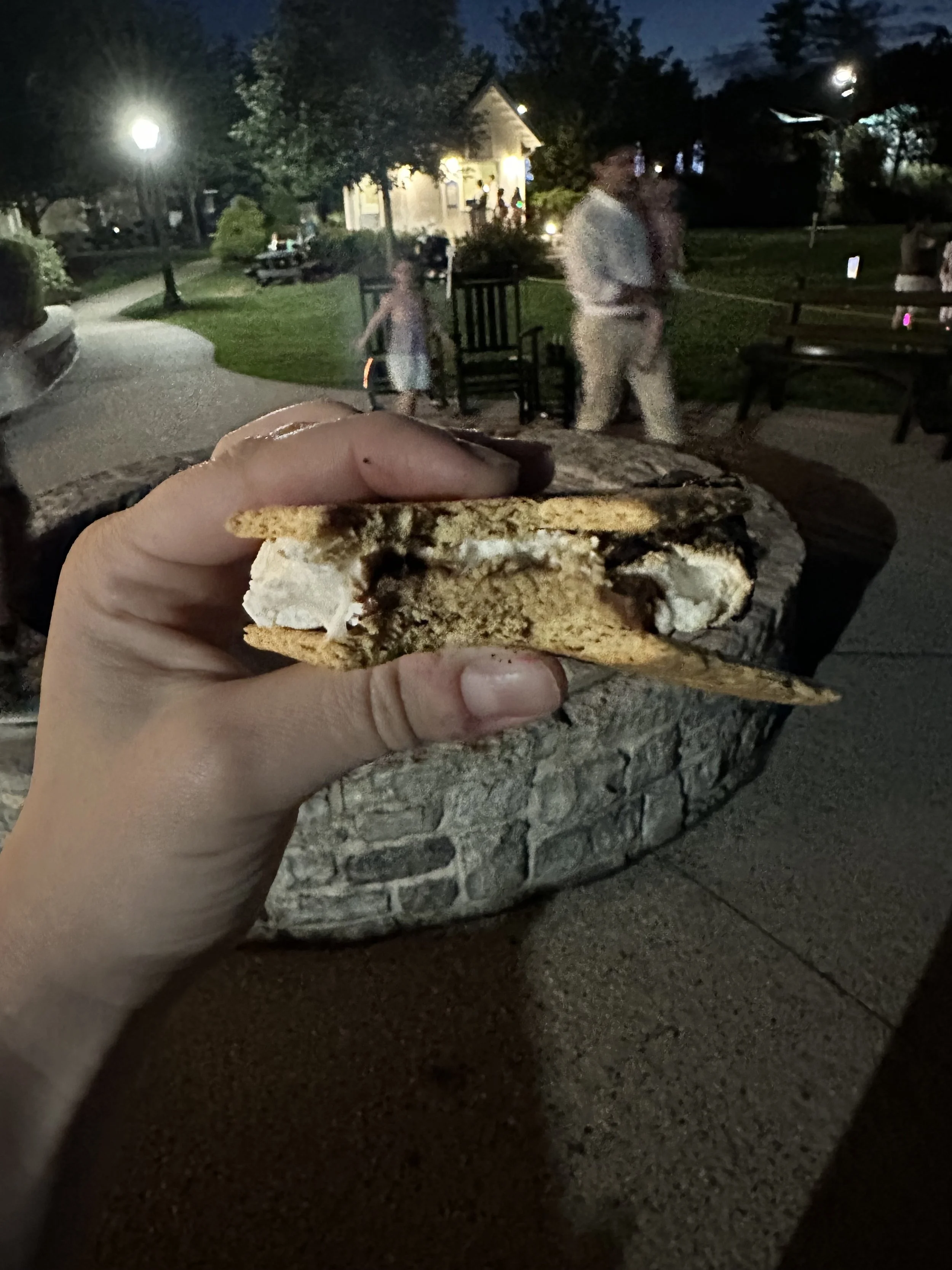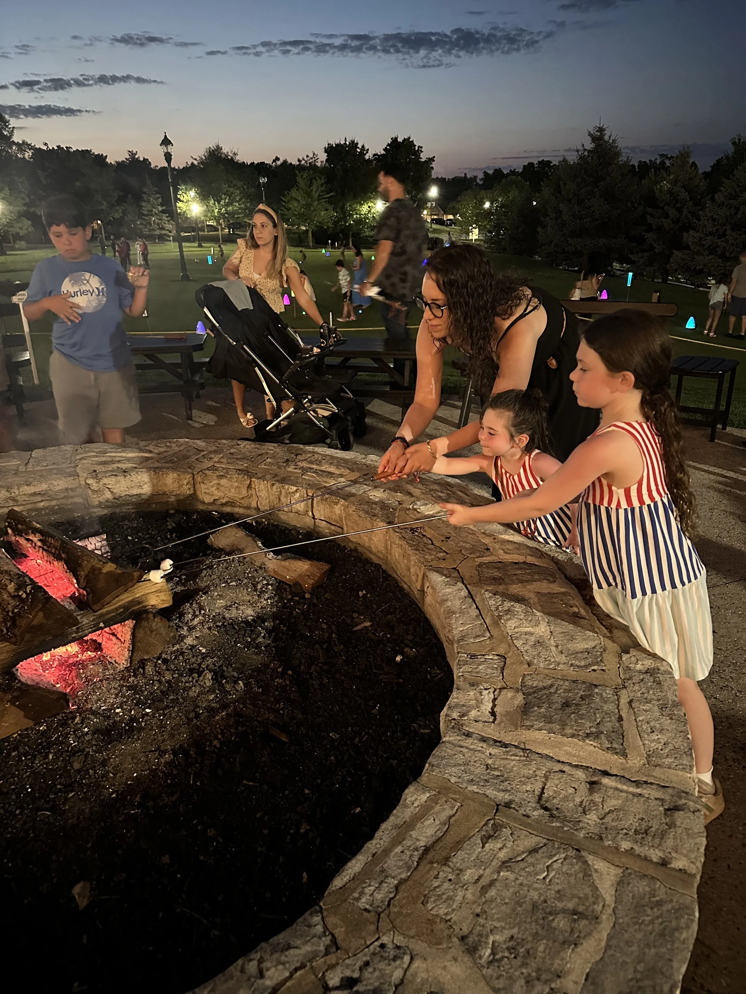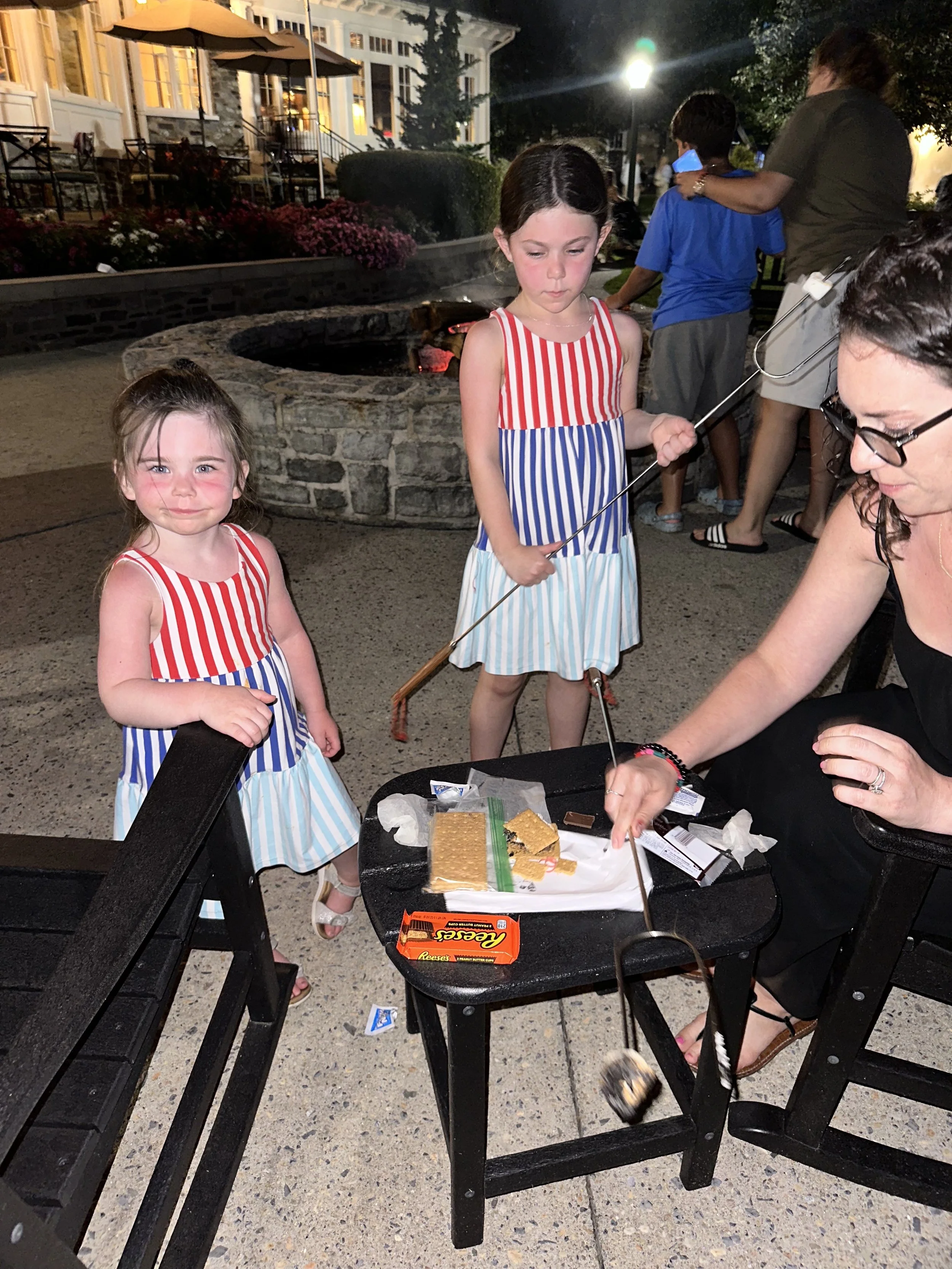 After dinner we went to the kids area by the pool again. We played some ping pong and Madeleine played on the playground. As soon as Shabbos ended, we went to the smores making activity. I knew about this in advance and had called to ask if they were vegetarian marshmallows. They weren’t, so we brought our own, which was great, because we ended up burning some and if we’d have used their marshmallows we would’ve run out.