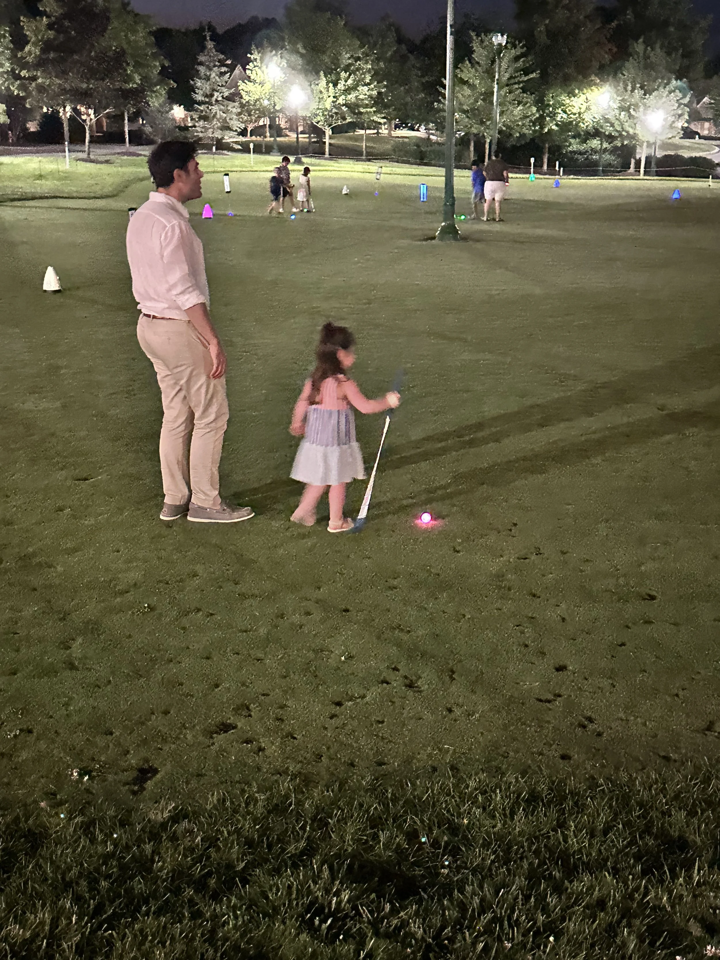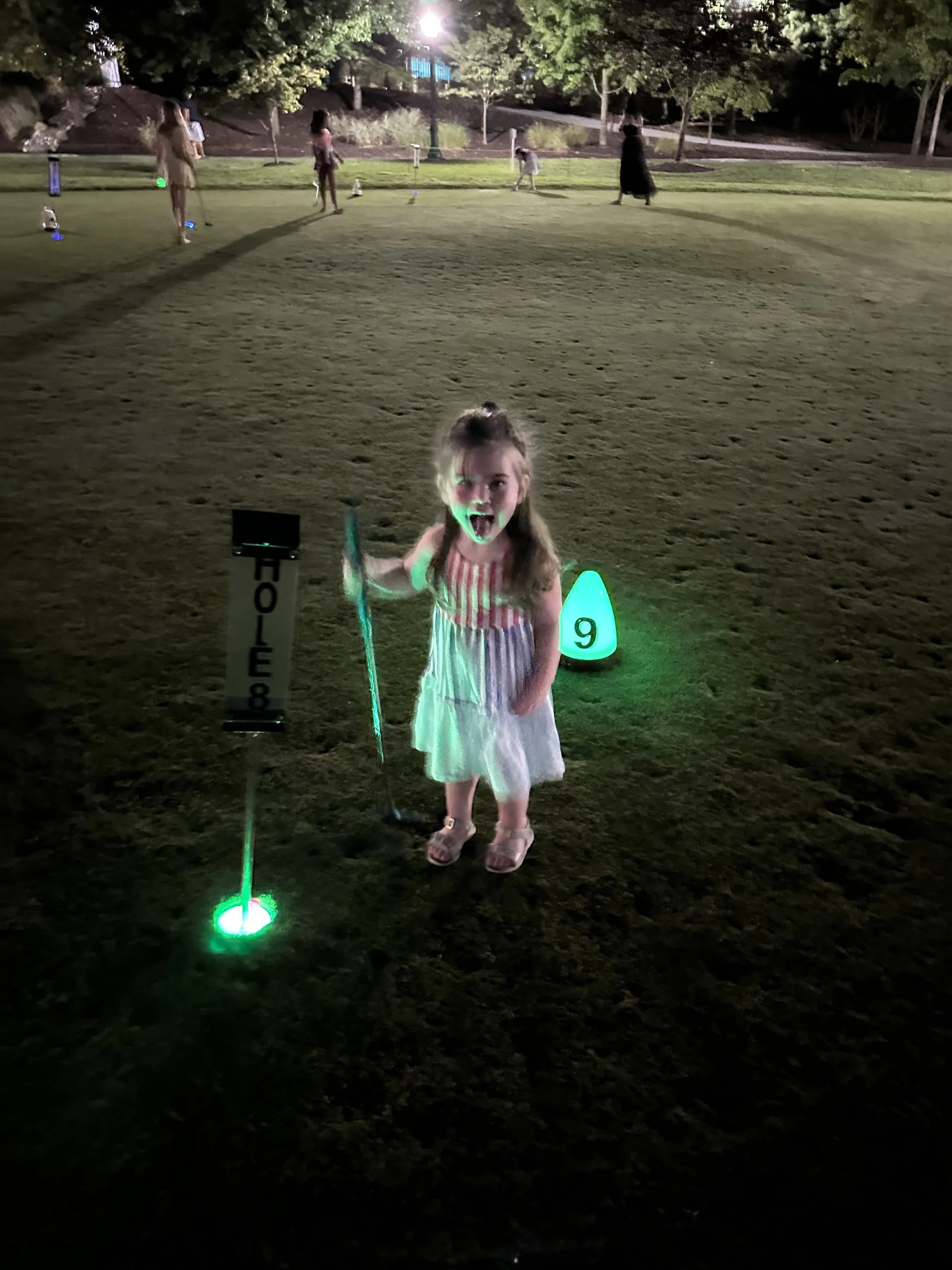 Then the girls played glow golf, which is like glow in the dark light up mini golf. It was cute. Madeleine insisted on participating, but she didn’t really want to do it correctly. She had a great time going around and dropping her ball in every hole though.