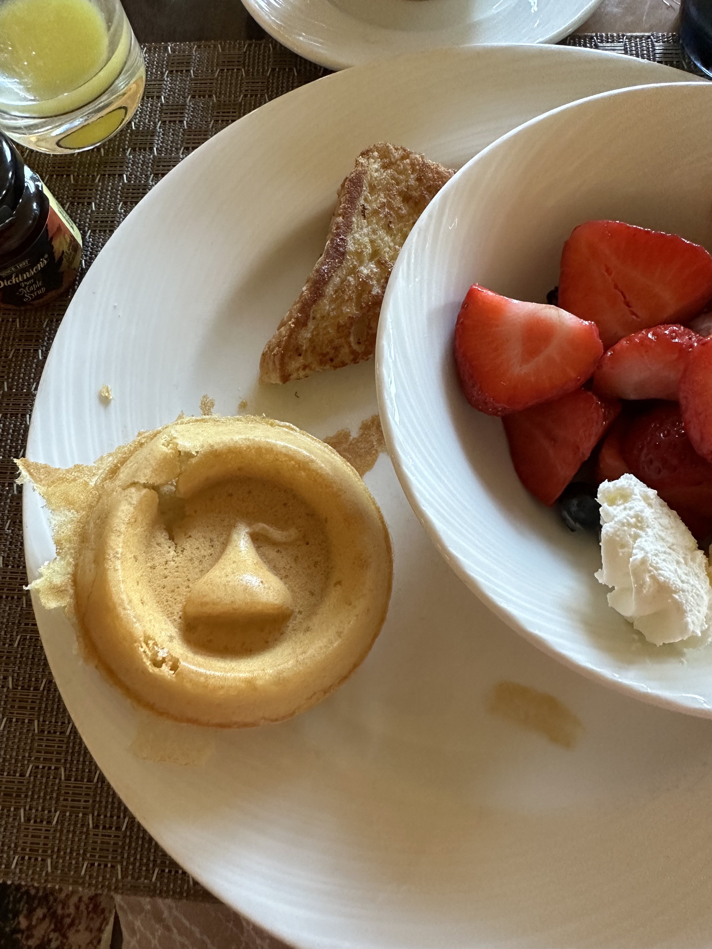 We got dressed and went down to the buffet. We had to wait a half hour, so we played red light-green light outside but then Hallie got very upset because we didn’t want to play by her rules and then went and sat by herself pouting. At one point during breakfast Madeleine was being very annoying and made me spill coffee on myself. It was a bad scene.